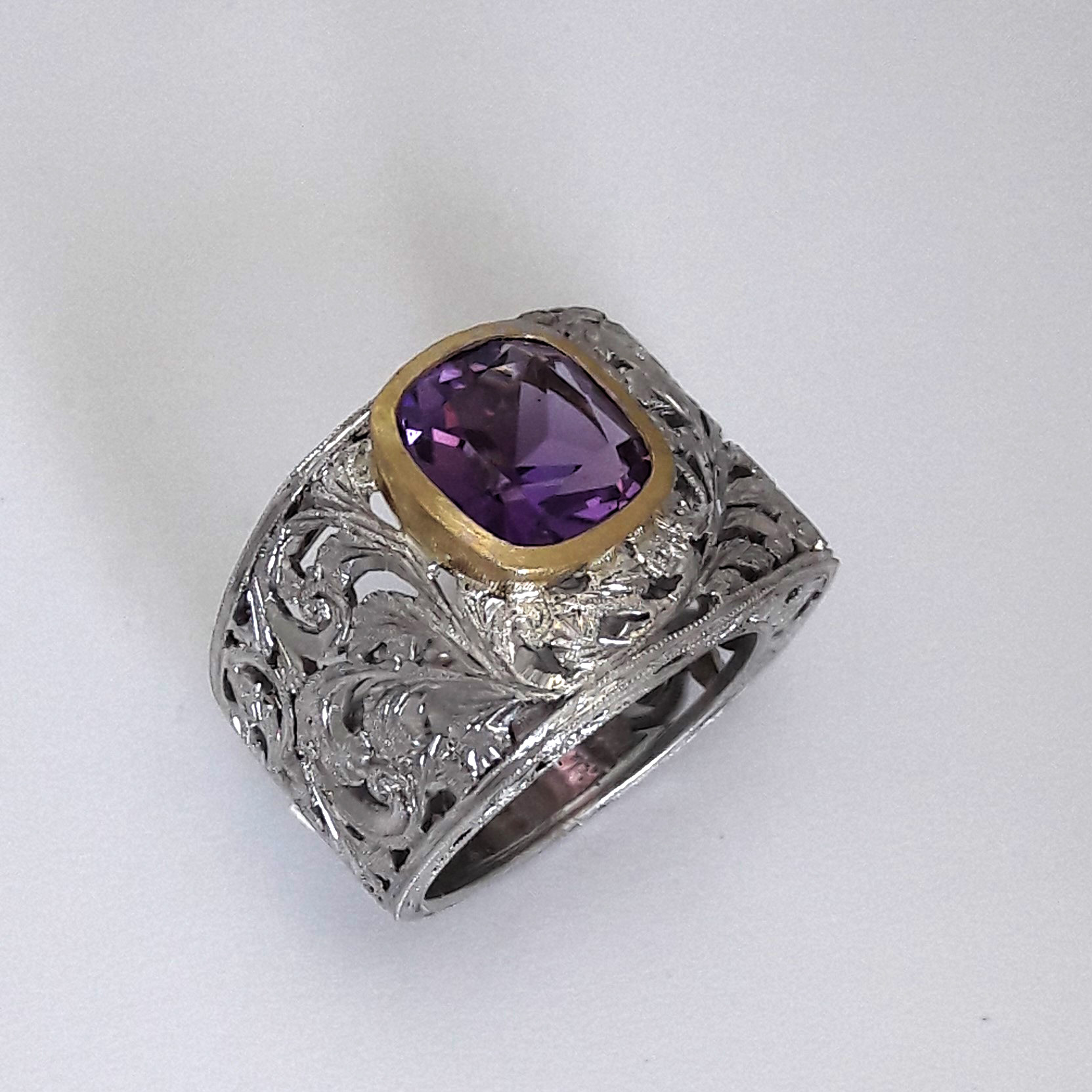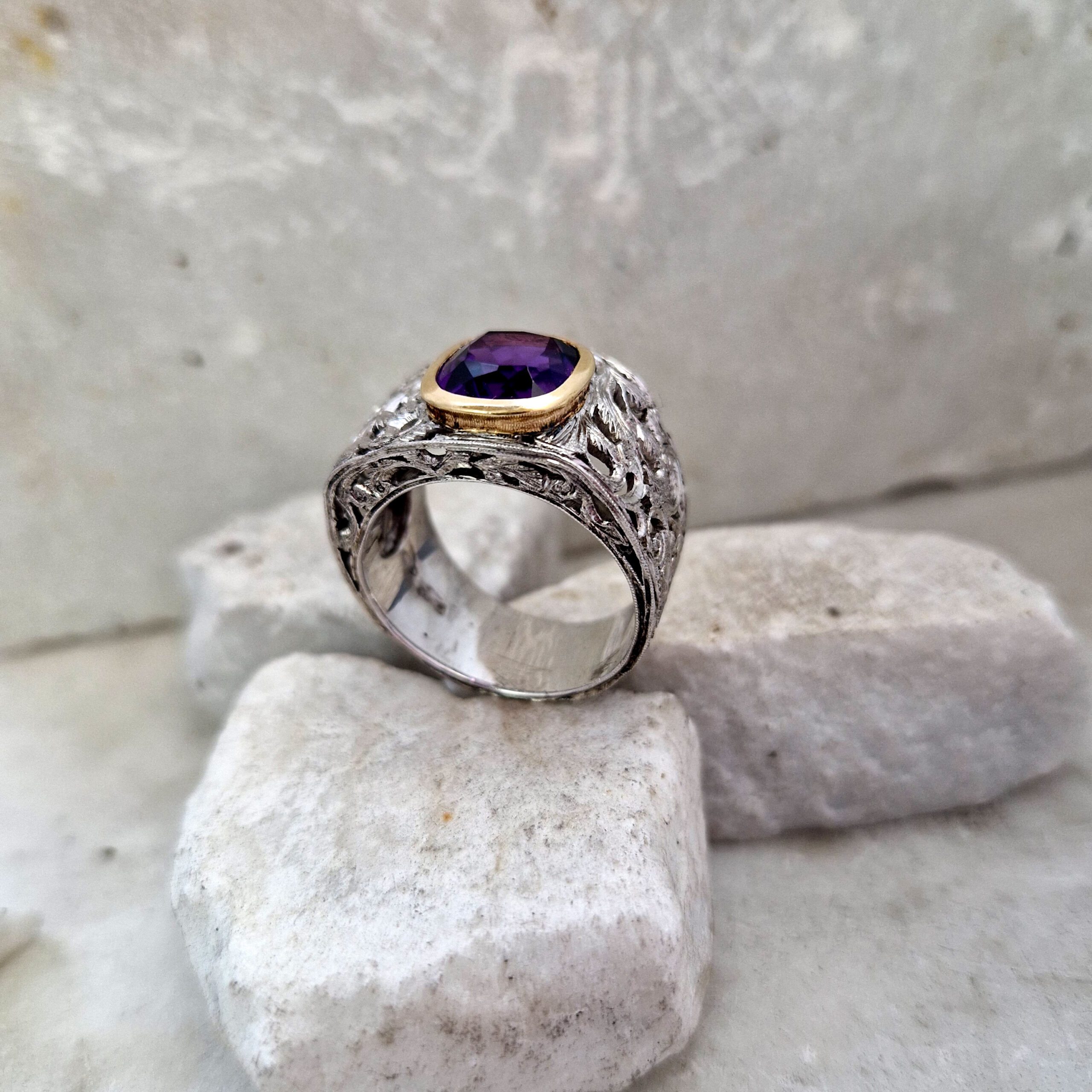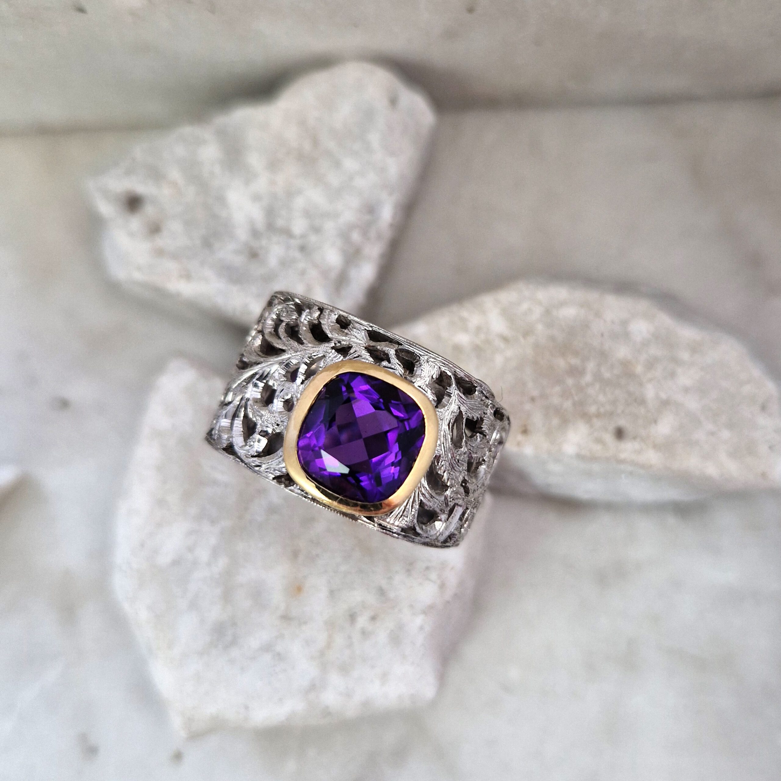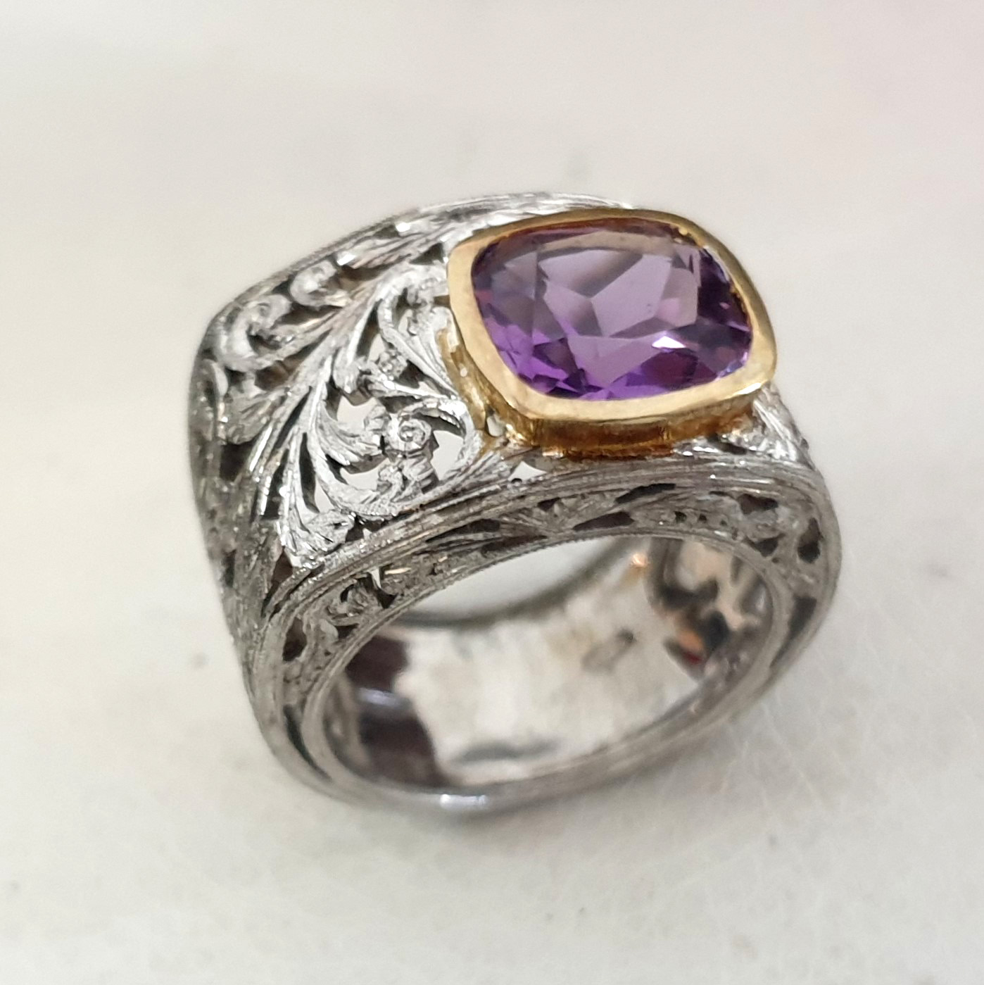 Gold and Silver Ring with Asymmetrical Amethyst, Made with Florentine Craftsmanship