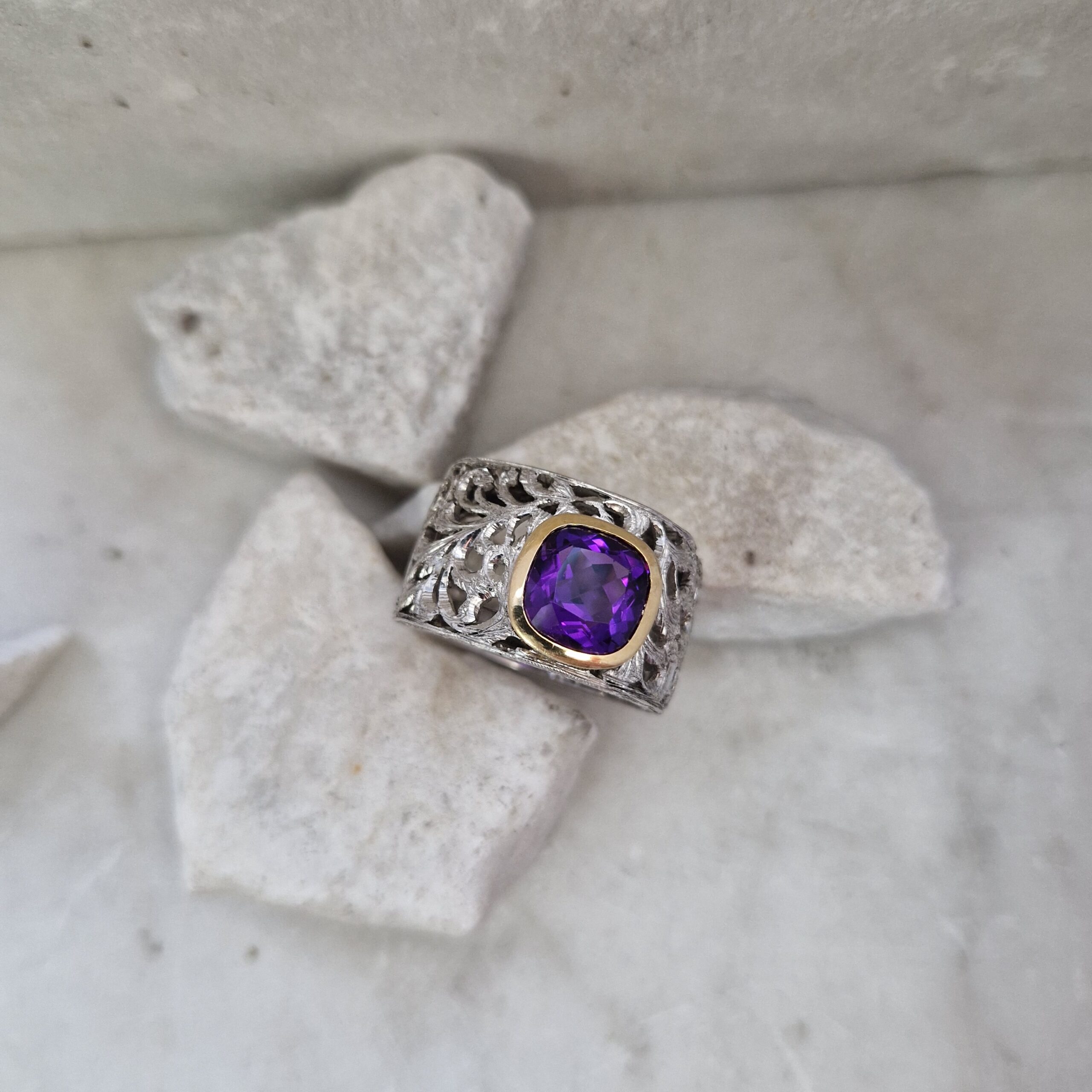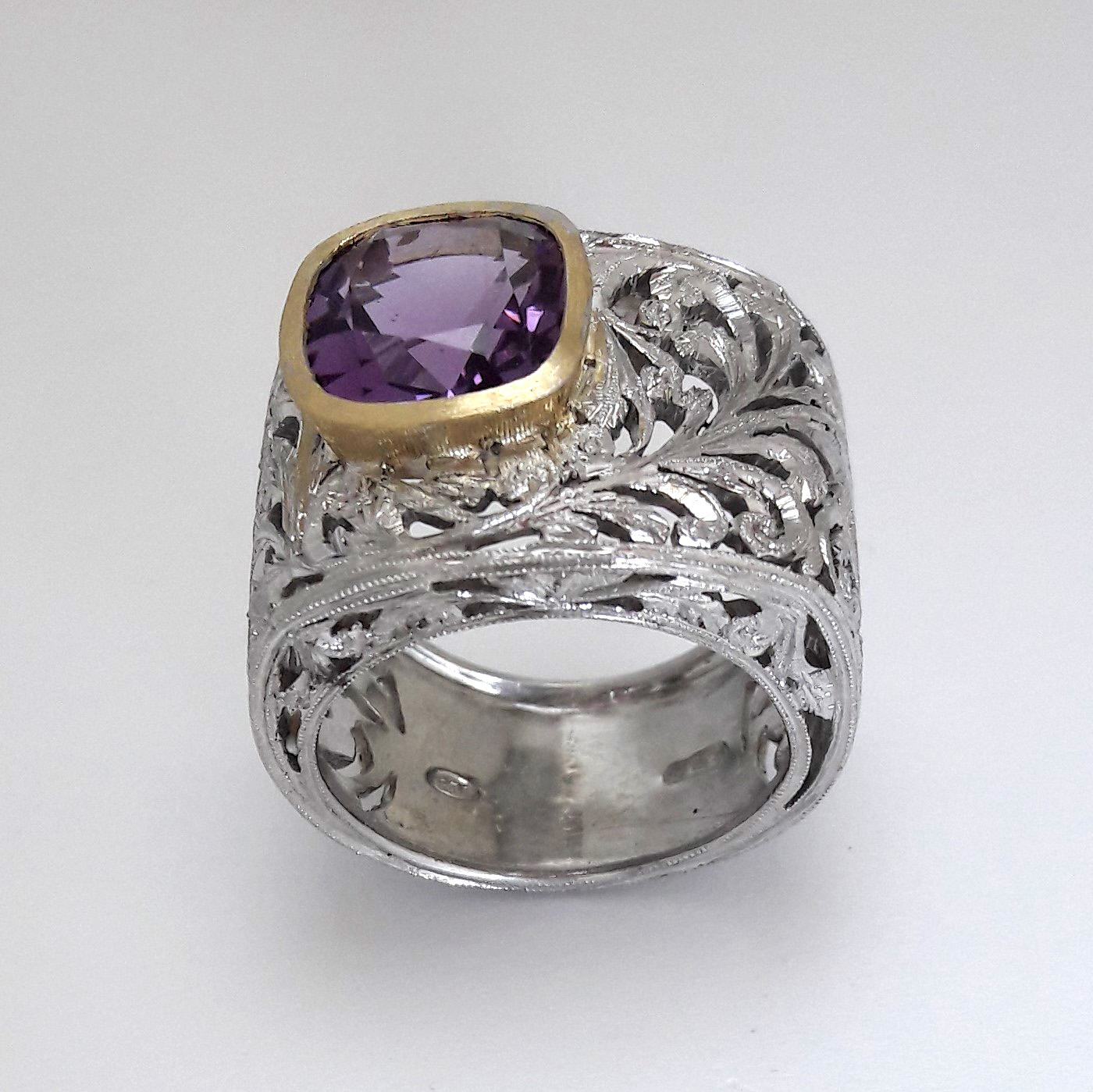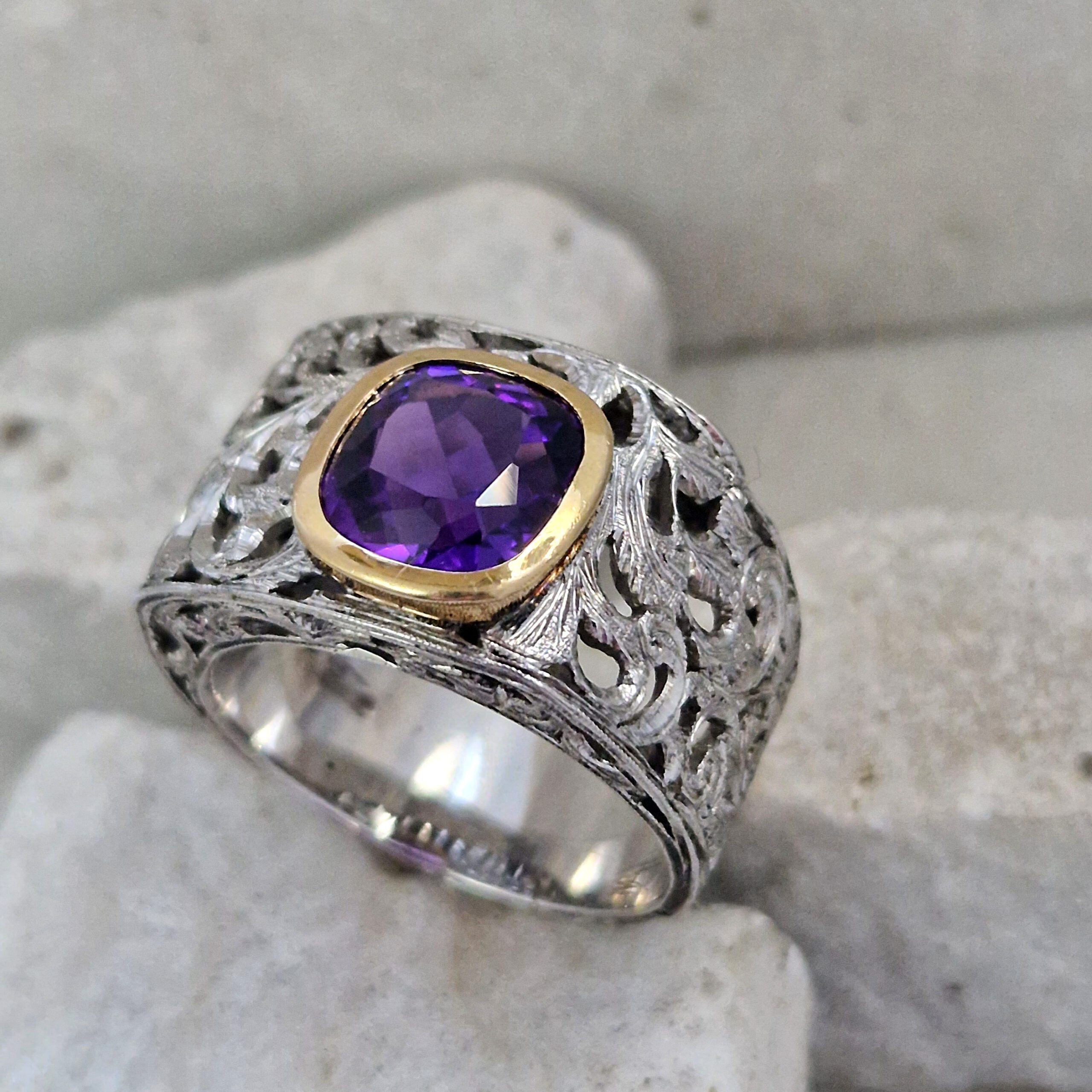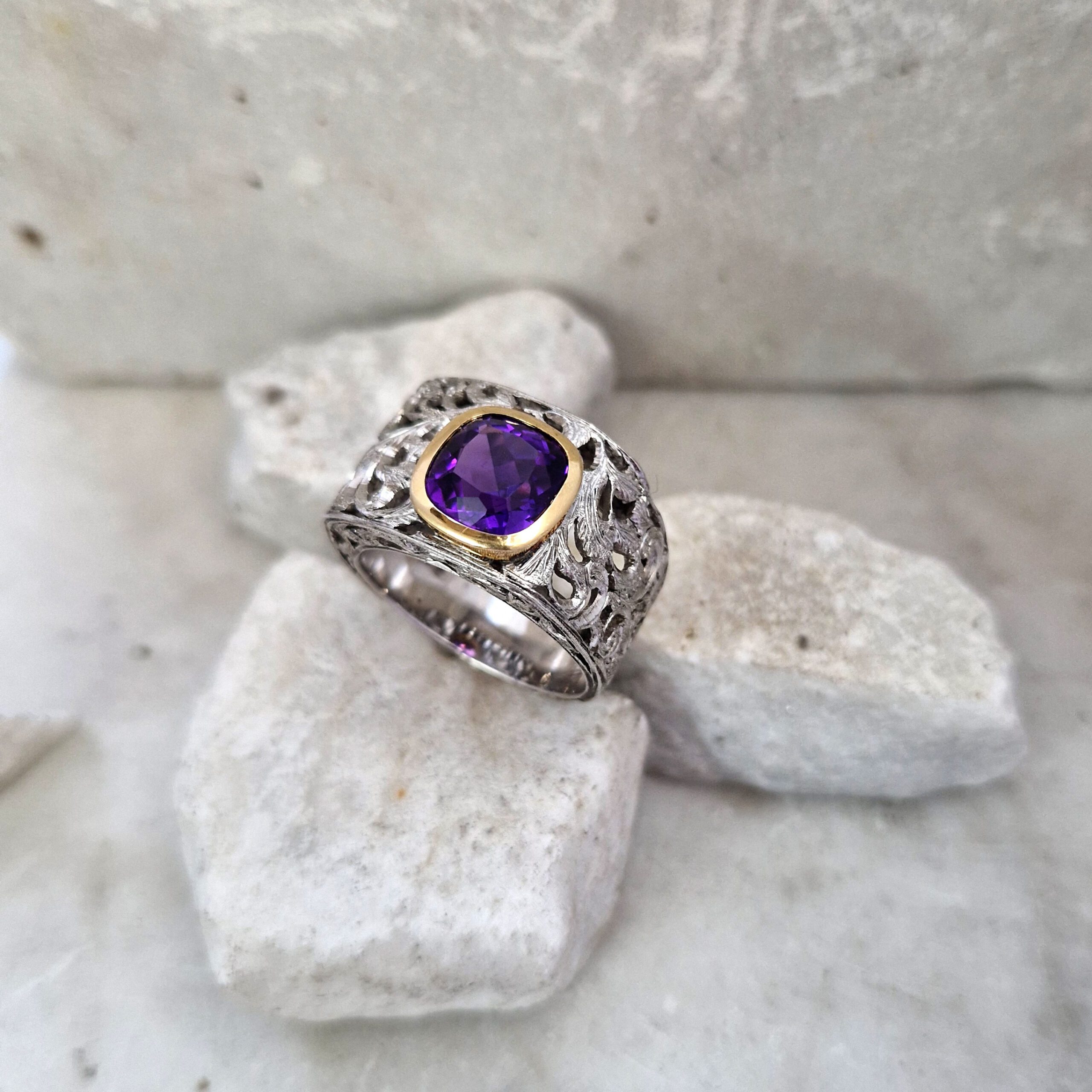 Gold and Silver Ring with Asymmetrical Amethyst, Made with Florentine Craftsmanship