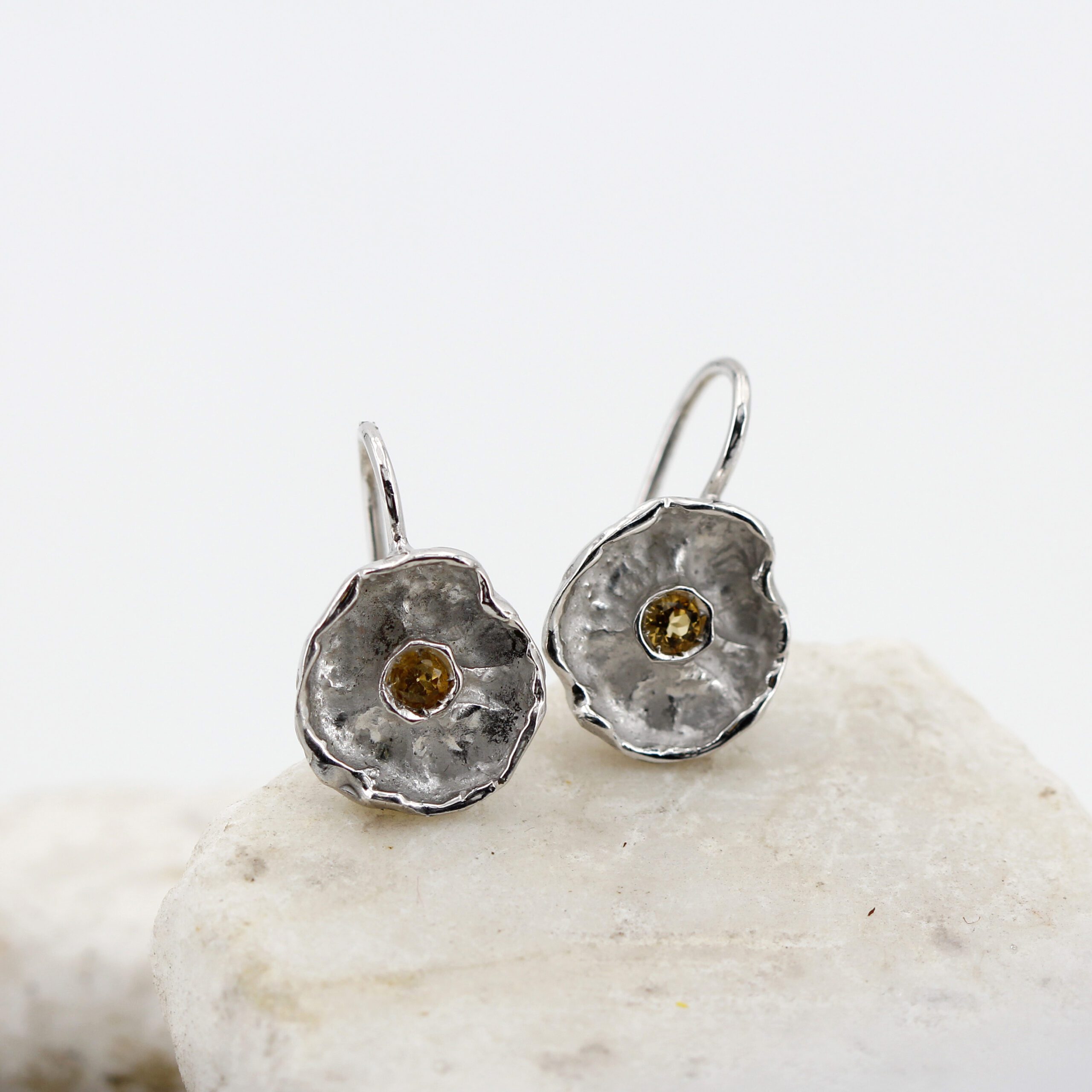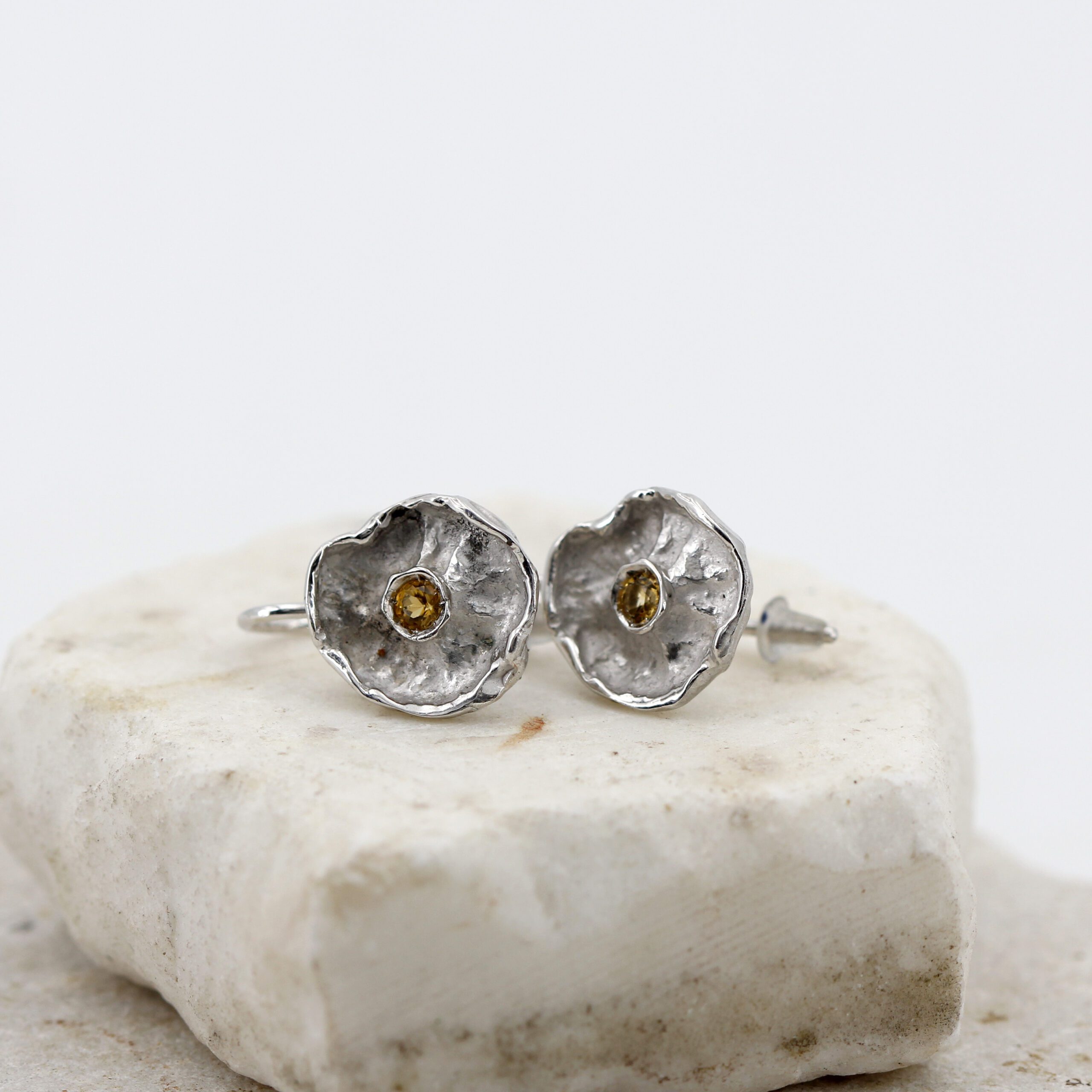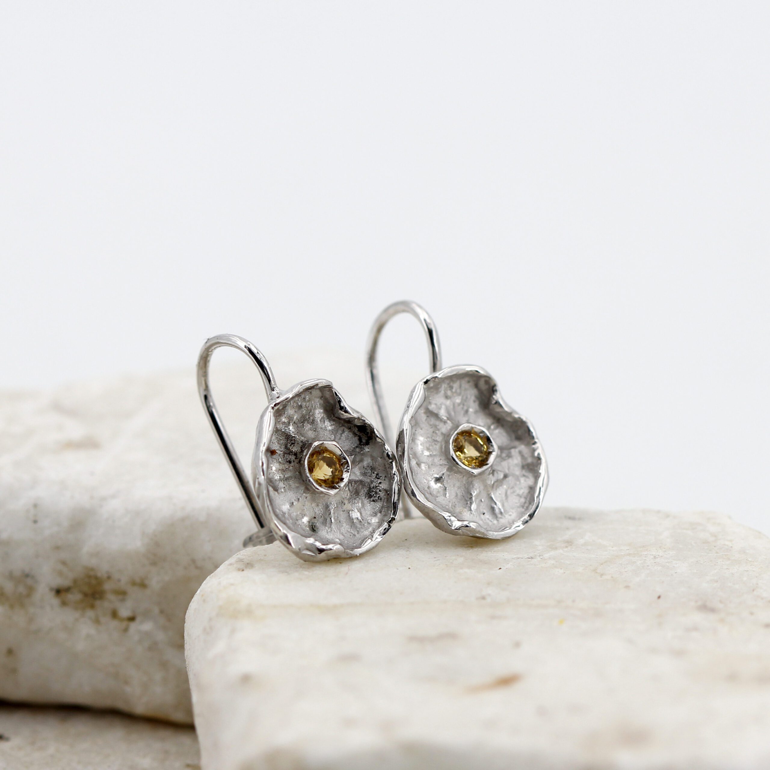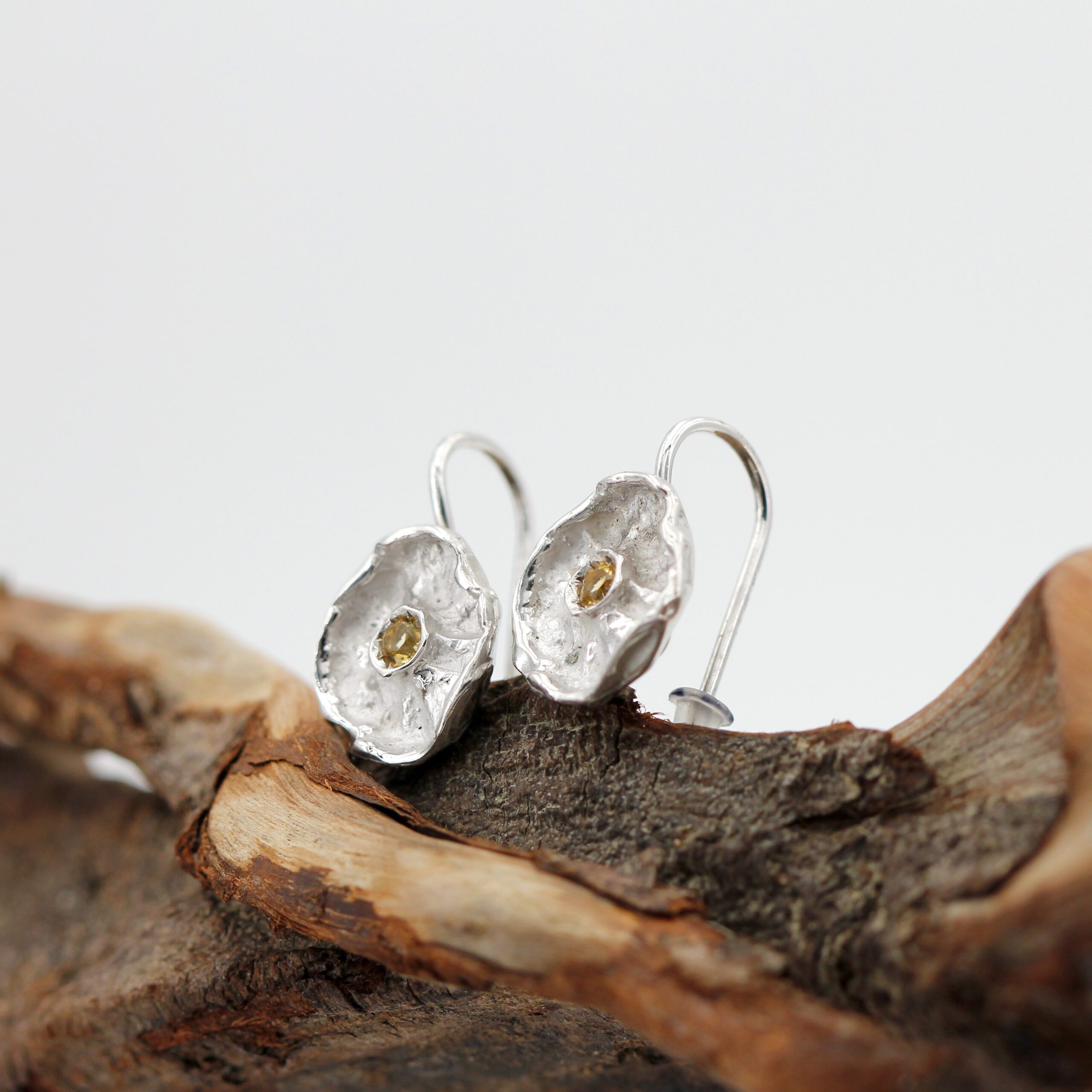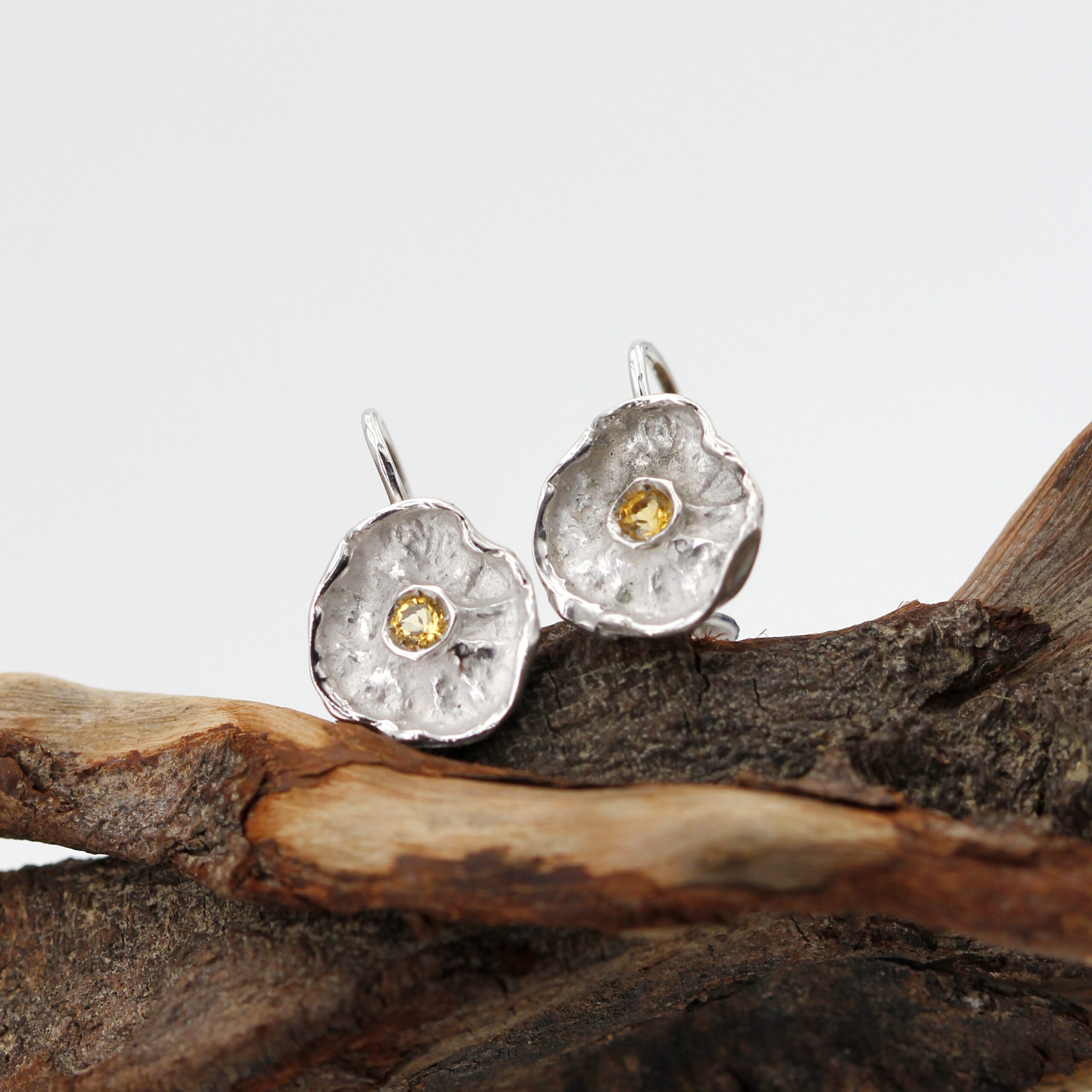 925‰ Sterling Silver Earrings, 5 g, featuring natural citrine quartz shaped into two central flowers, approximately 13 mm in diameter. Fully handcrafted. Both the inner part and edges are polished.