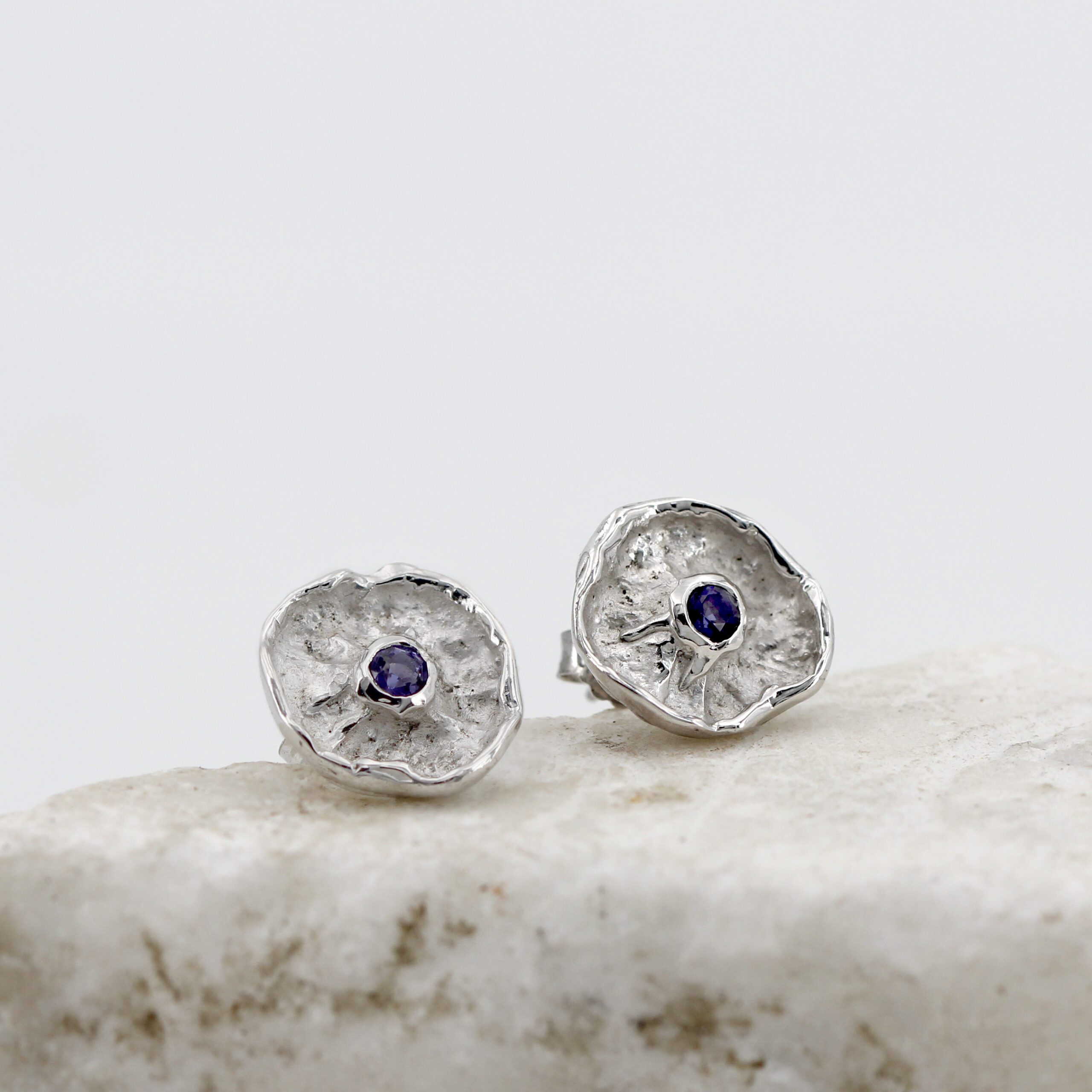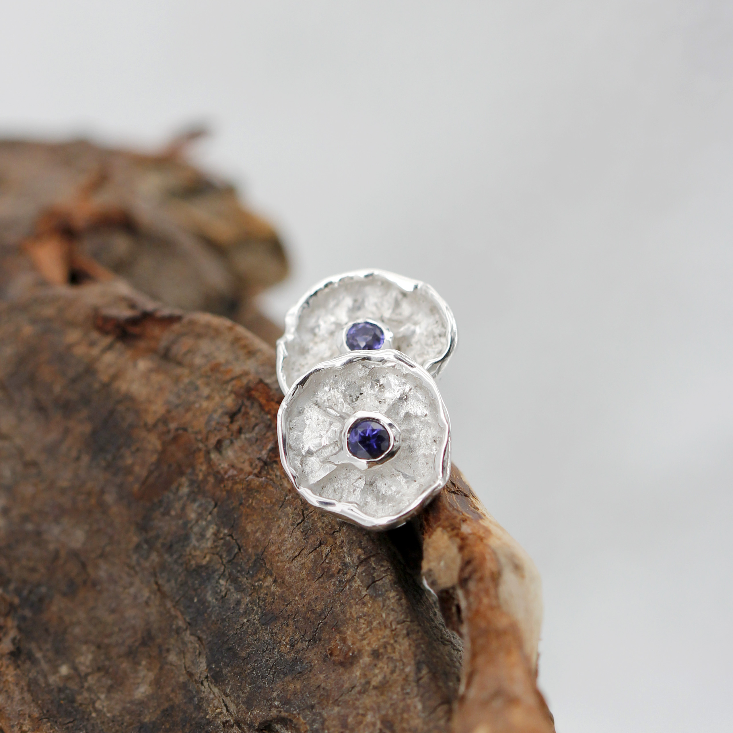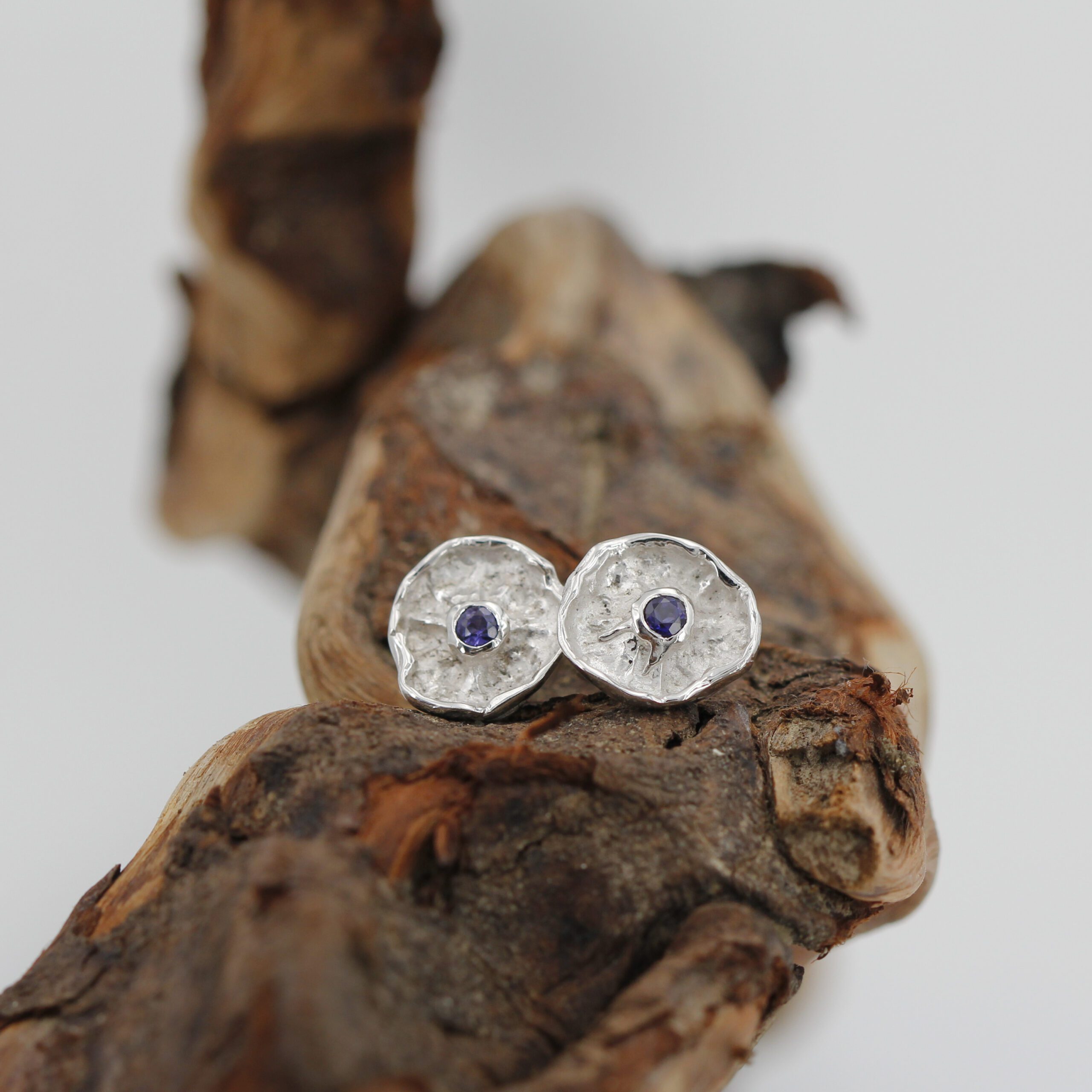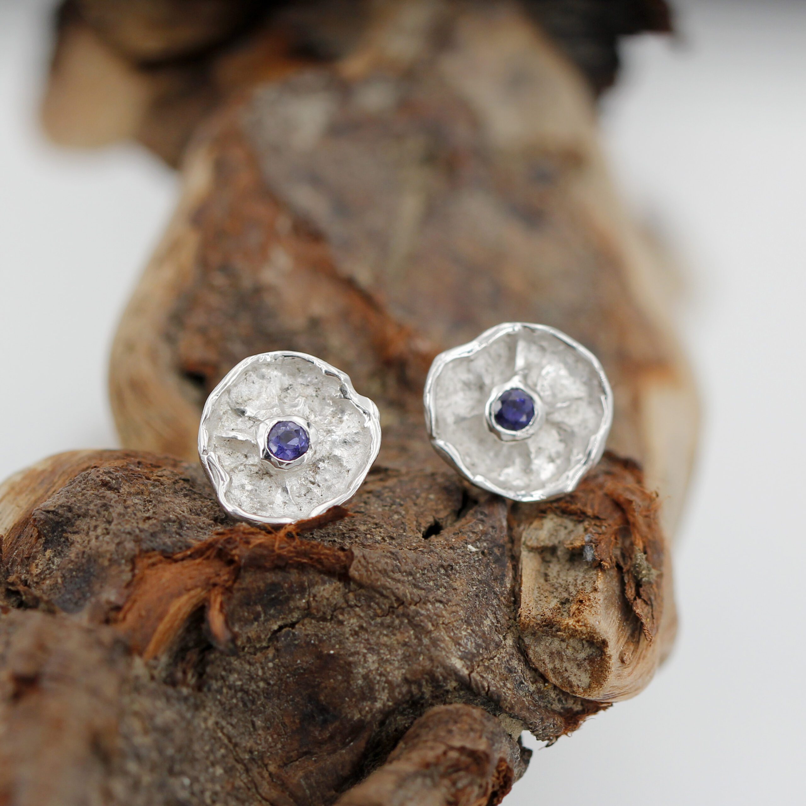 Earrings in 925‰ Silver, weight 4.60 g, featuring natural Iolites shaped as two central flowers, approximately 13 mm in diameter. Handcrafted. Polished inner part and edges.