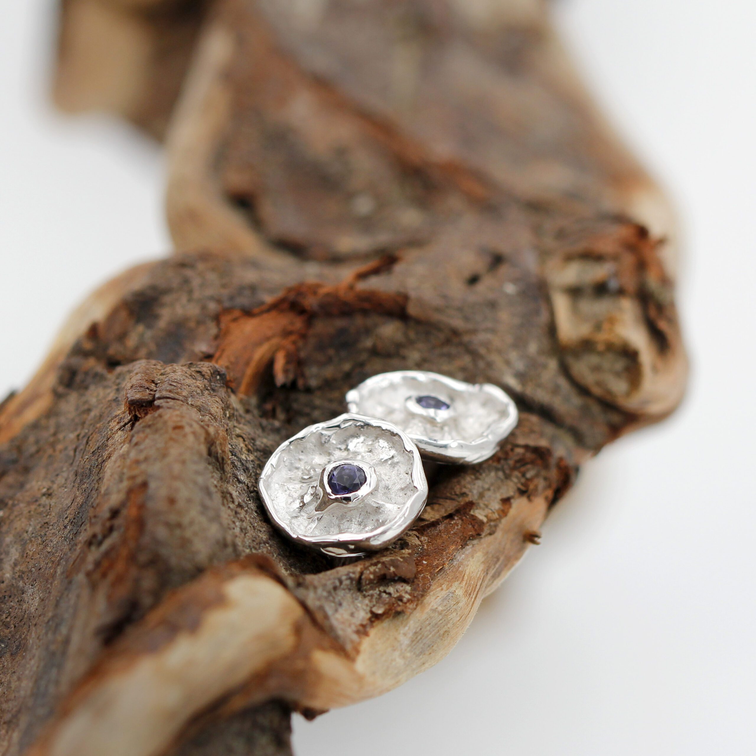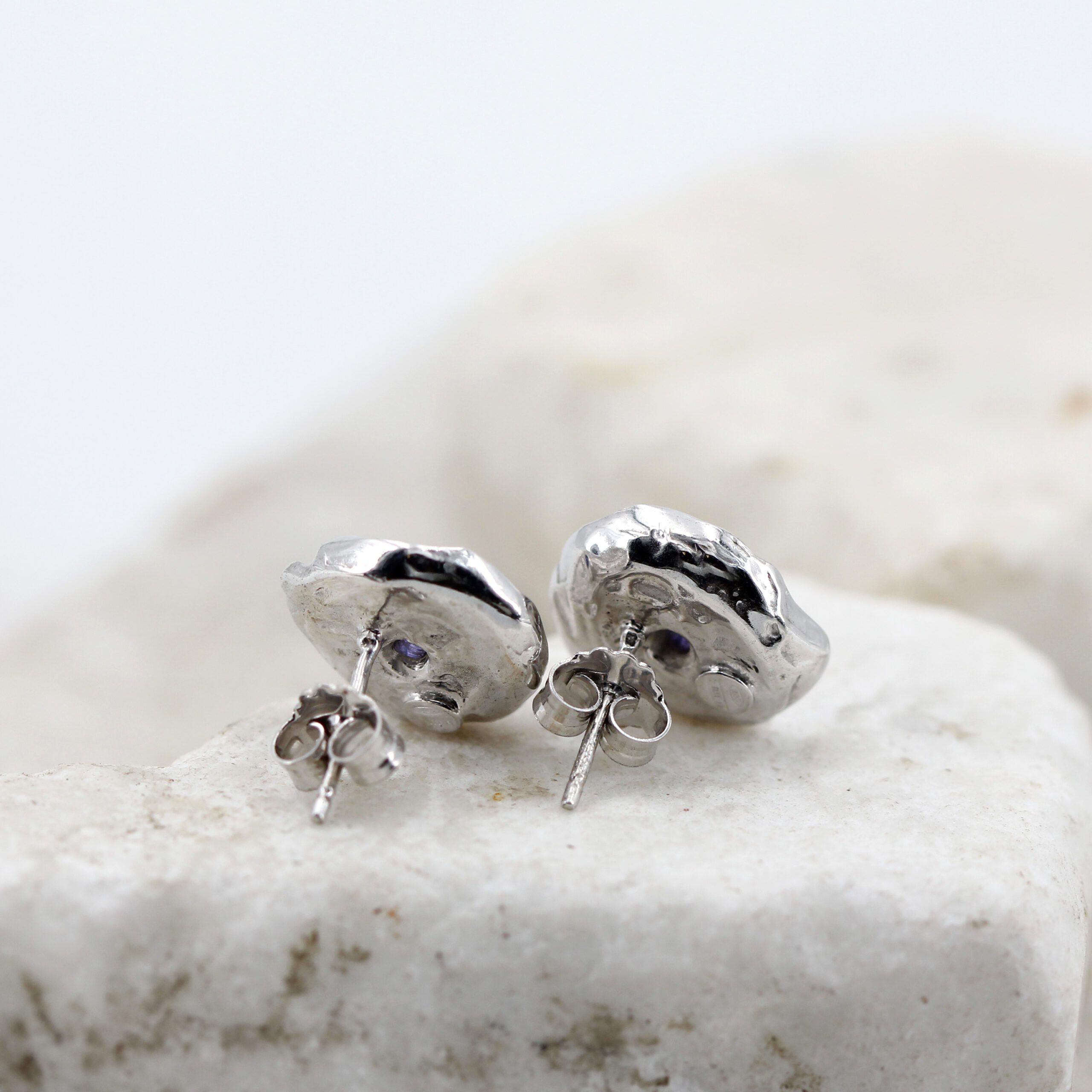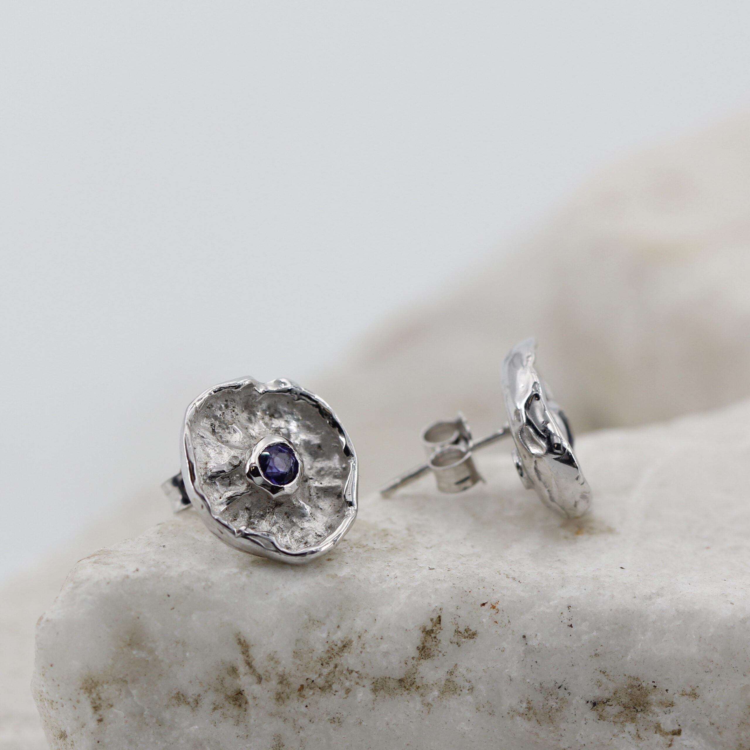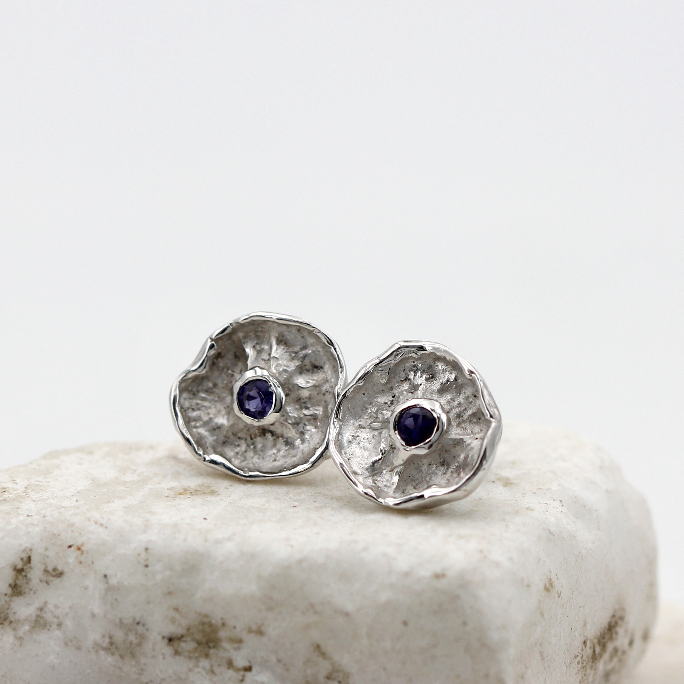 Earrings in 925‰ Silver, weight 4.60 g, featuring natural Iolites shaped as two central flowers, approximately 13 mm in diameter. Handcrafted. Polished inner part and edges.