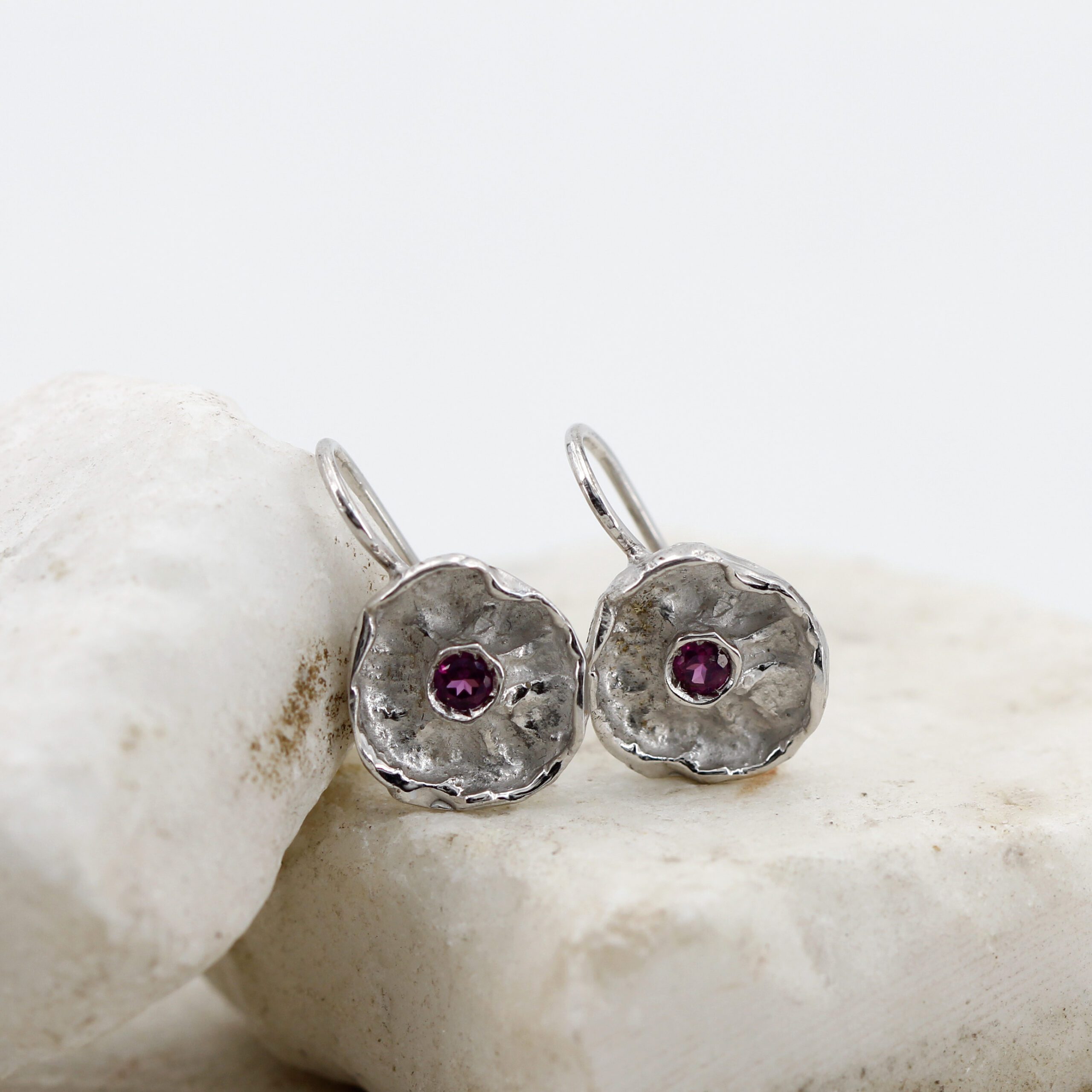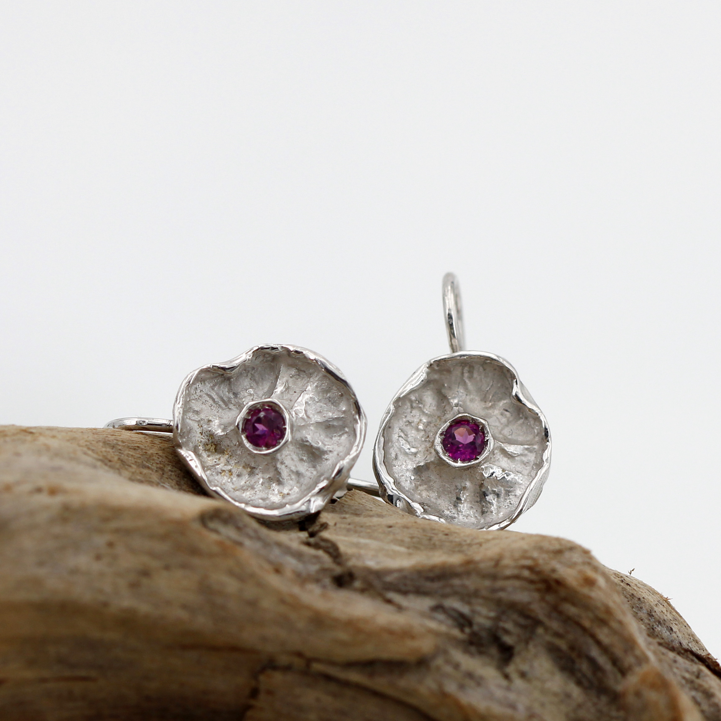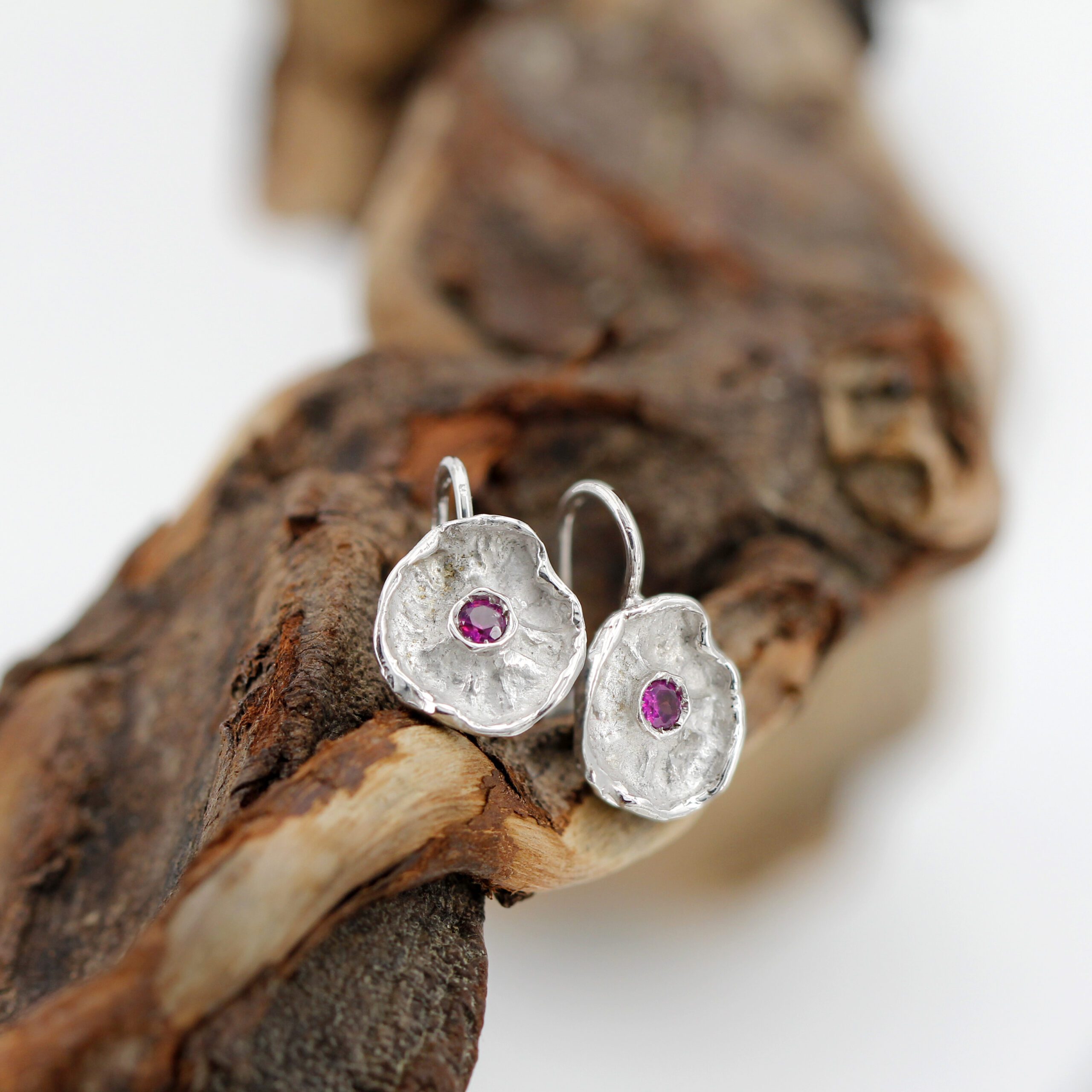 Sterling Silver 925 earrings (5.00 g) with natural Rhodolites, shaped as two central flowers, approximately 13 mm in diameter. Entirely handcrafted. Polished inner section and outer edge.