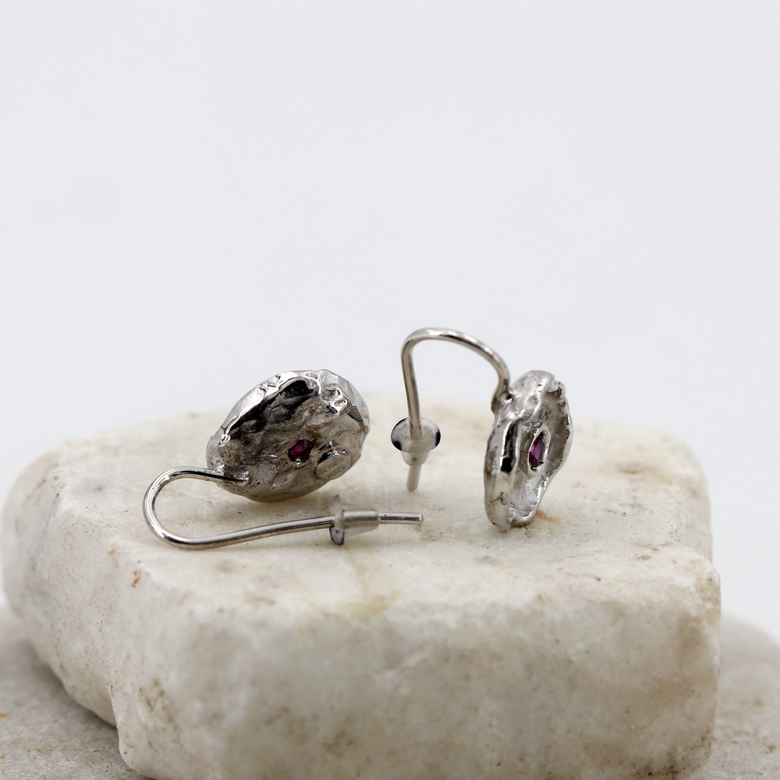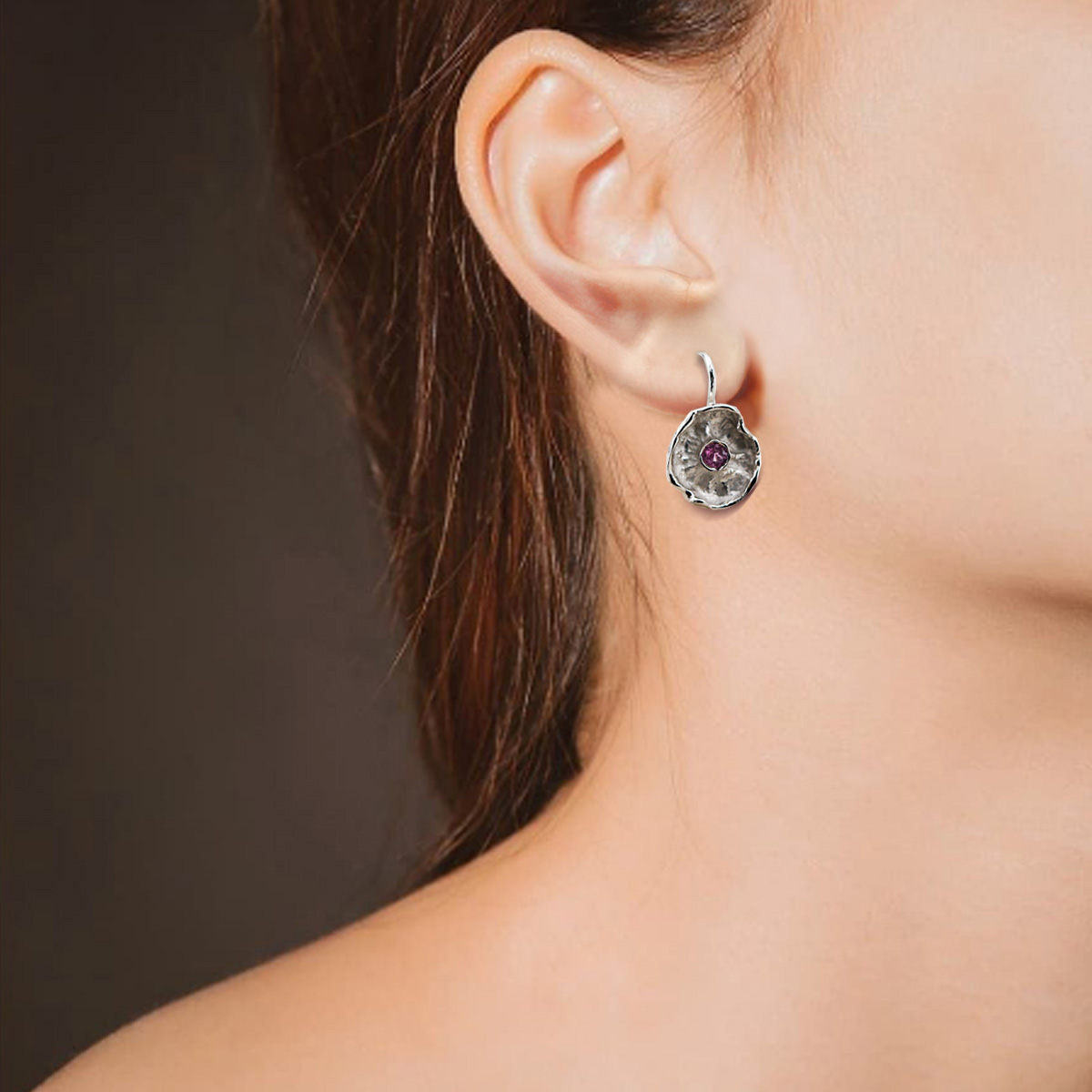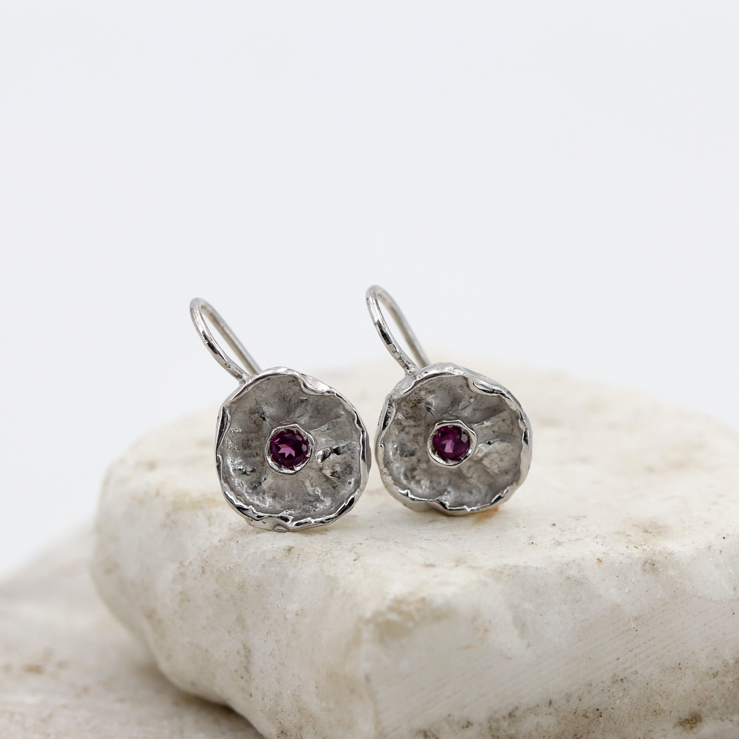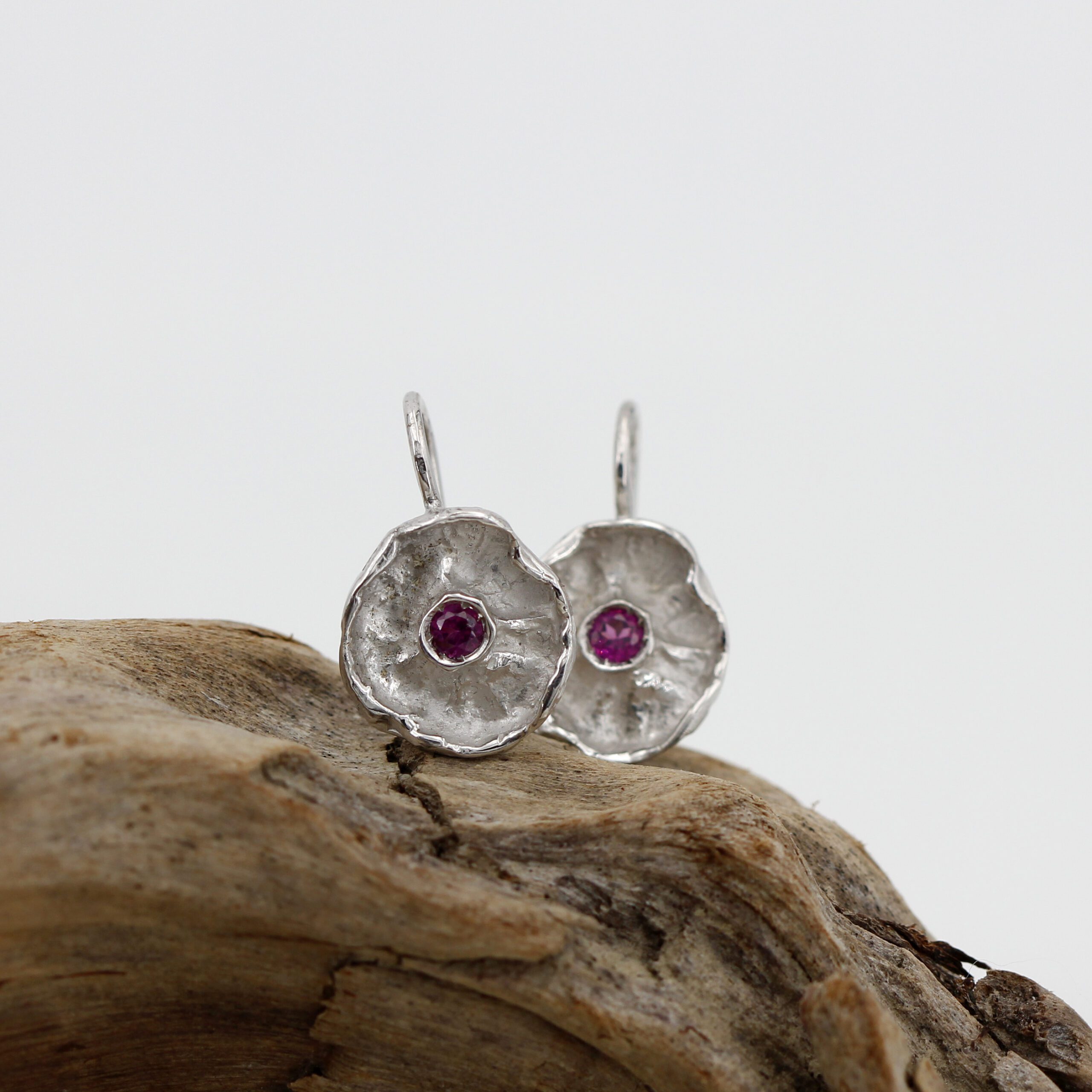 Sterling Silver 925 earrings (5.00 g) with natural Rhodolites, shaped as two central flowers, approximately 13 mm in diameter. Entirely handcrafted. Polished inner section and outer edge.