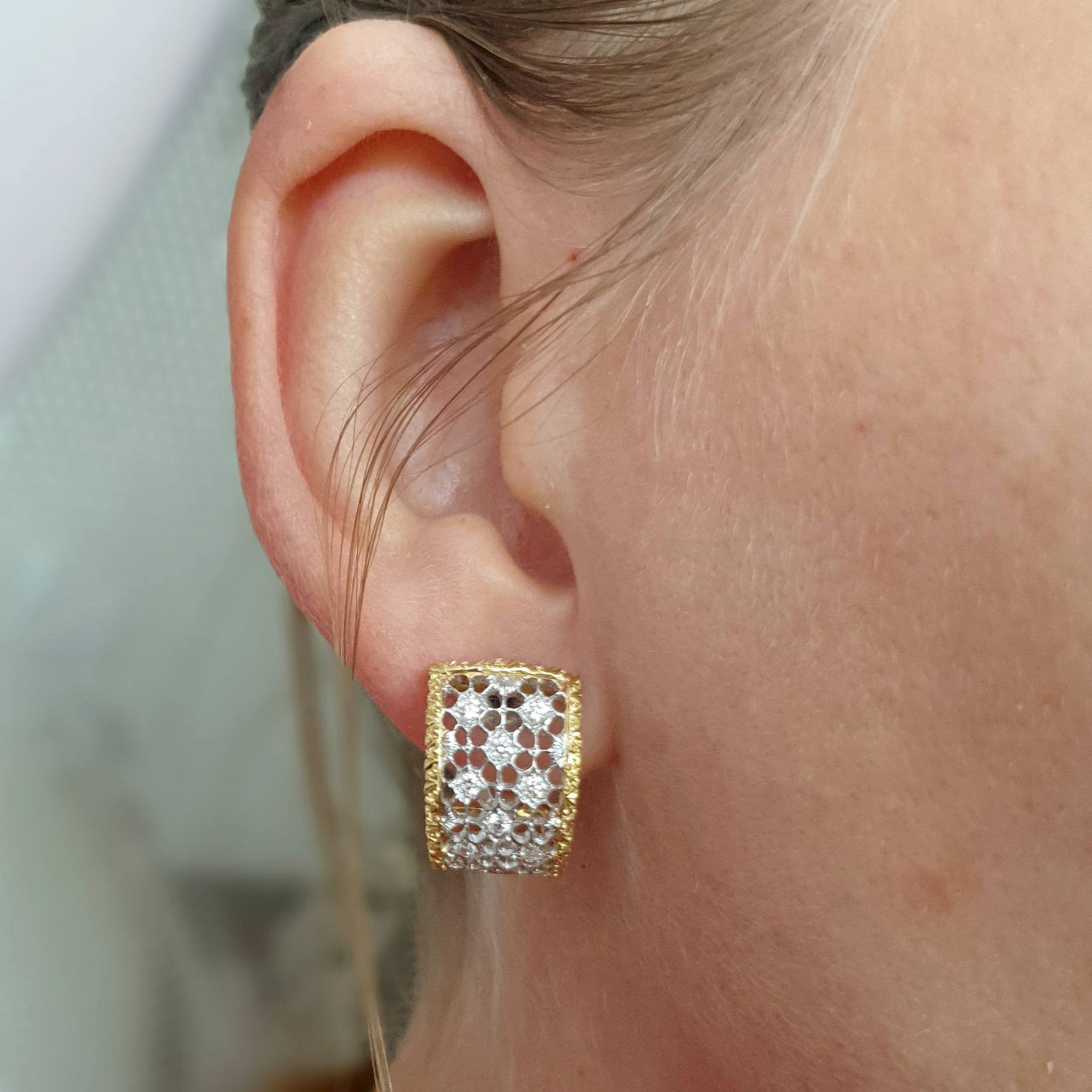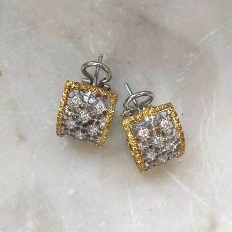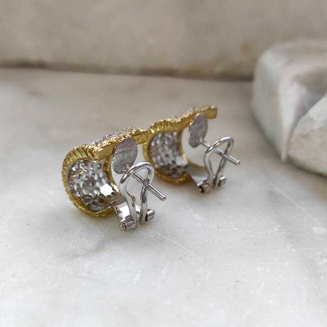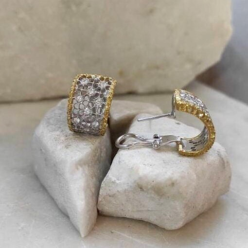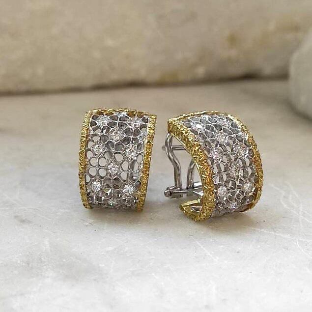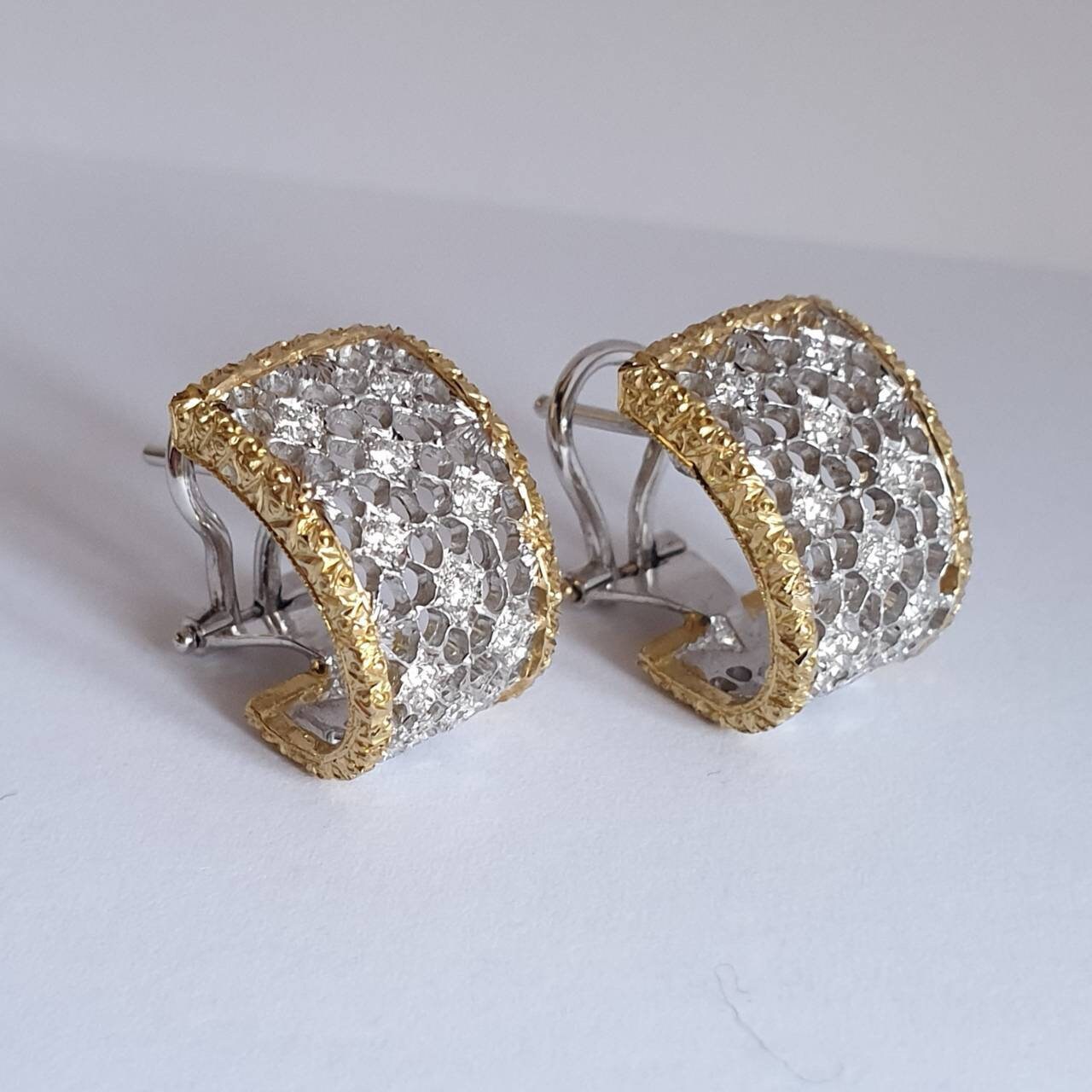 These exquisite earrings are handcrafted with exceptional artistry. The central section, made of white gold, features an intricate openwork mesh design, a hallmark of traditional Florentine craftsmanship. The side sections, crafted in yellow gold, are adorned with a delicate burl wood-style engraving.