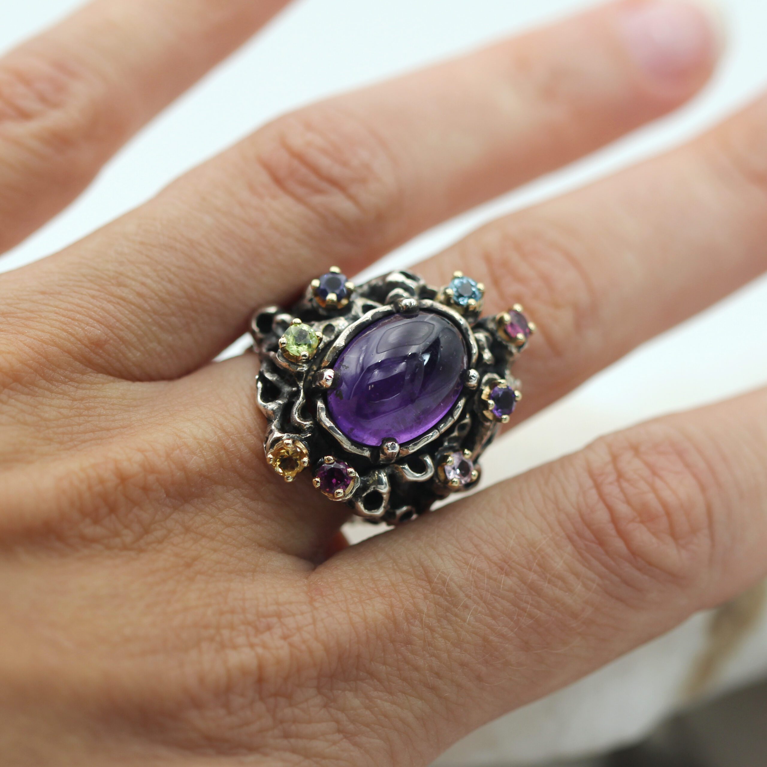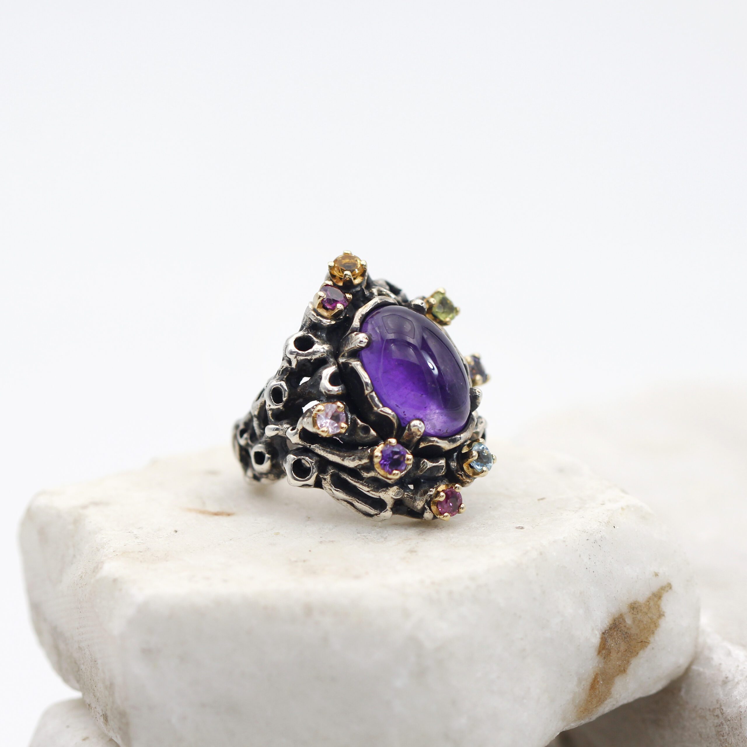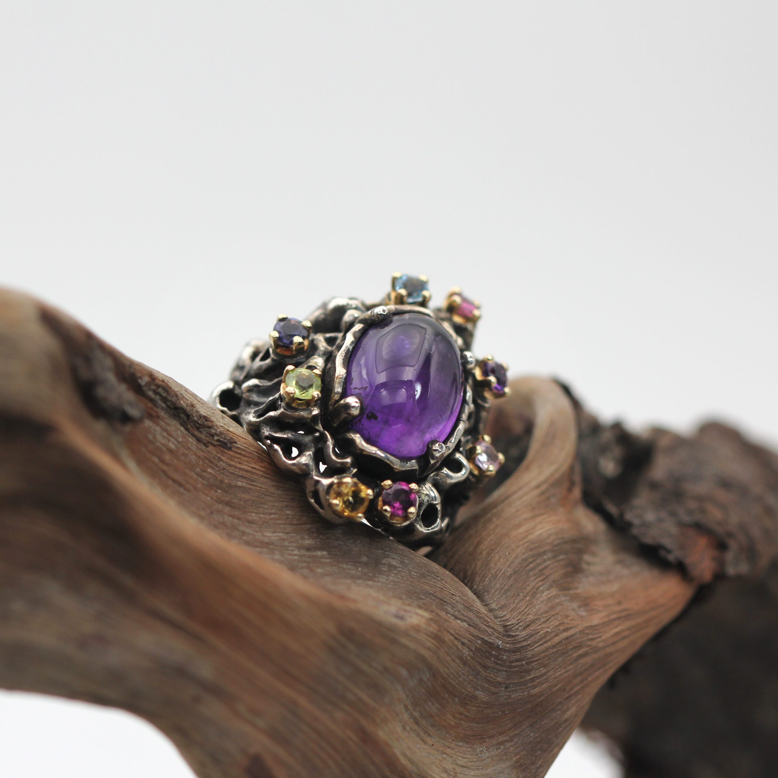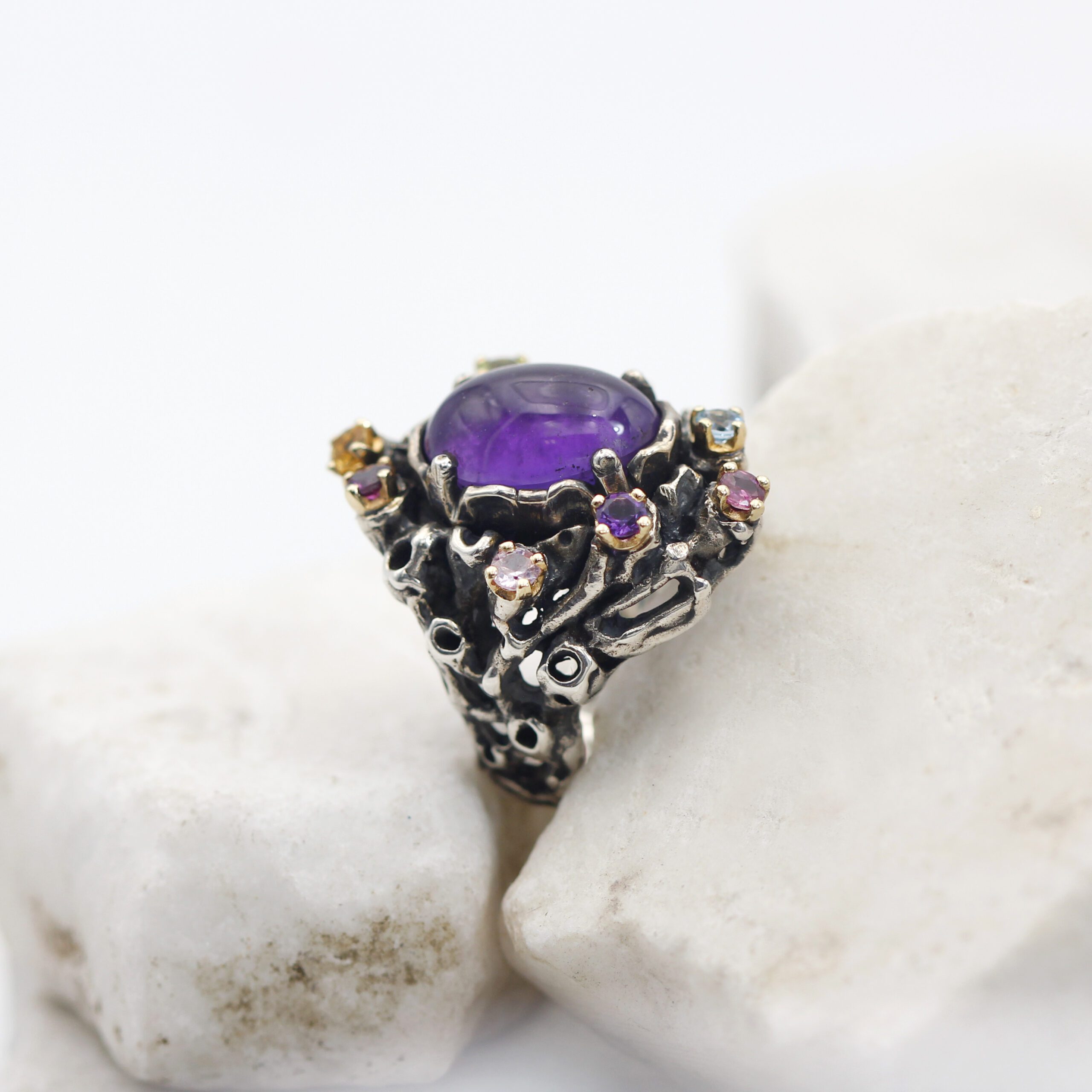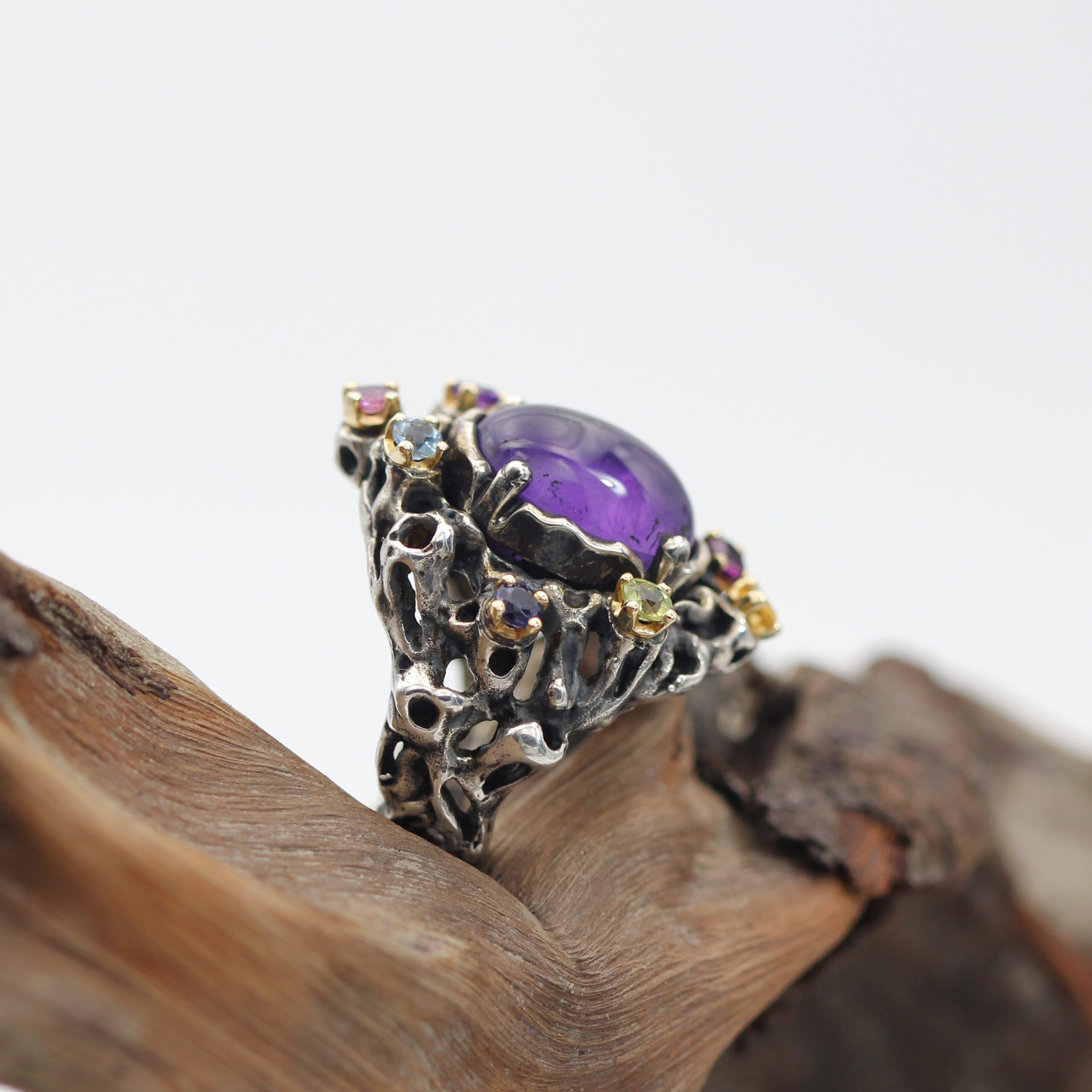Silver and Gold Ring with Amethyst and Colored Gemstones – Mars Collection.