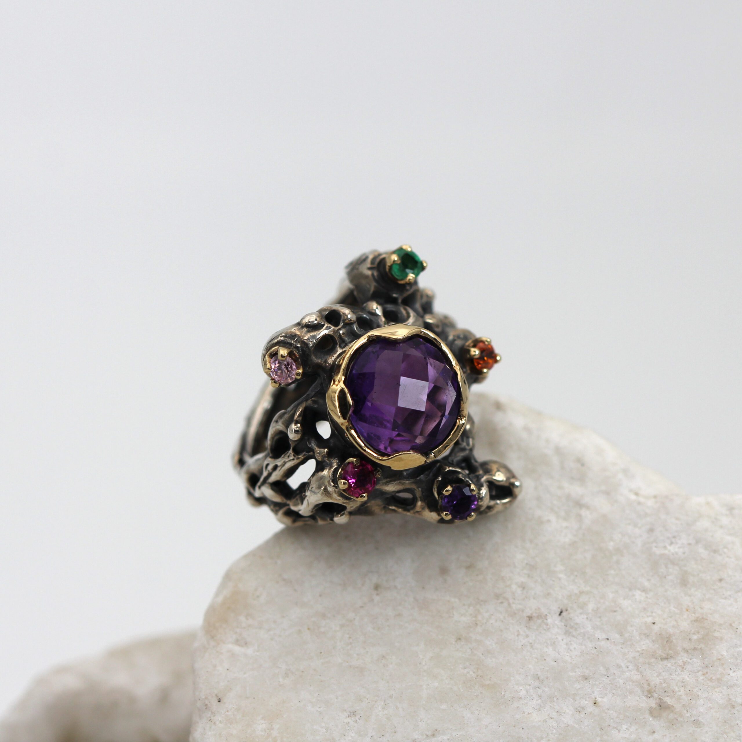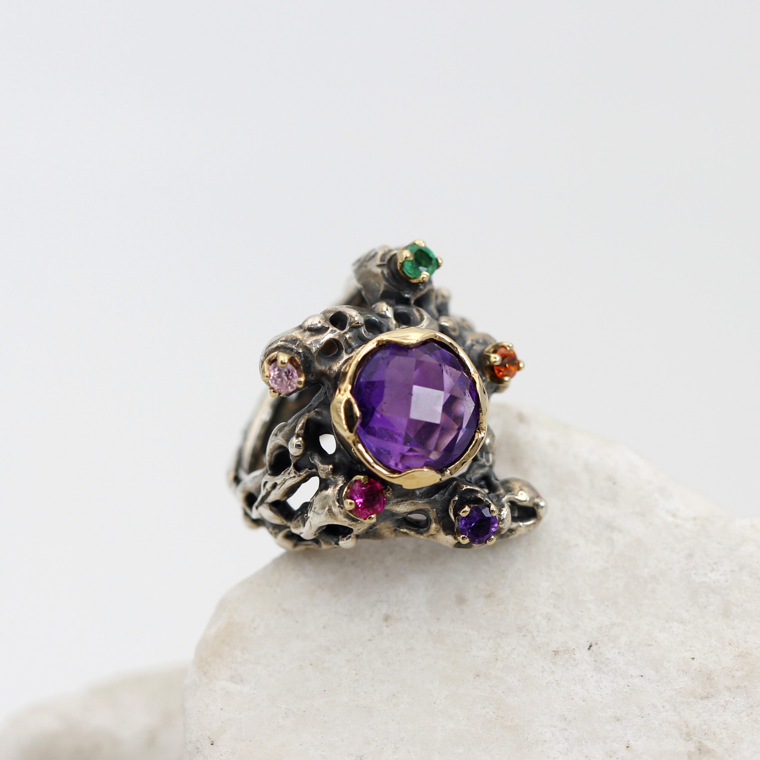 Crafted in 18K yellow gold and 925‰ silver, the ring features a faceted amethyst elegantly set at the center, surrounded by a pavé setting of various colored stones—including Citrine Quartz, Peridot, Pink Amethyst. The combination of gold and silver creates a sophisticated and unique color contrast, while the amethyst adds a vibrant and luminous touch.