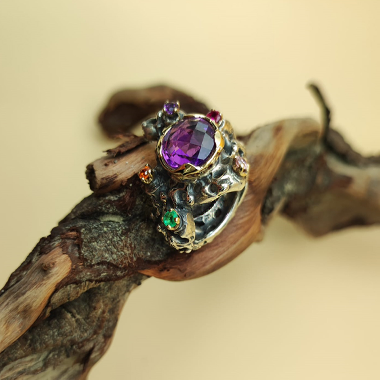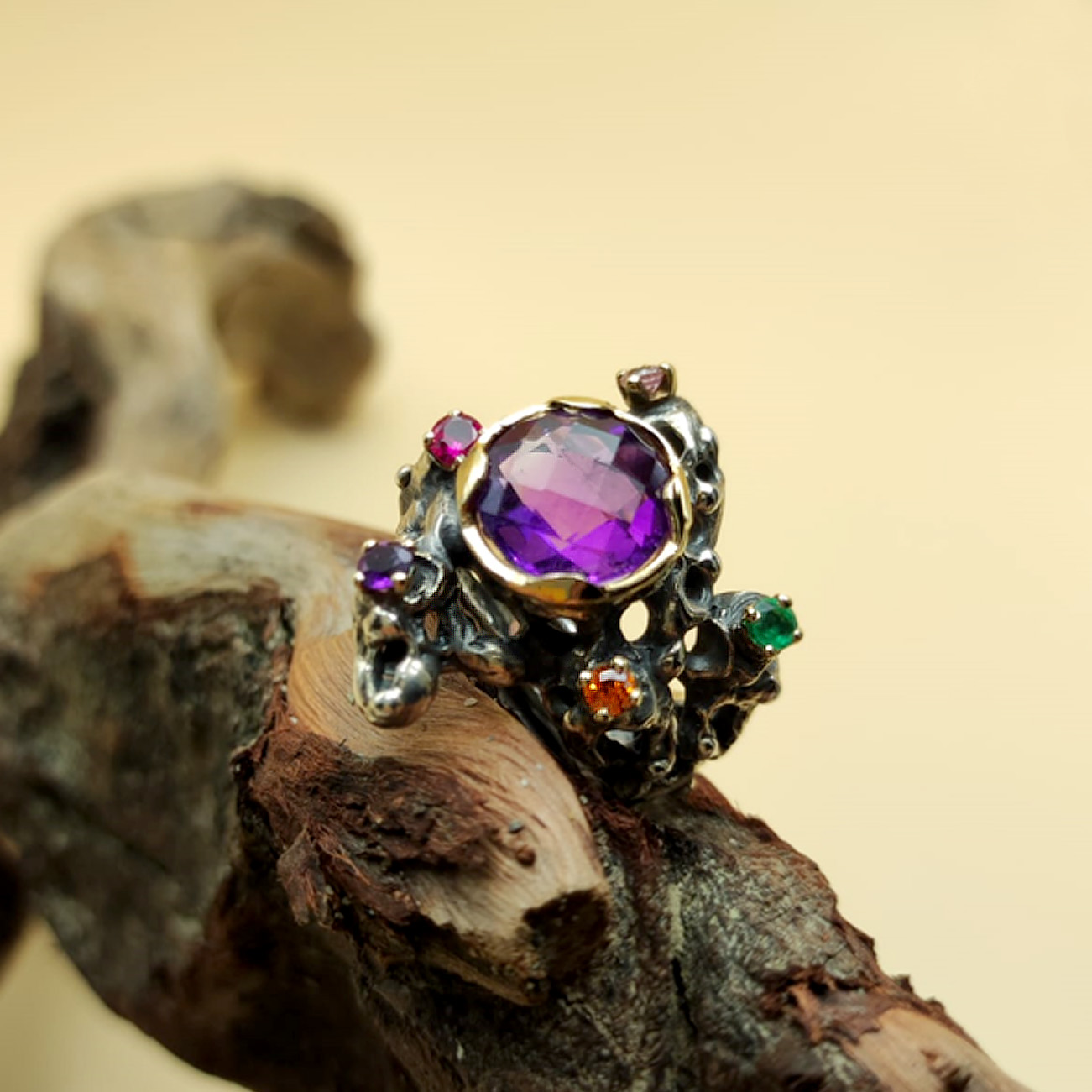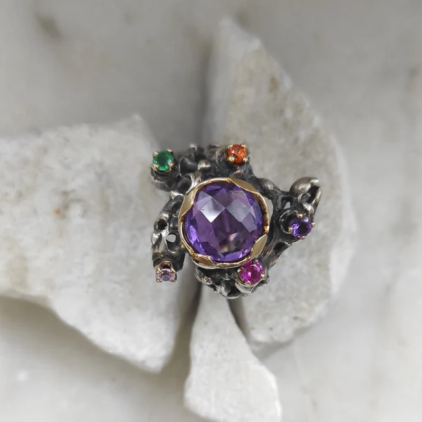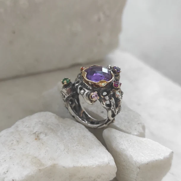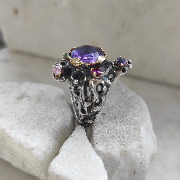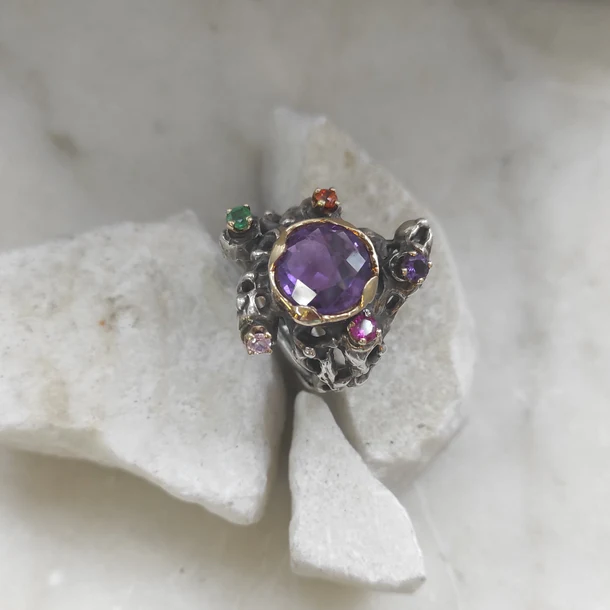 The silver and gold ring with amethyst is an elegant and refined piece of jewelry that never goes out of style. This stunning ring is perfect for those who appreciate the natural beauty of gemstones and the craftsmanship of handmade jewelry.