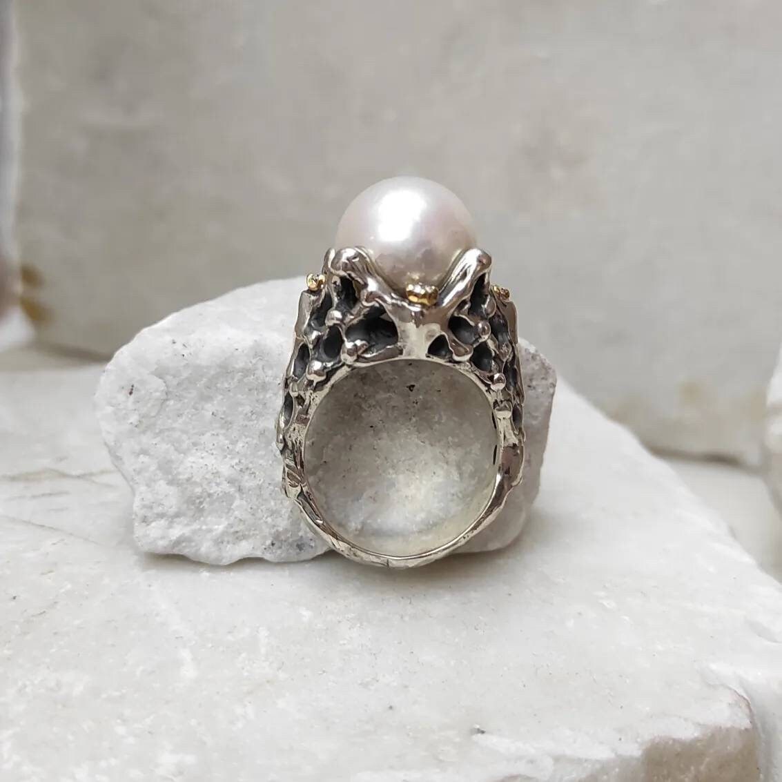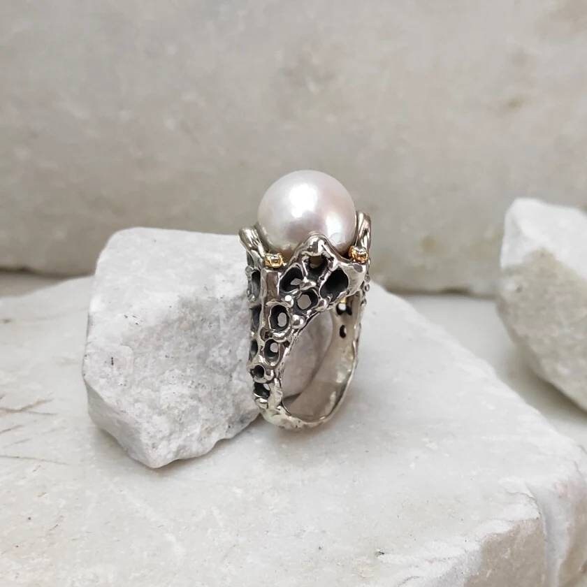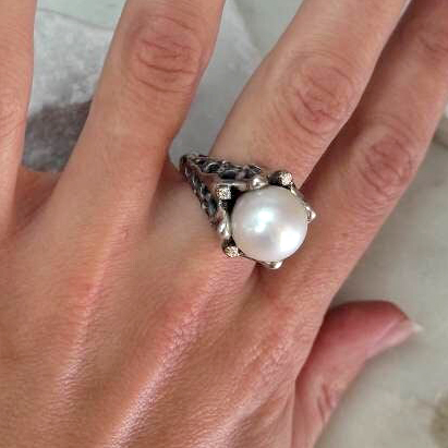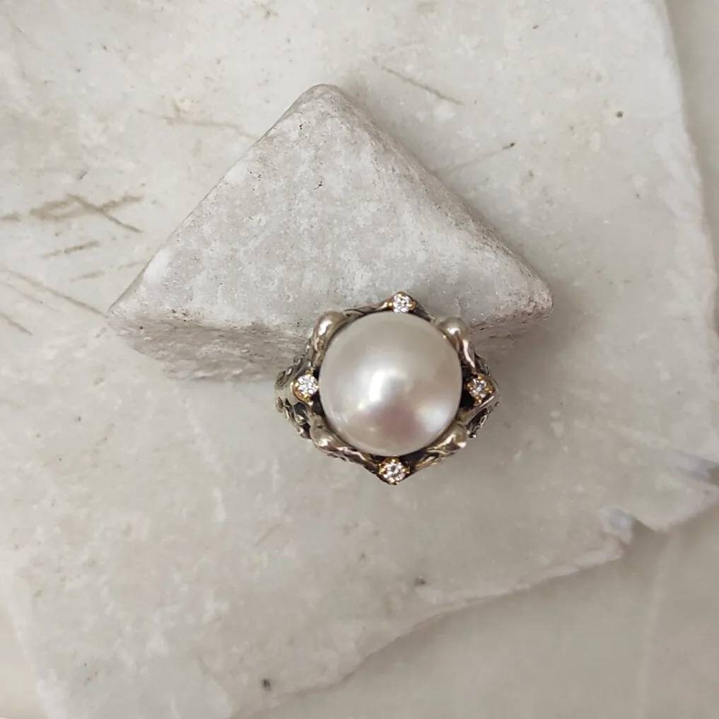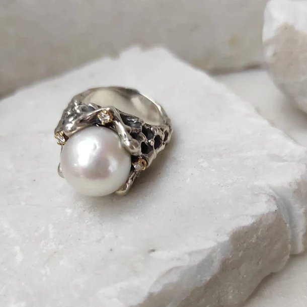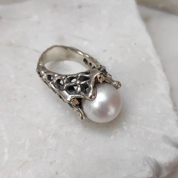 Silver Ring with Gold Details, Natural Pearl and Diamonds.