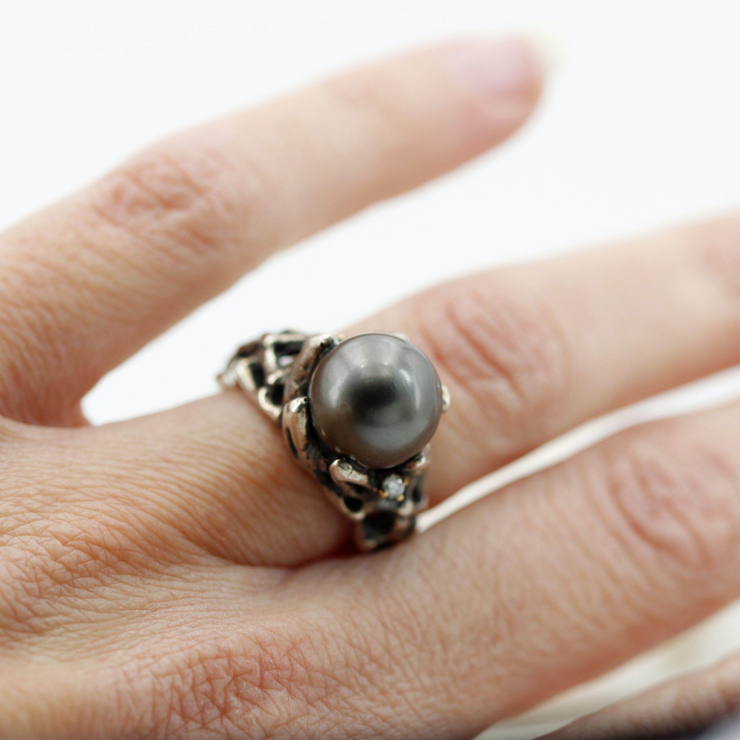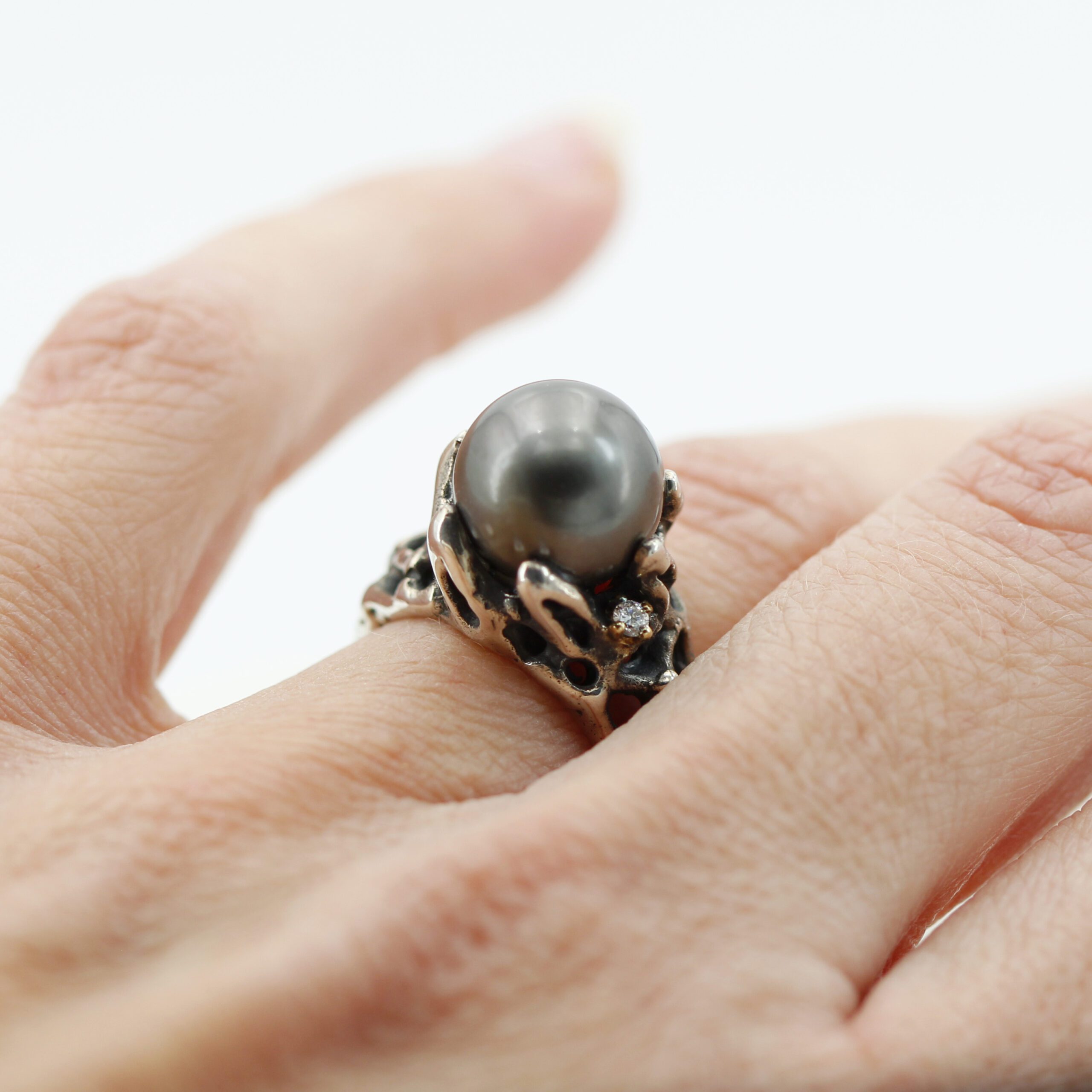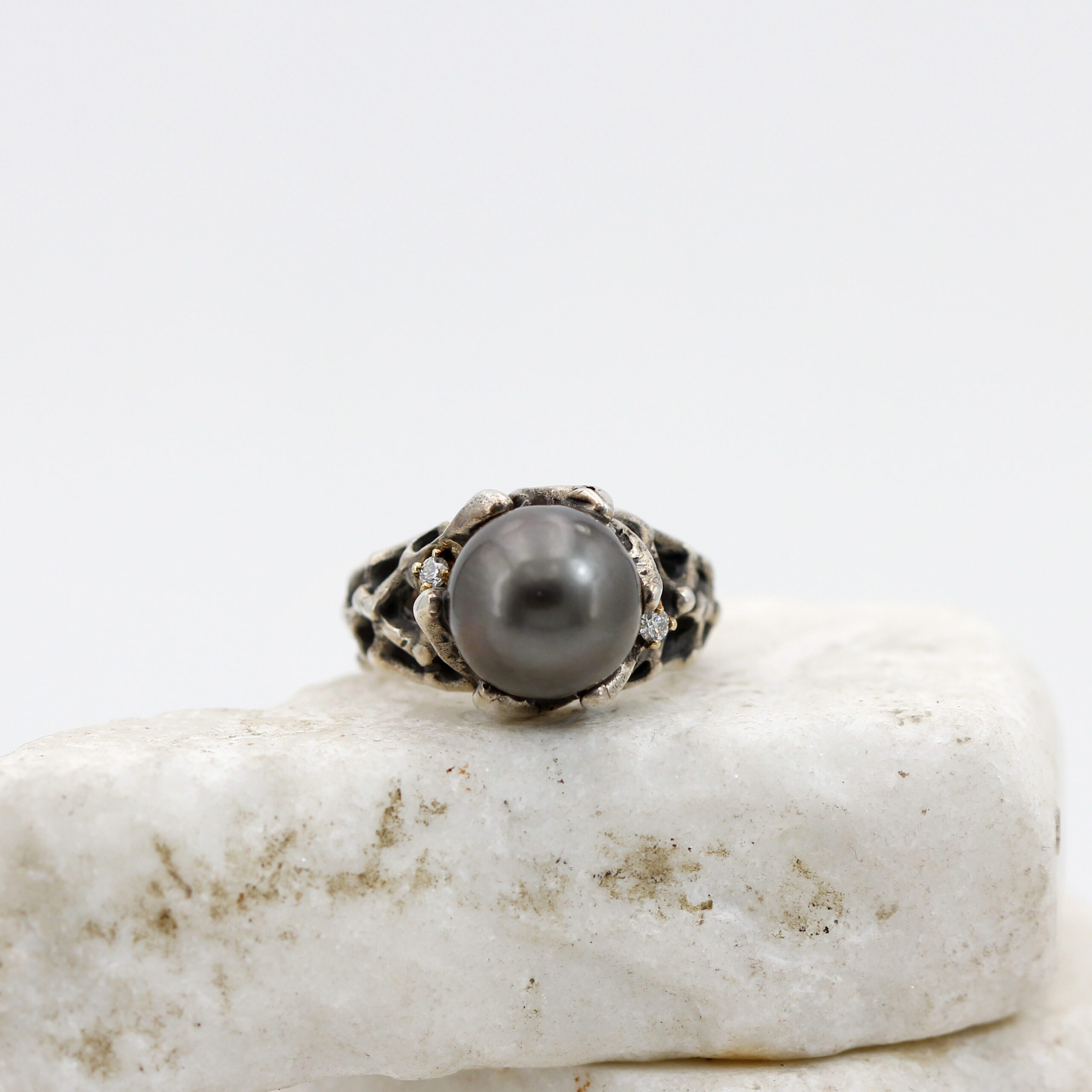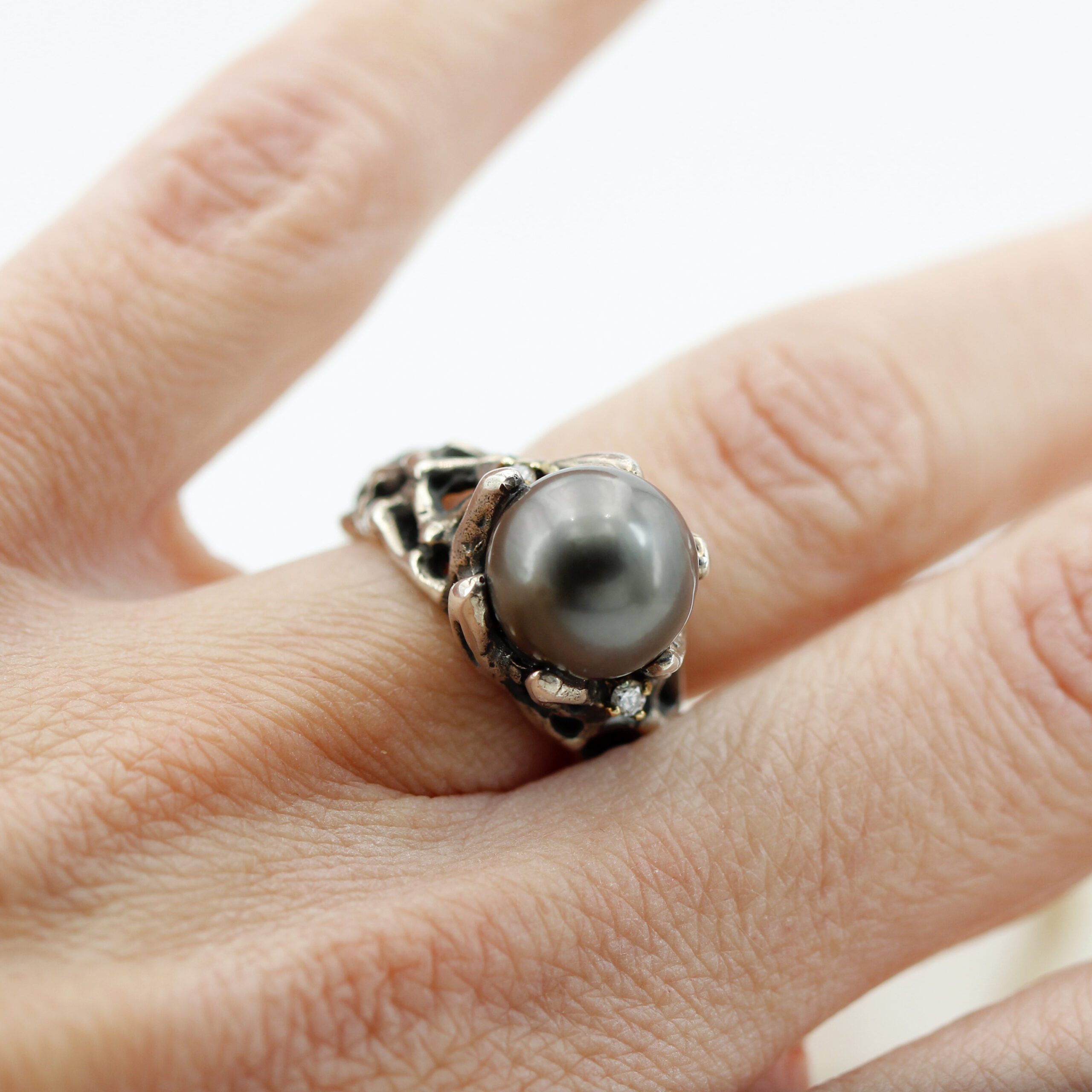 Ring in silver, 7.20 g, and 750‰ (18 kt) gold settings, 0.20 g, with a natural Tahitian pearl at the center and 2 brilliant-cut diamonds, total carat weight 0.06.