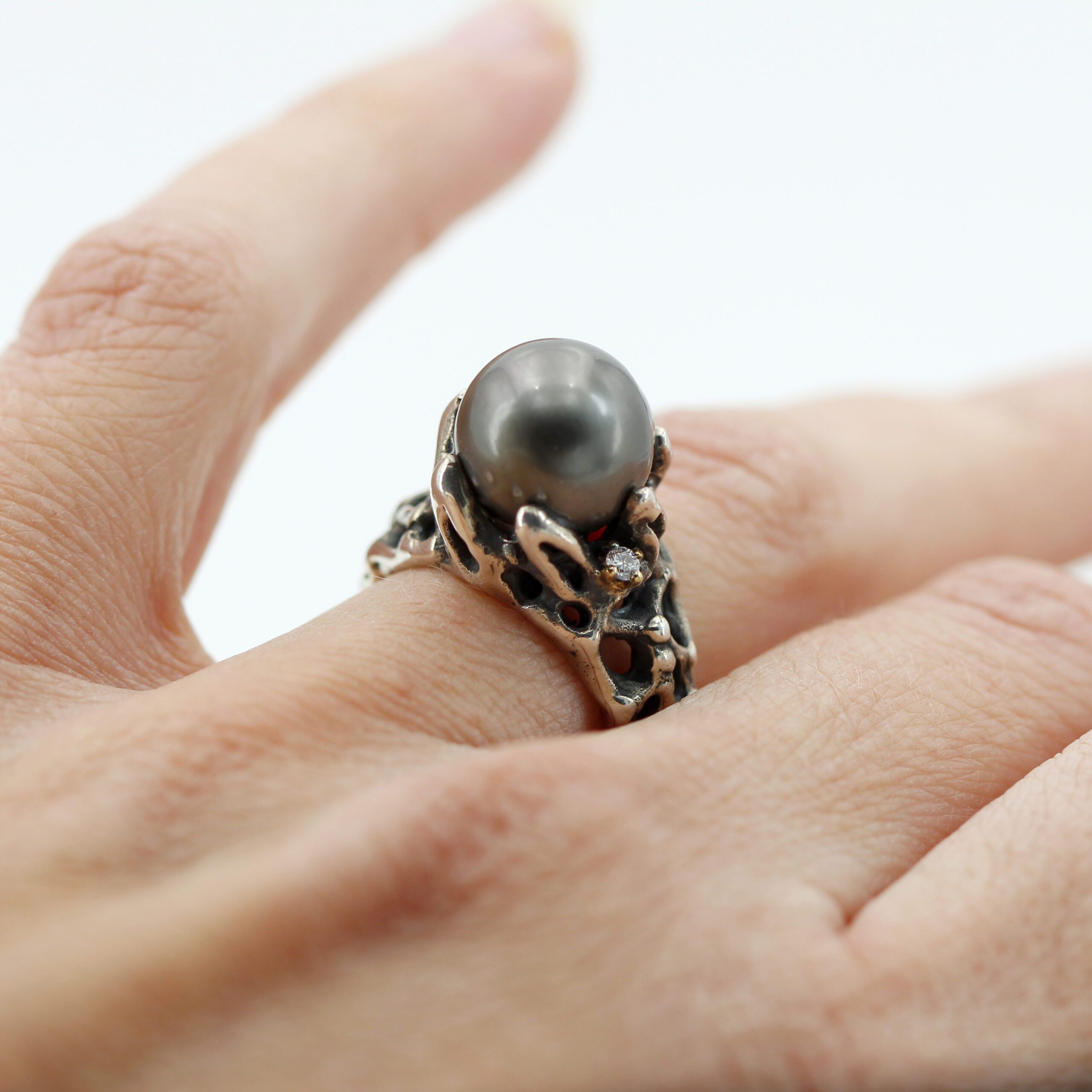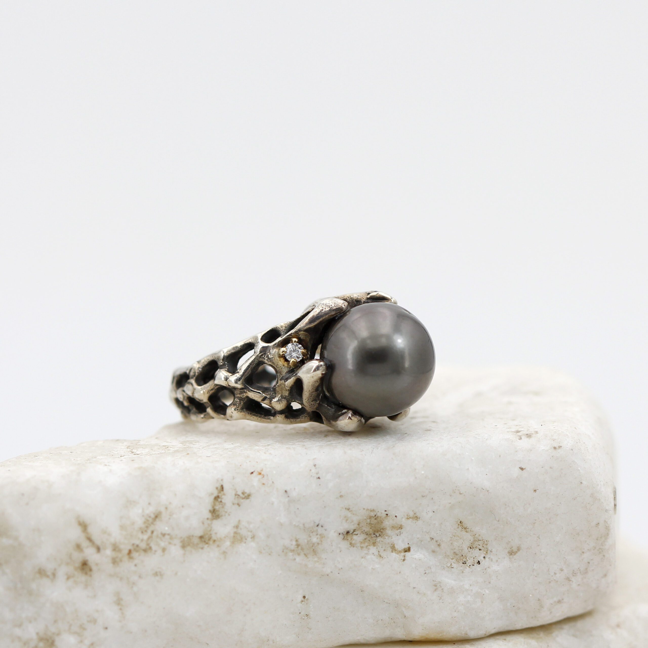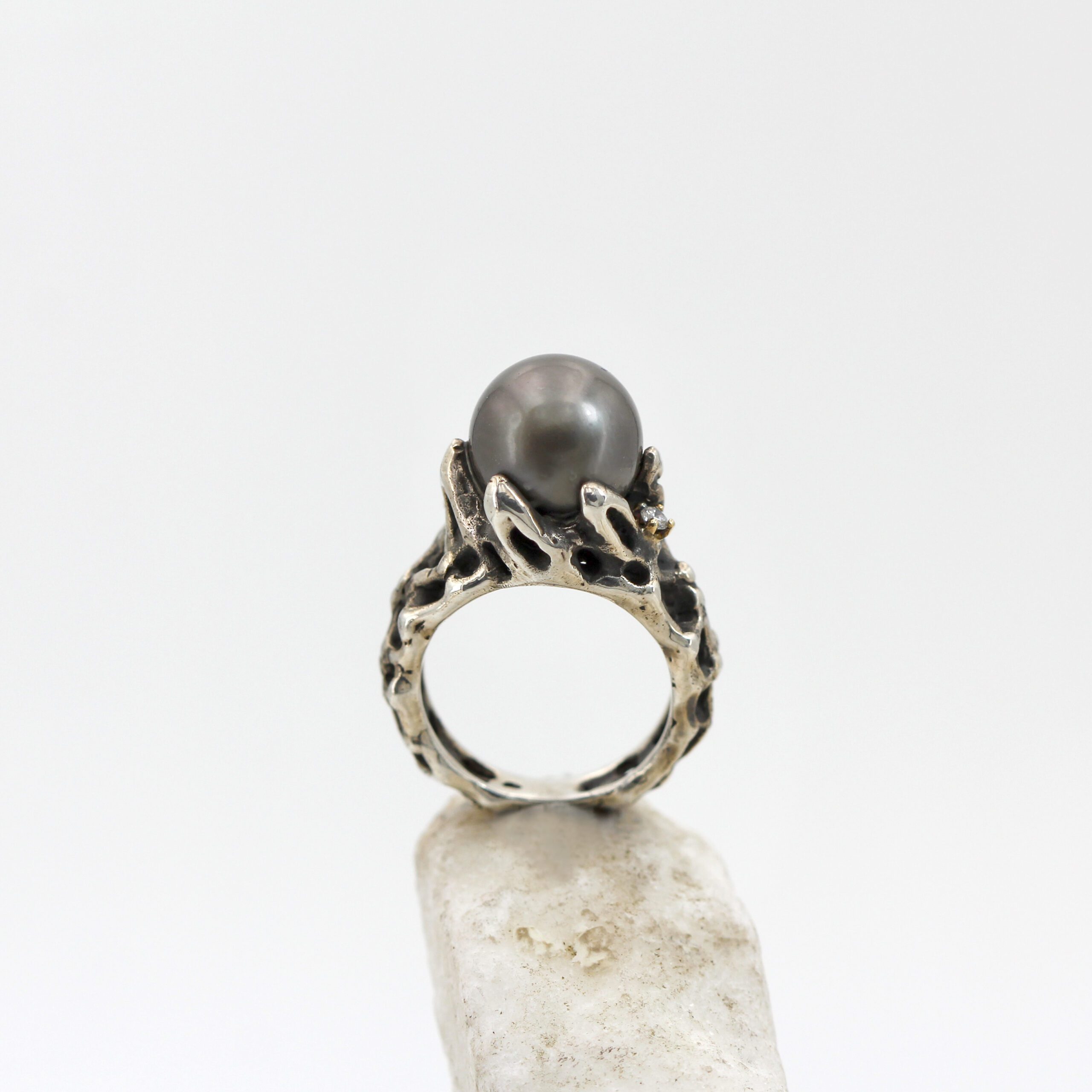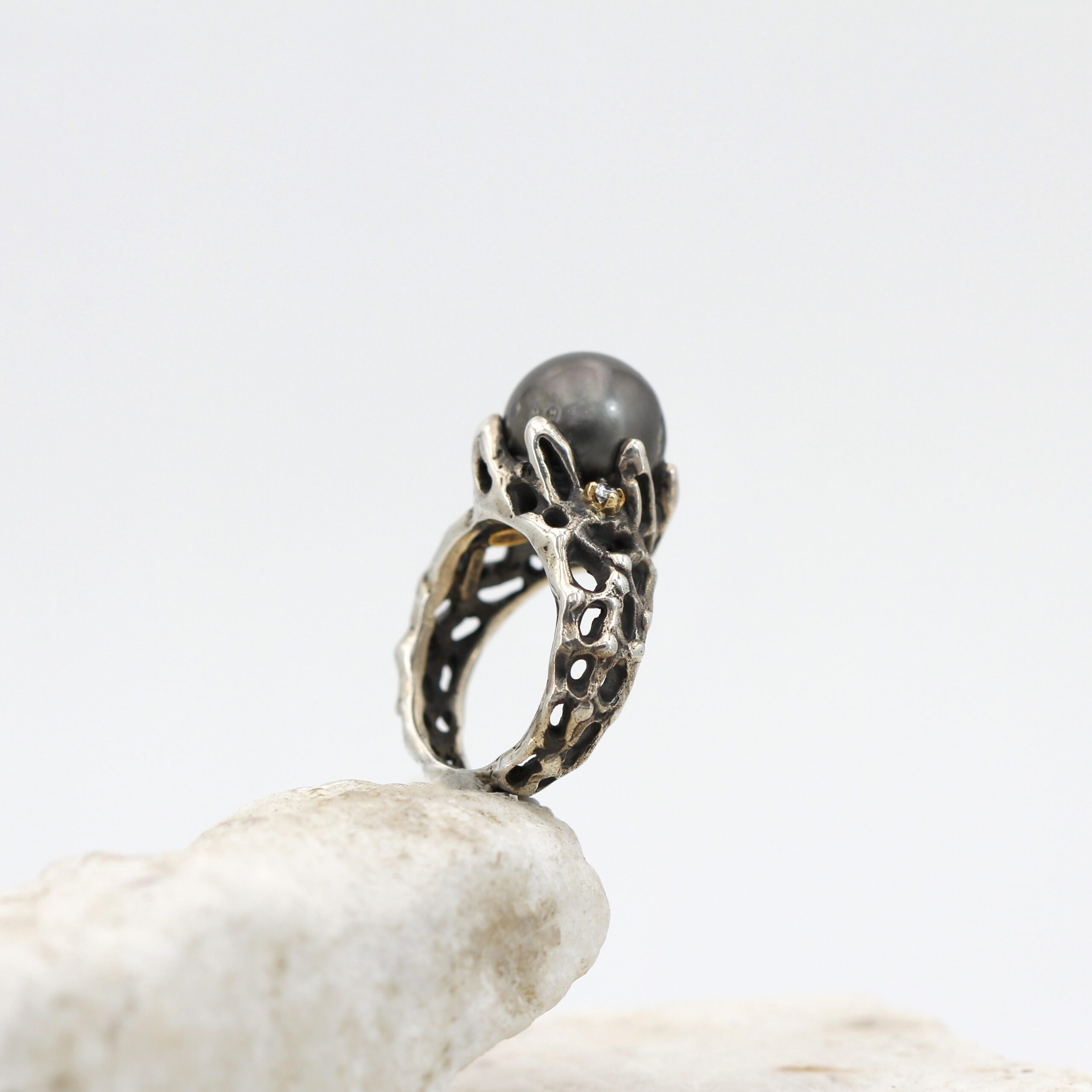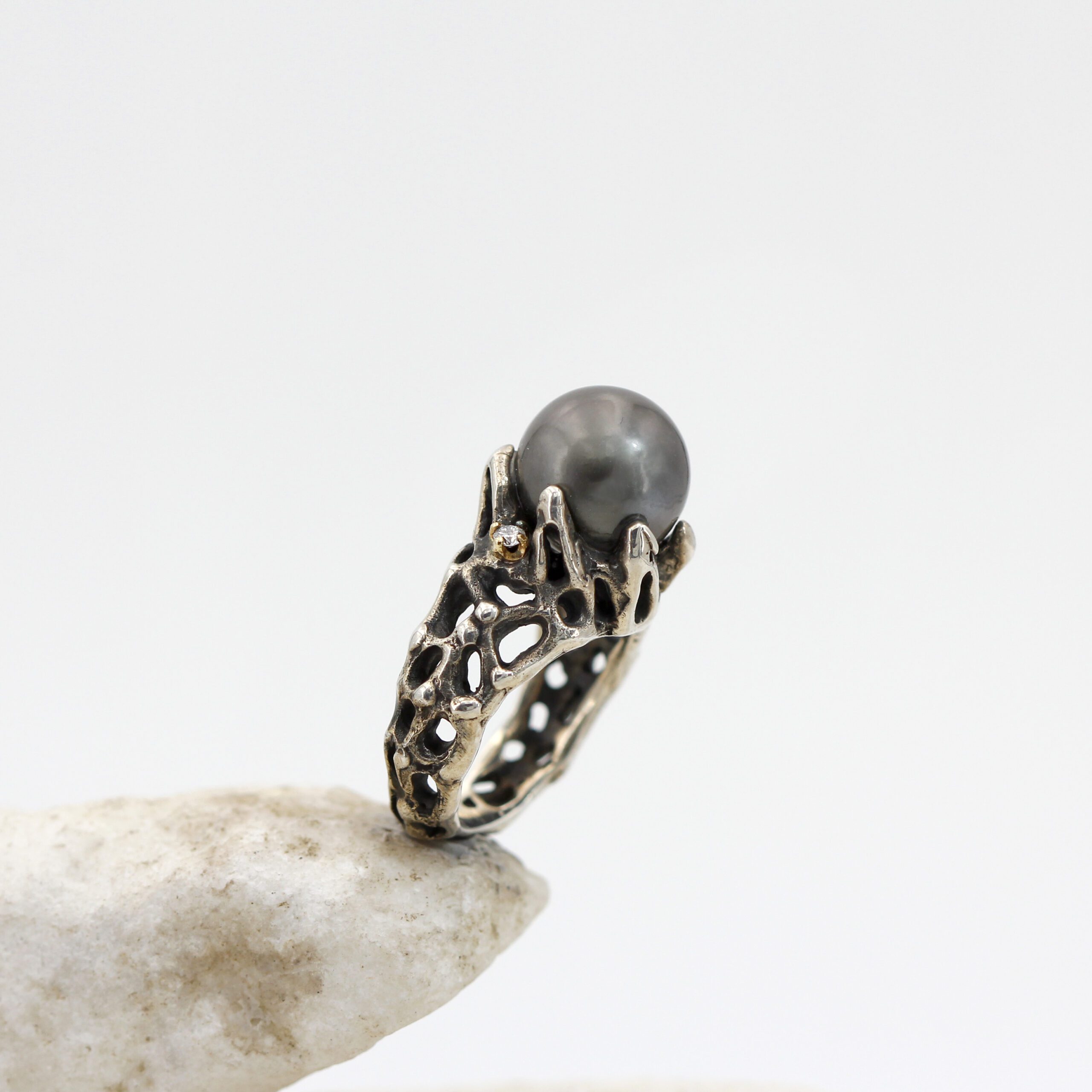 Ring in silver, 7.20 g, and 750‰ (18 kt) gold settings, 0.20 g, with a natural Tahitian pearl at the center and 2 brilliant-cut diamonds, total carat weight 0.06.