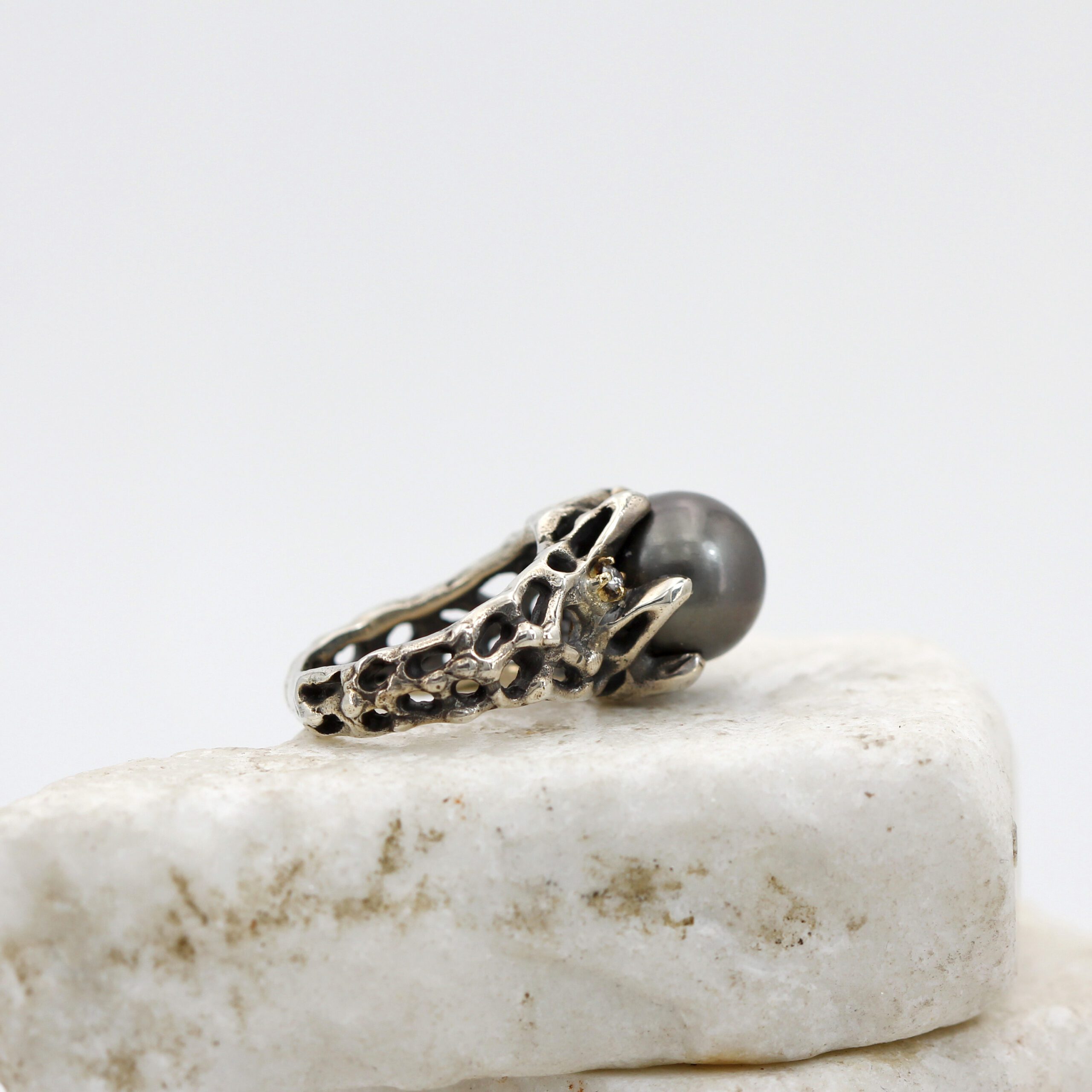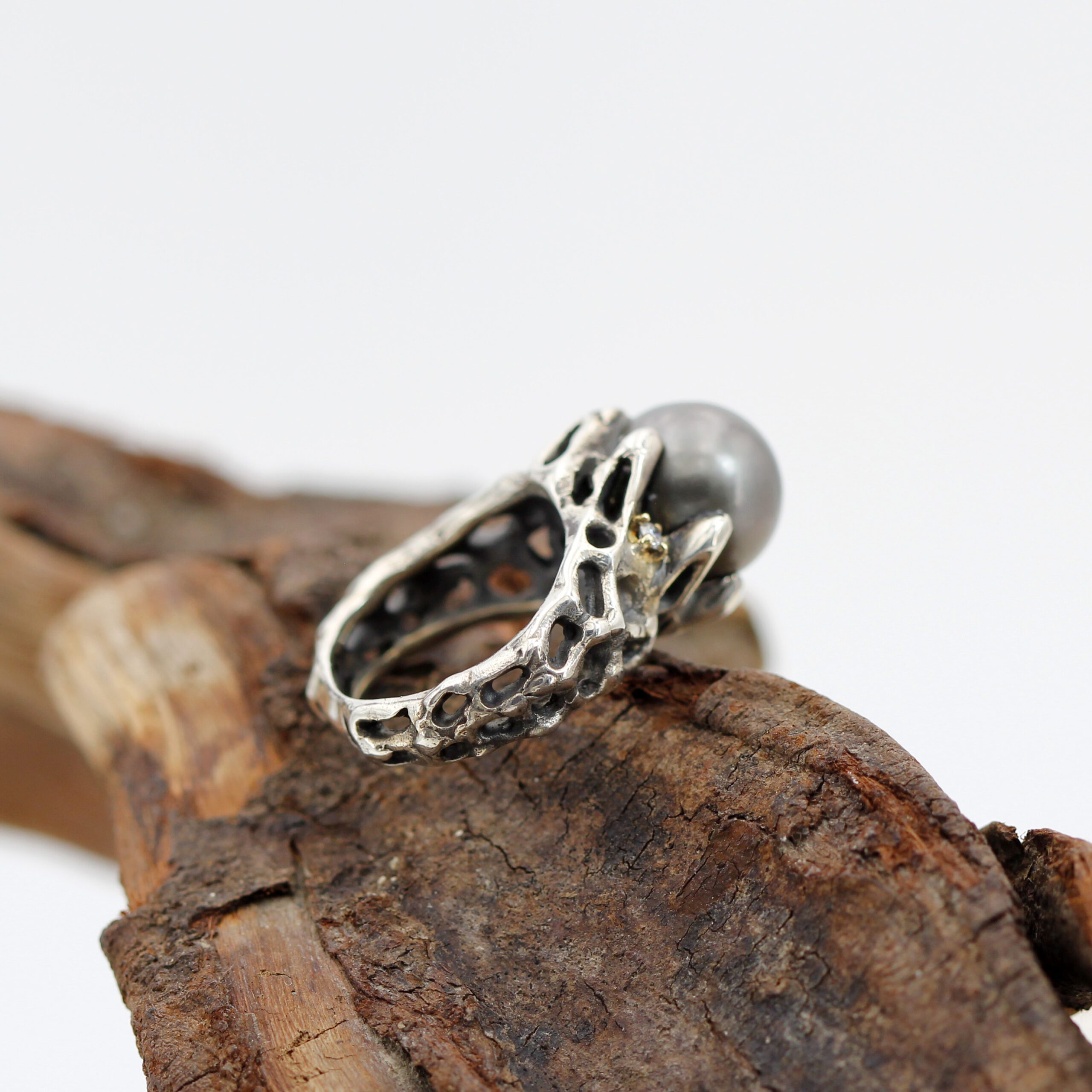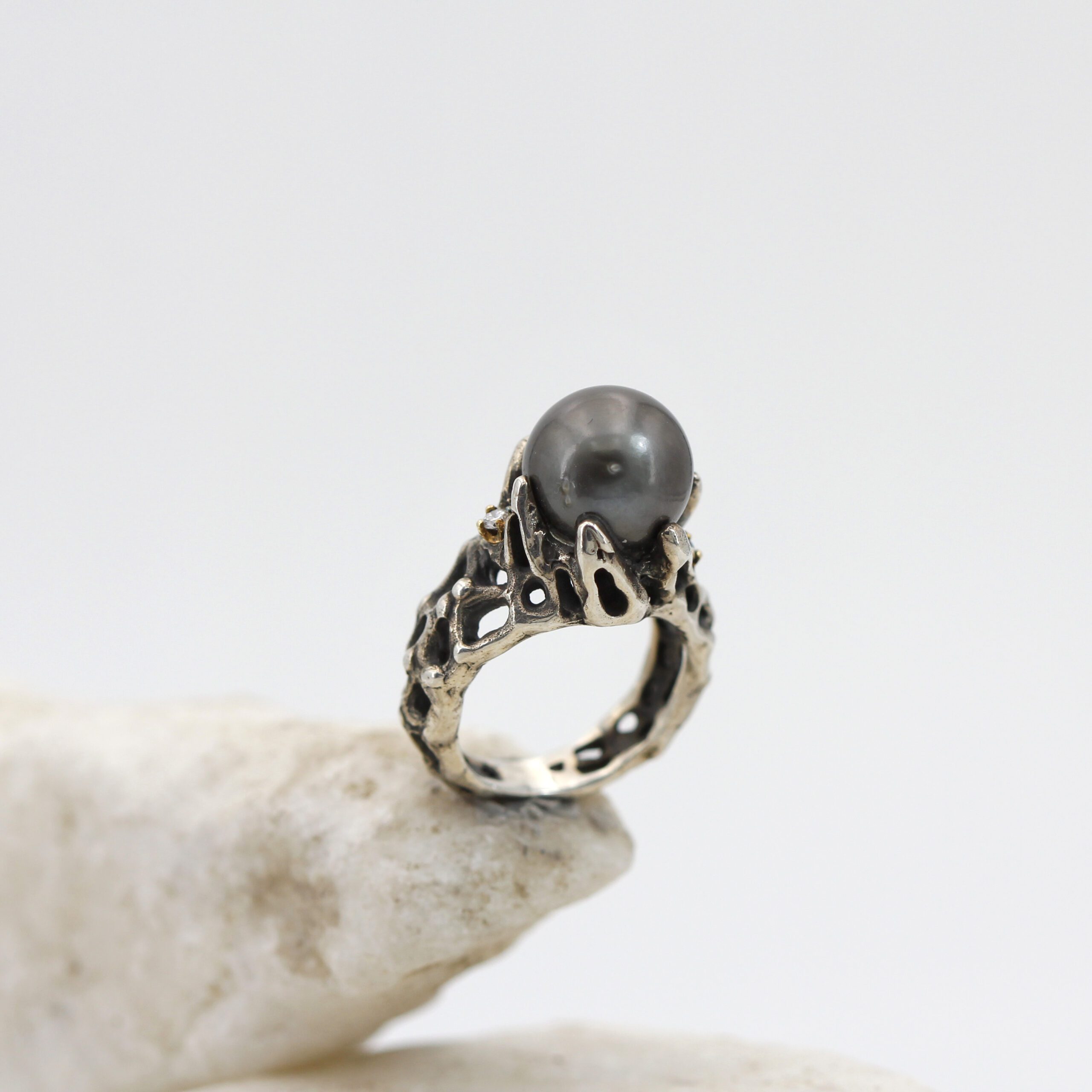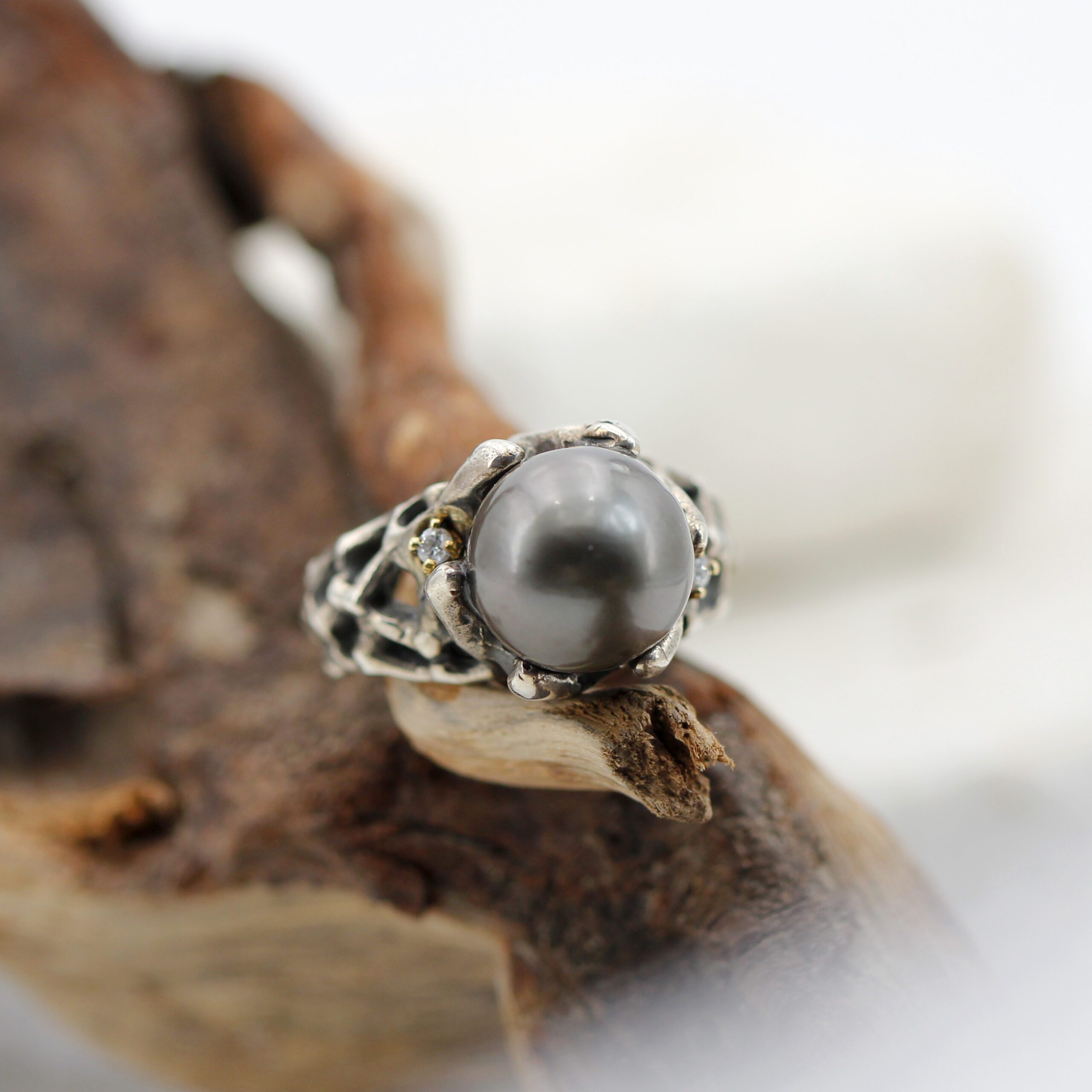 Ring in silver, 7.20 g, and 750‰ (18 kt) gold settings, 0.20 g, with a natural Tahitian pearl at the center and 2 brilliant-cut diamonds, total carat weight 0.06.