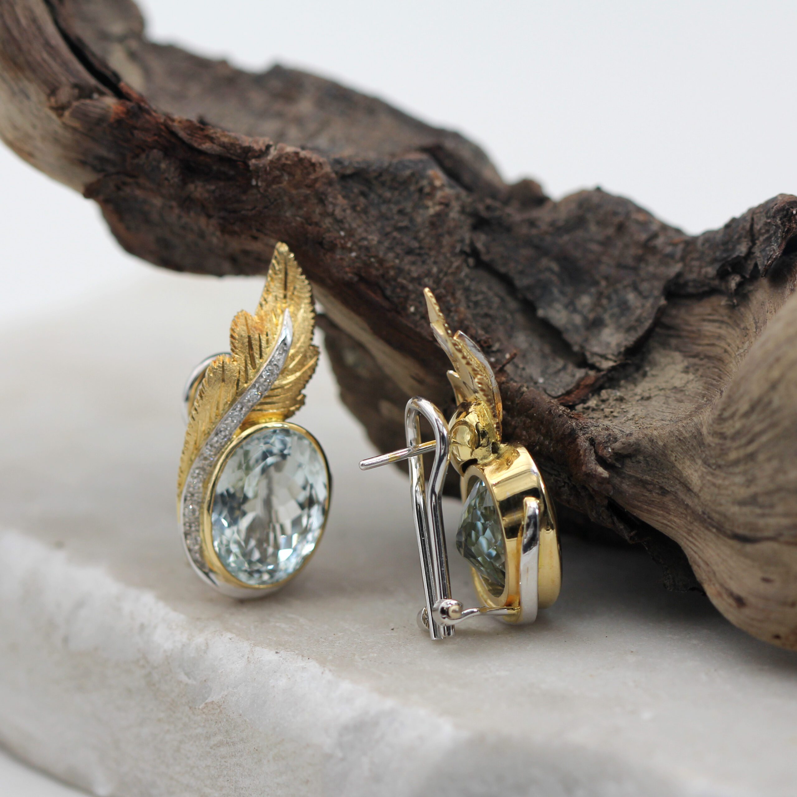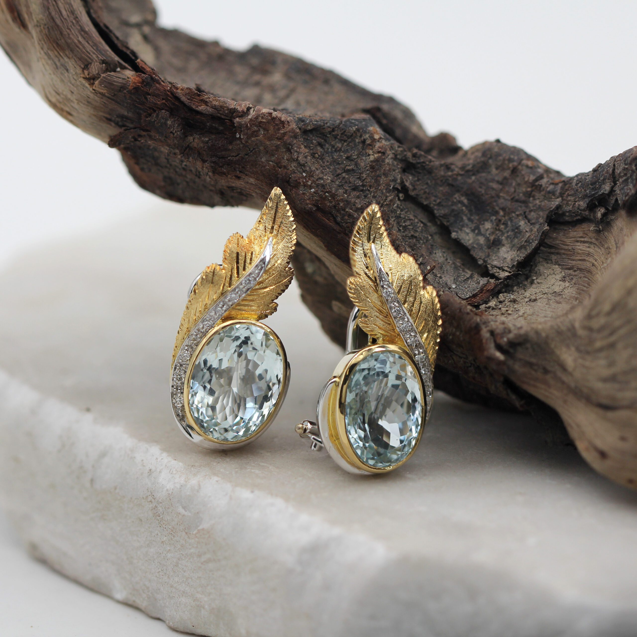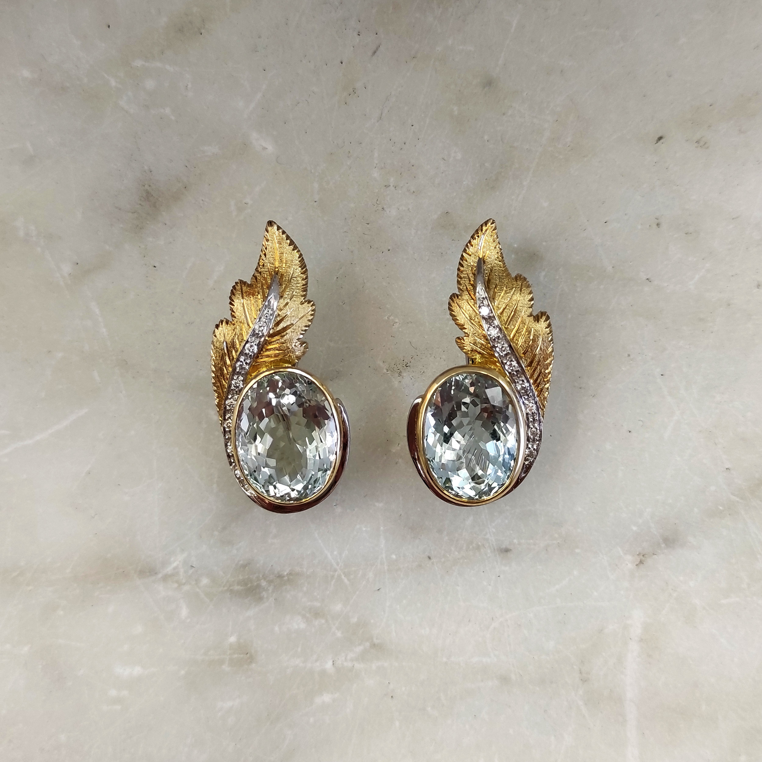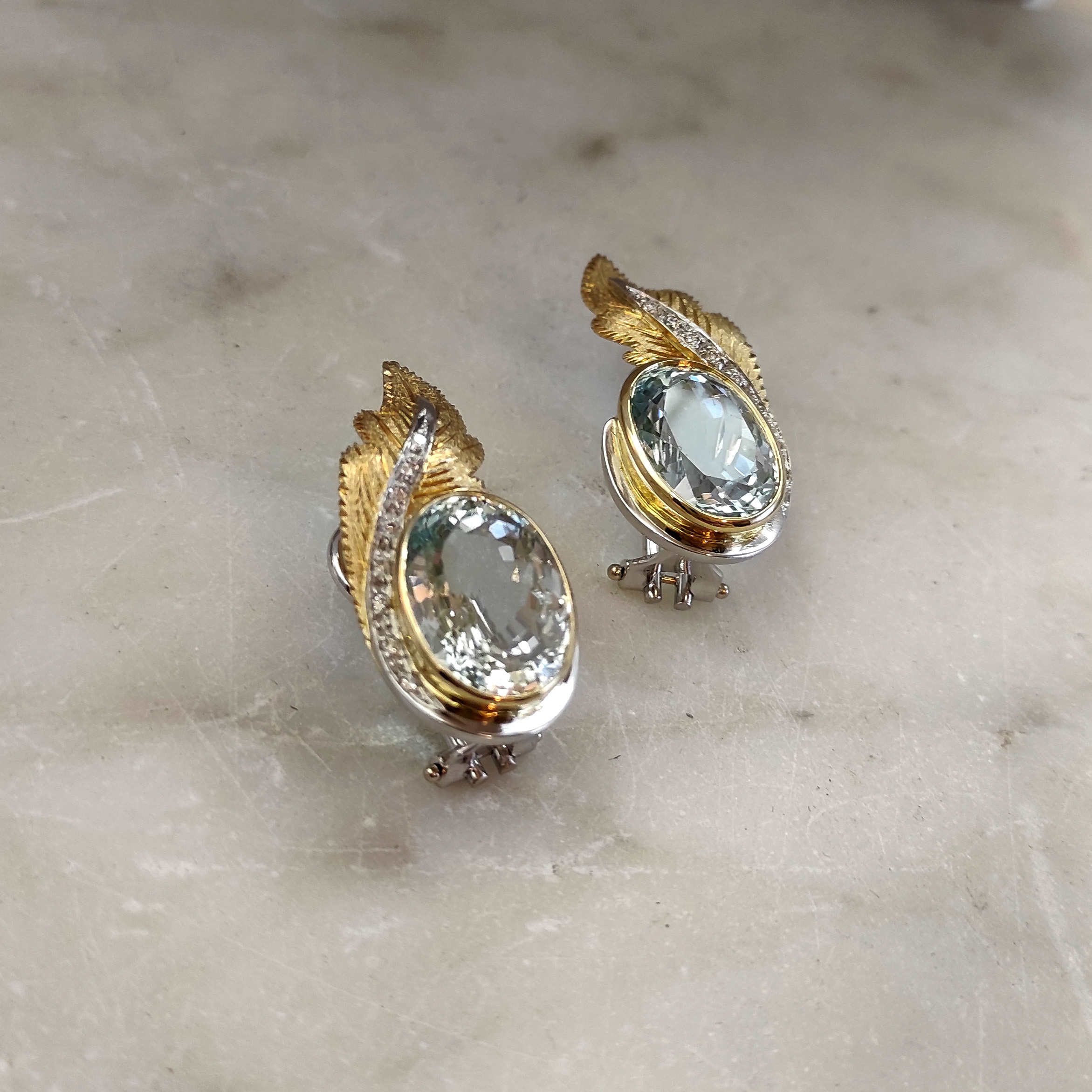These handcrafted clip-on gold earrings with aquamarine and natural diamonds perfectly combine elegance and luxury. The leaves, crafted in 18K white gold (750‰), are intricately designed using the piercing and hand-engraving technique, adding a unique artistic touch.