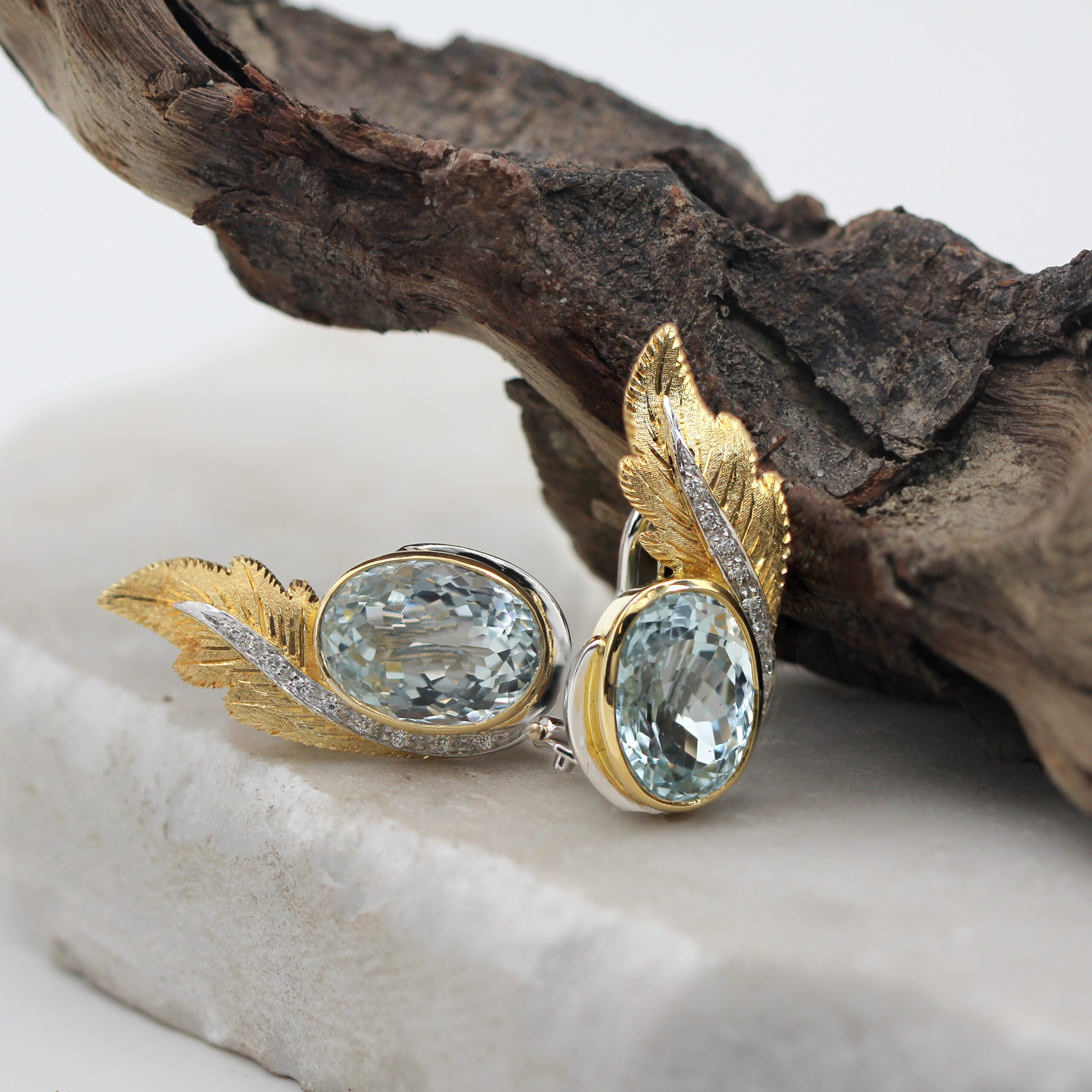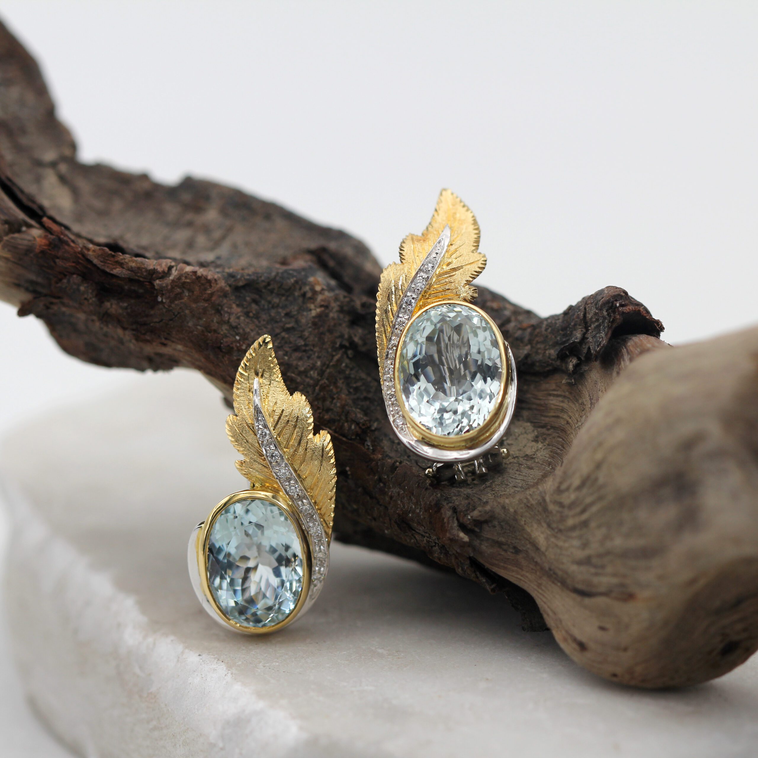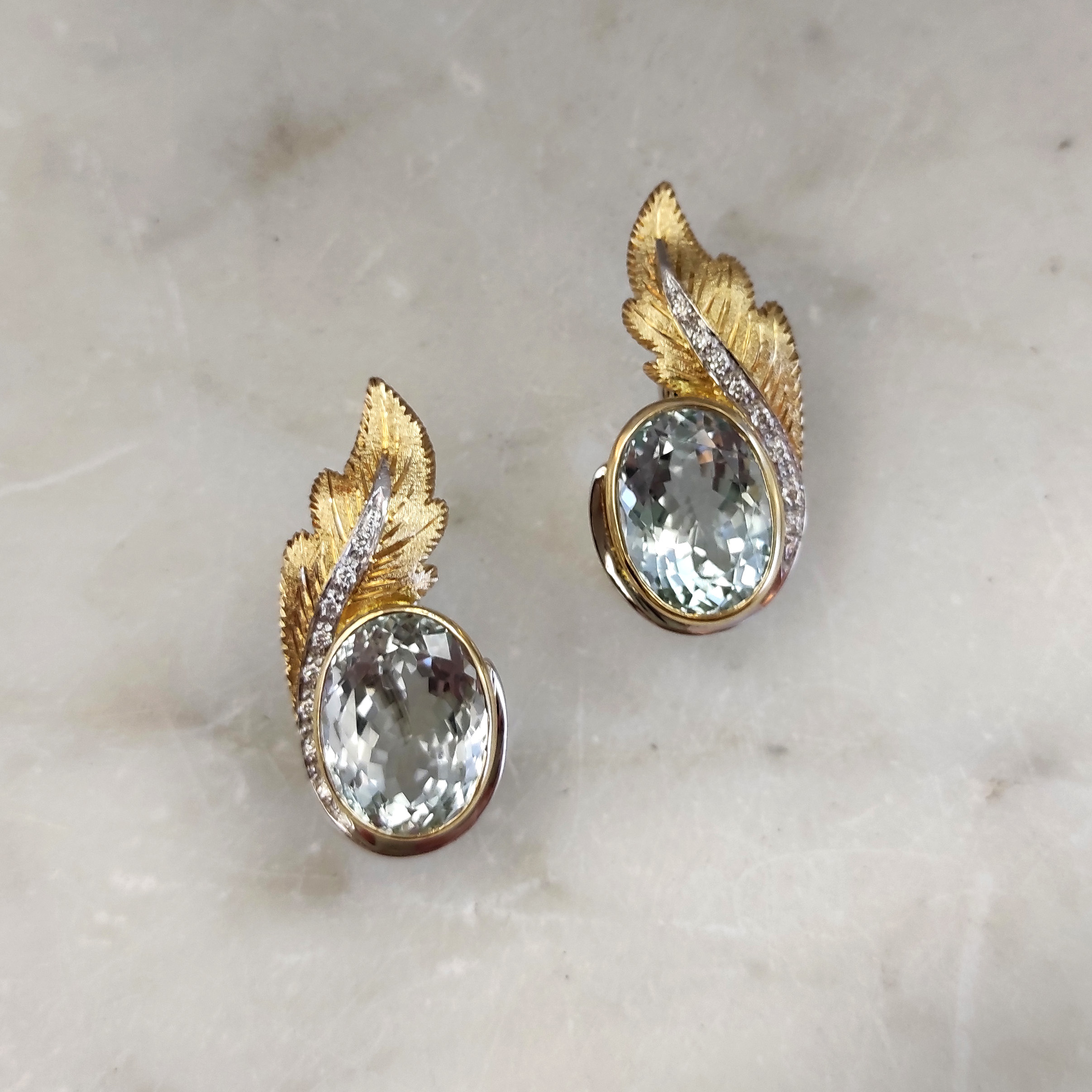 These handcrafted clip-on gold earrings with aquamarine and natural diamonds perfectly combine elegance and luxury. The leaves, crafted in 18K white gold (750‰), are intricately designed using the piercing and hand-engraving technique, adding a unique artistic touch.