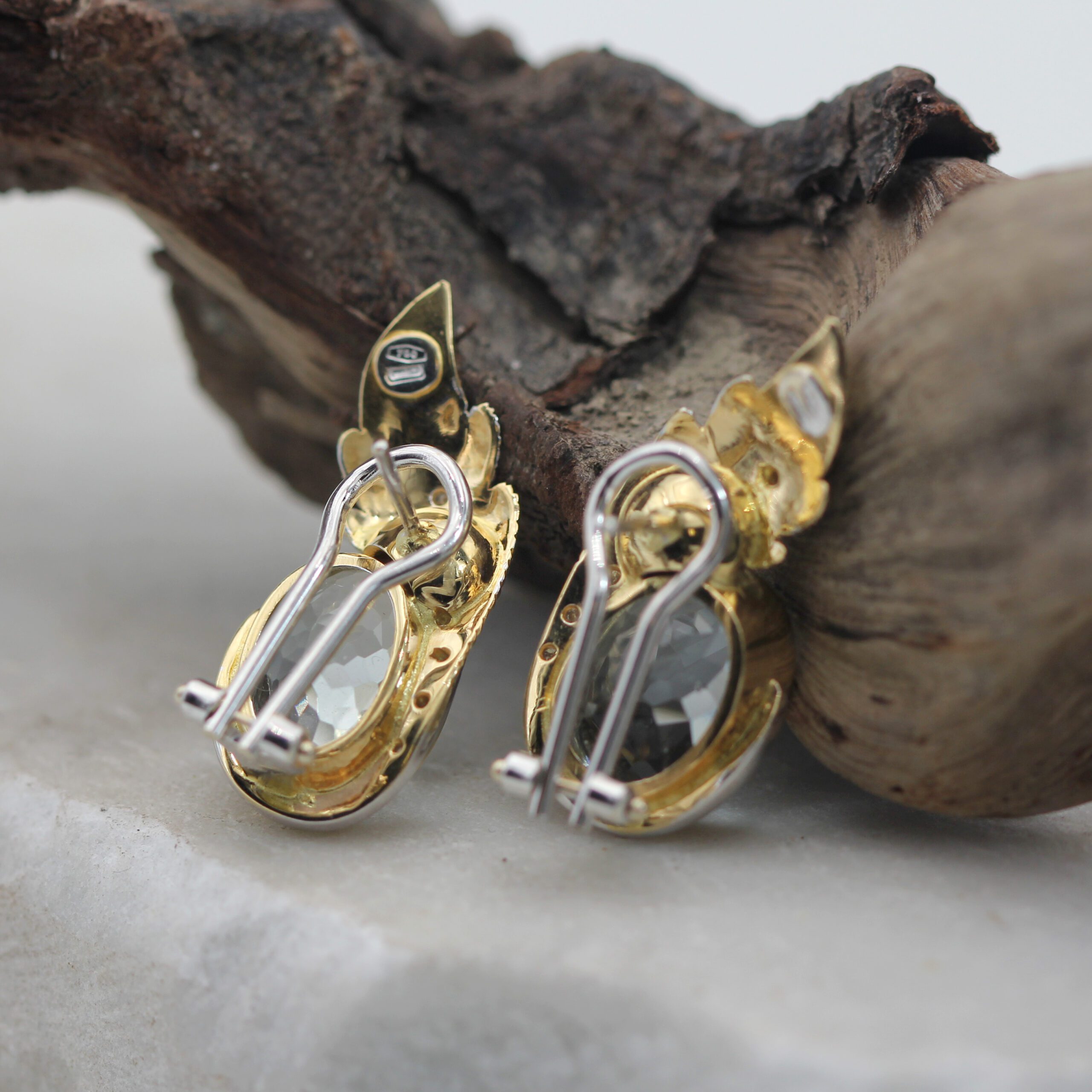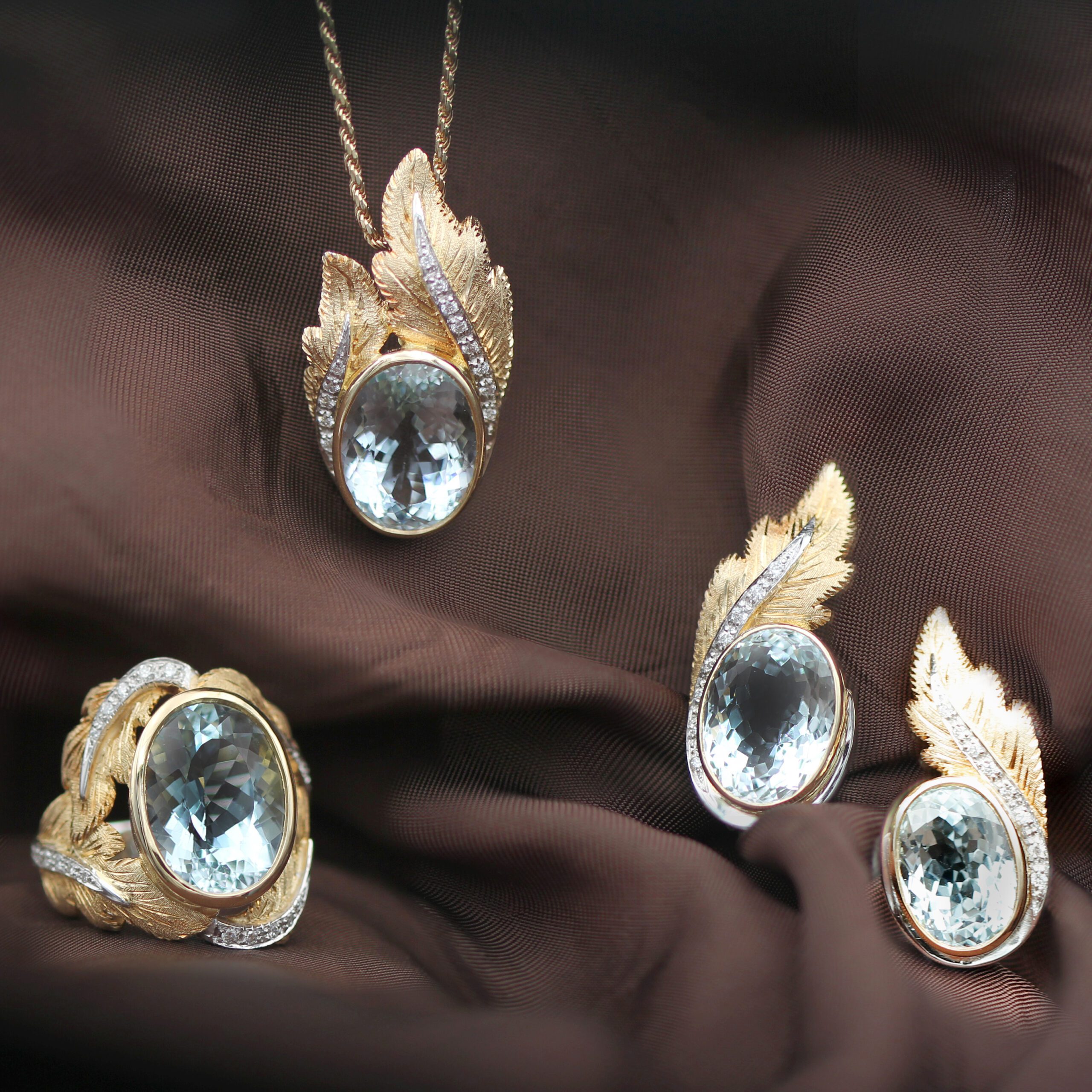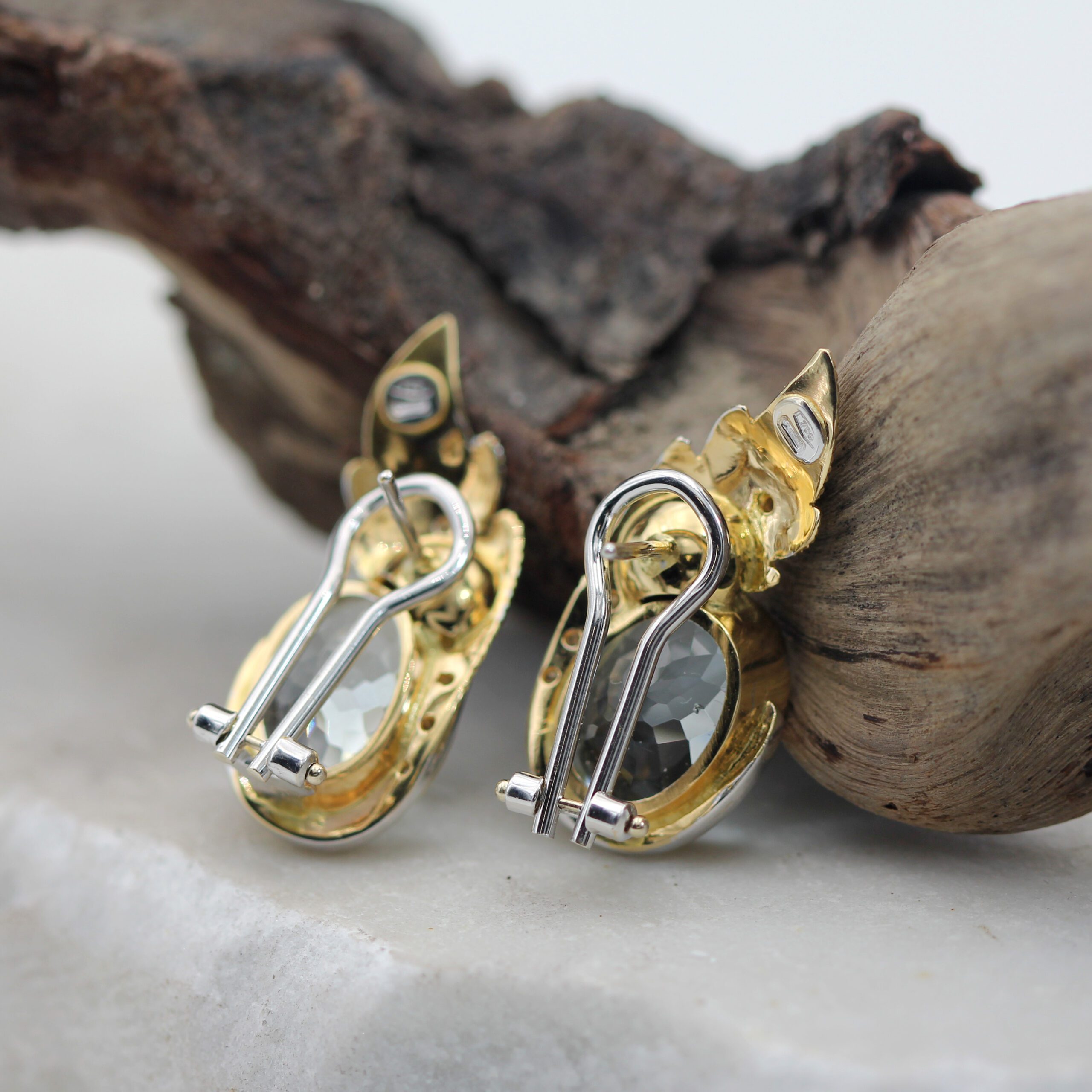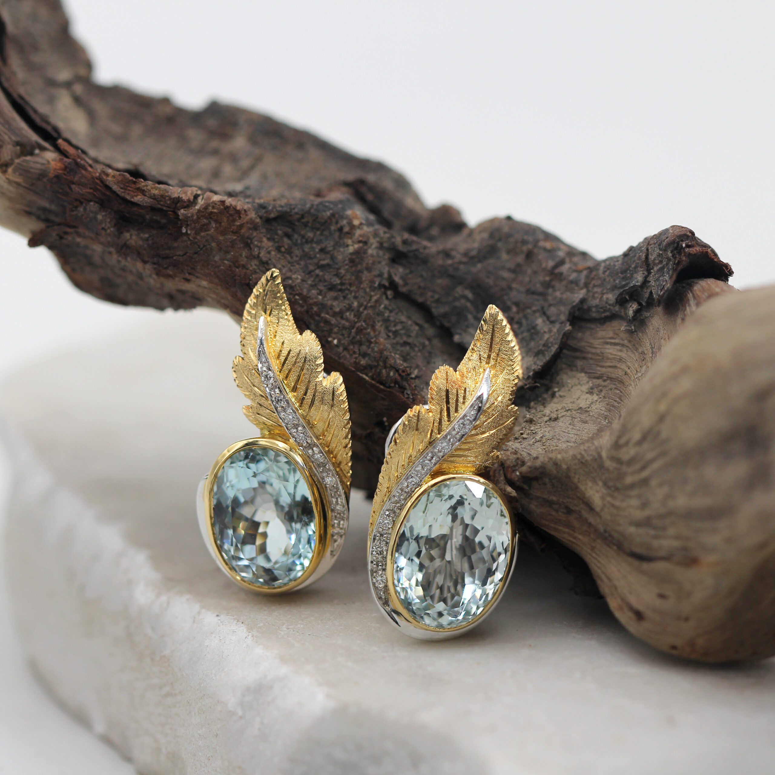 These handcrafted clip-on gold earrings with aquamarine and natural diamonds perfectly combine elegance and luxury. The leaves, crafted in 18K white gold (750‰), are intricately designed using the piercing and hand-engraving technique, adding a unique artistic touch.