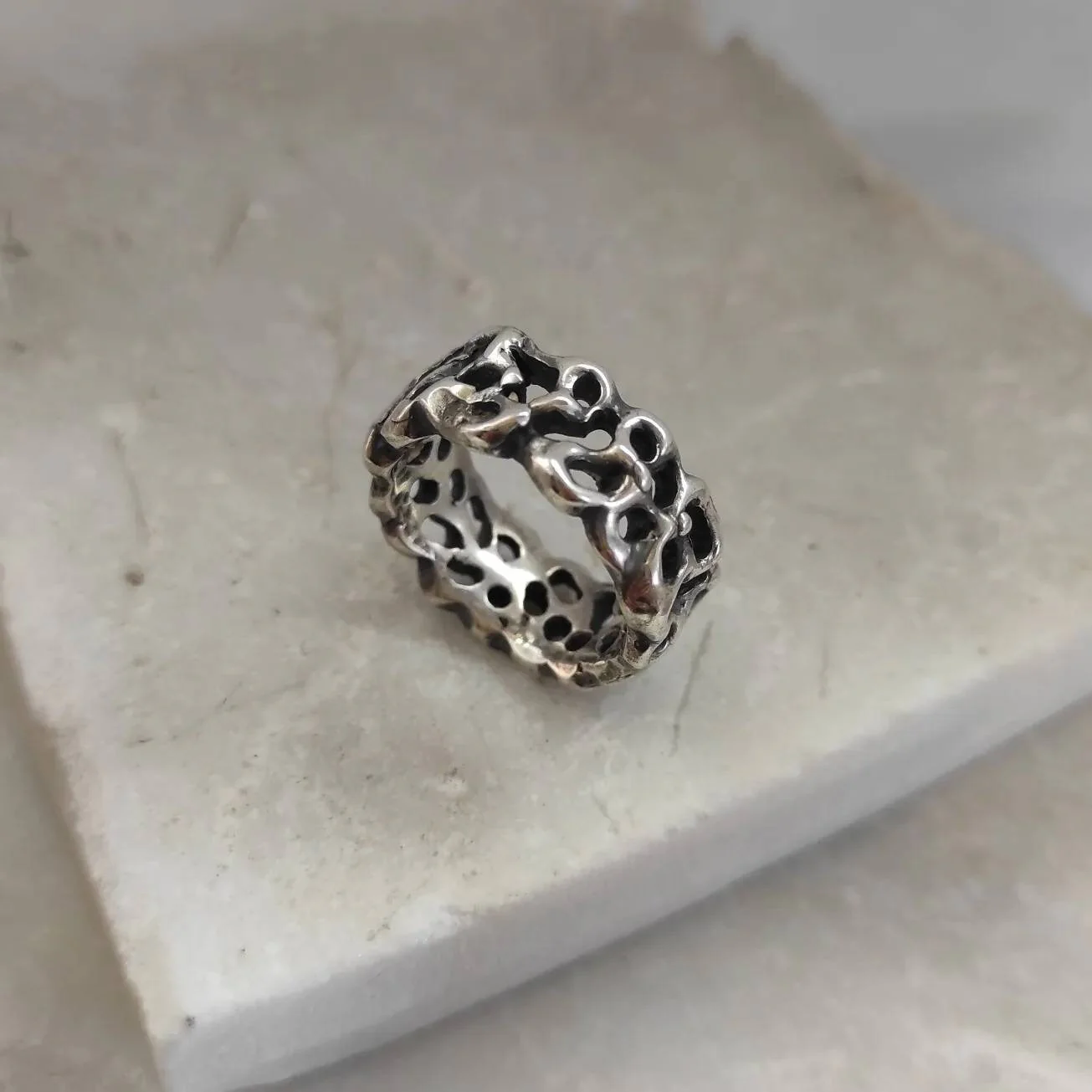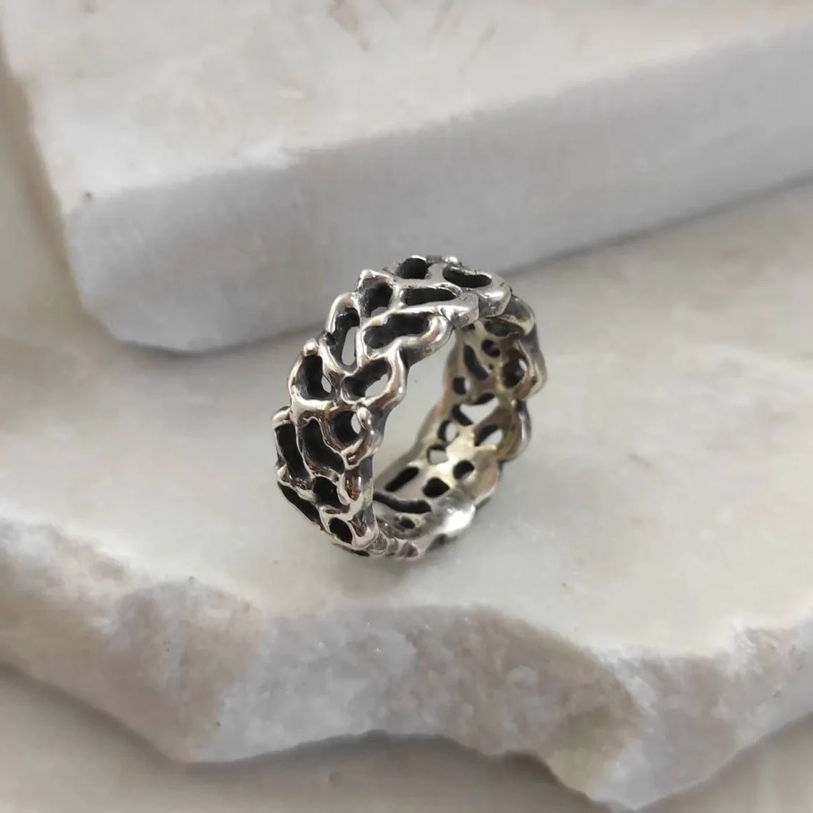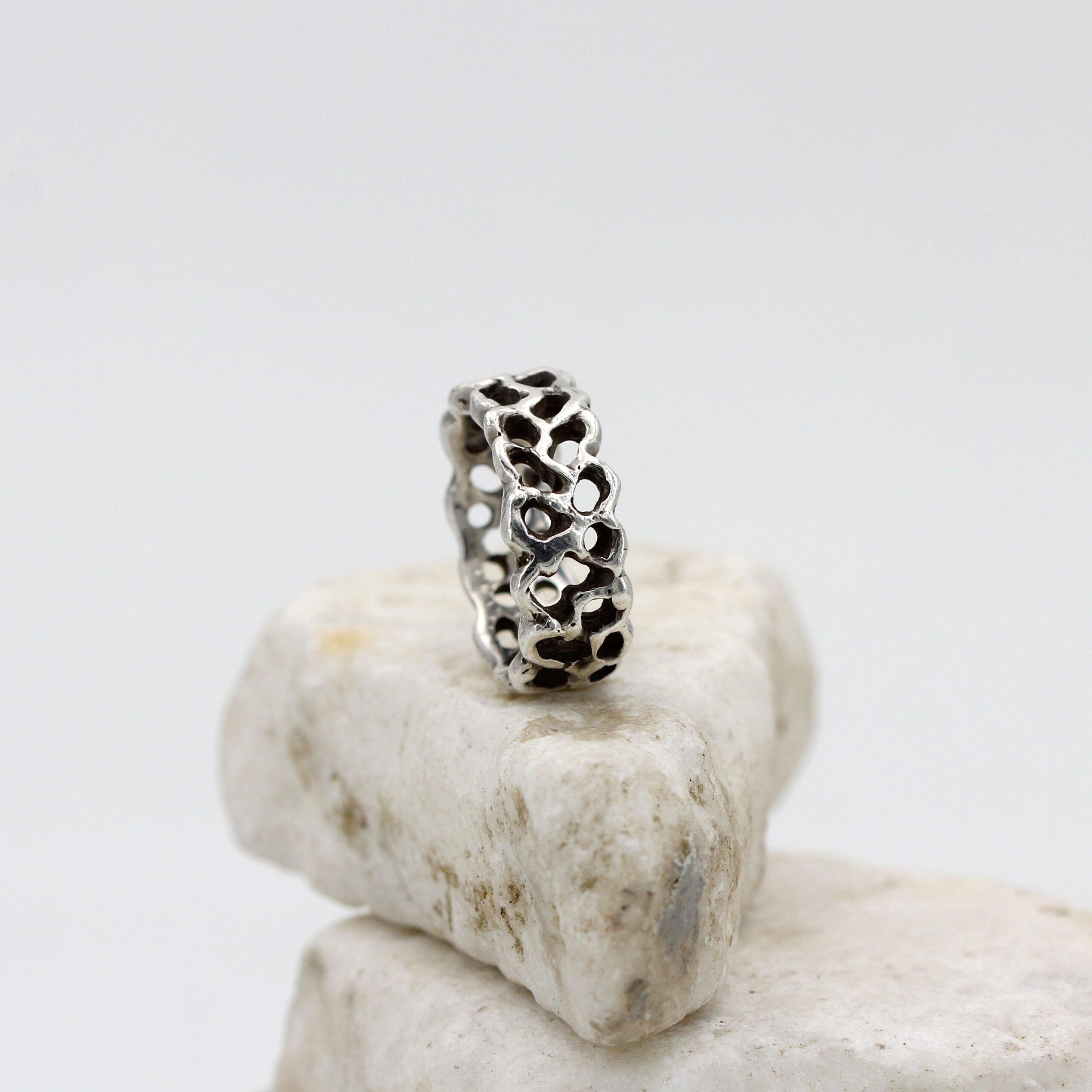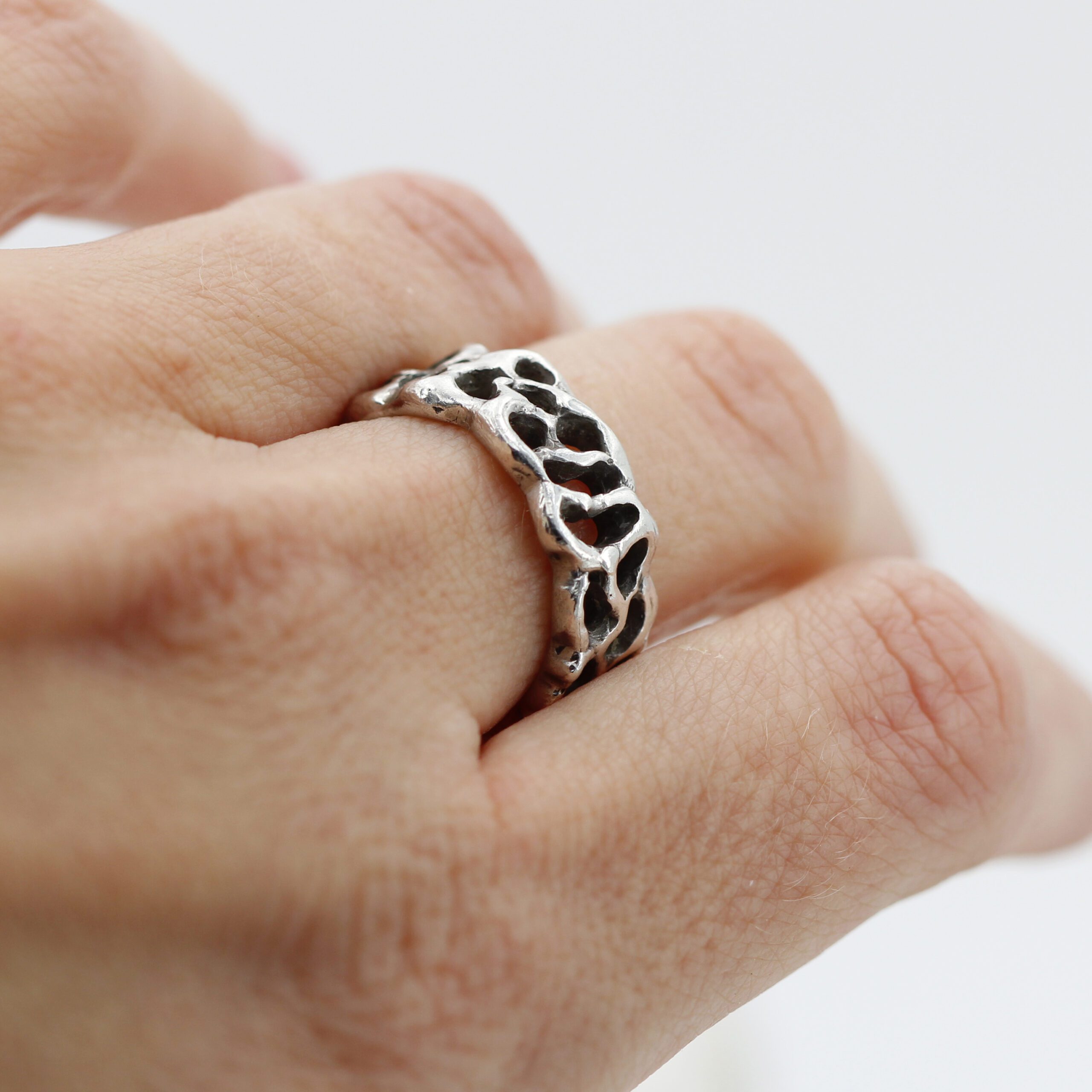 A ring design inspired by the jagged and mysterious surface of Mars, meticulously recreating the craters and depths of the Red Planet’s terrain.