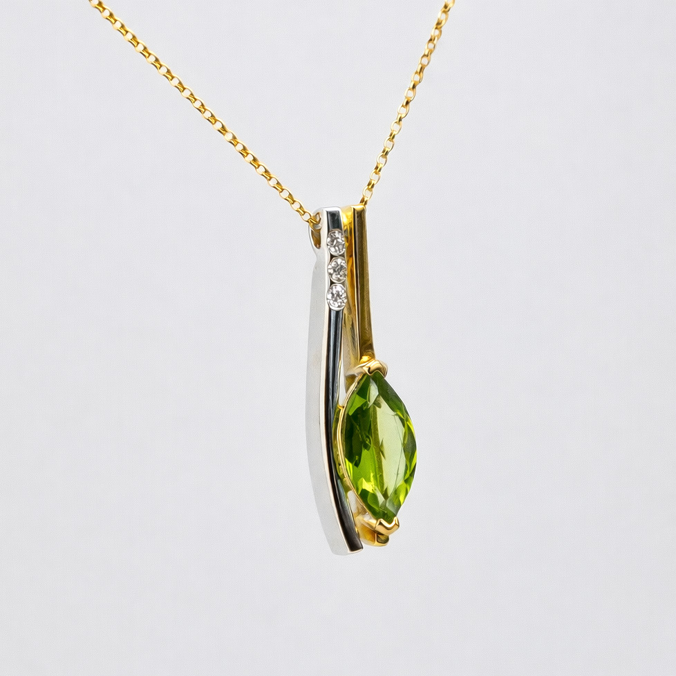 This elegant pendant features a radiant marquise-cut Peridot, with a brilliant green hue, set with delicate yellow gold prongs. Its elongated shape adds elegance and lightness, enhancing the décolleté with a touch of freshness and personality.