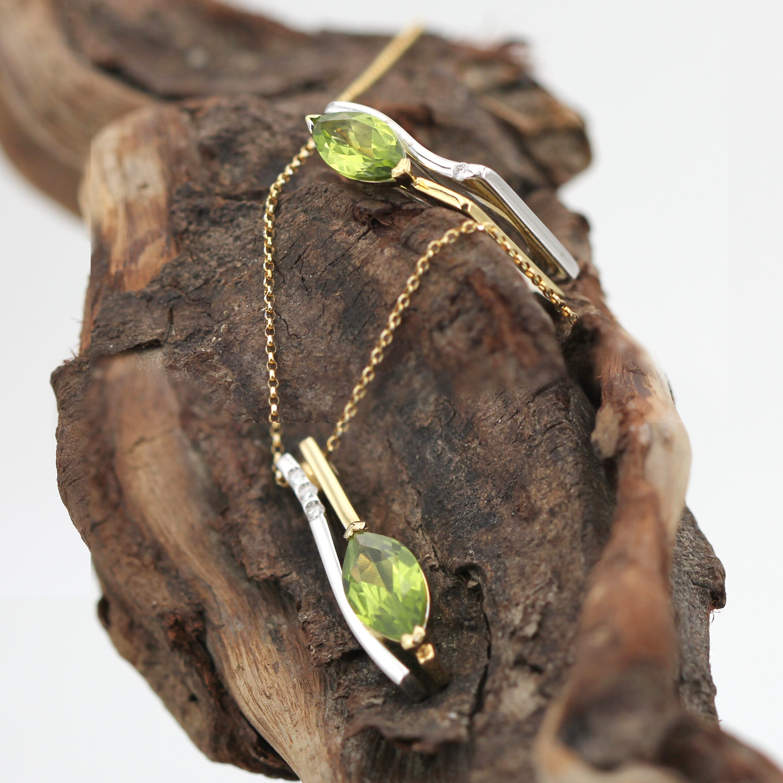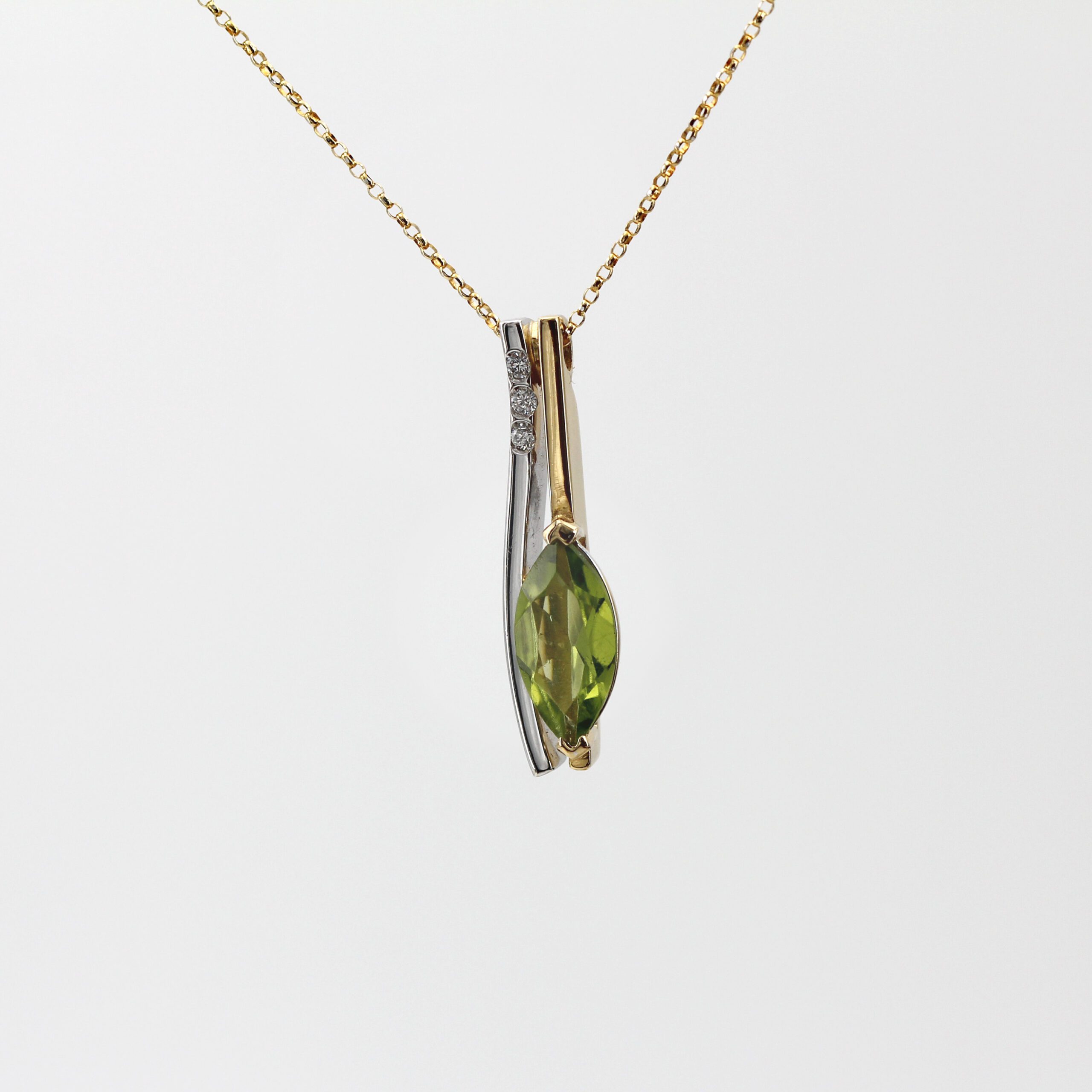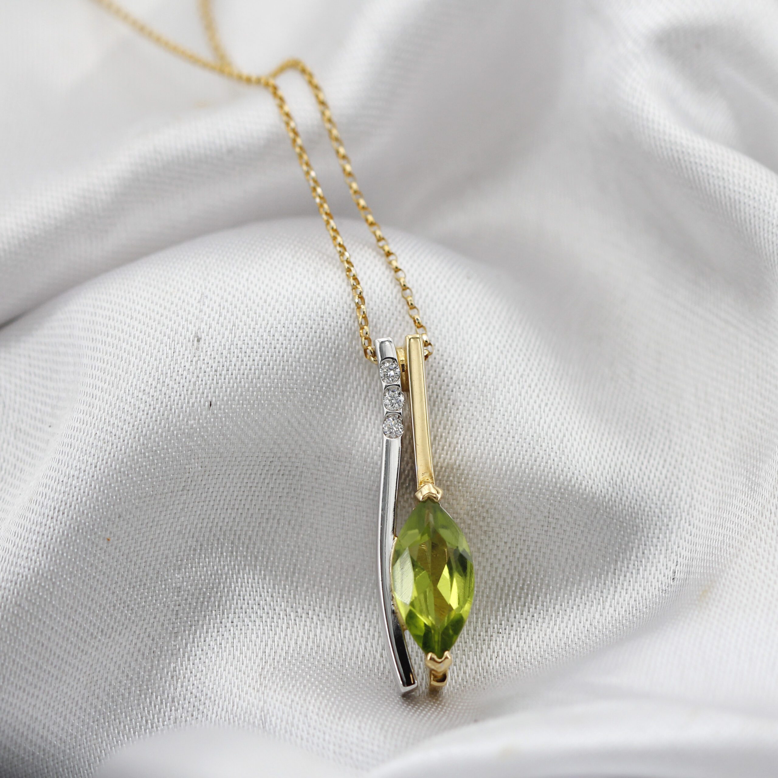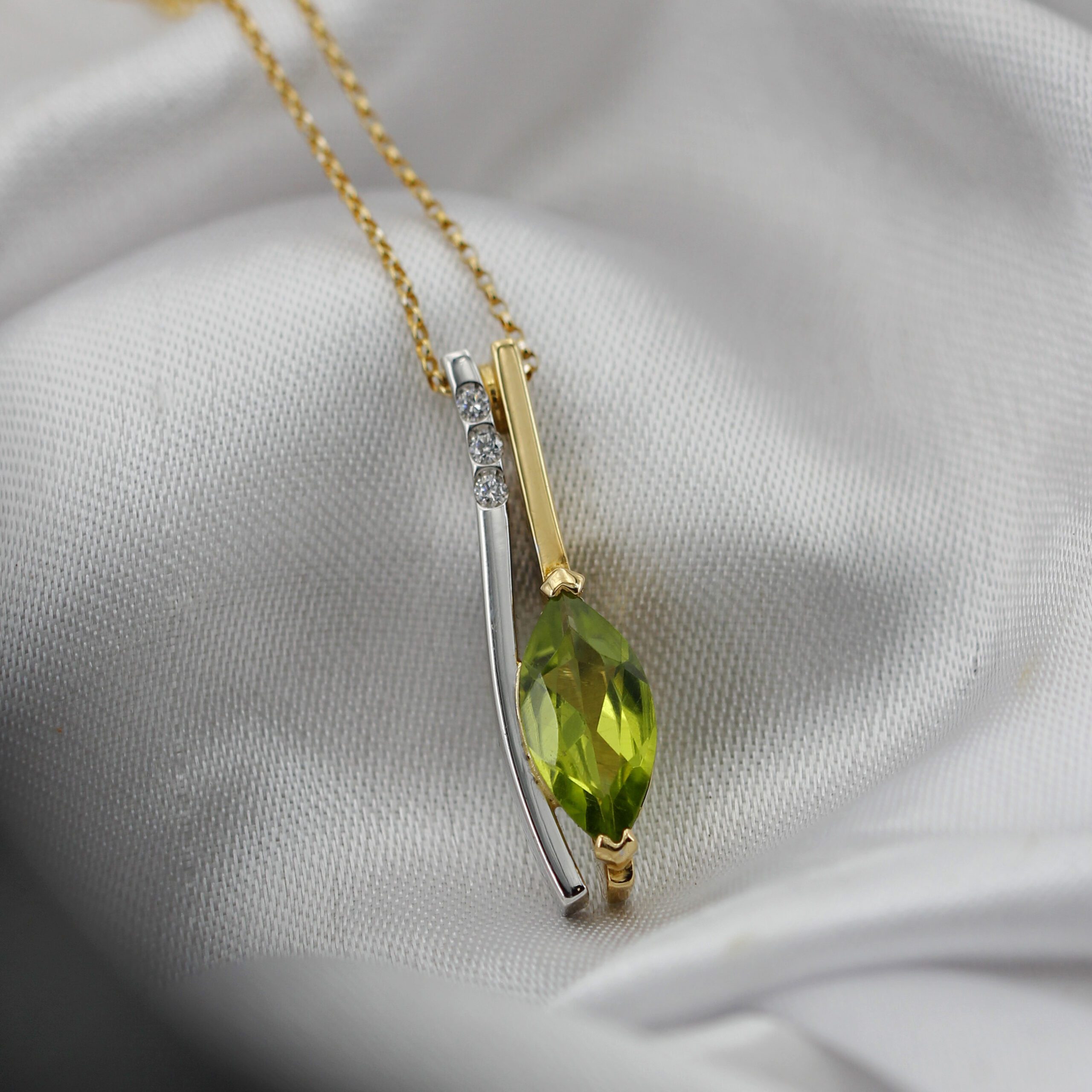 Beside the peridot, three natural diamonds set on a white gold line create a refined contrast of light. The two-tone design – yellow and white gold – adds modernity and versatility, making this piece perfect for both everyday wear and special occasions.