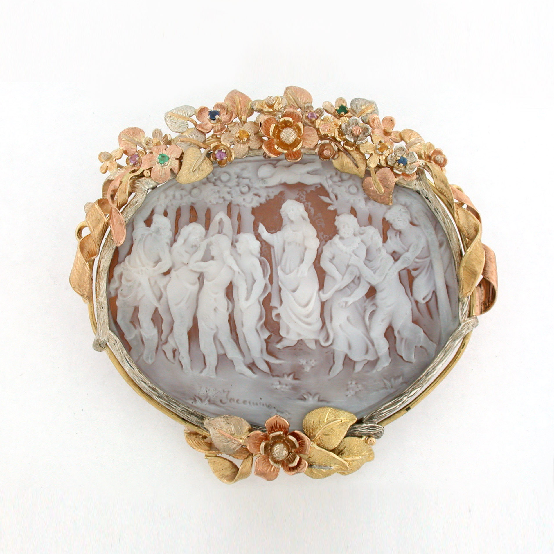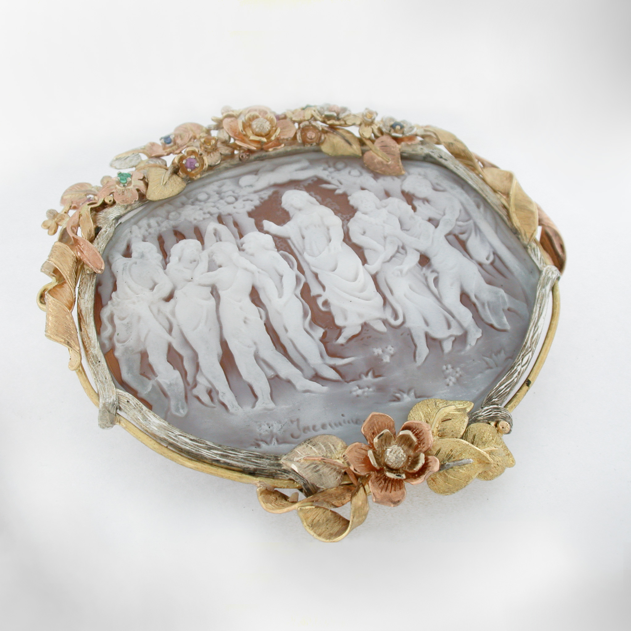 Carved with precision and care, the cameo draws inspiration from the ethereal beauty of Botticelli’s famous Primavera, capturing the same sense of grace and harmony. Set in a precious gold and silver frame and accented with radiant natural gemstones, this jewel shines with light and color.