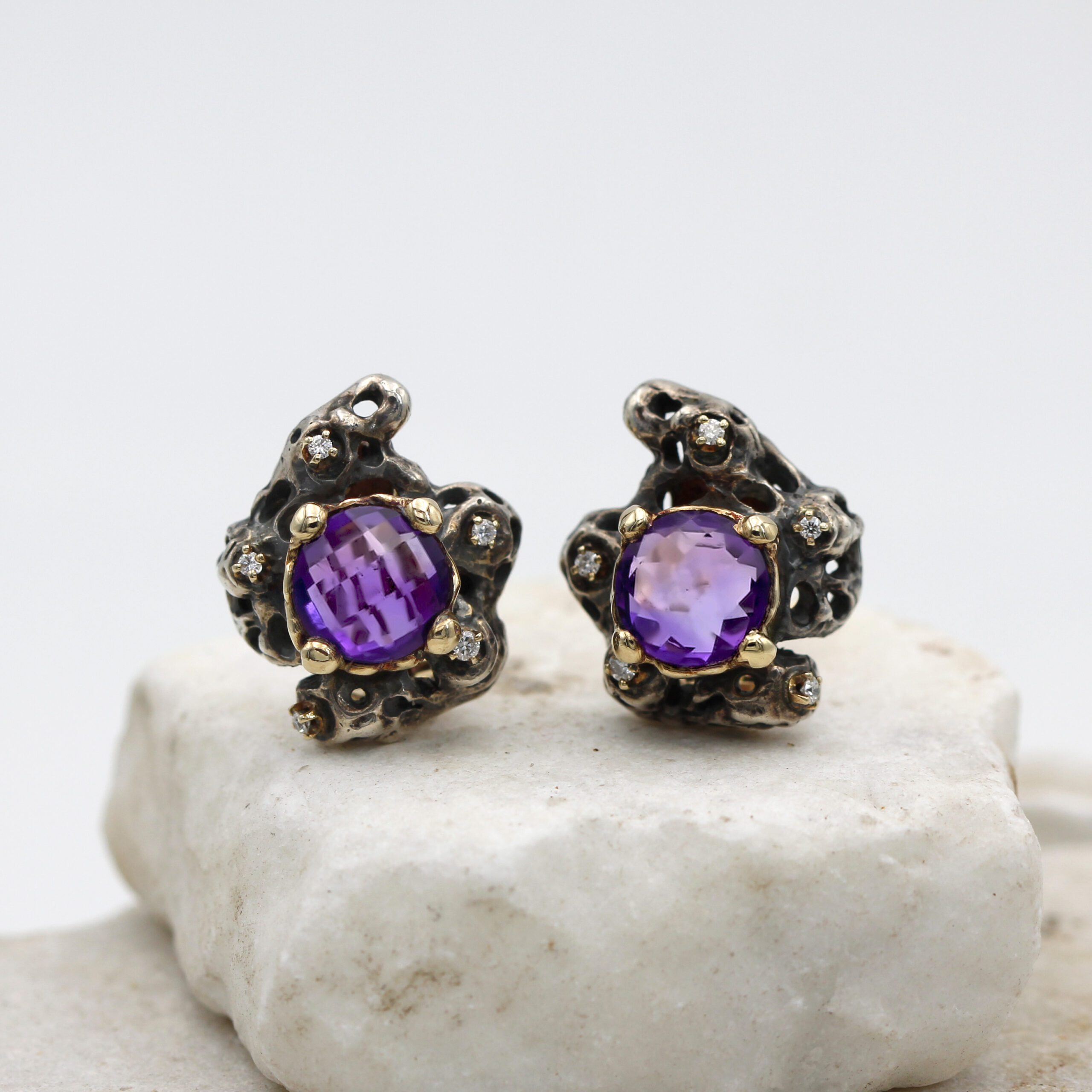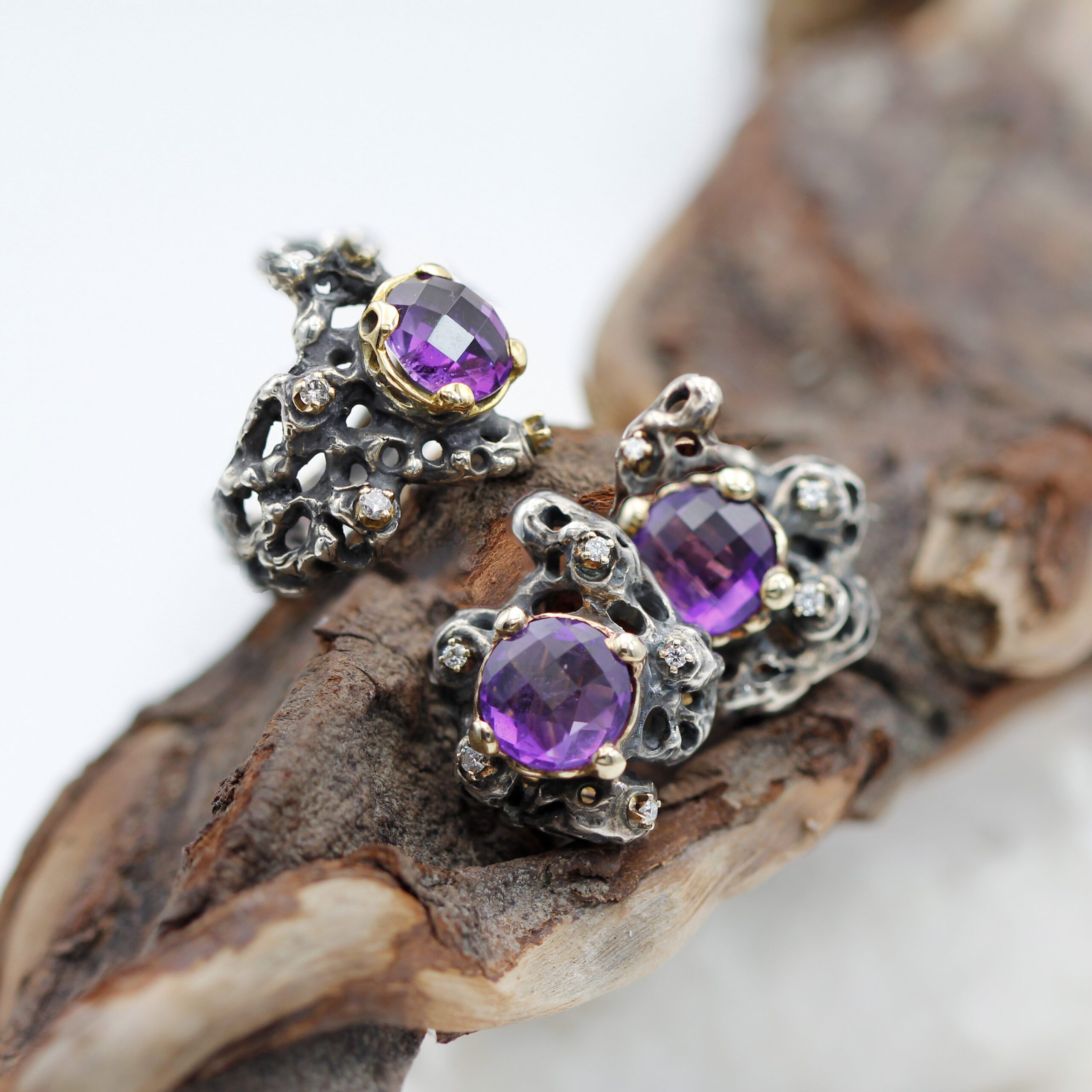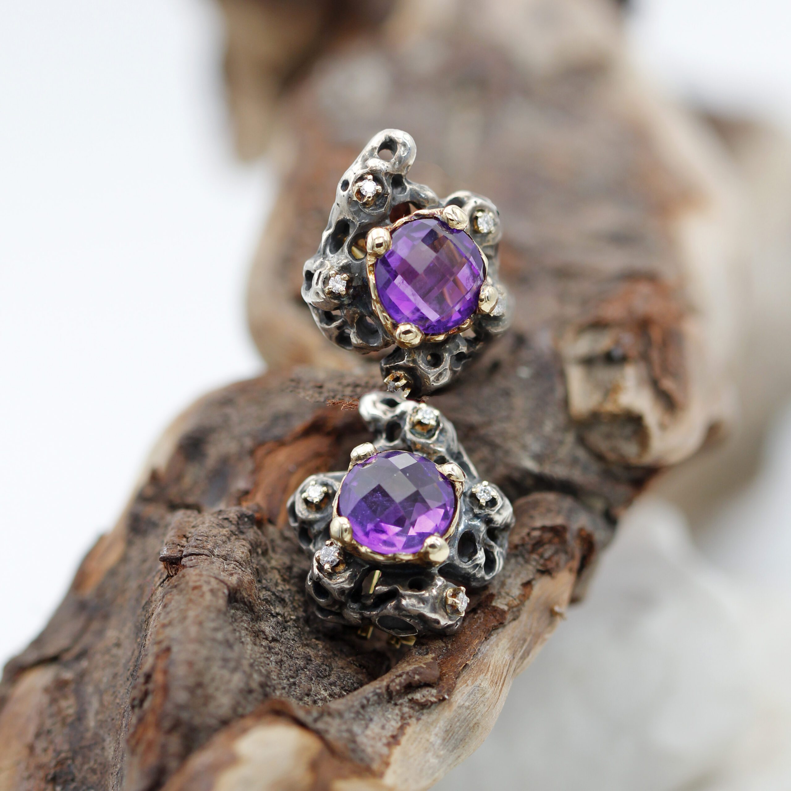 Faceted Amethyst and Diamond Silver and Gold Earrings