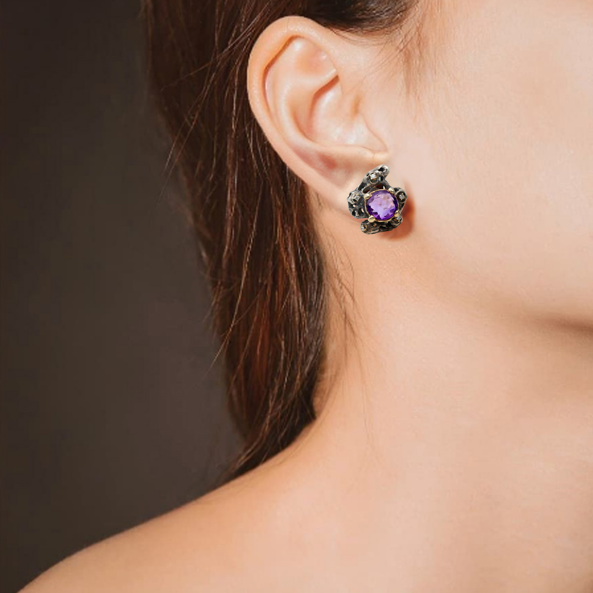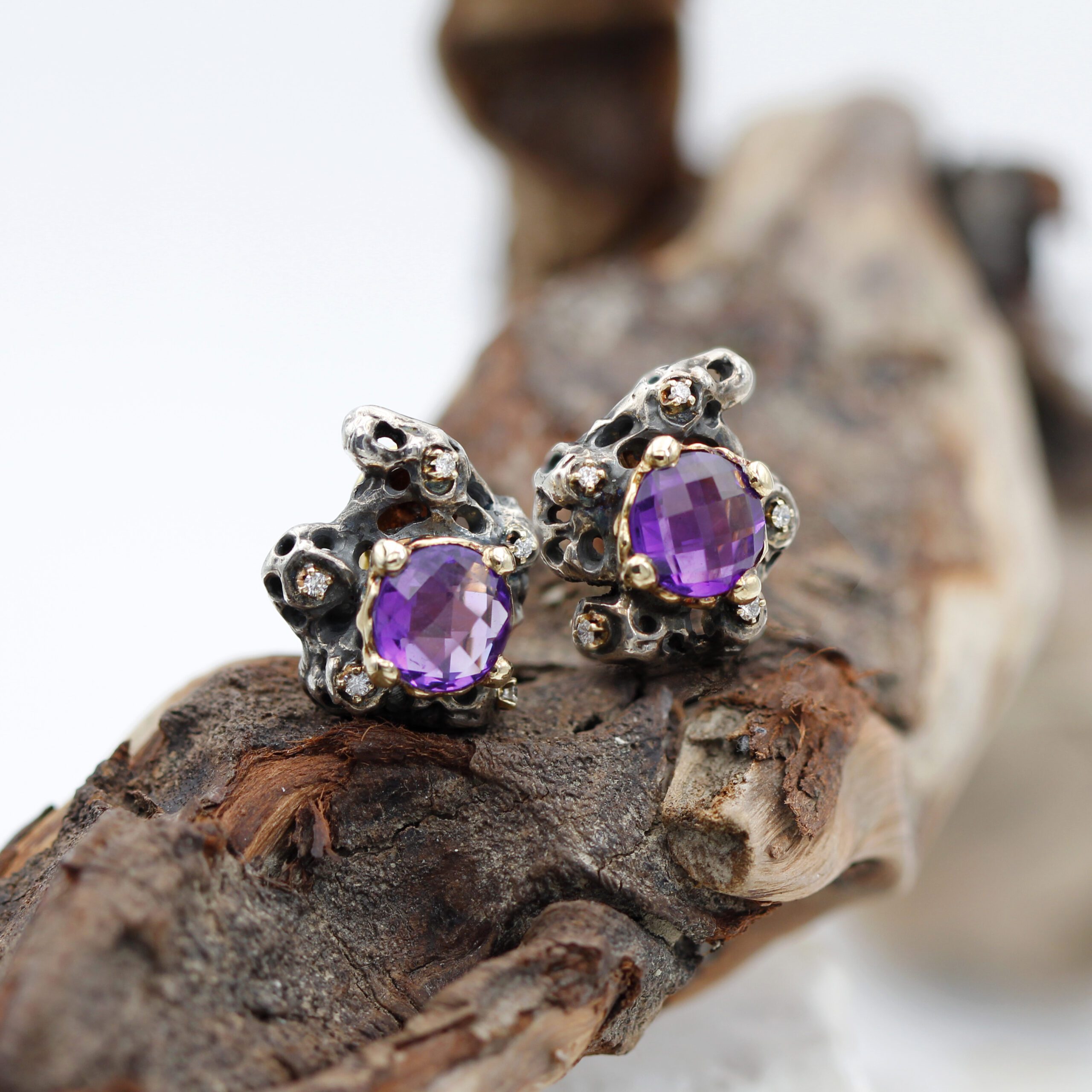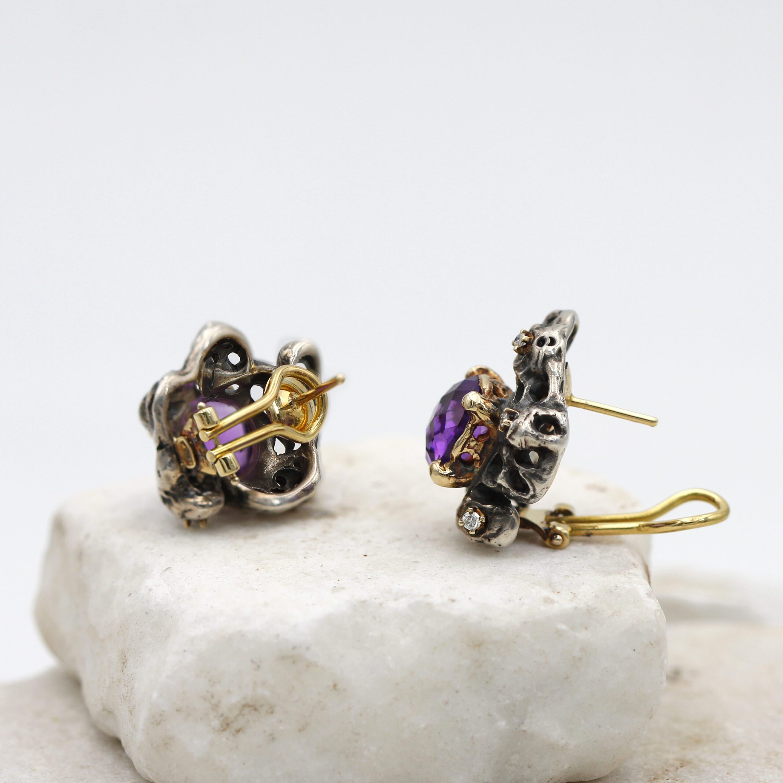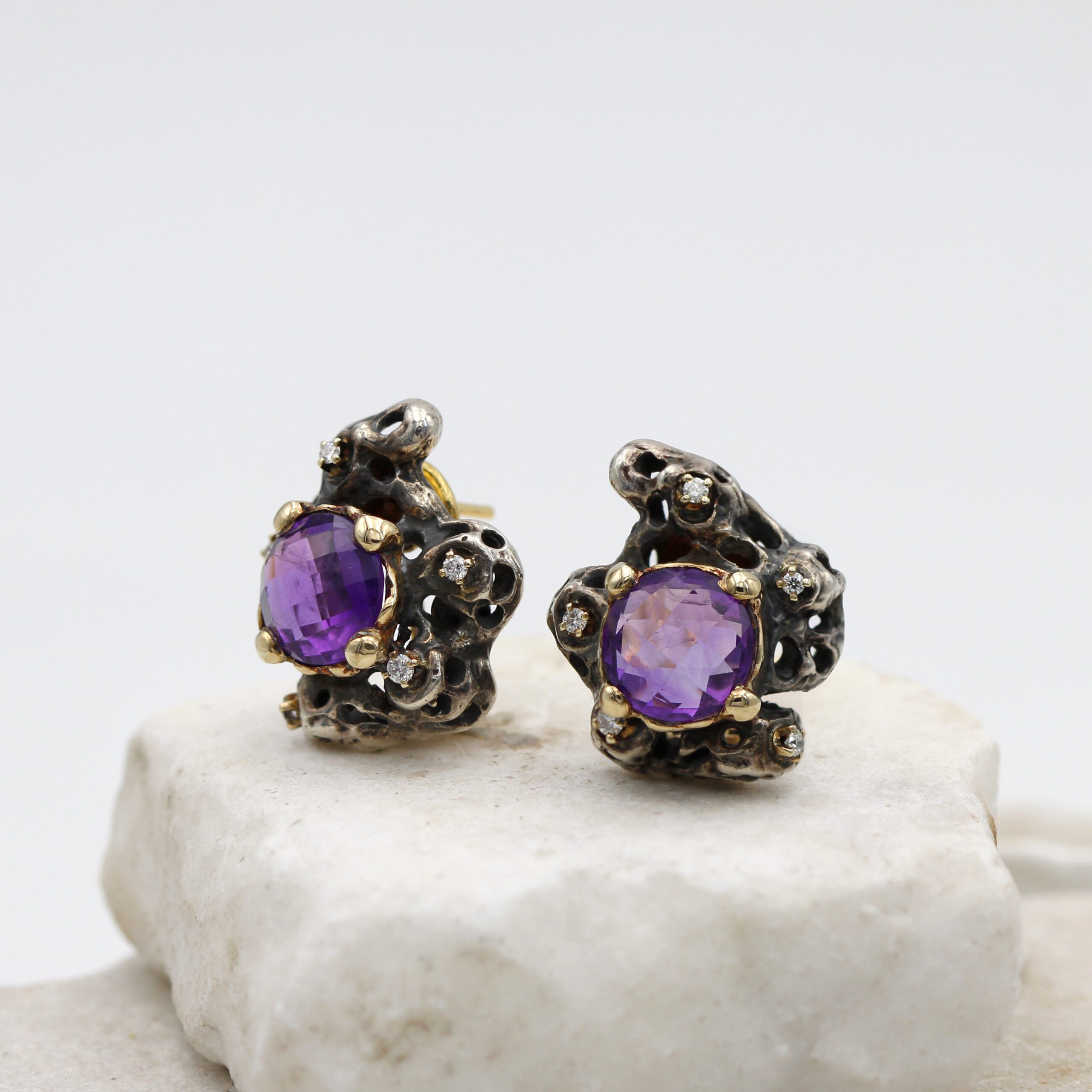 Faceted Amethyst and Diamond Silver and Gold Earrings