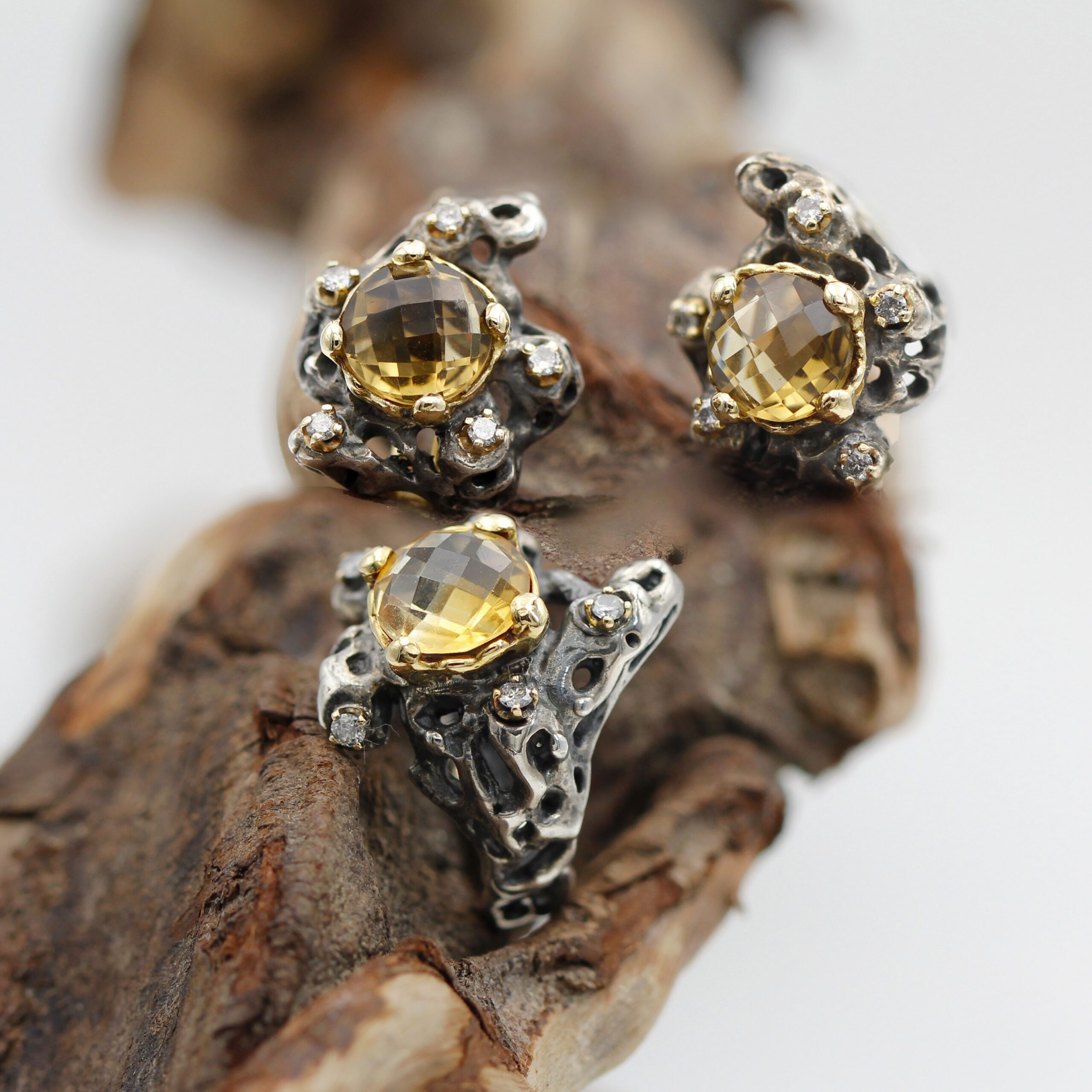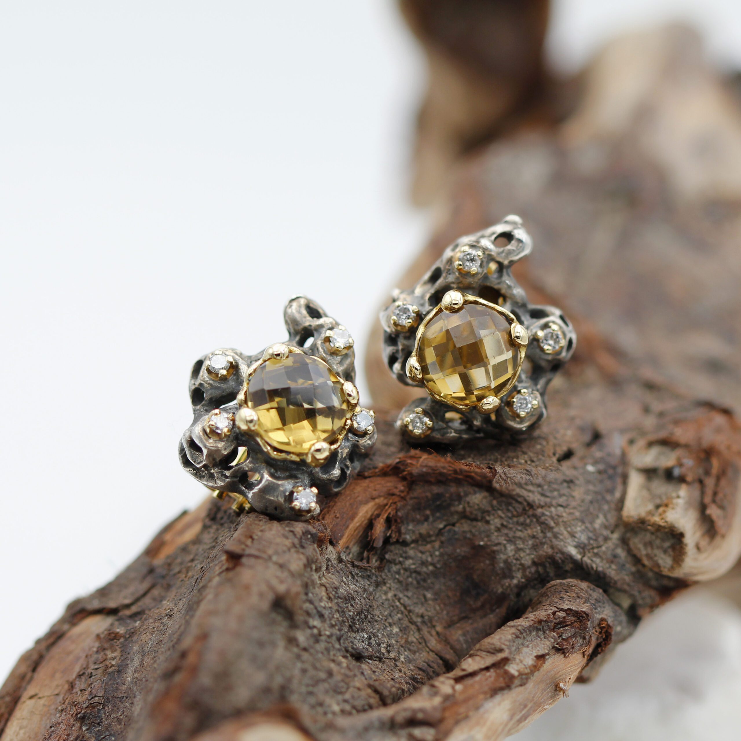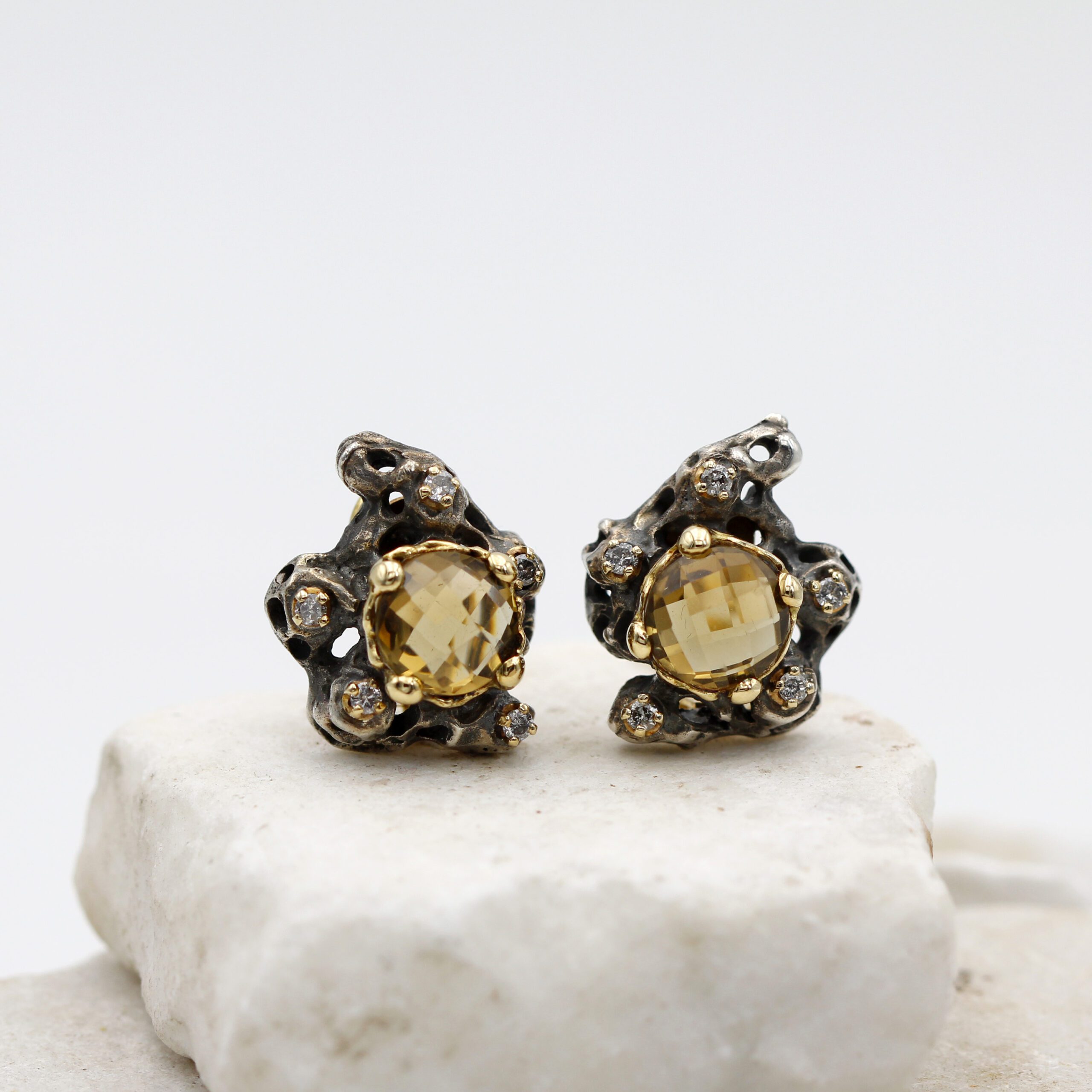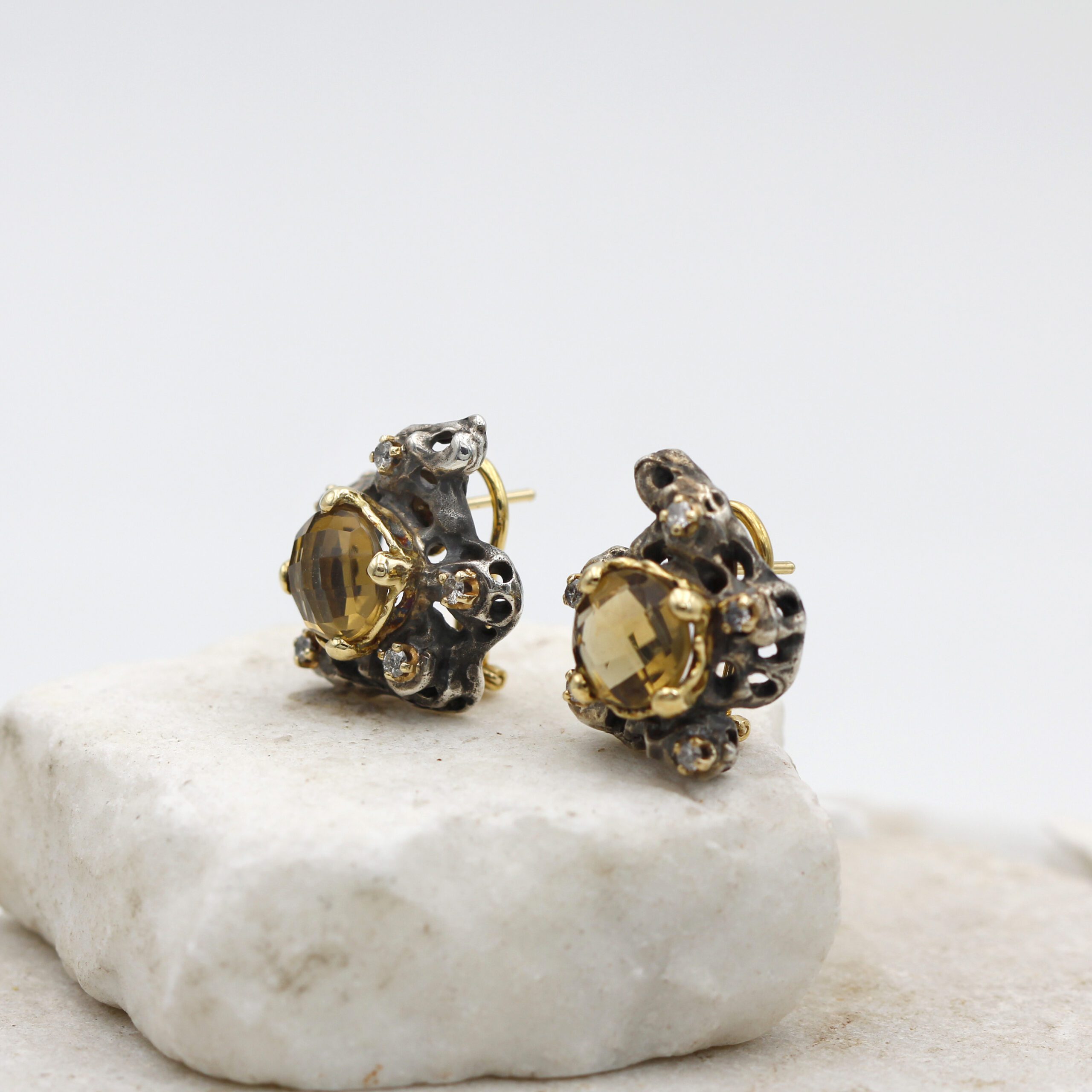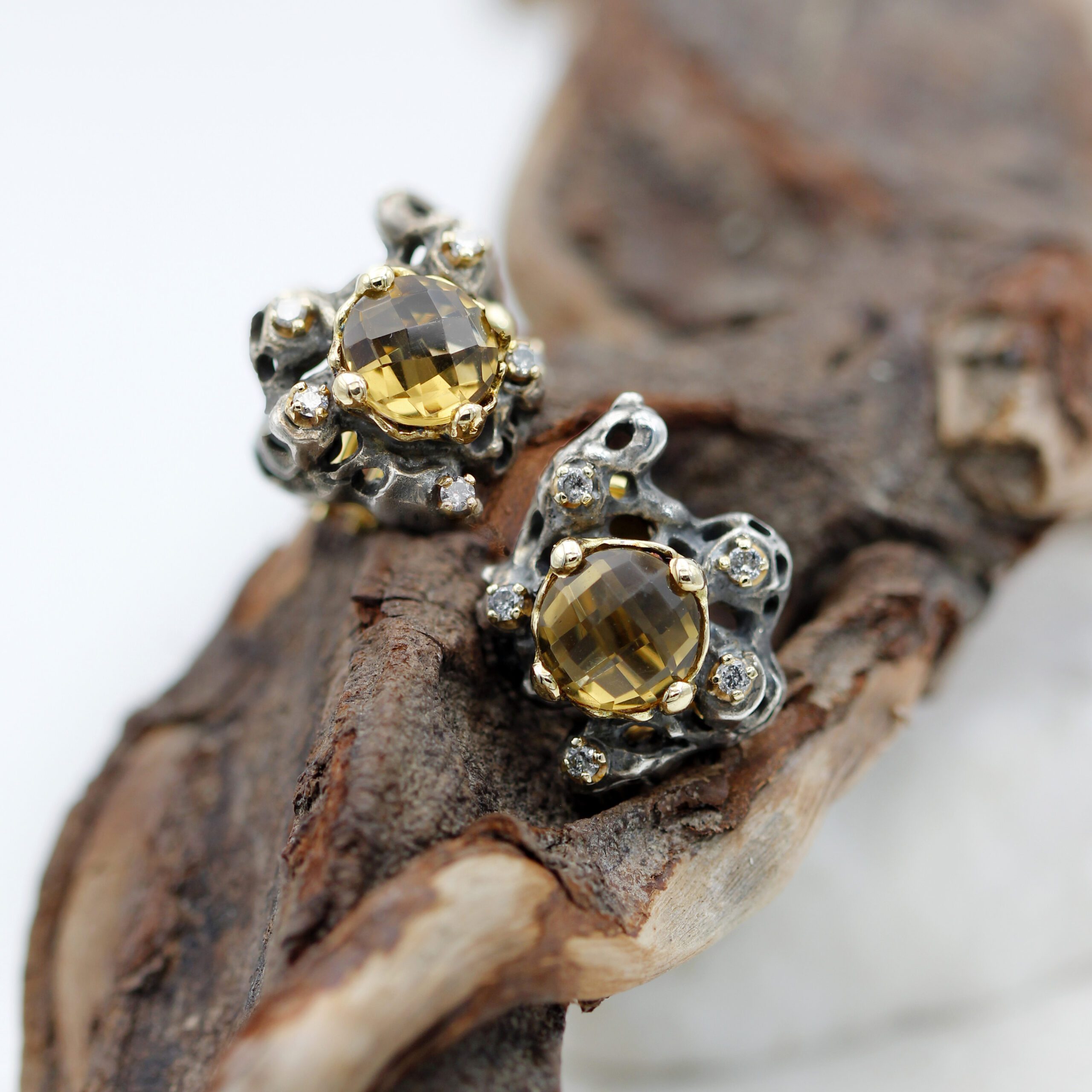 Faceted Citrine Quartz and Grey Diamond Silver and Gold Earrings