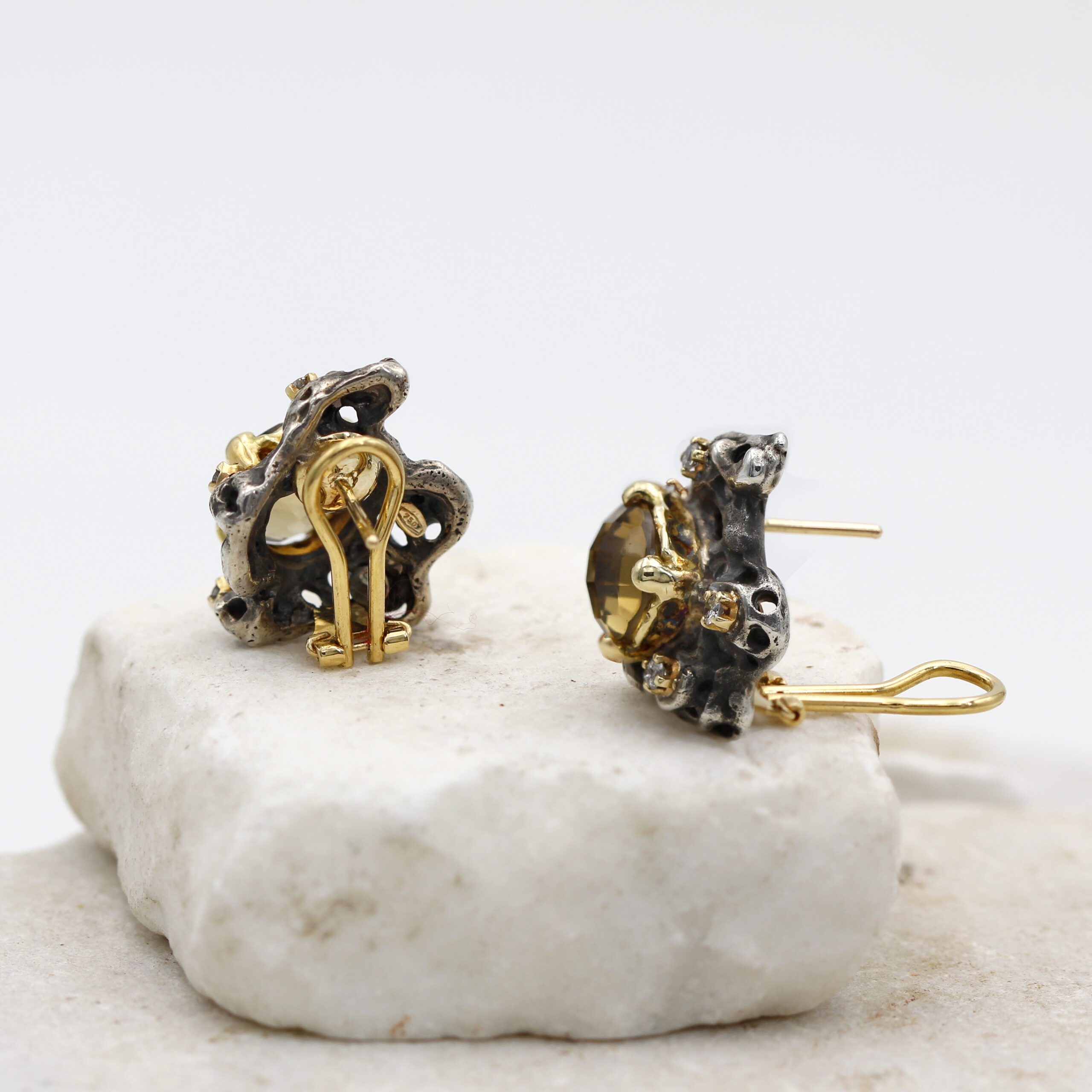 Crafted in 18K yellow gold and 925‰ sterling silver, these earrings feature elegant faceted Citrine Quartz stones set at the center, surrounded by a border of grey brilliant-cut Diamonds in a pavé setting. The combination of gold and silver creates a sophisticated and original color effect, while the Citrine adds a vibrant touch of color and brightness.