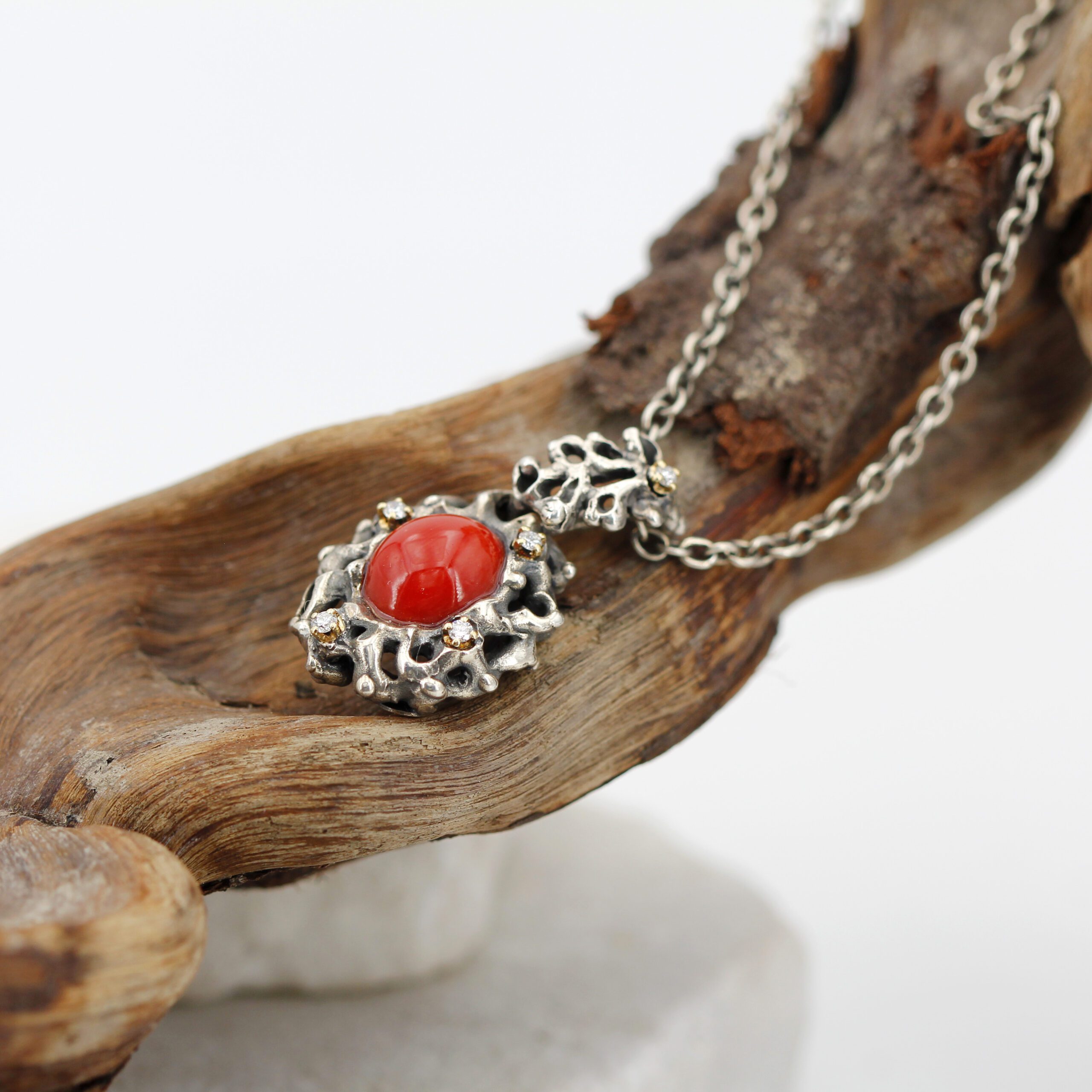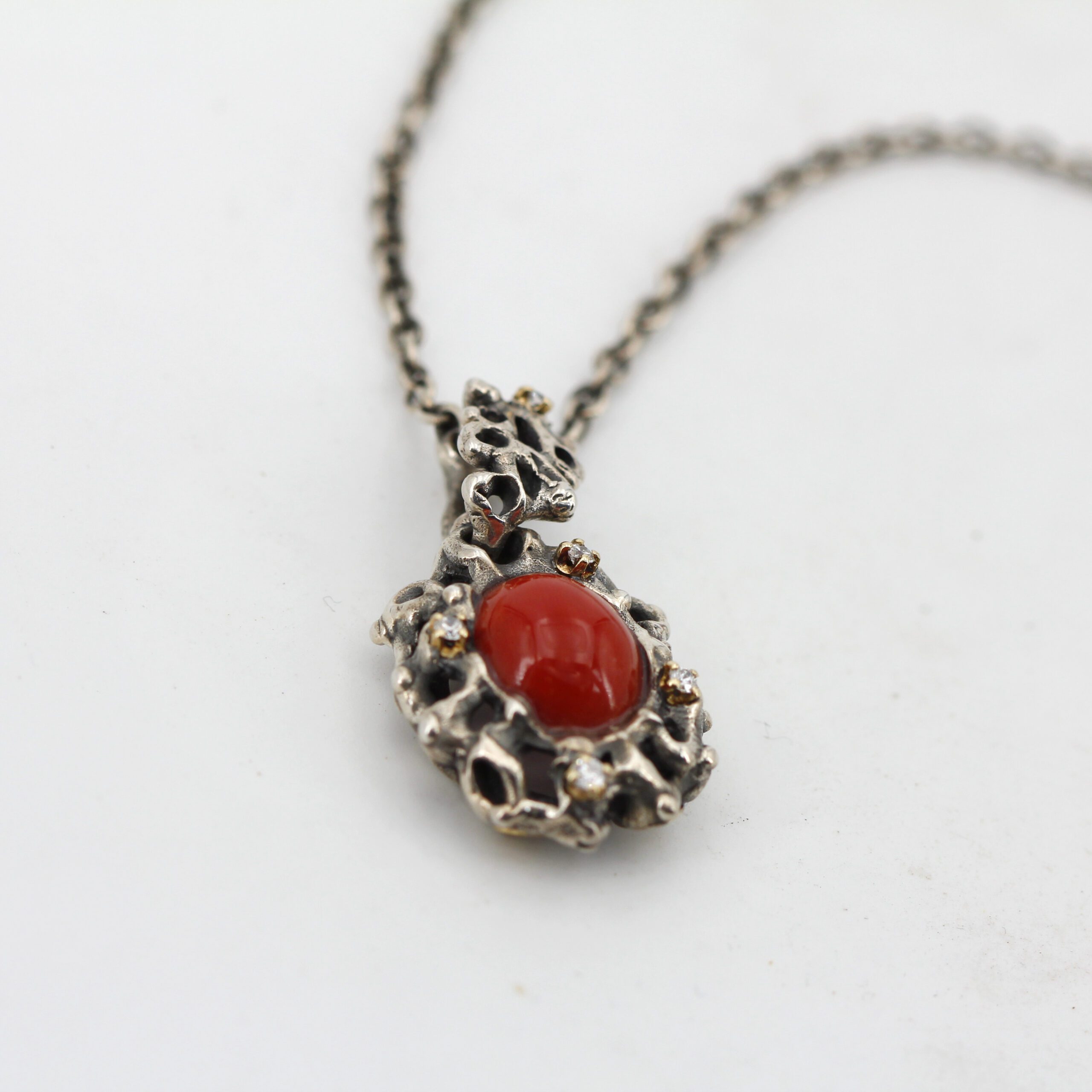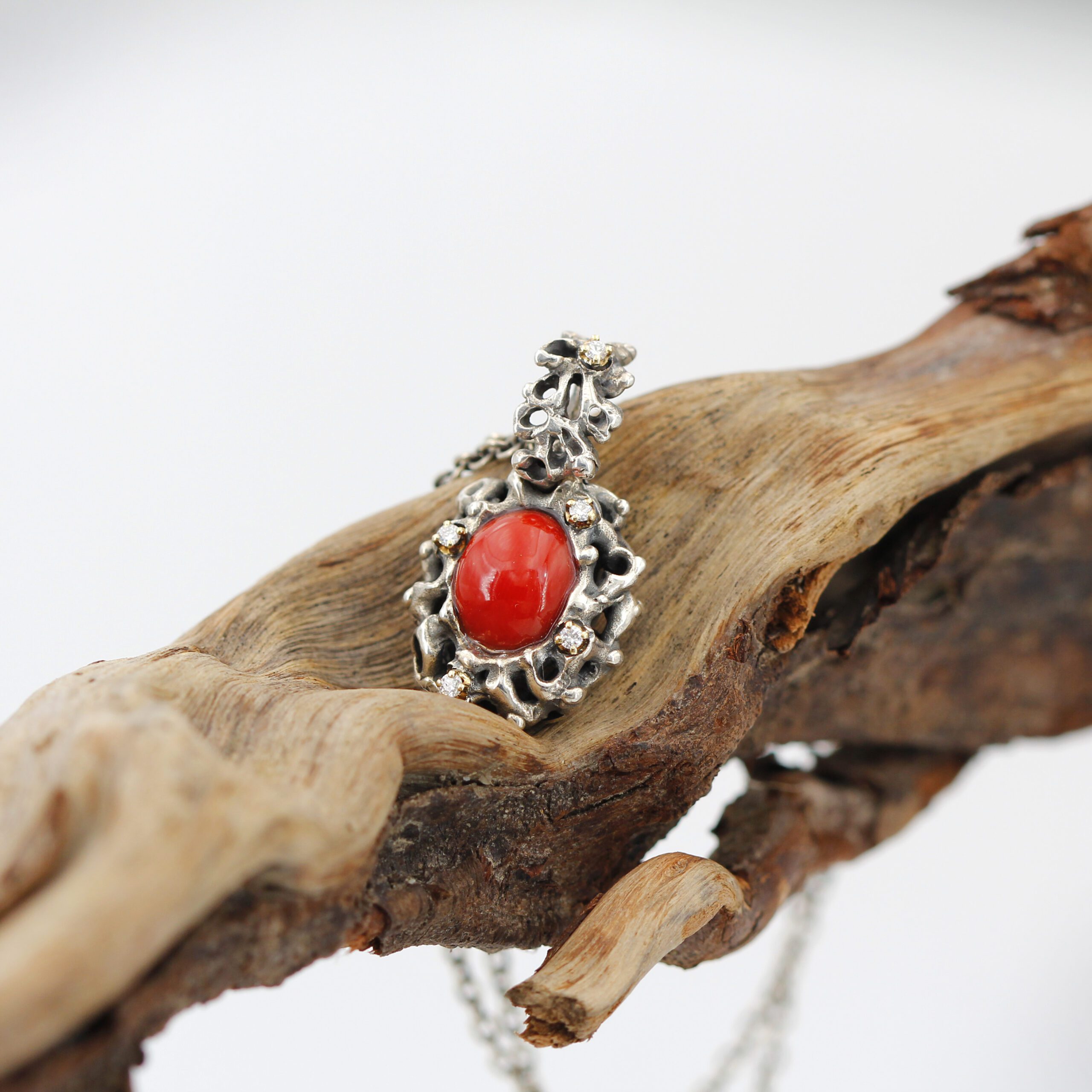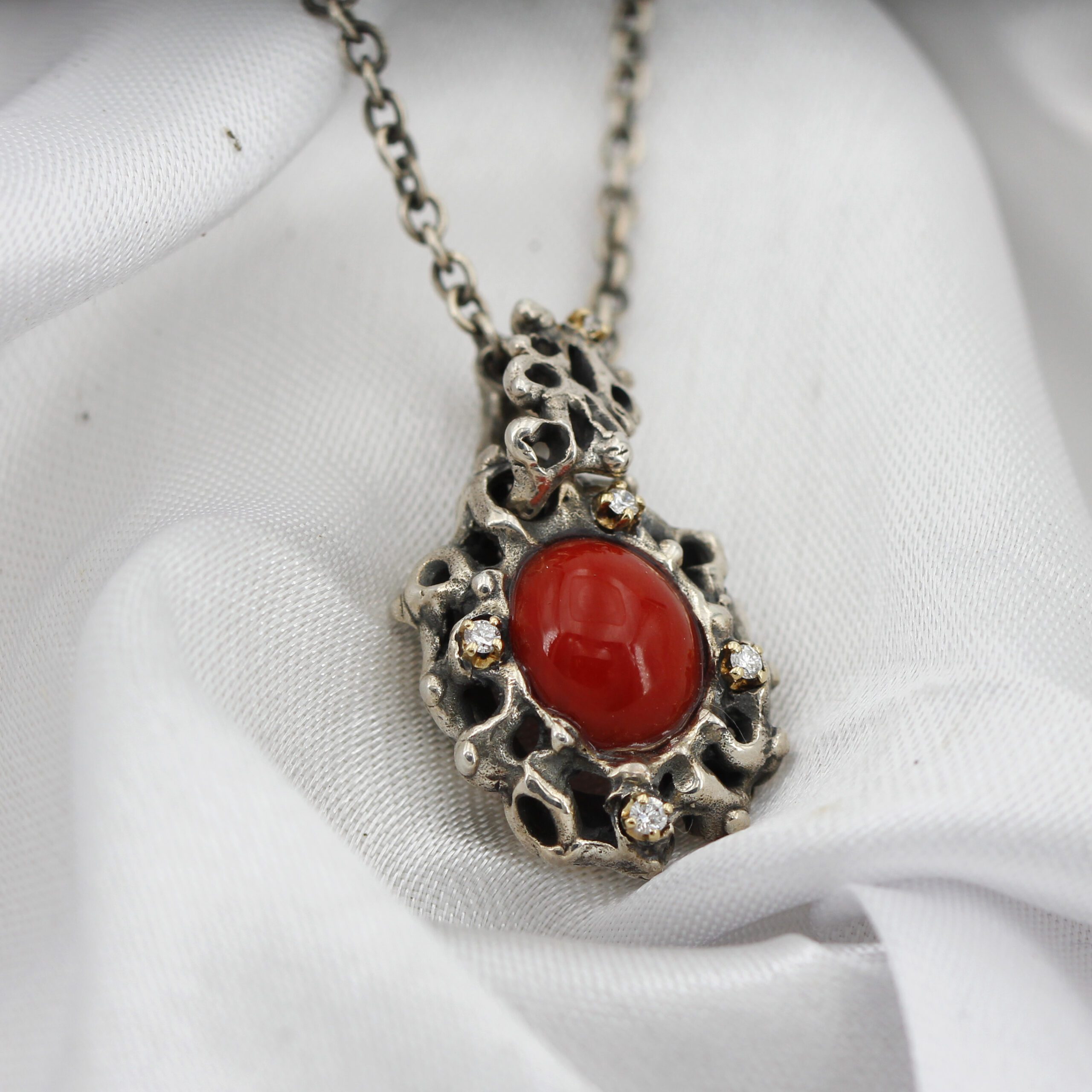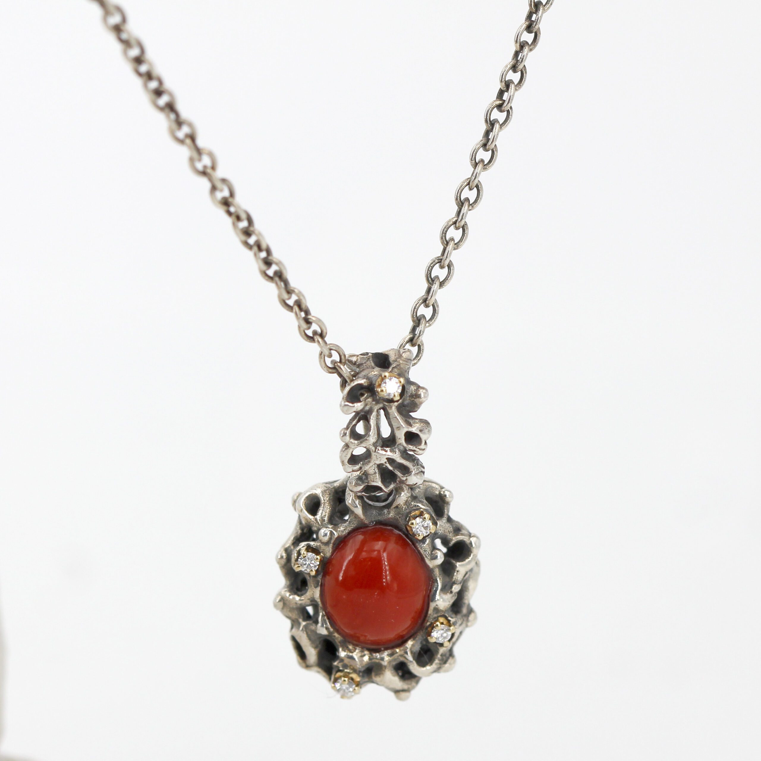 Silver Pendant with Coral and 5 Diamonds Set in 18kt Gold Prongs.