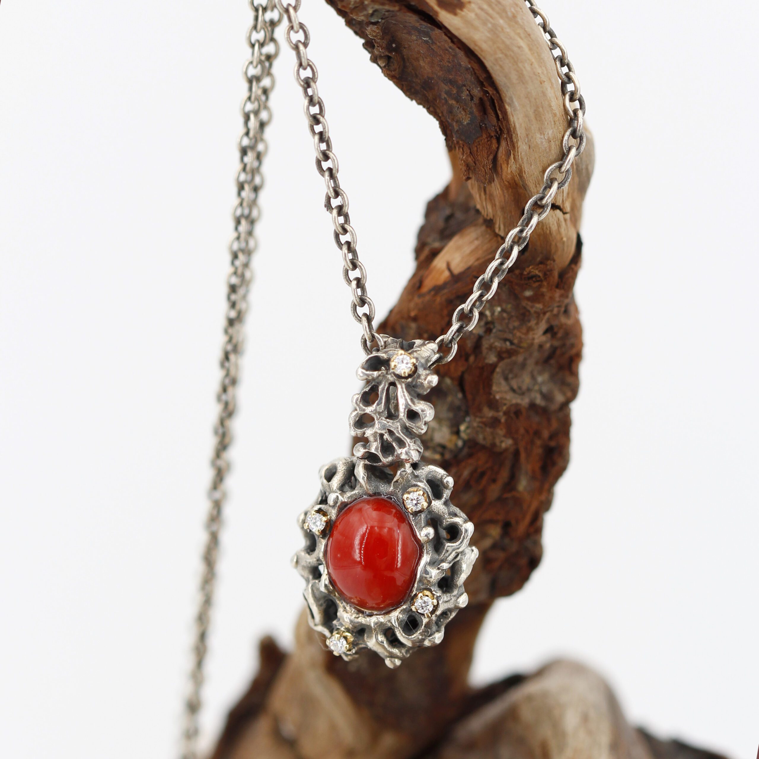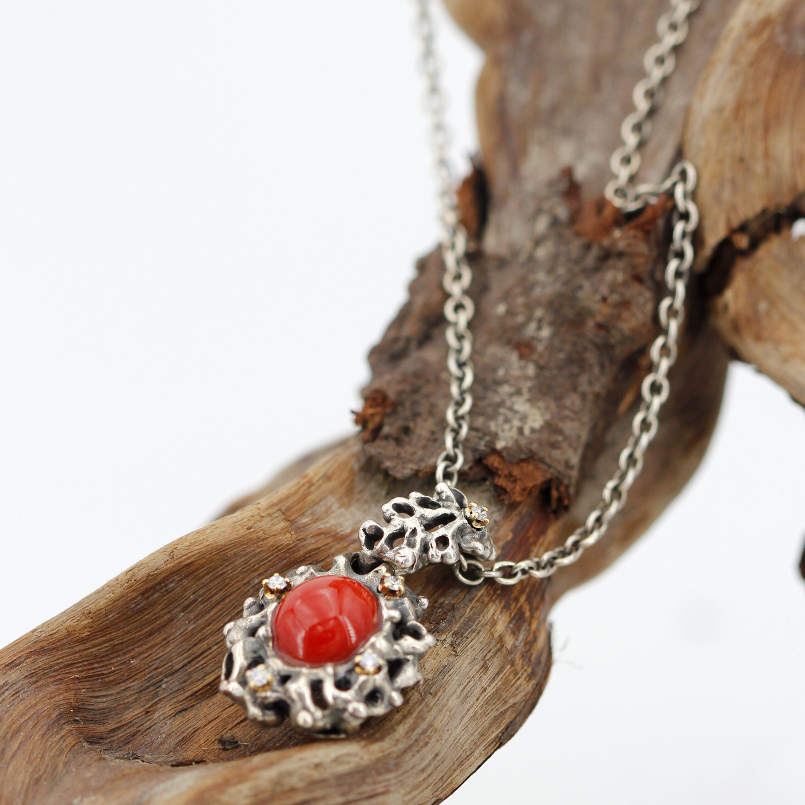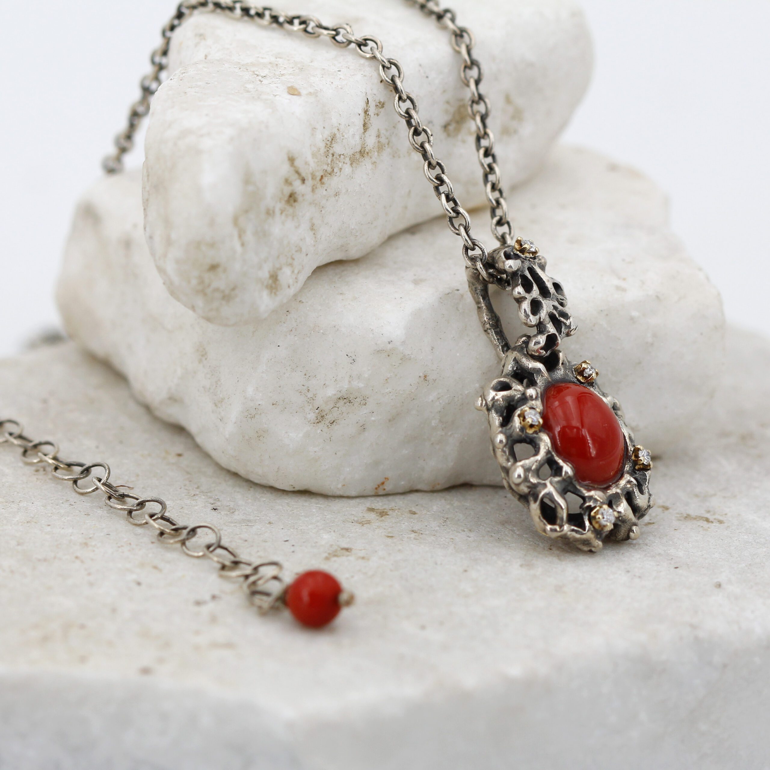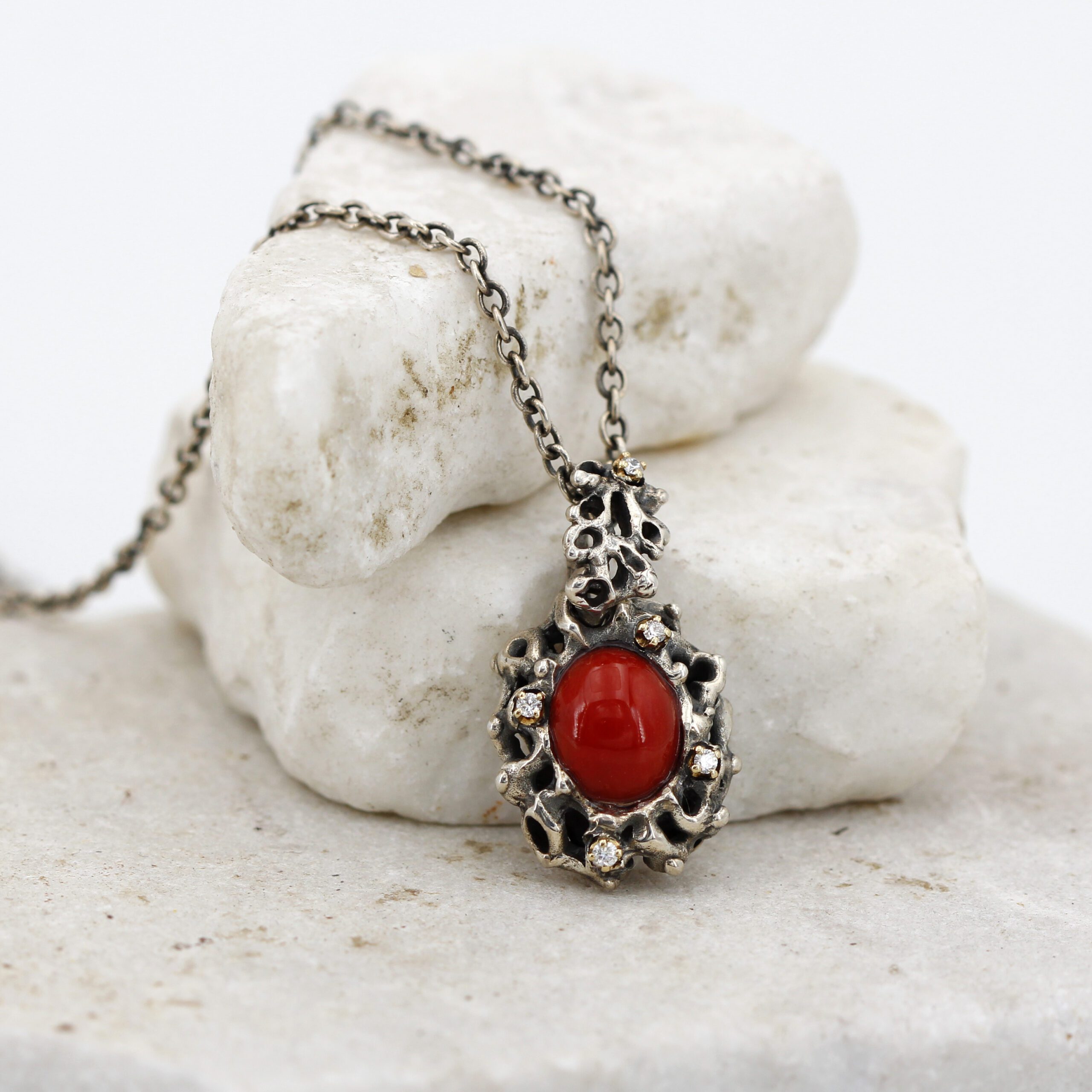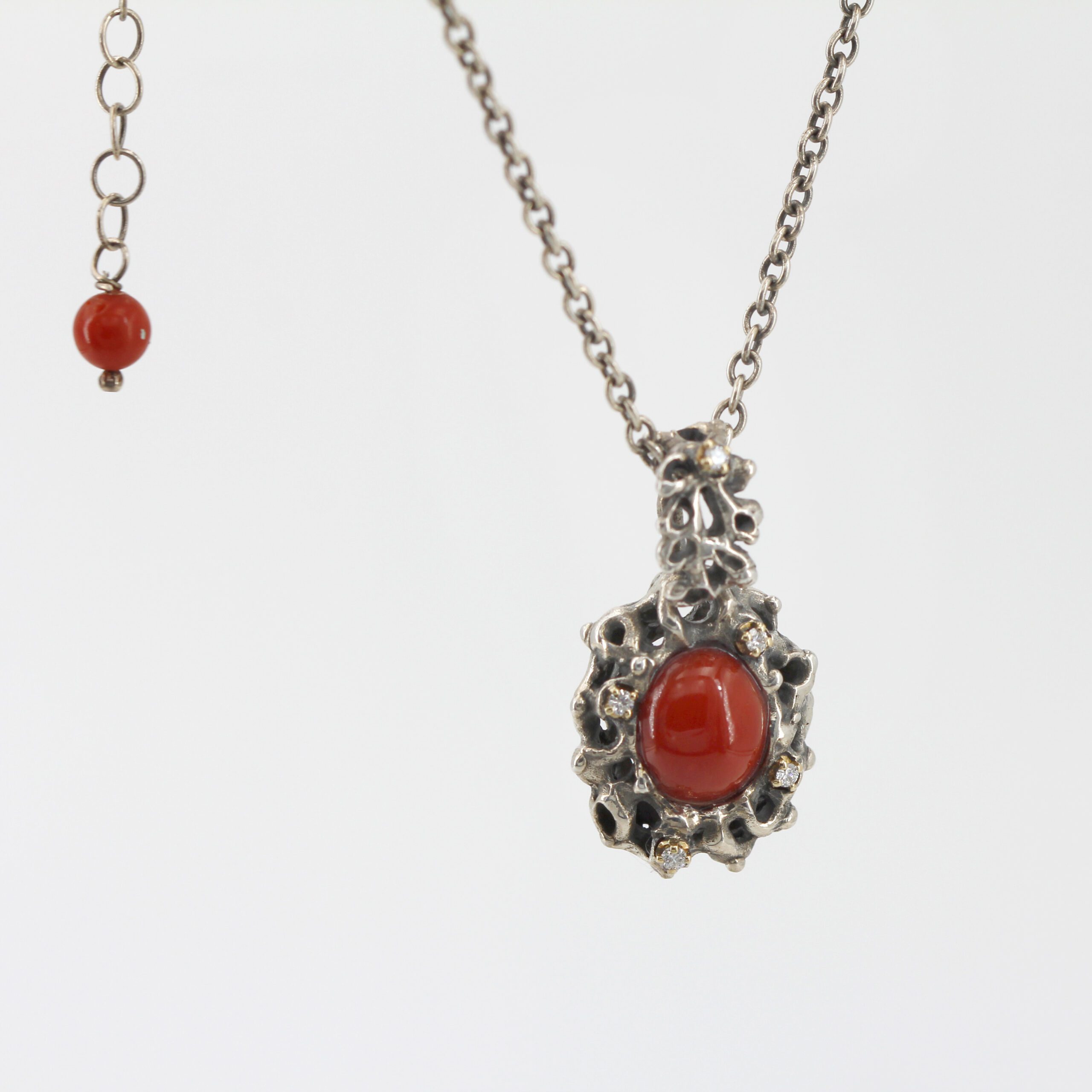 Silver Pendant with Coral and 5 Diamonds Set in 18kt Gold Prongs.