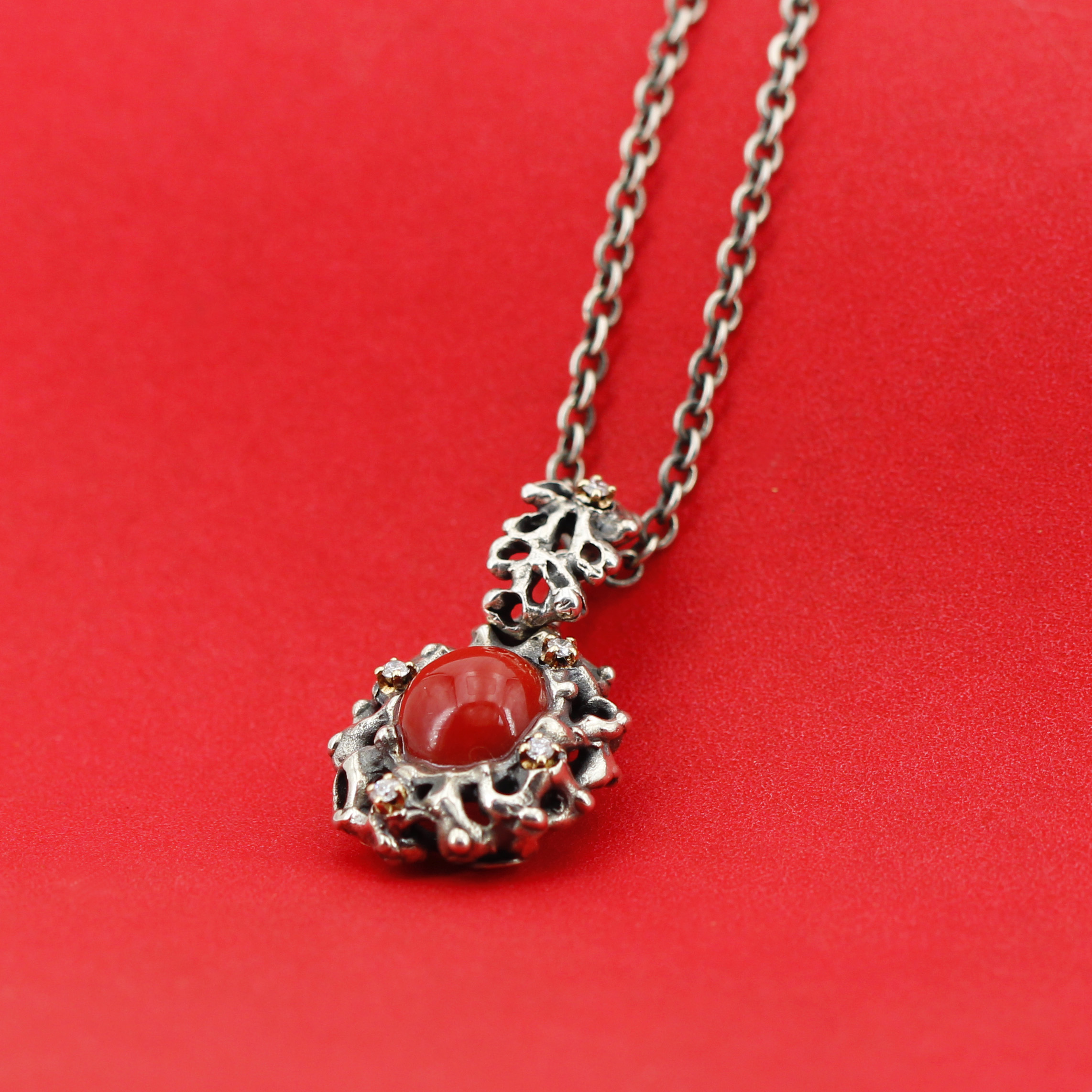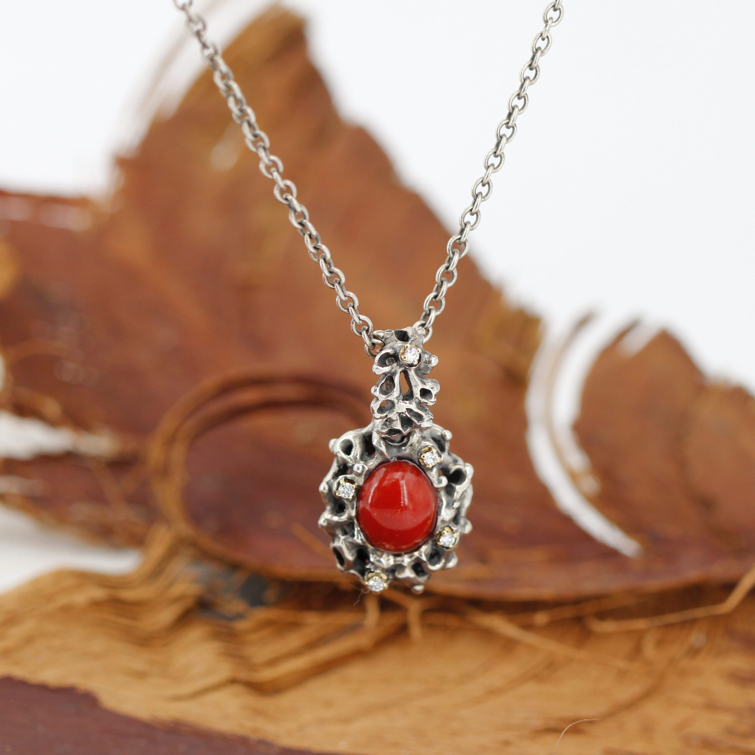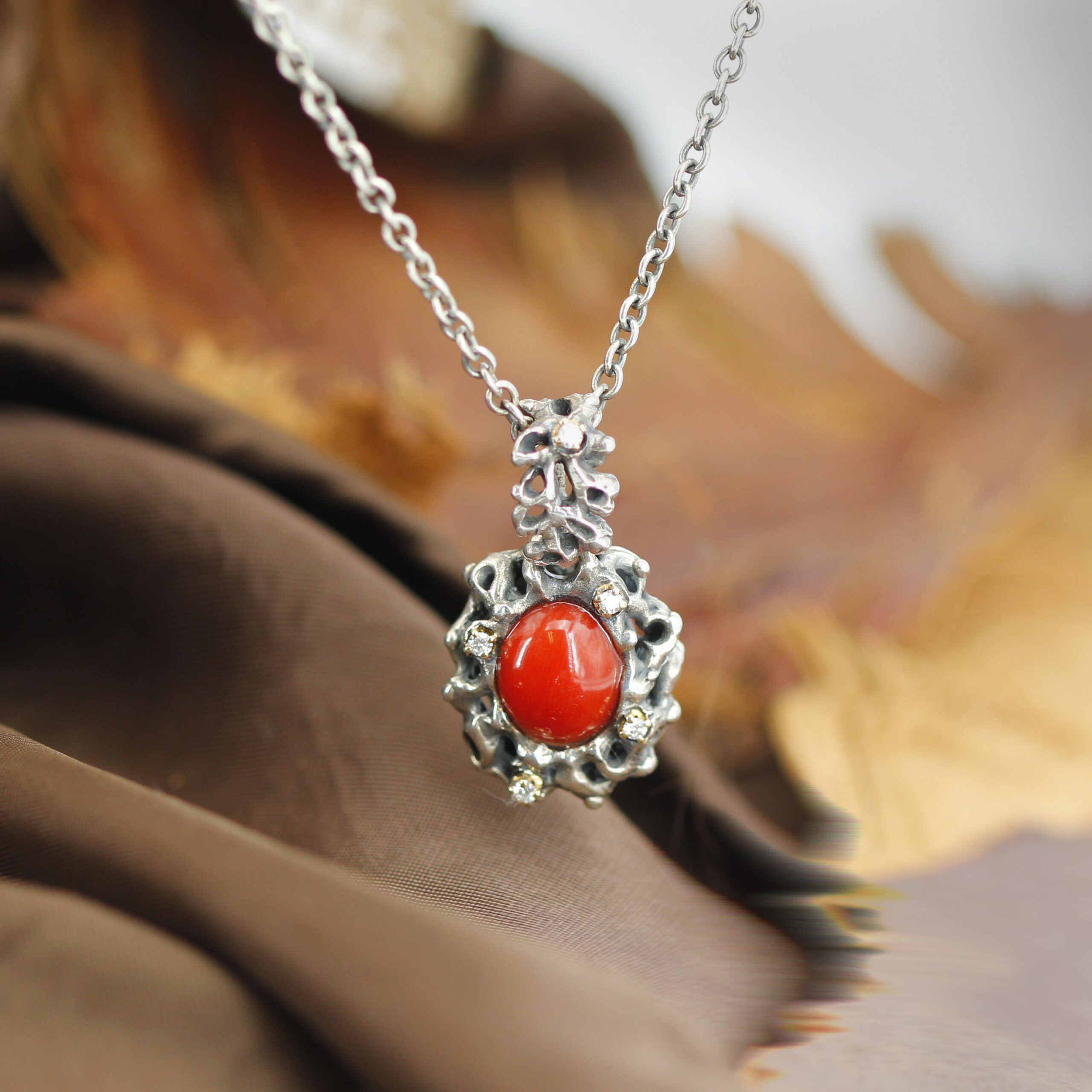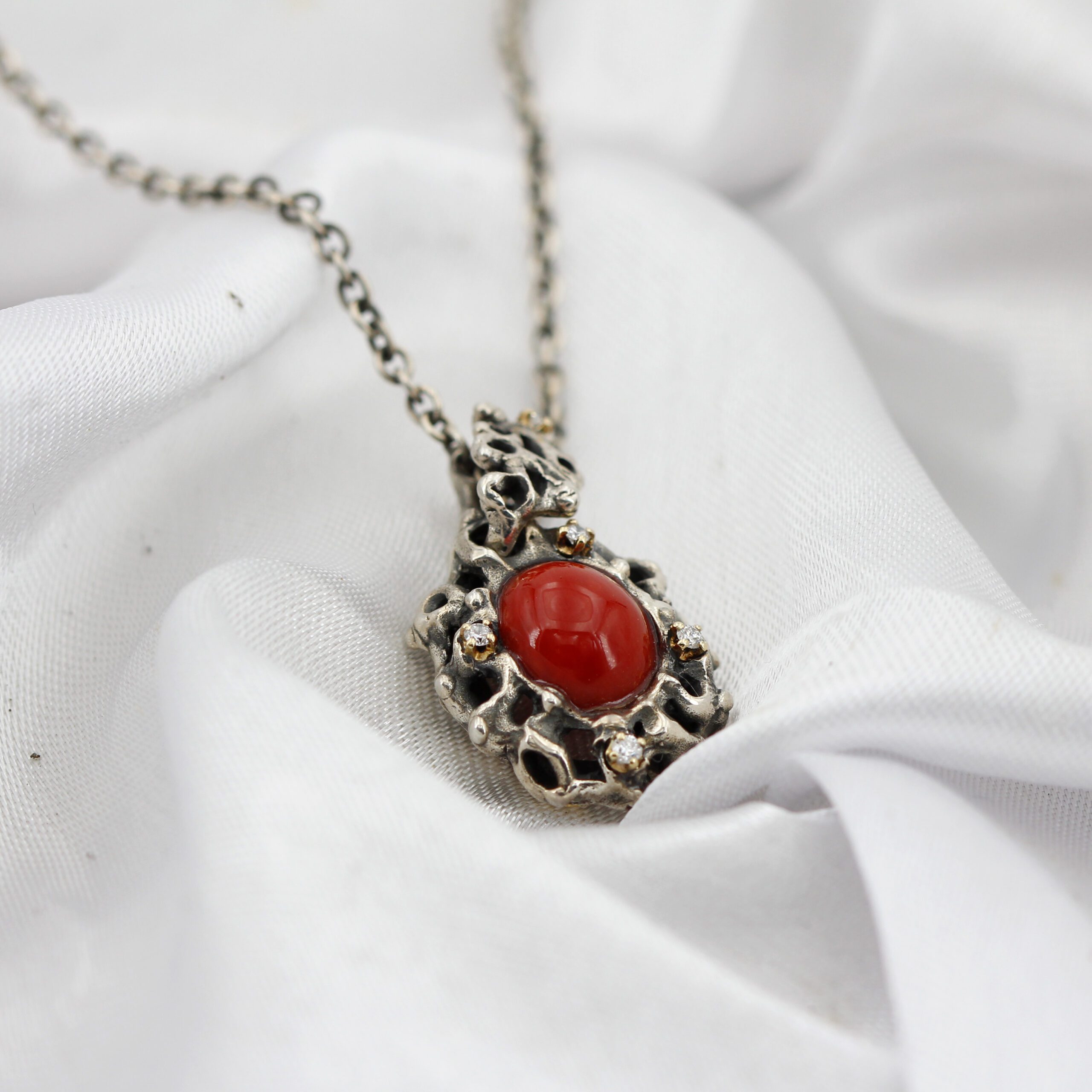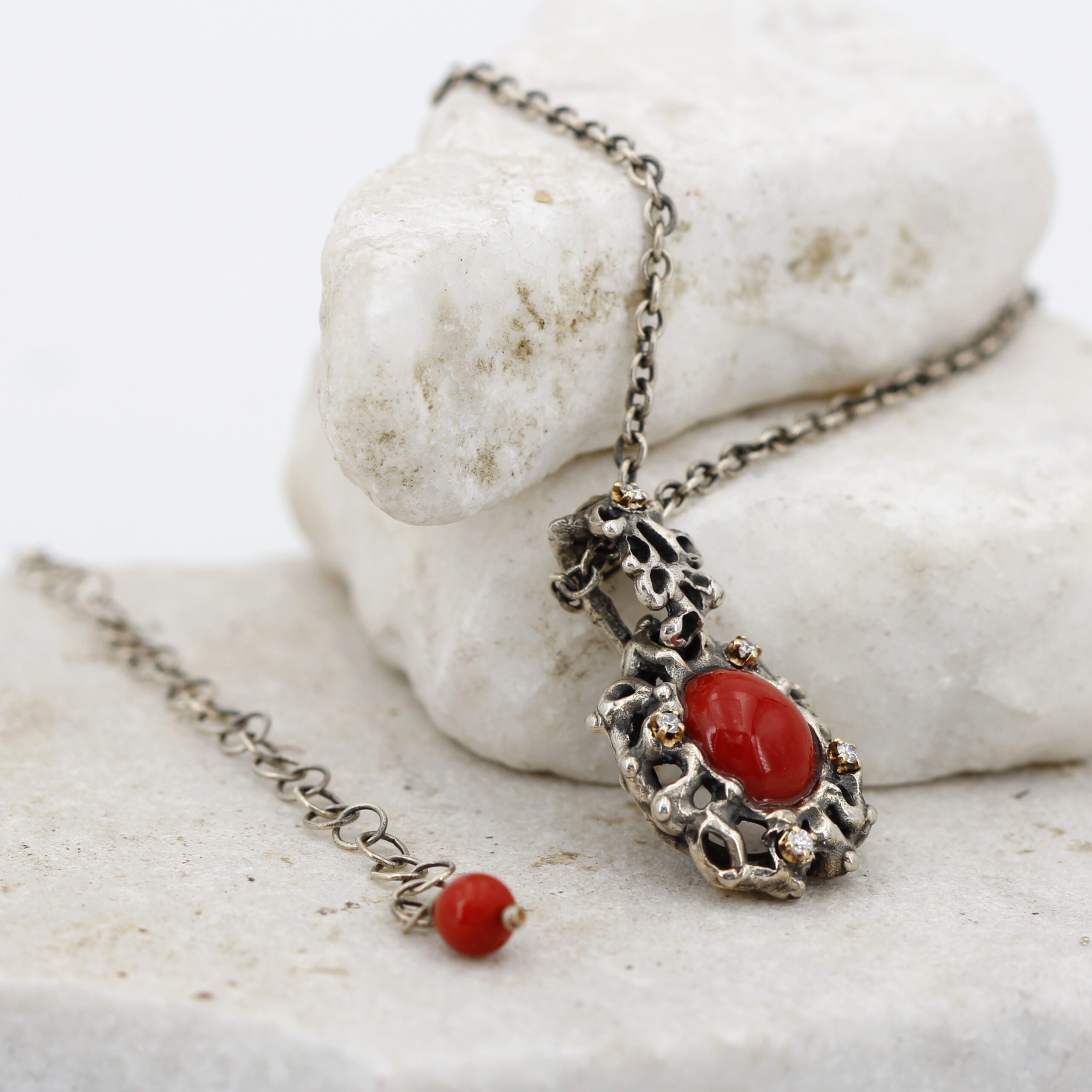 Silver Pendant with Coral and 5 Diamonds Set in 18kt Gold Prongs.
