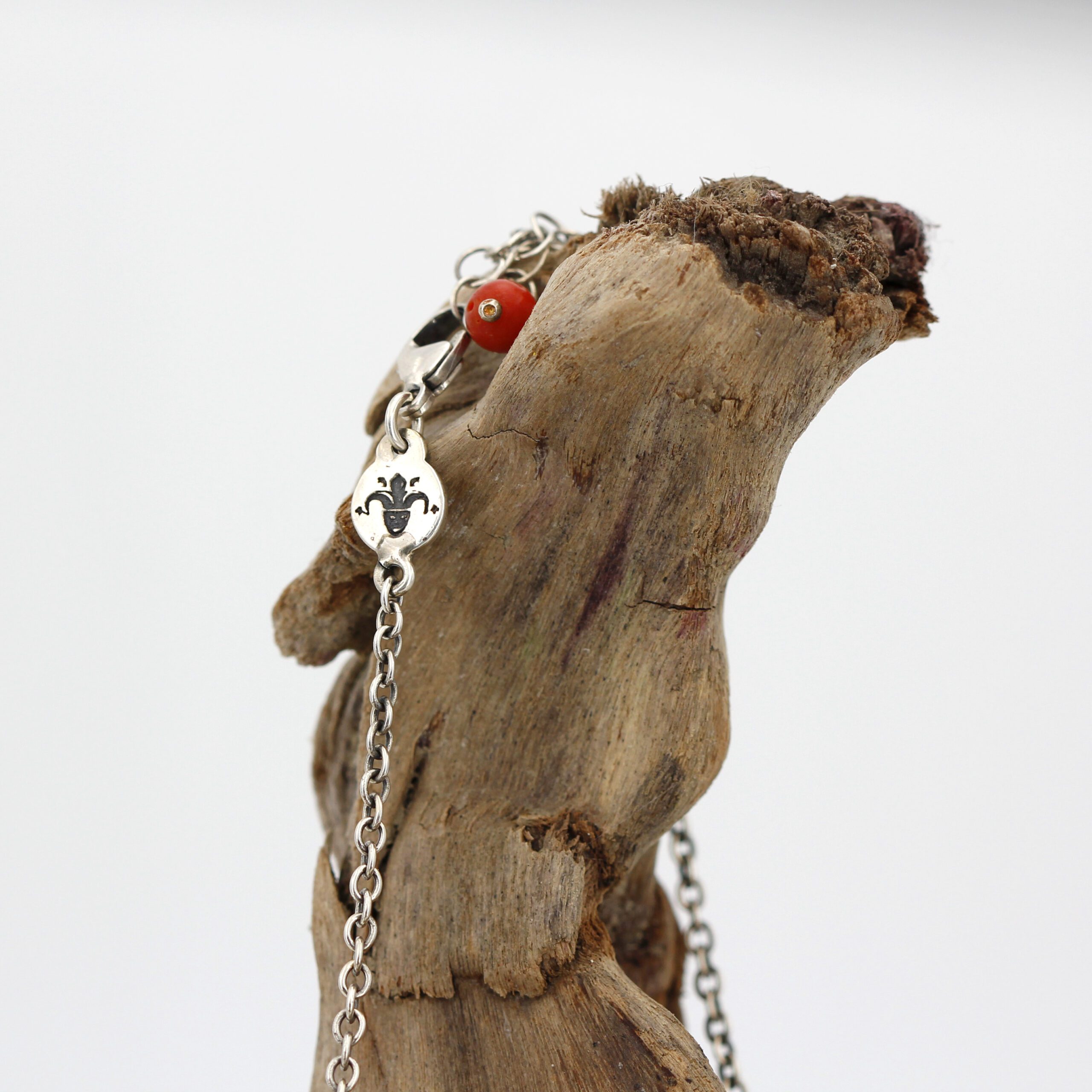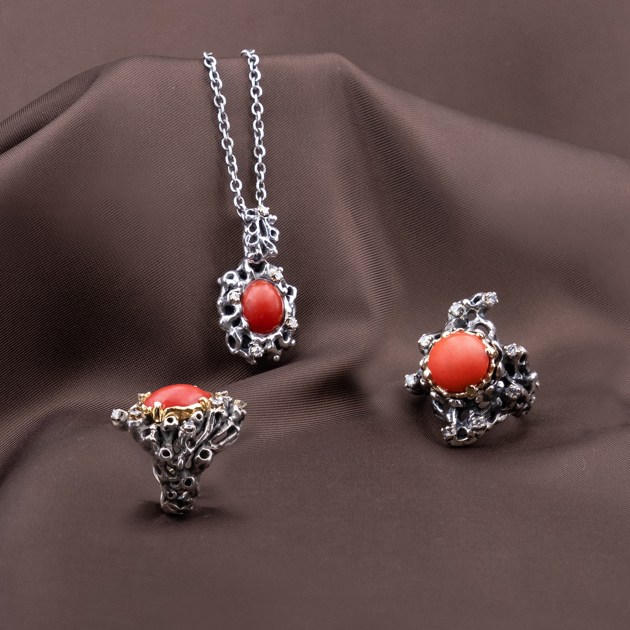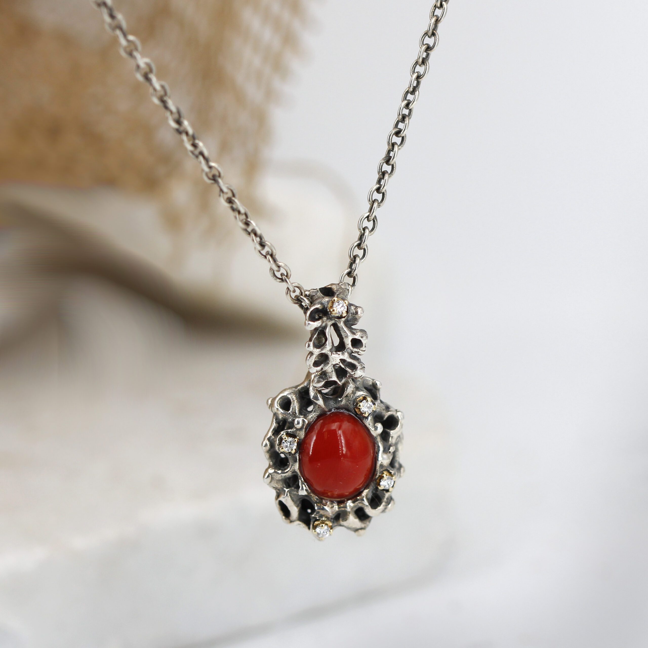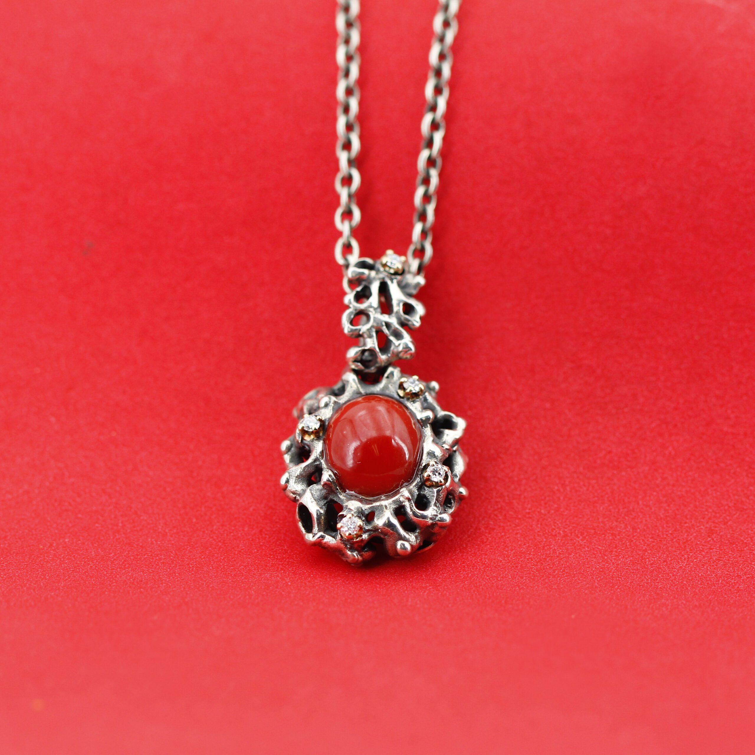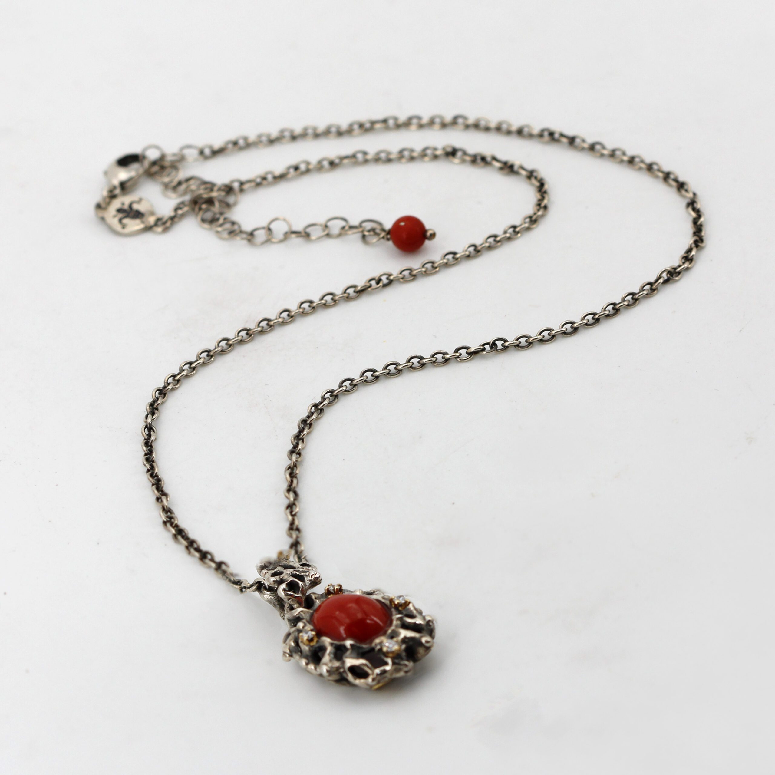 Silver Pendant with Coral and 5 Diamonds Set in 18kt Gold Prongs.
