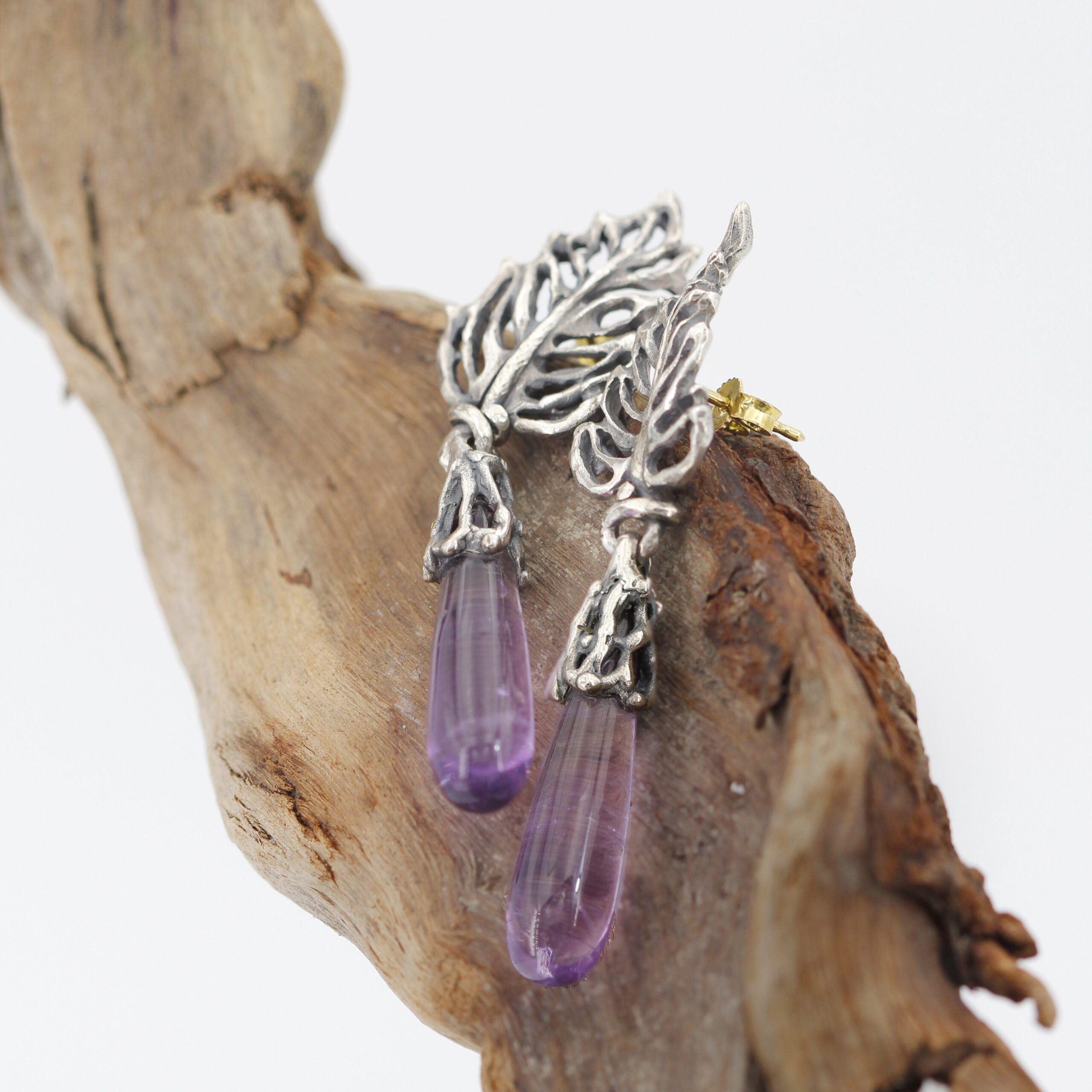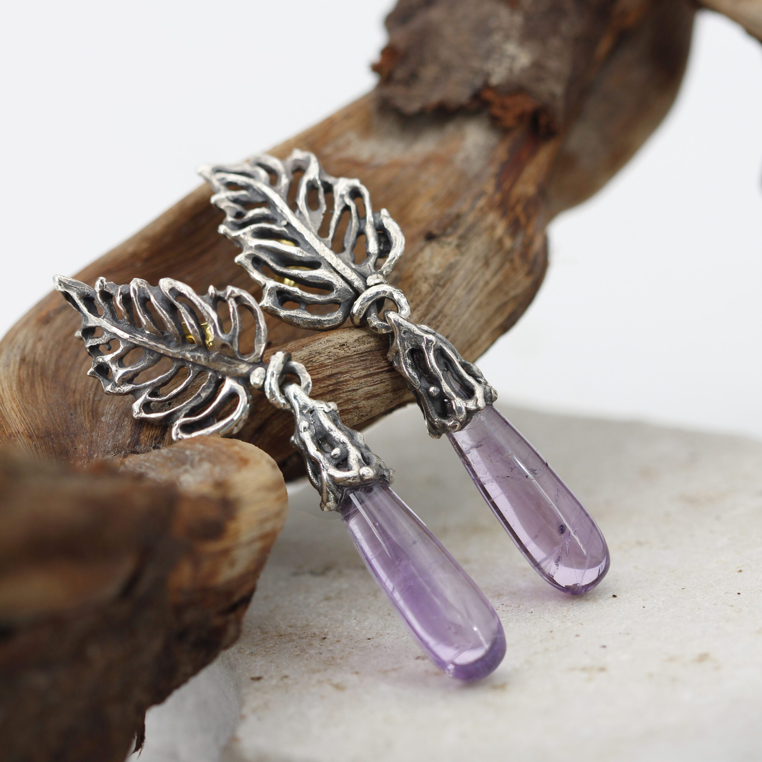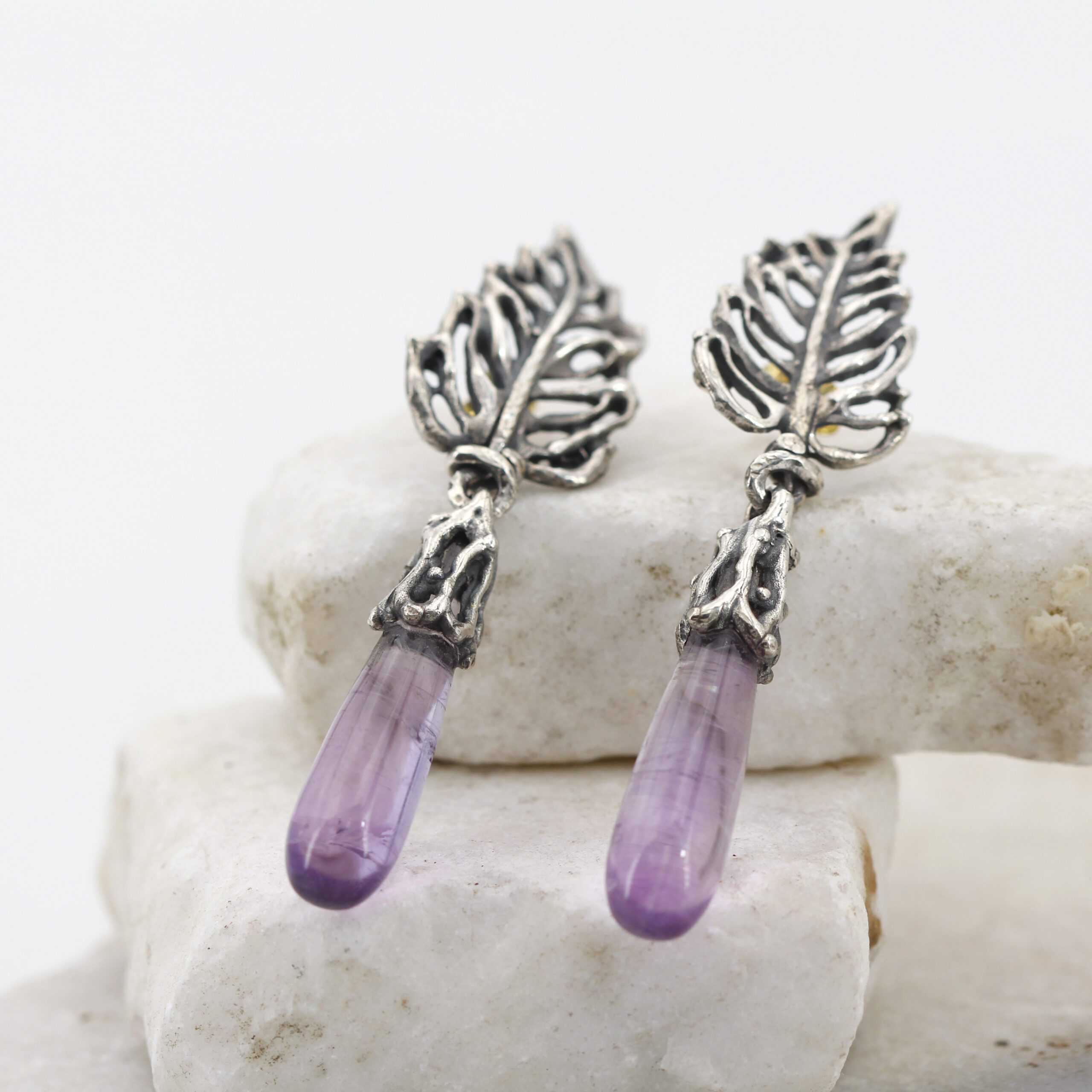 Adorned with luminous drop-shaped amethysts that capture the light with refined elegance. The upper part features a delicate leaf motif, symbolizing nature and renewal.