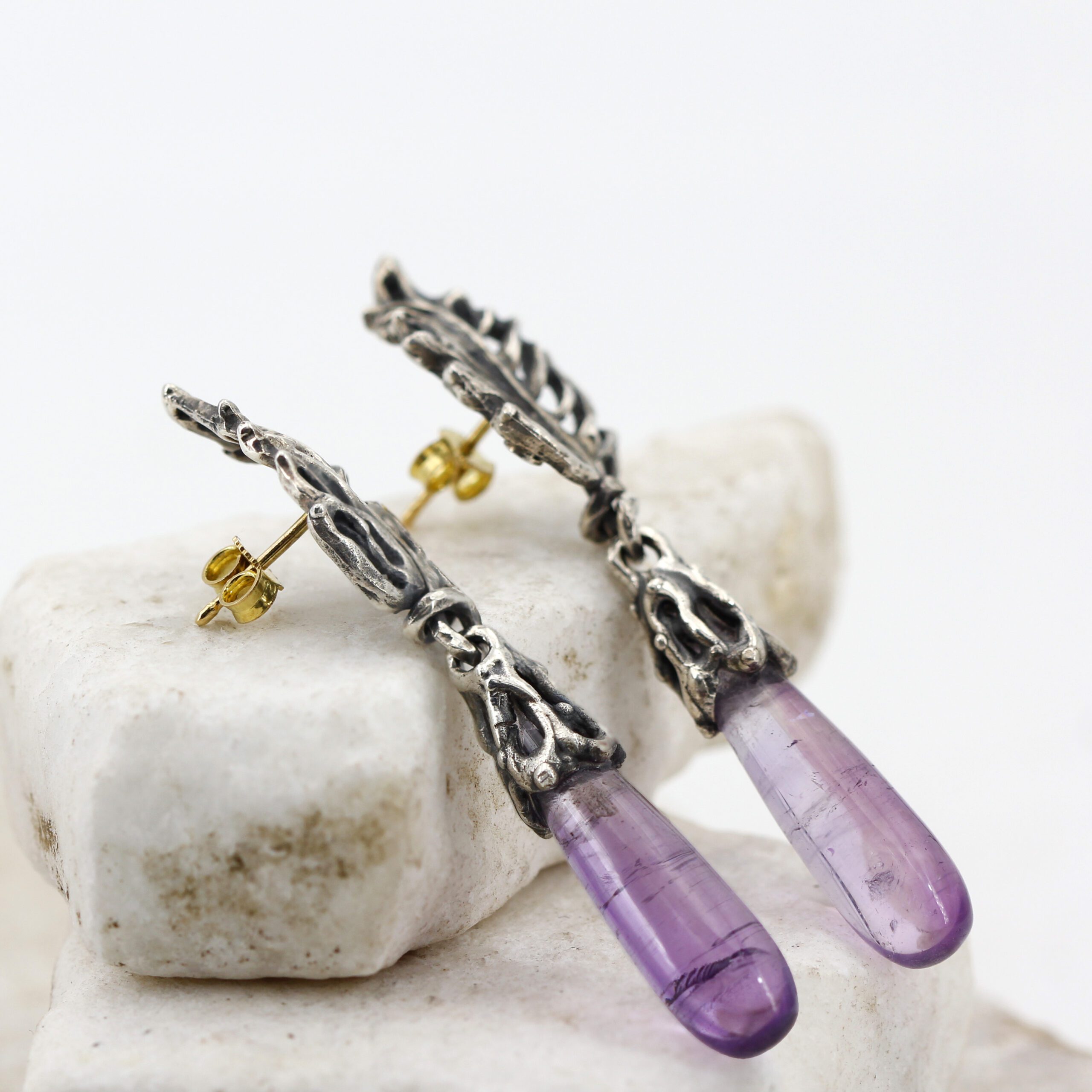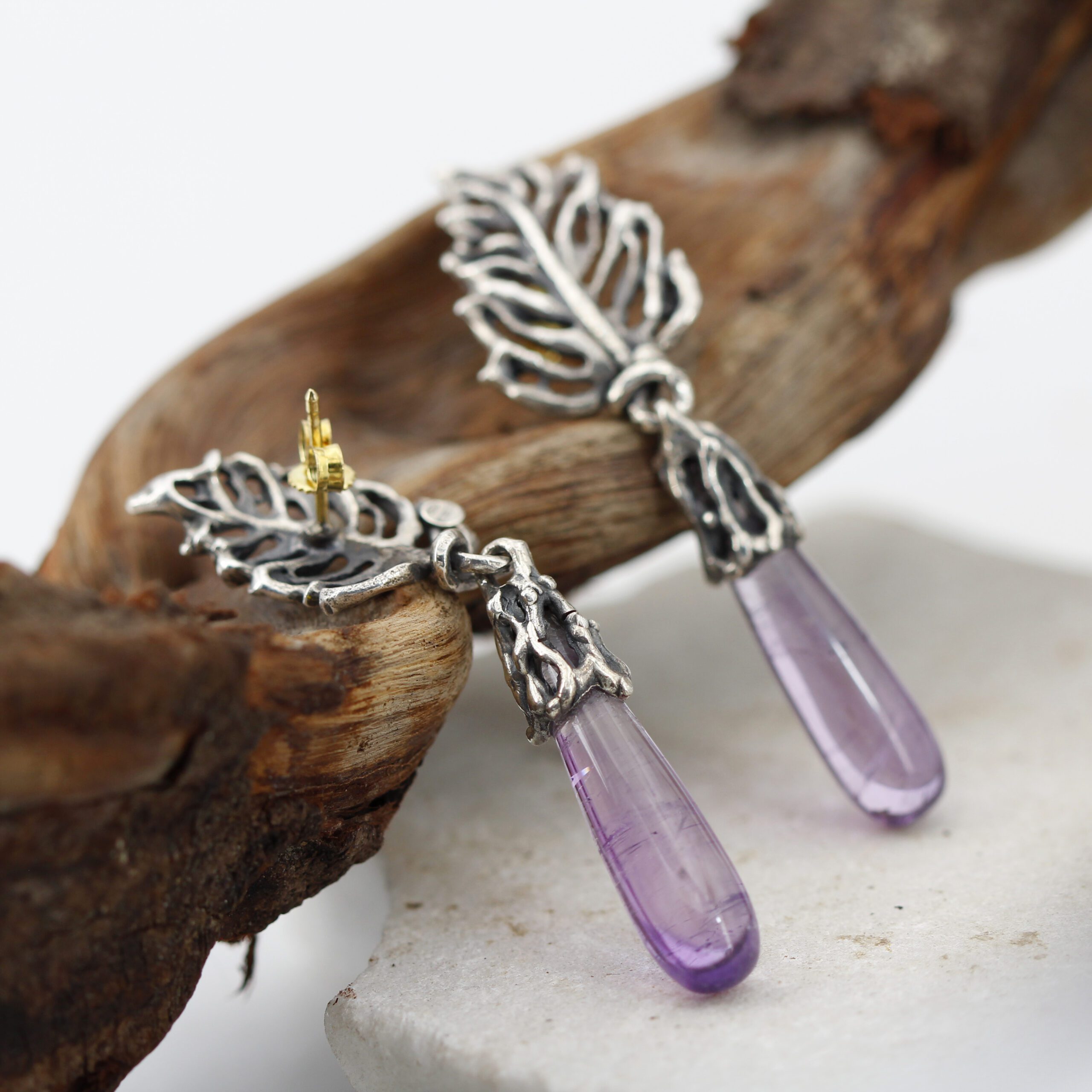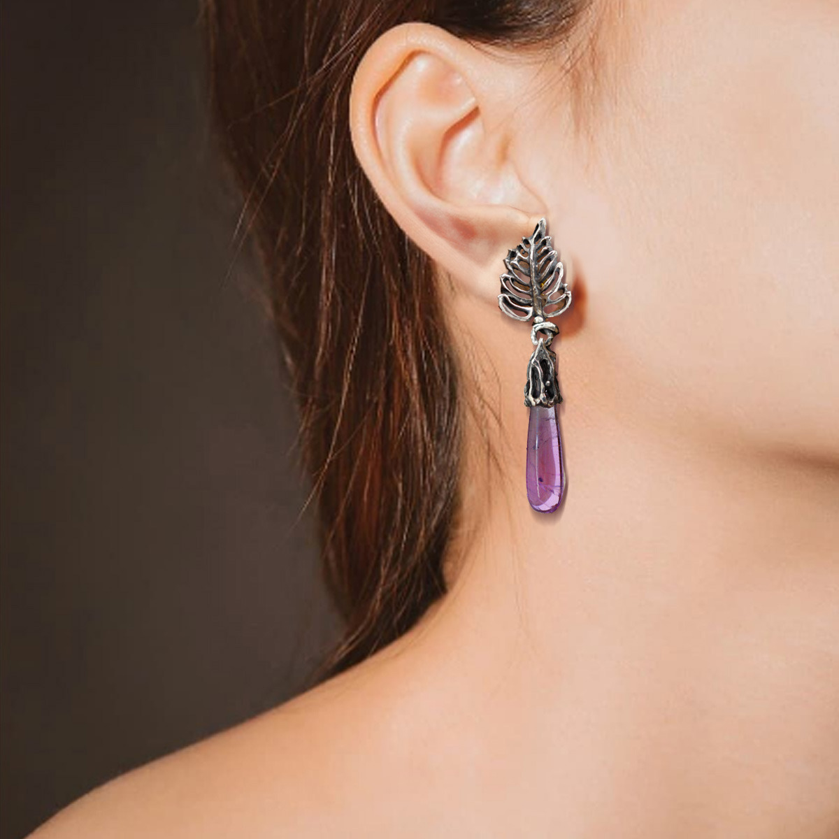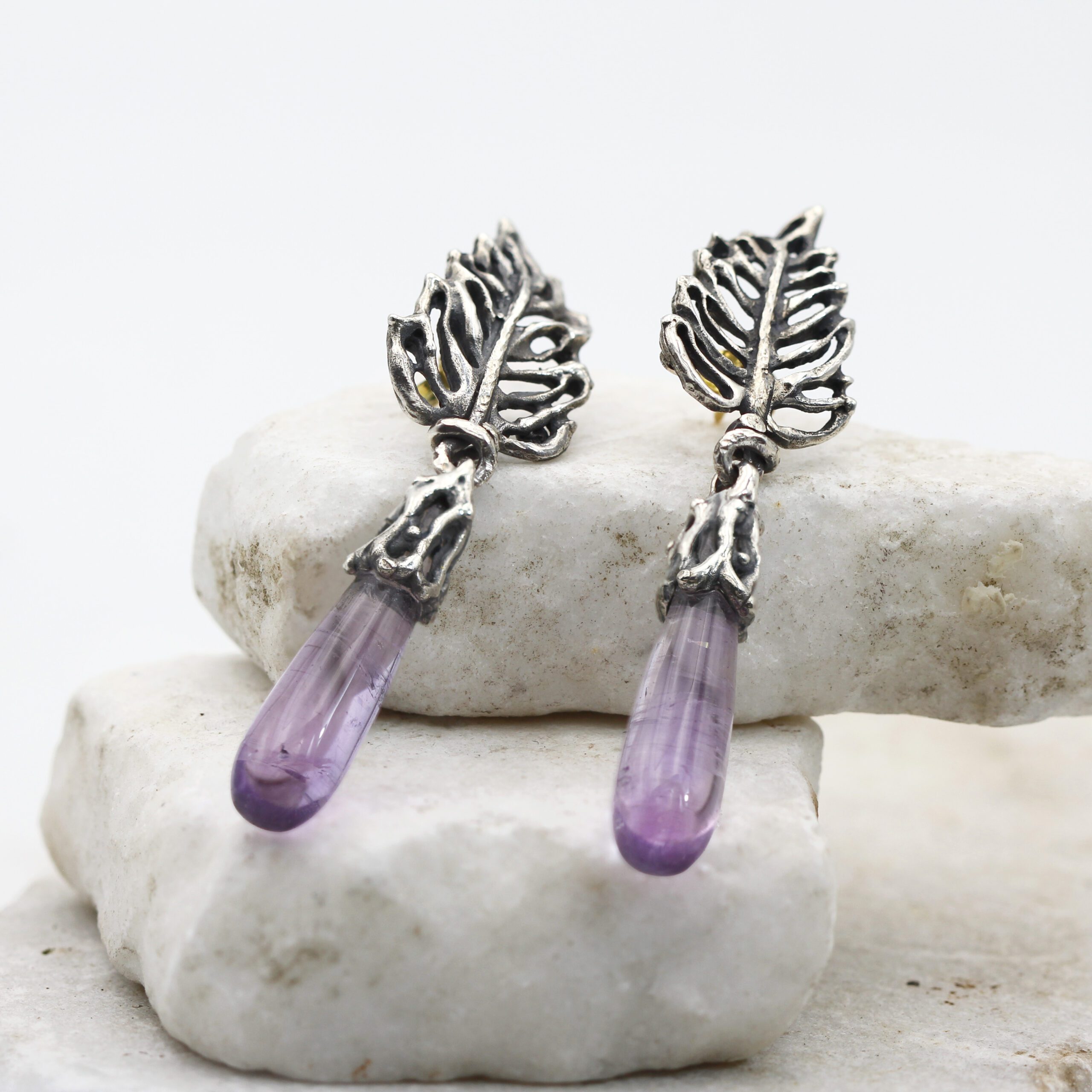 Adorned with luminous drop-shaped amethysts that capture the light with refined elegance. The upper part features a delicate leaf motif, symbolizing nature and renewal.