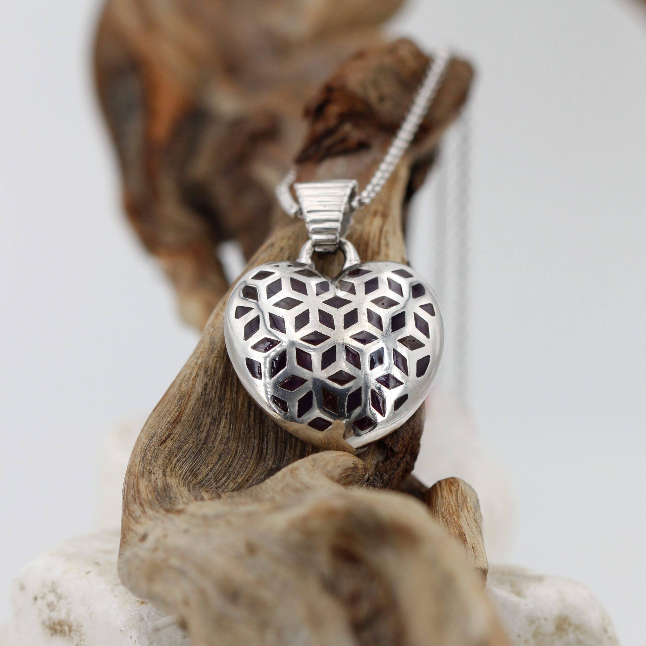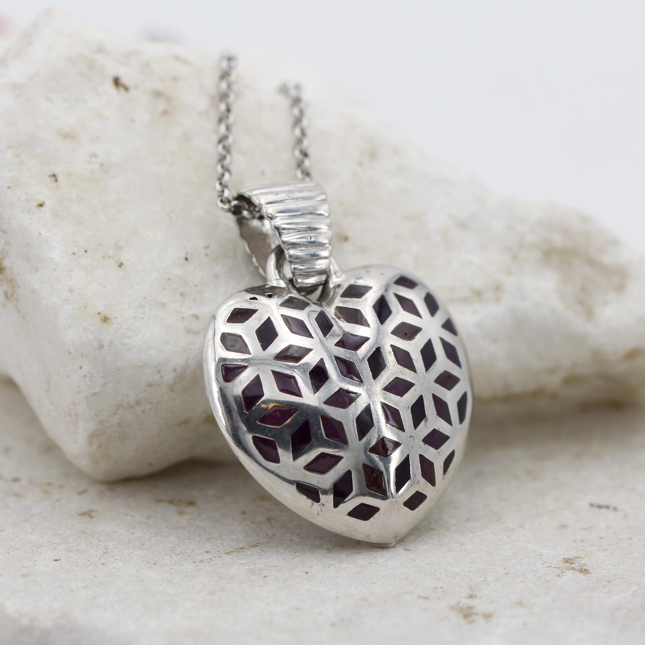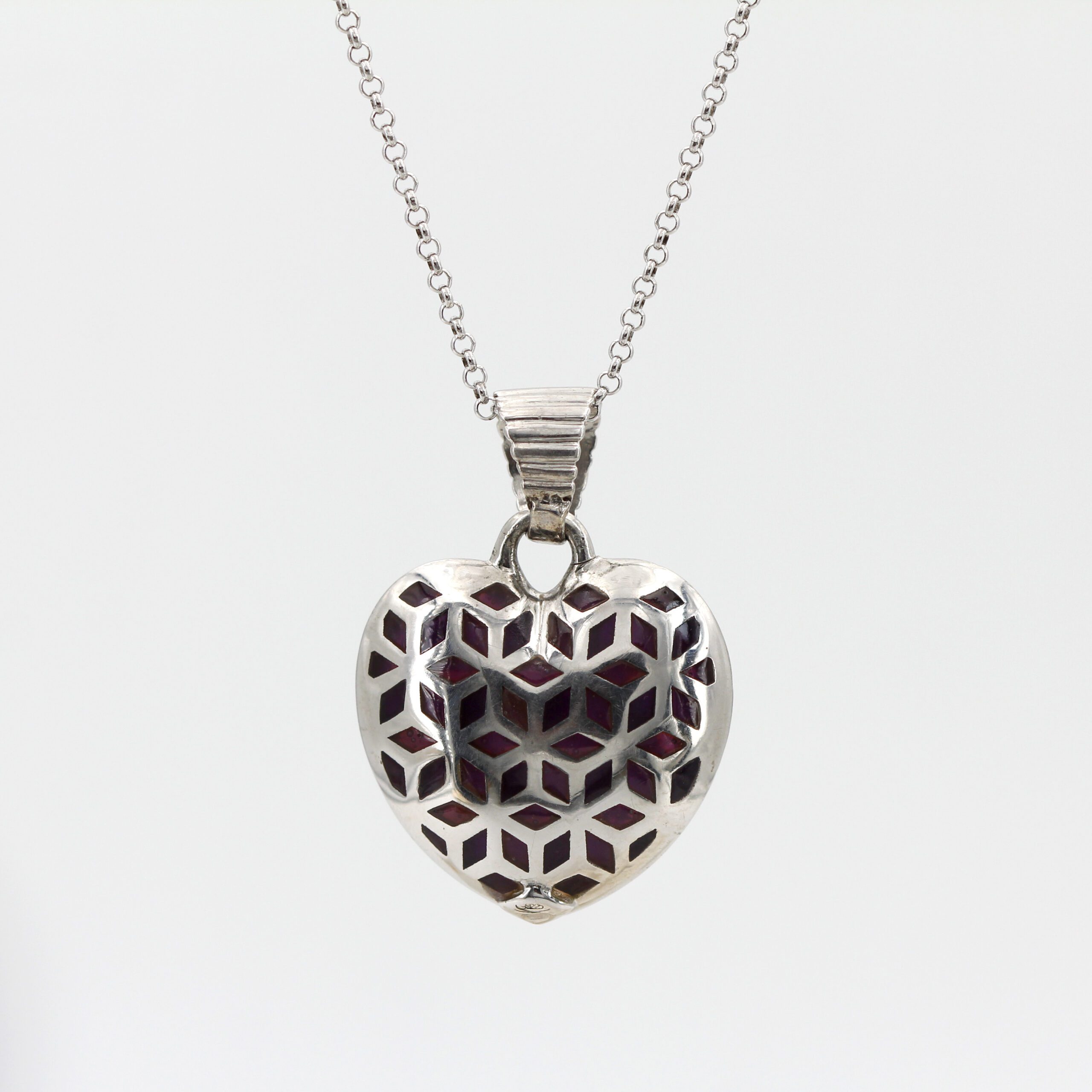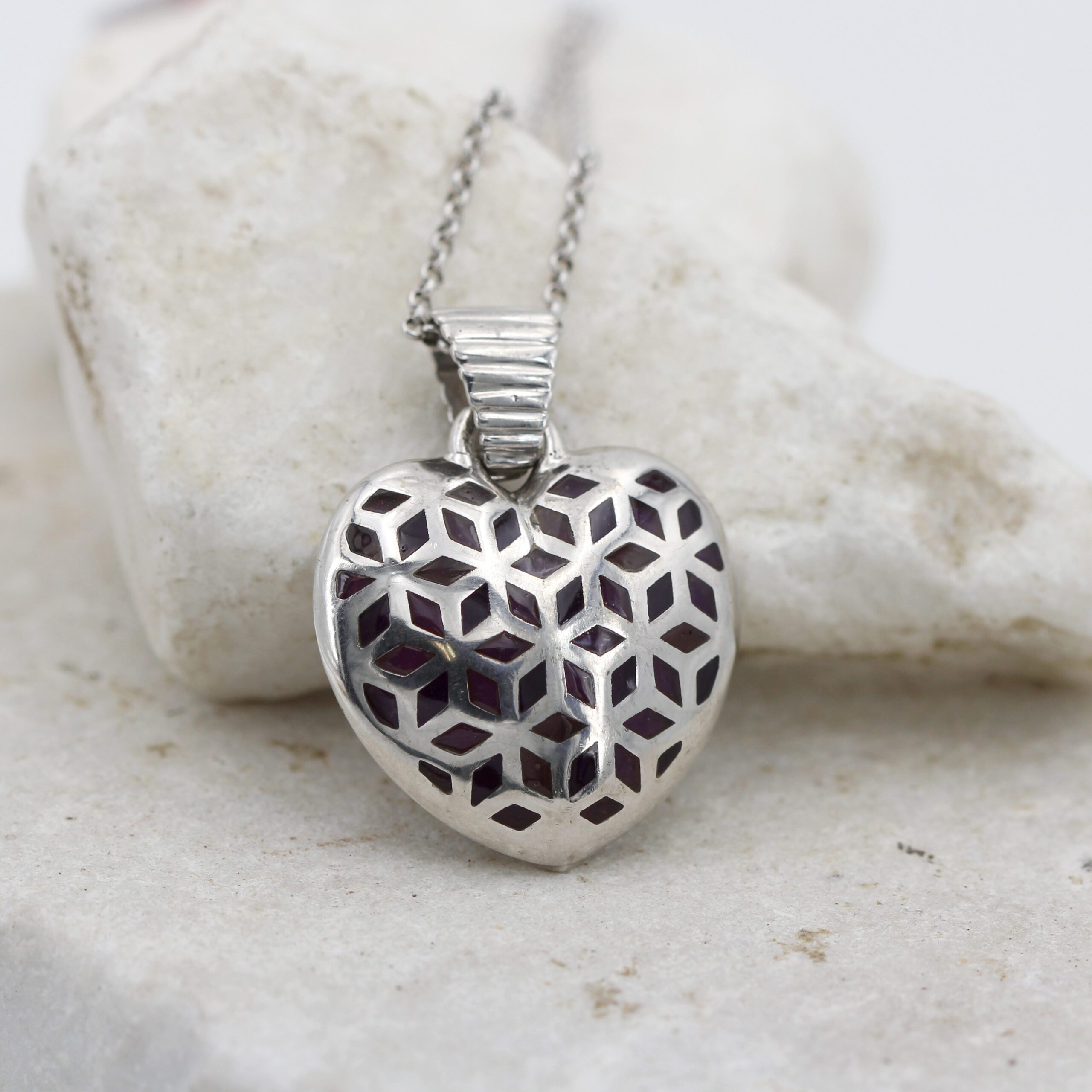 The Silver Heart Pendant with Diamond-Shaped Motifs and Bordeaux Enamel is an elegant and refined piece of jewelry, combining romance and character. Crafted in silver, it features a delicate heart shape adorned with finely worked diamond-shaped motifs.