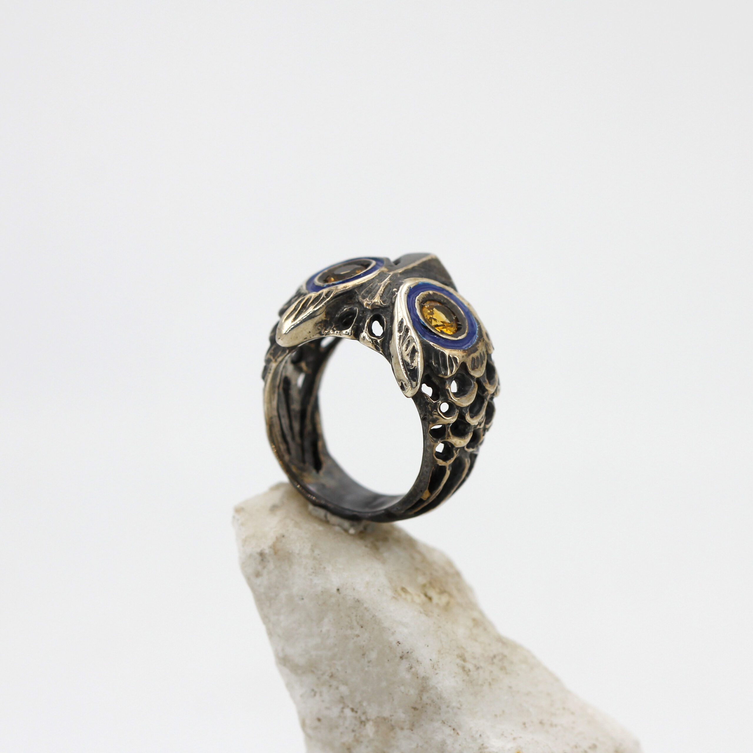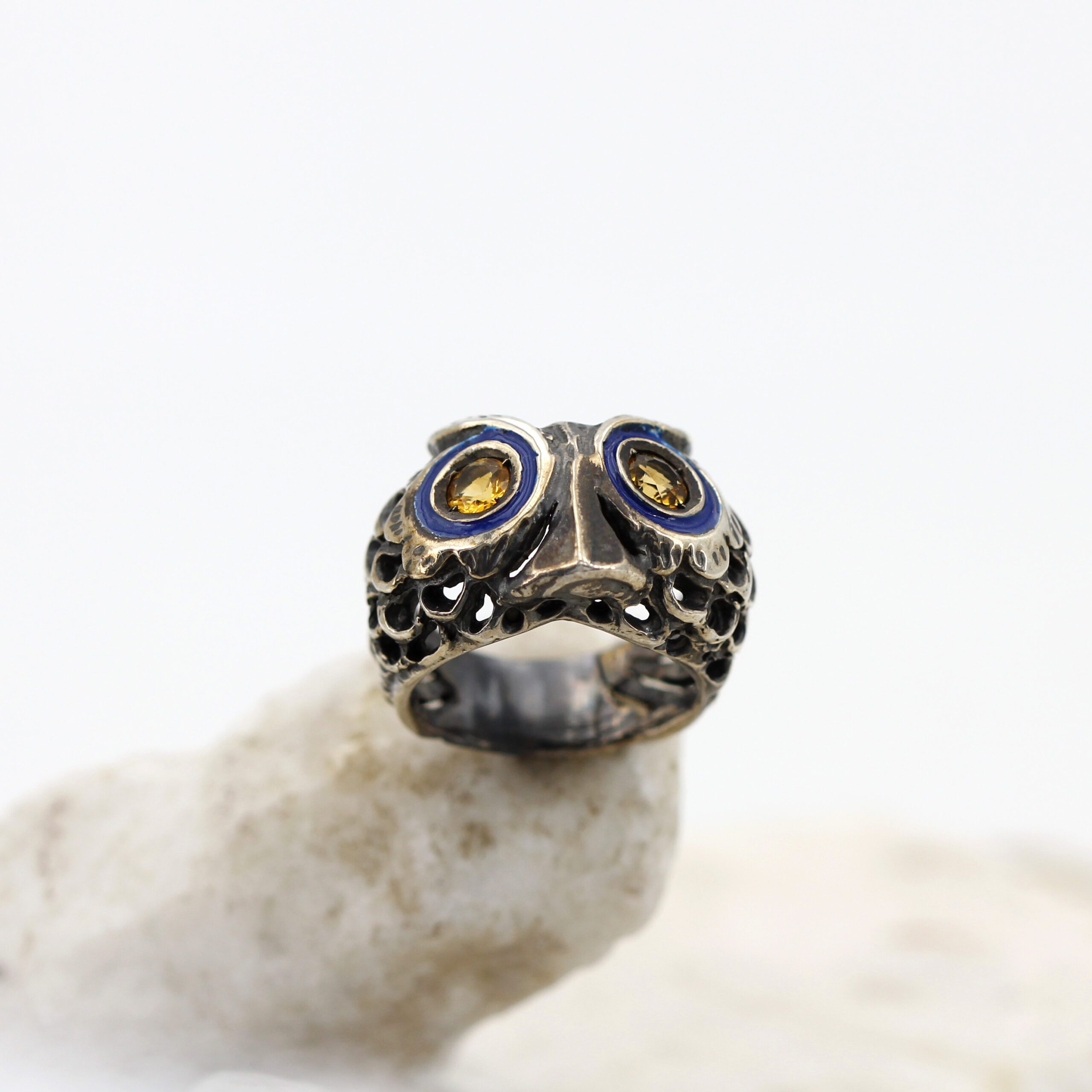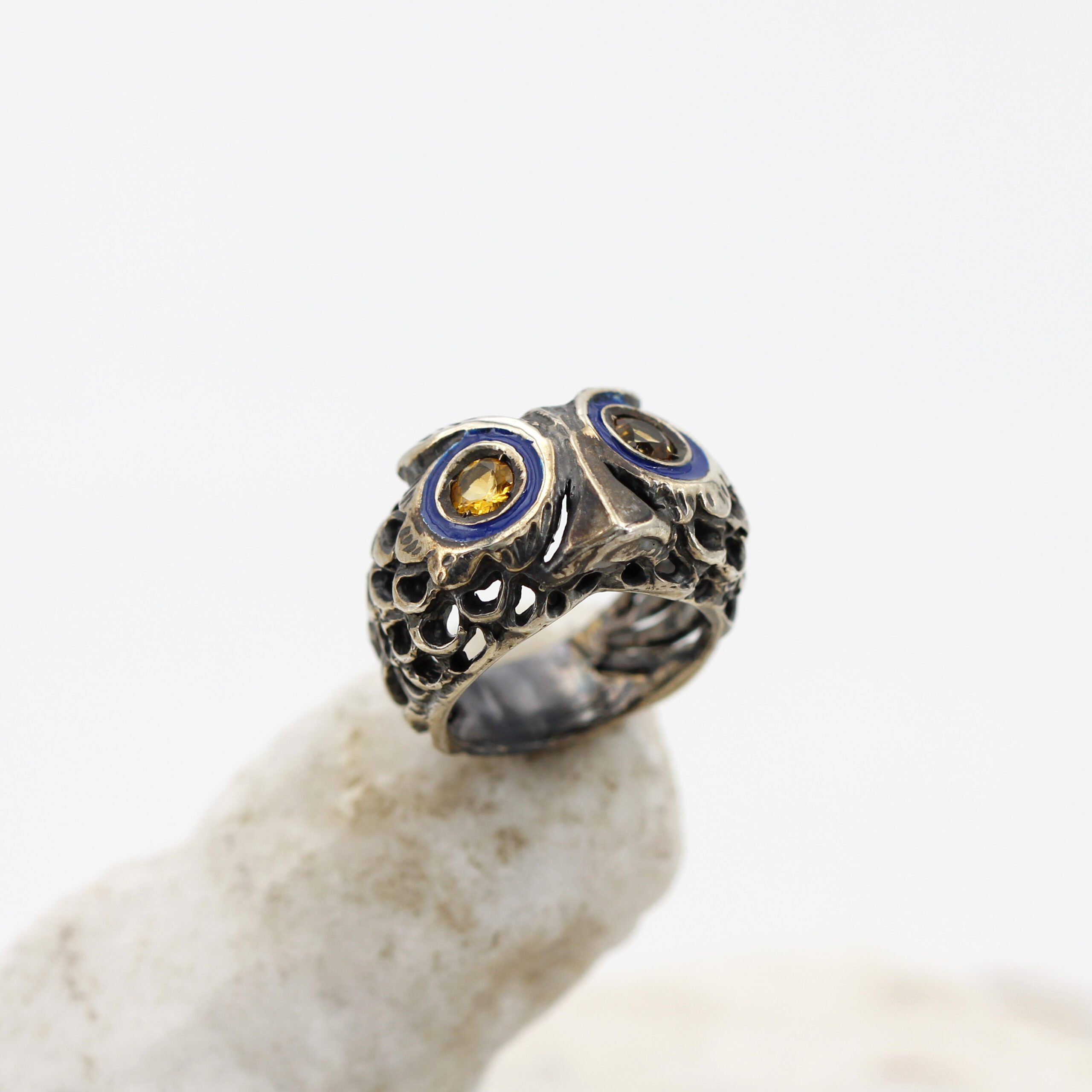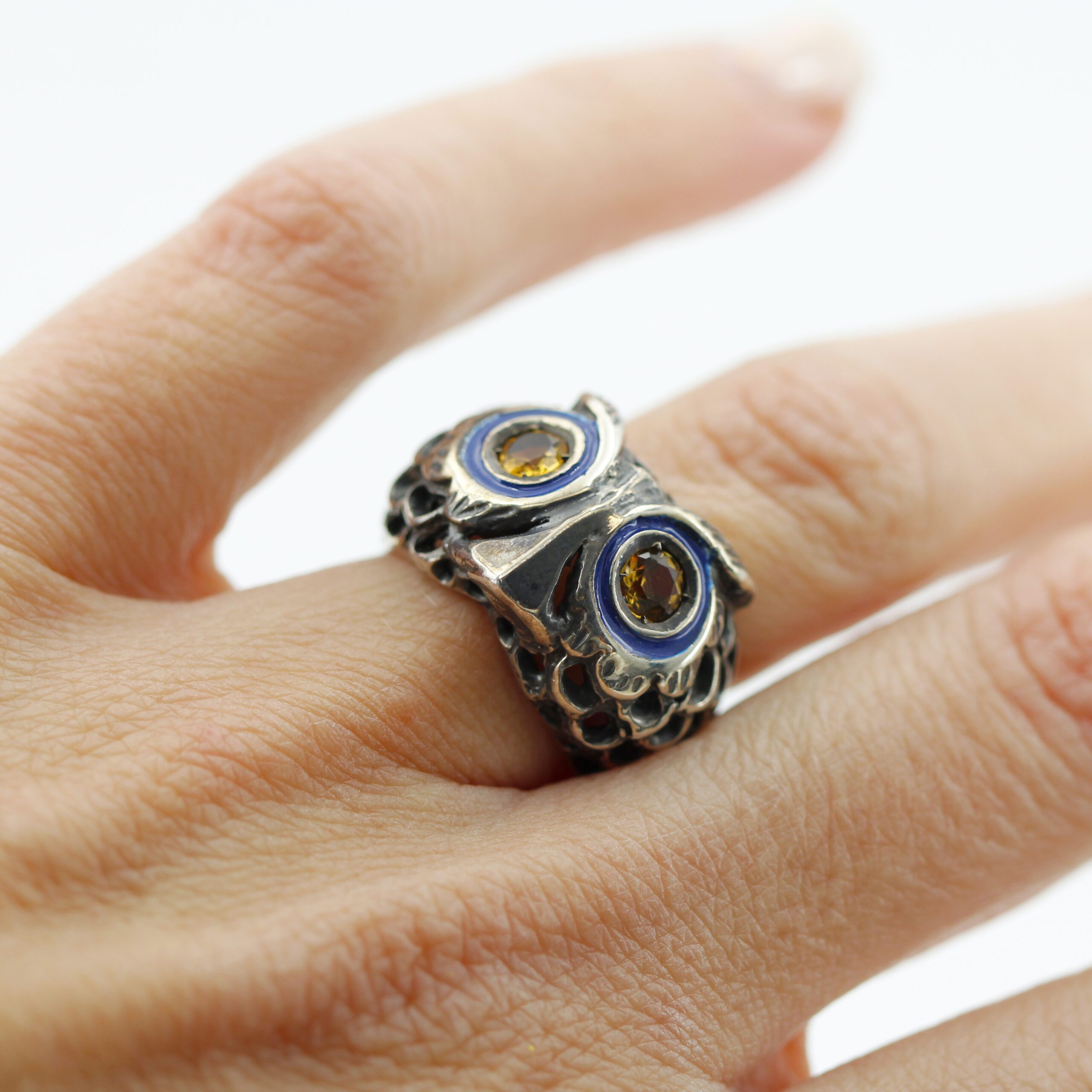 925‰ Sterling Silver Owl Ring, weight 11.00 g, with natural gemstones – Citrine quartz embellishing its eyes; blue enamel detailing.