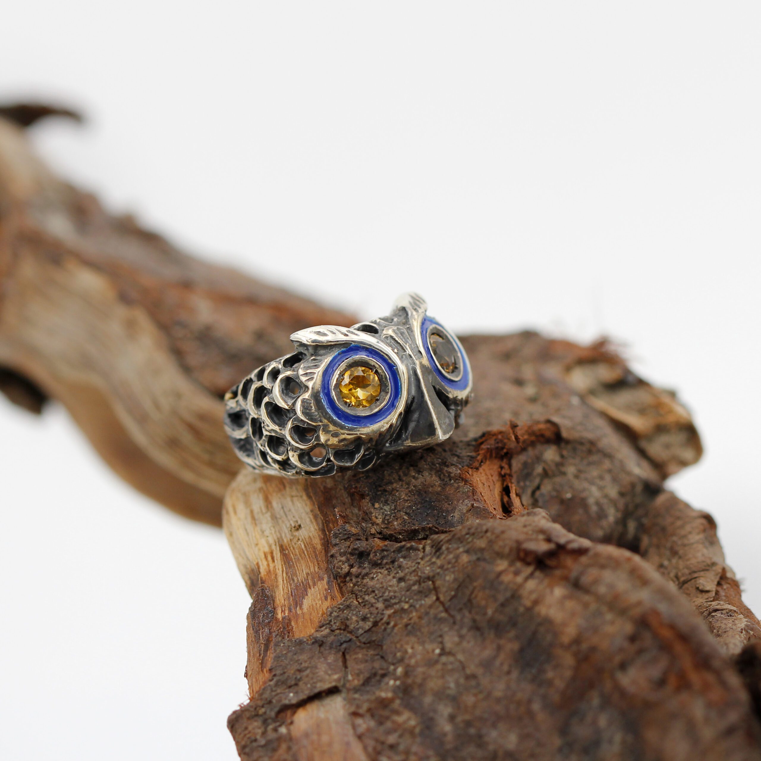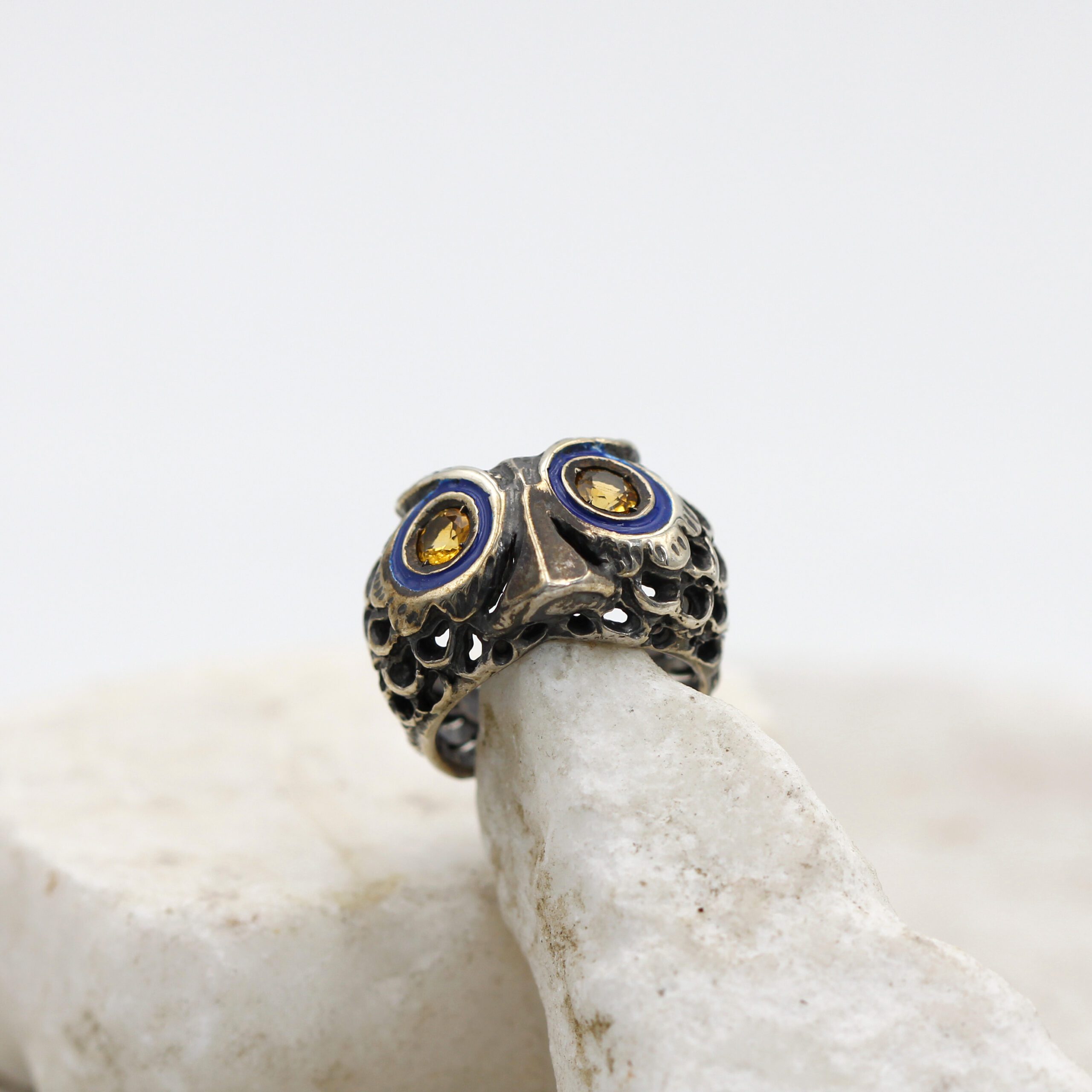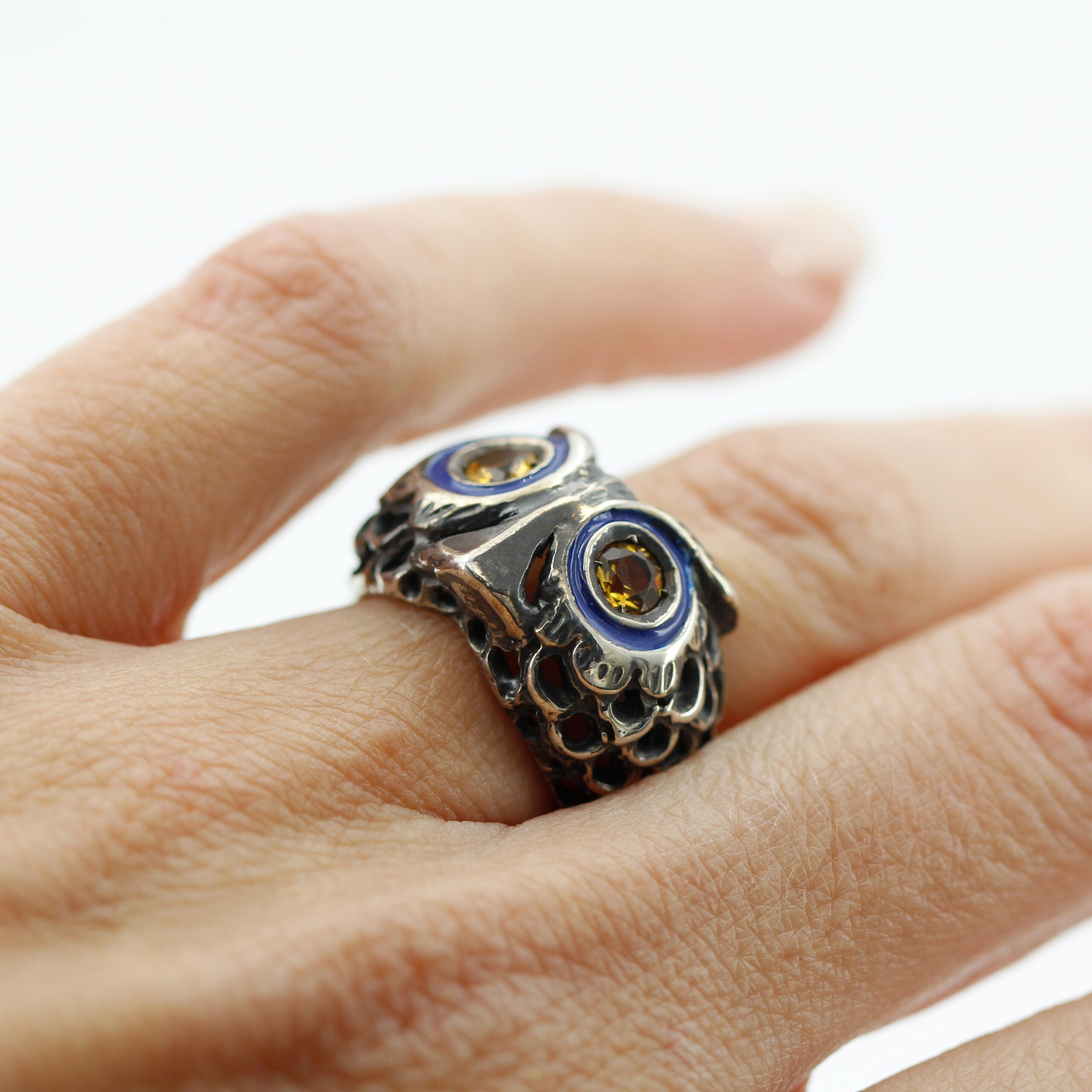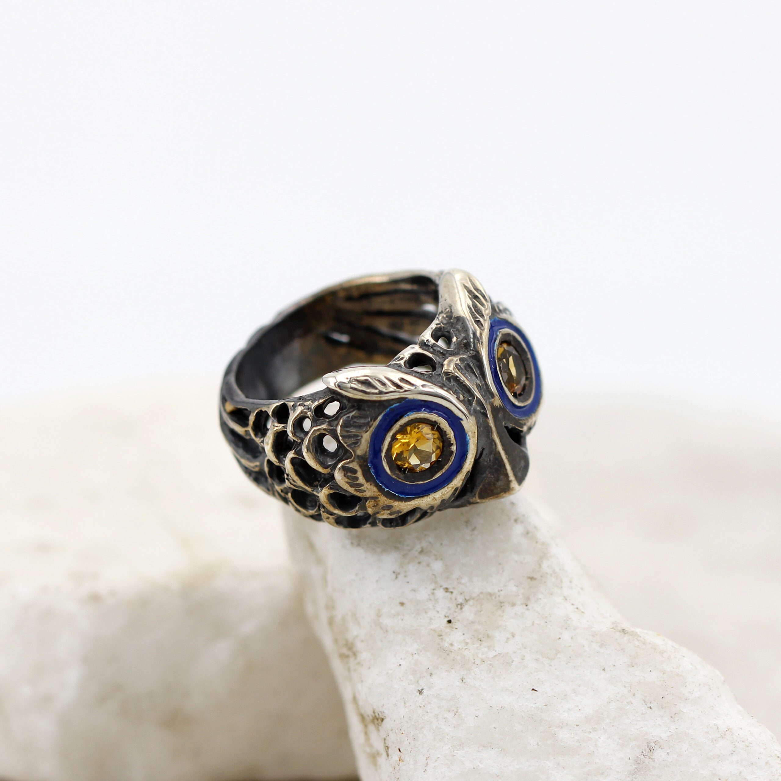 925‰ Sterling Silver Owl Ring, weight 11.00 g, with natural gemstones – Citrine quartz embellishing its eyes; blue enamel detailing.