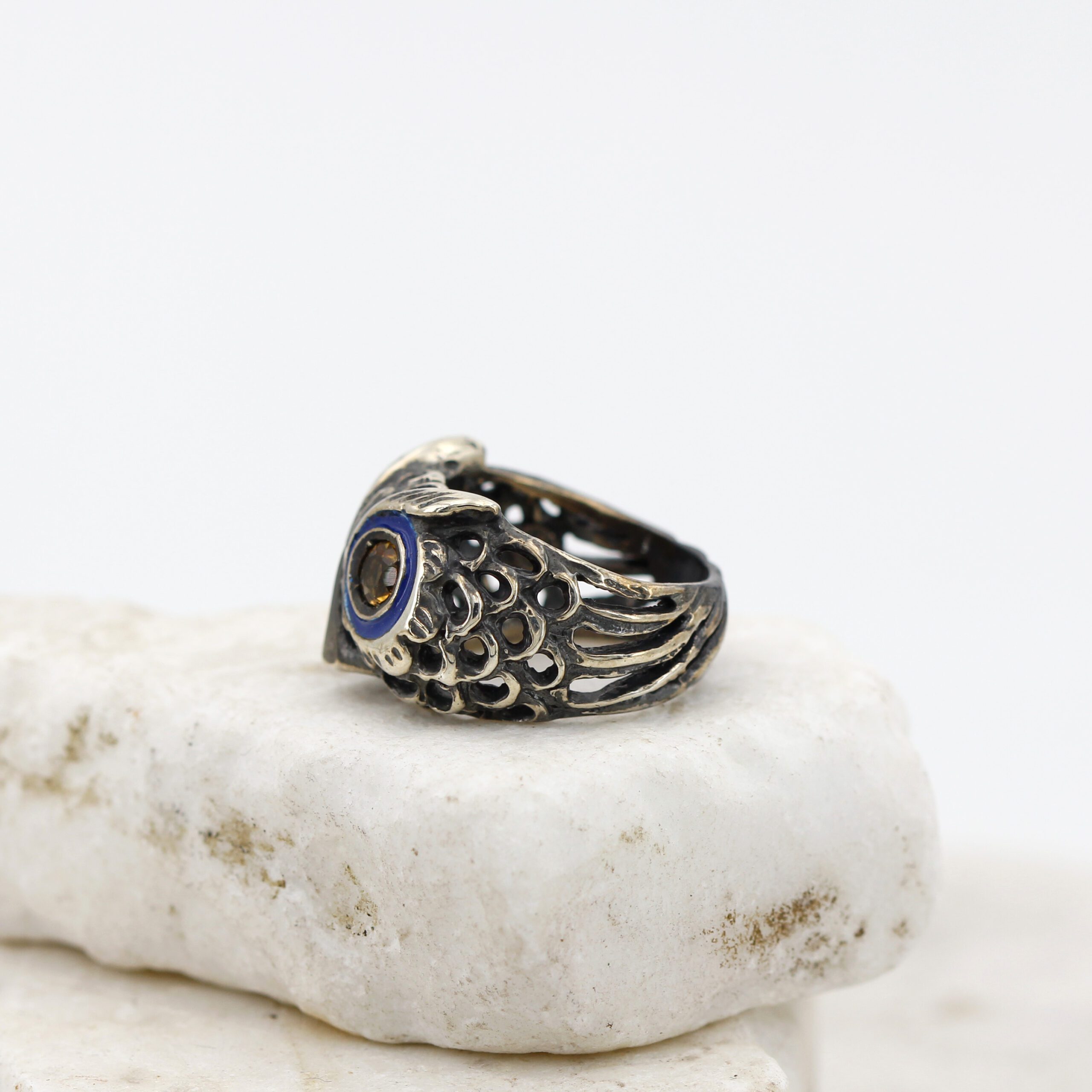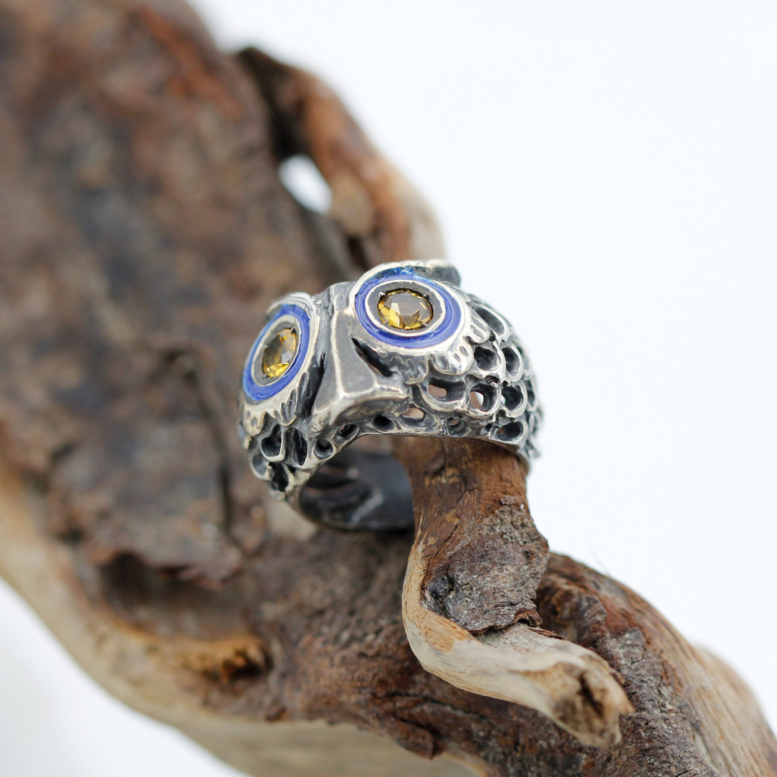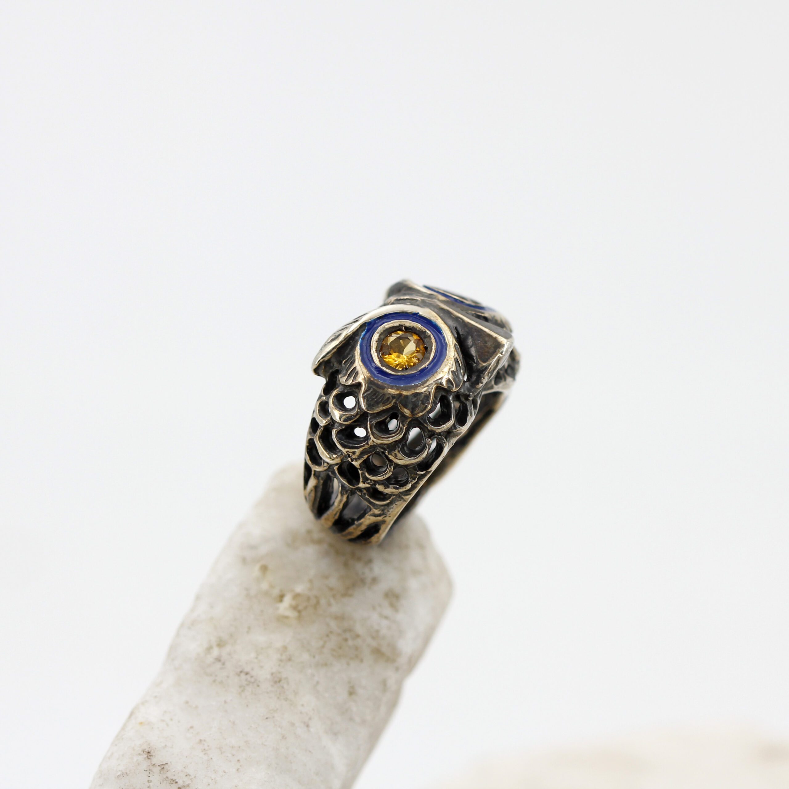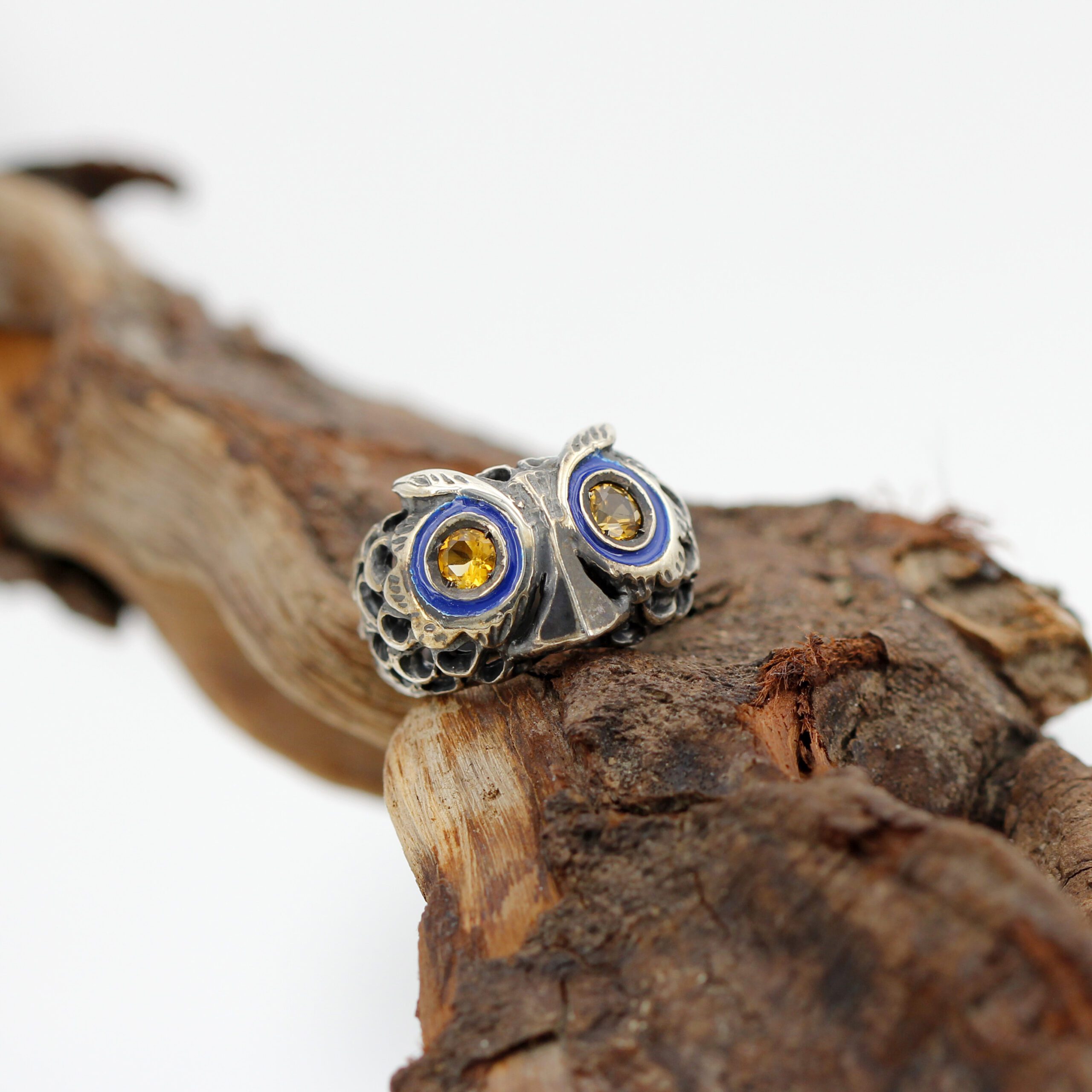 925‰ Sterling Silver Owl Ring, weight 11.00 g, with natural gemstones – Citrine quartz embellishing its eyes; blue enamel detailing.