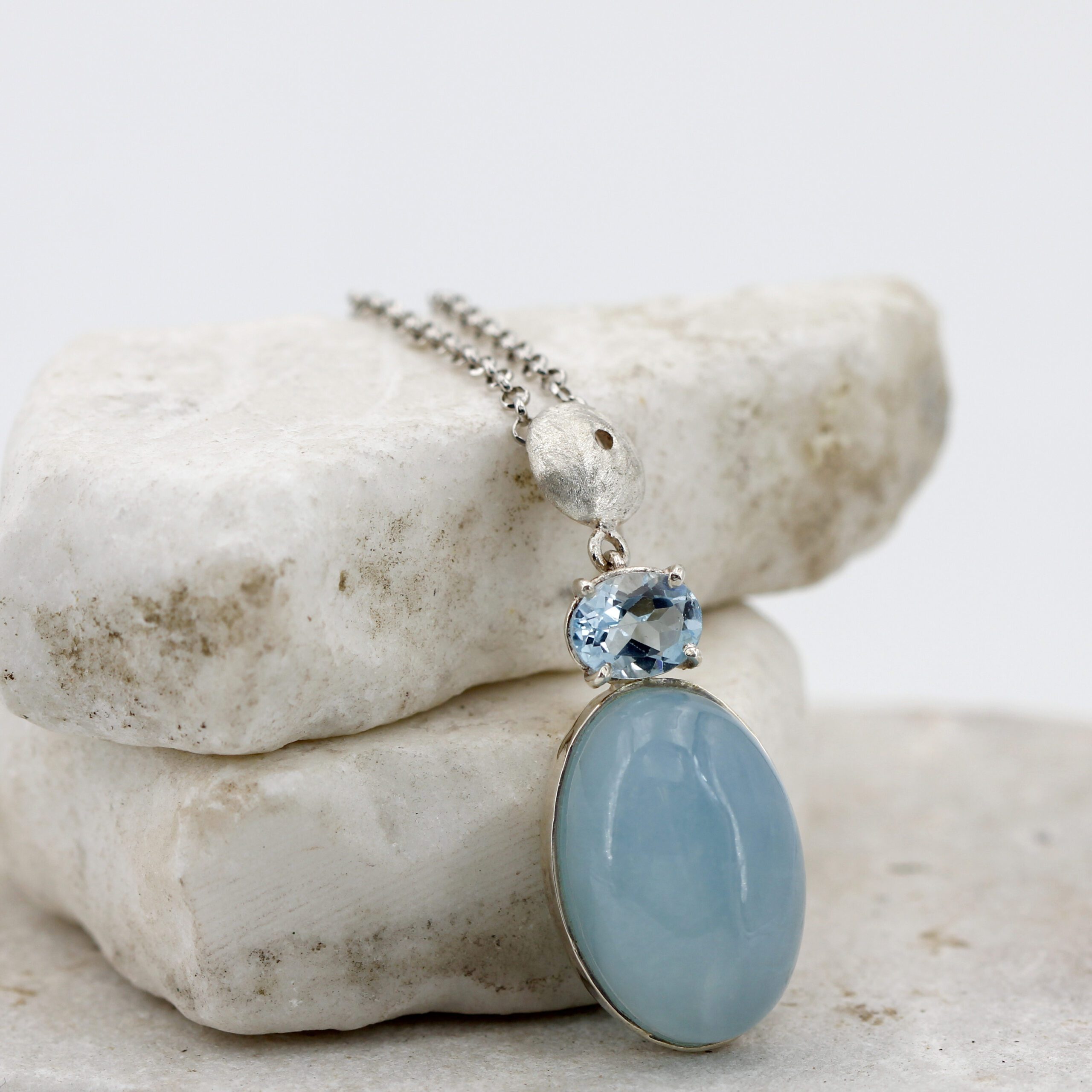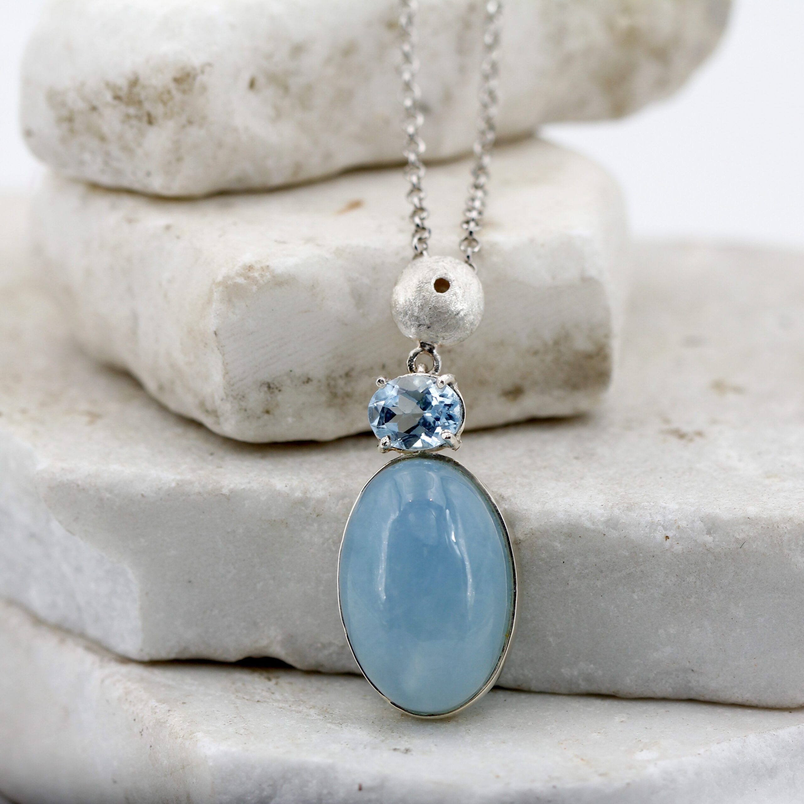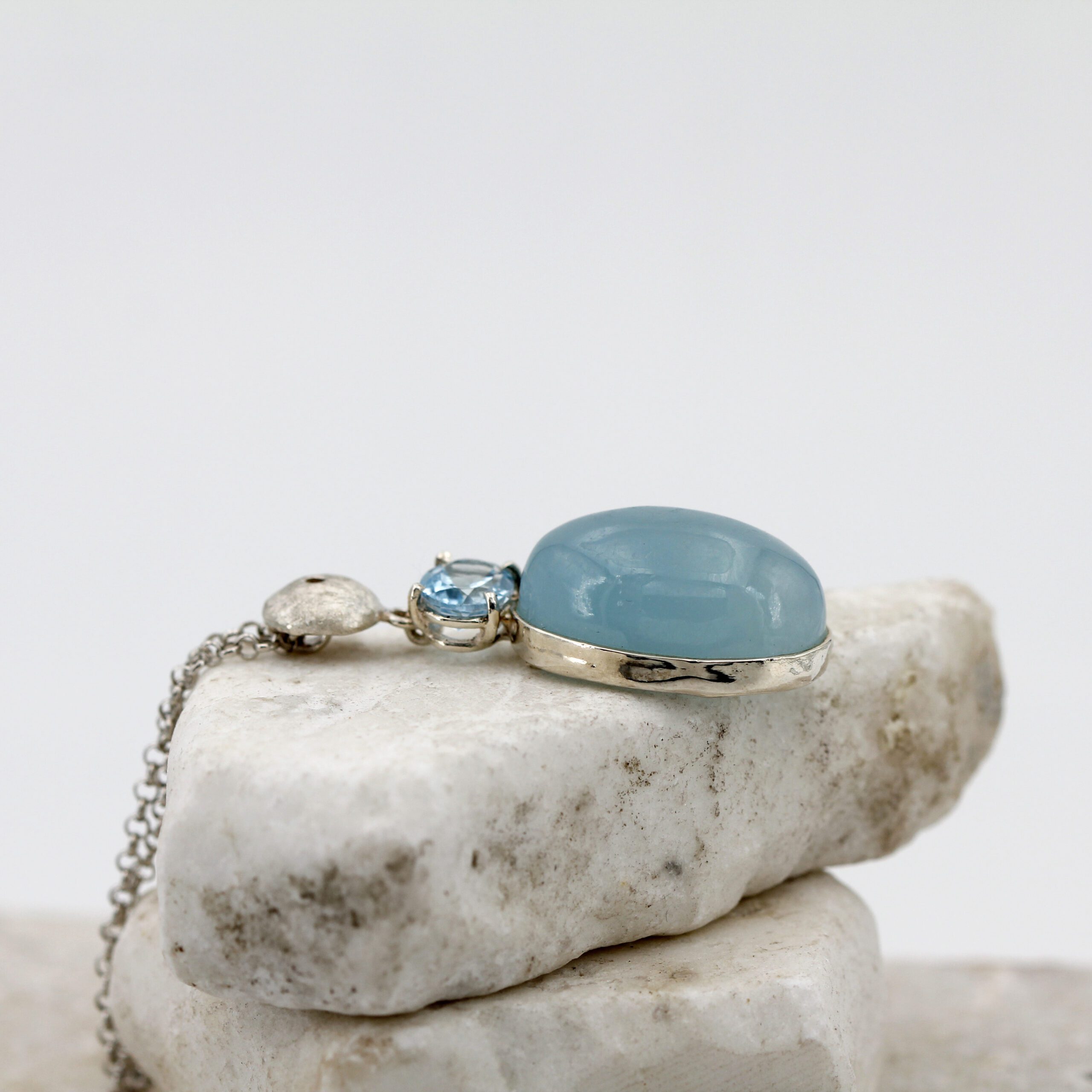 Silver pendant adorned with a delicate milk aquamarine and a blue topaz.