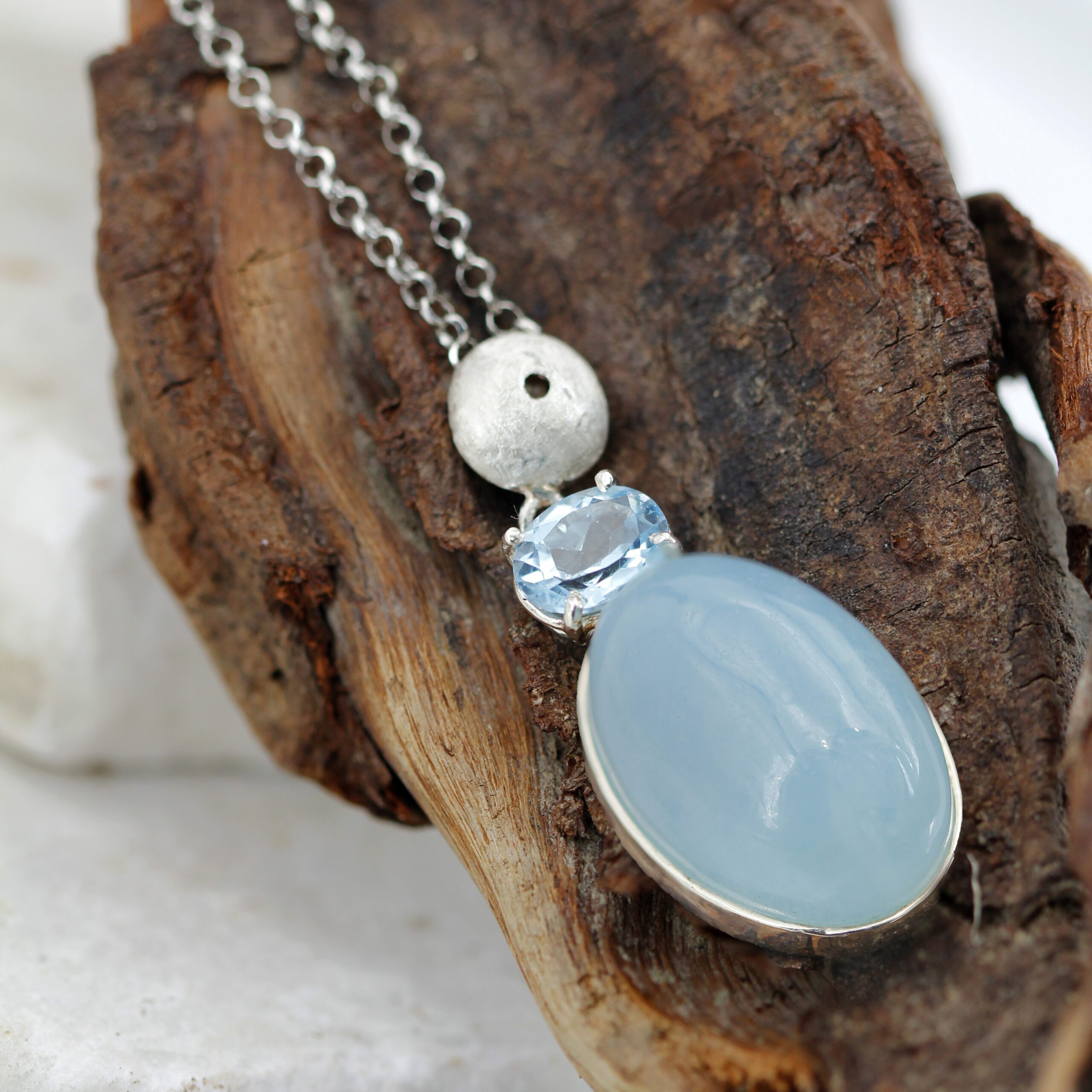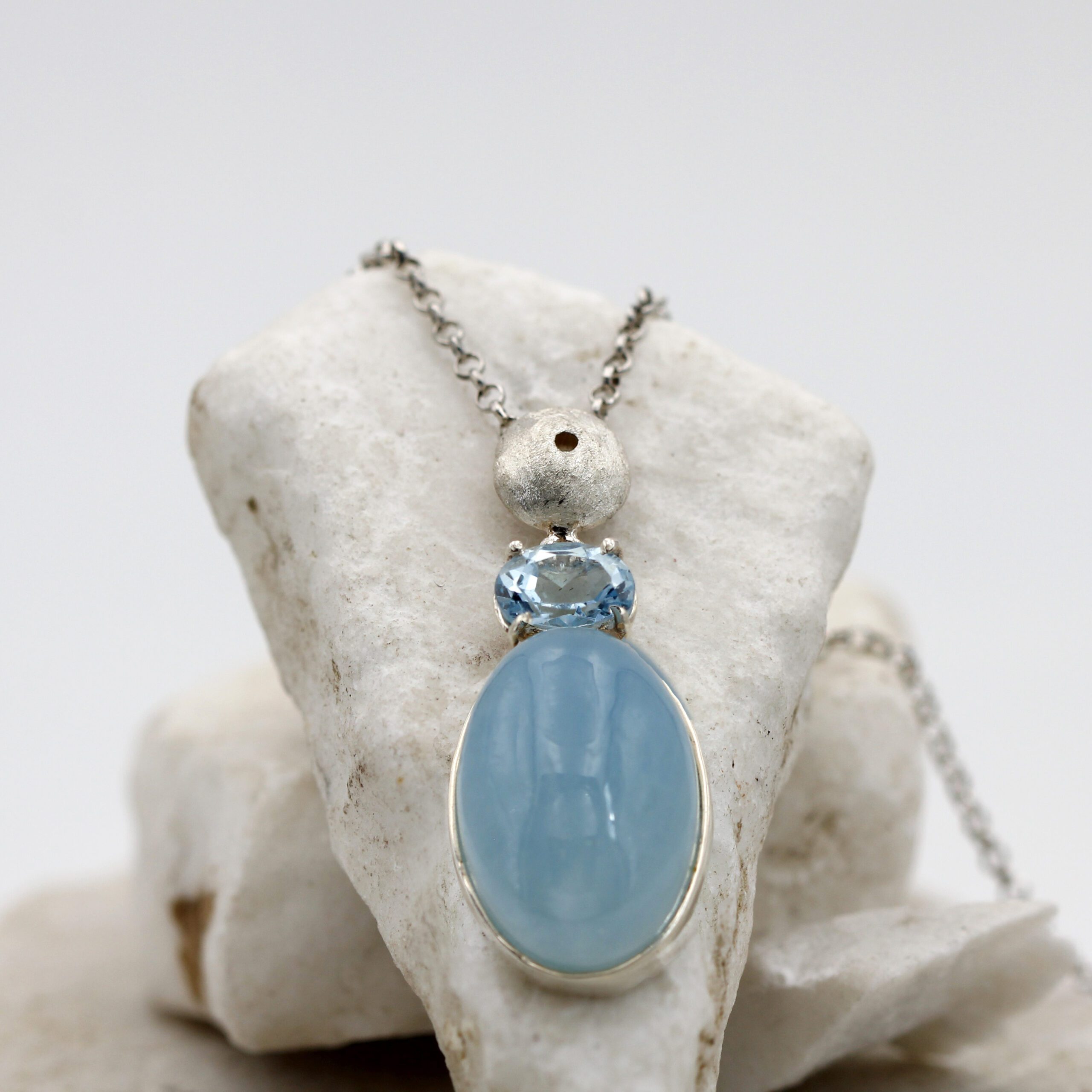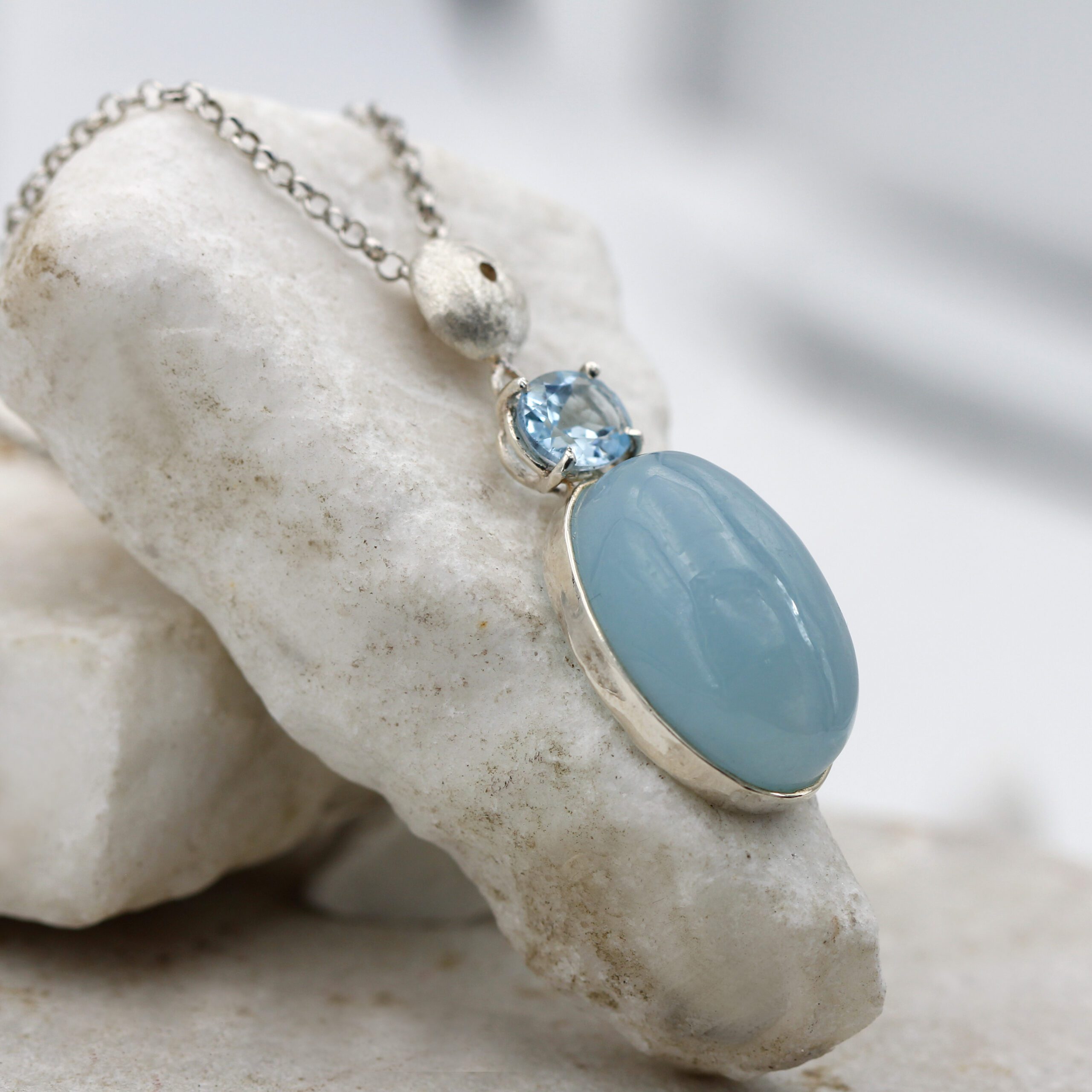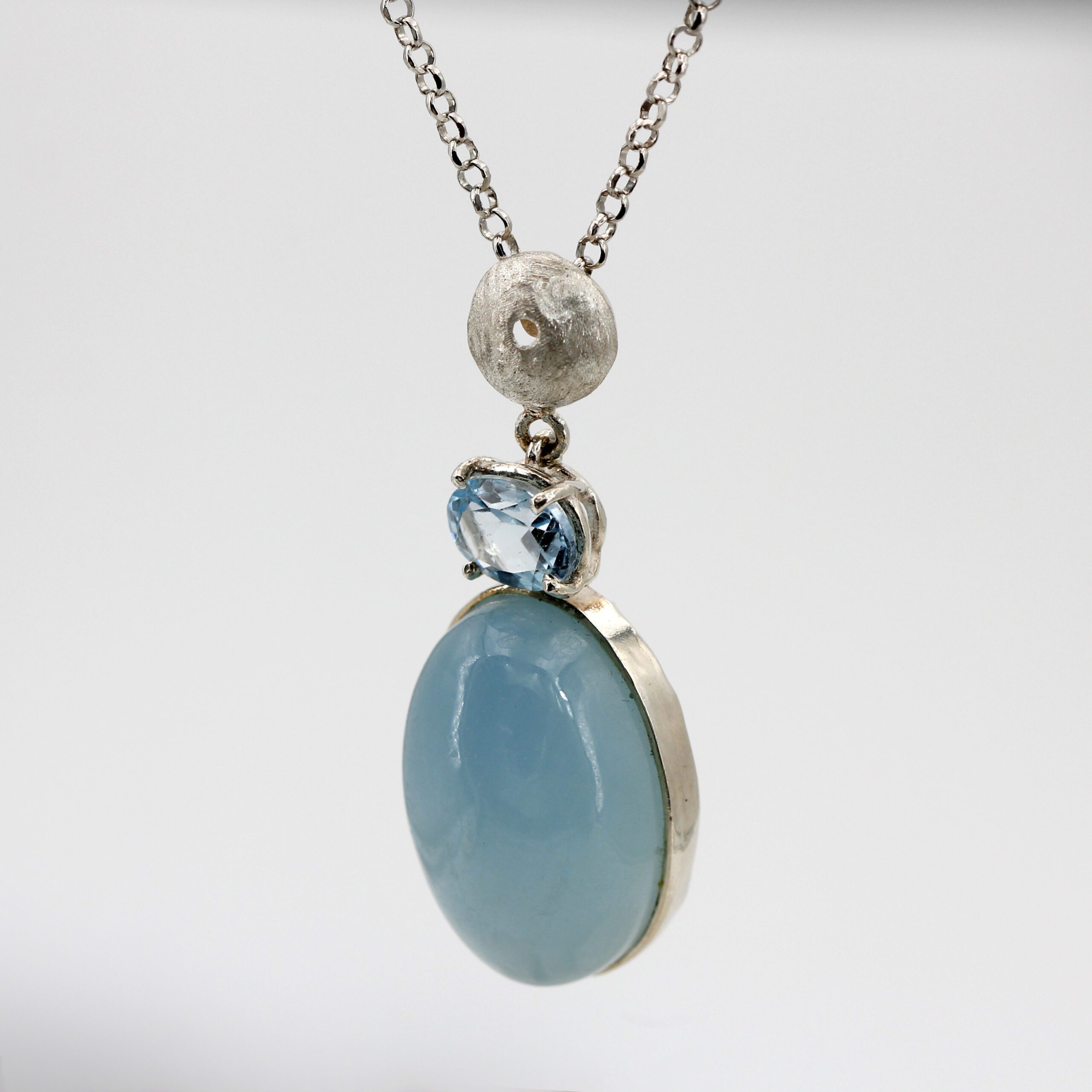 Silver pendant adorned with a delicate milk aquamarine and a blue topaz.