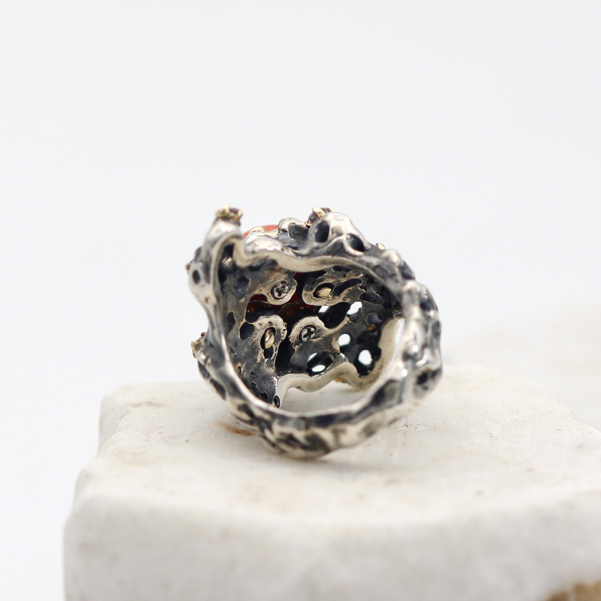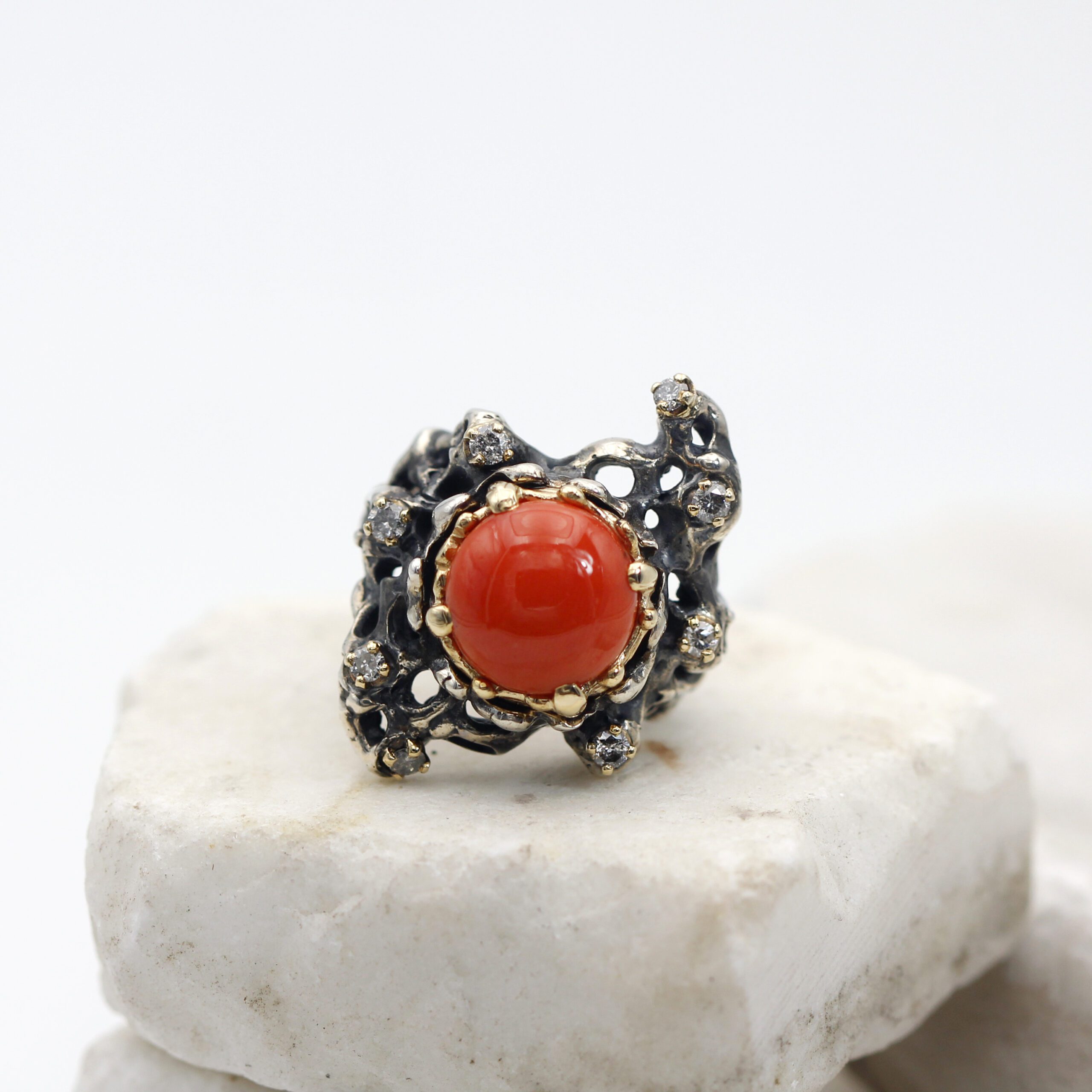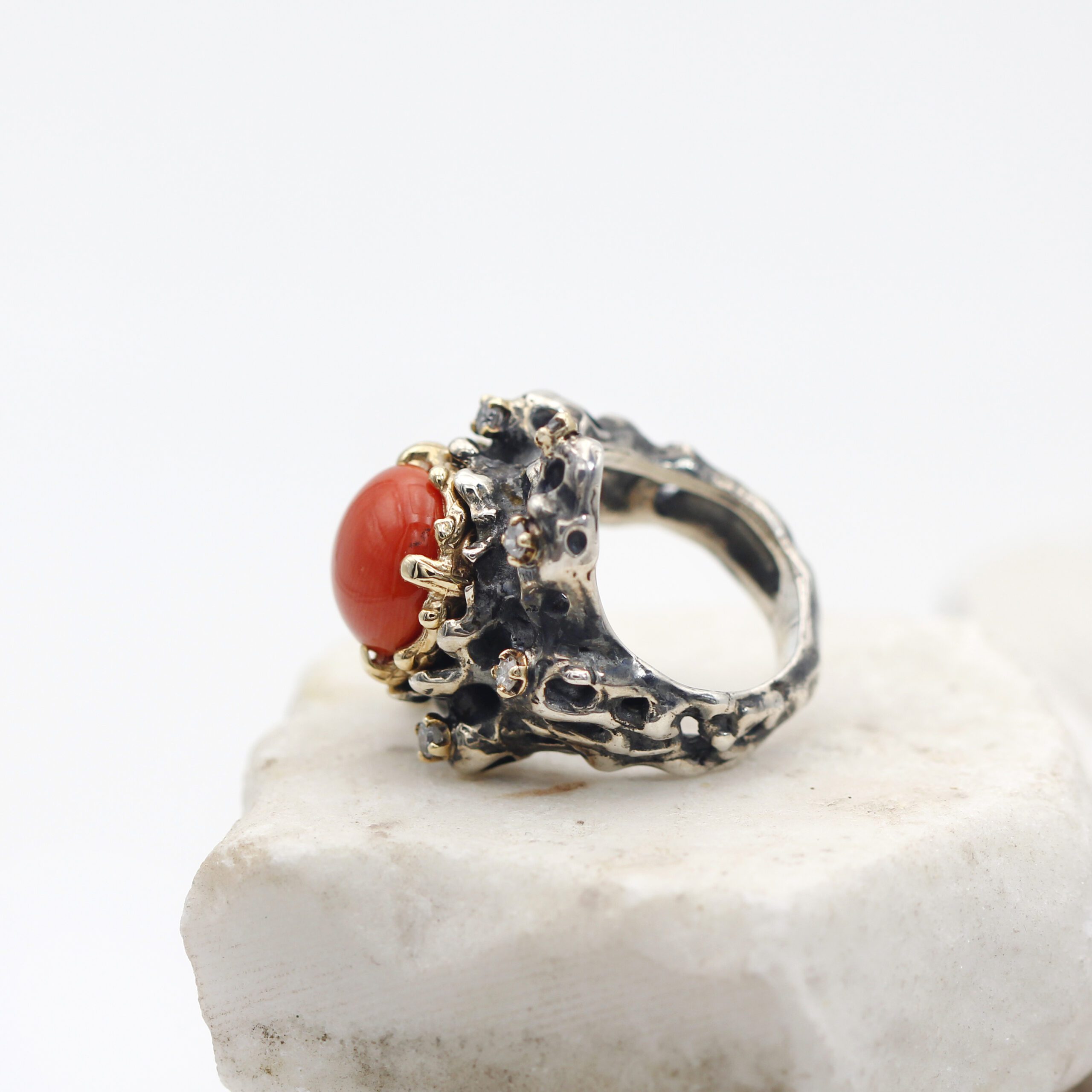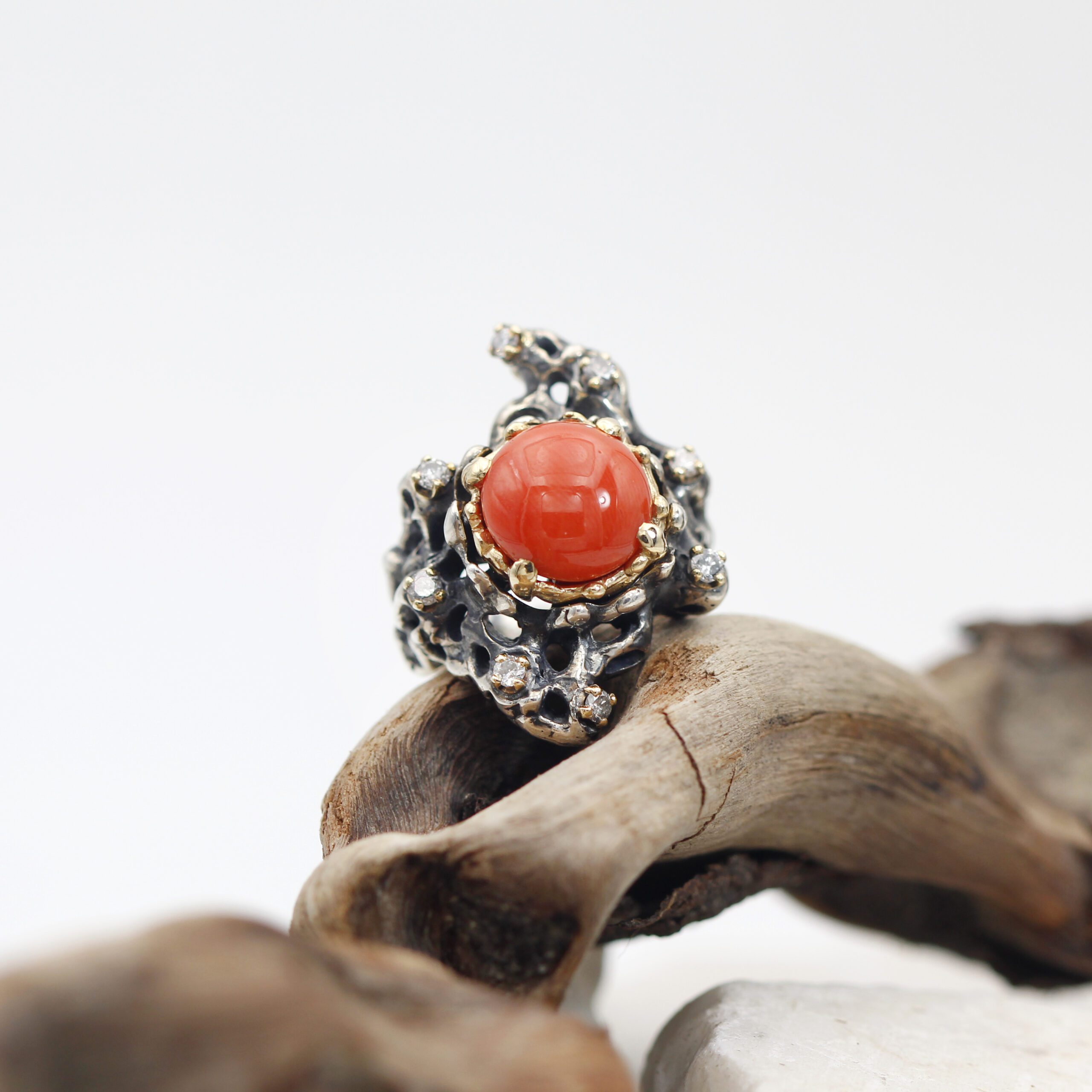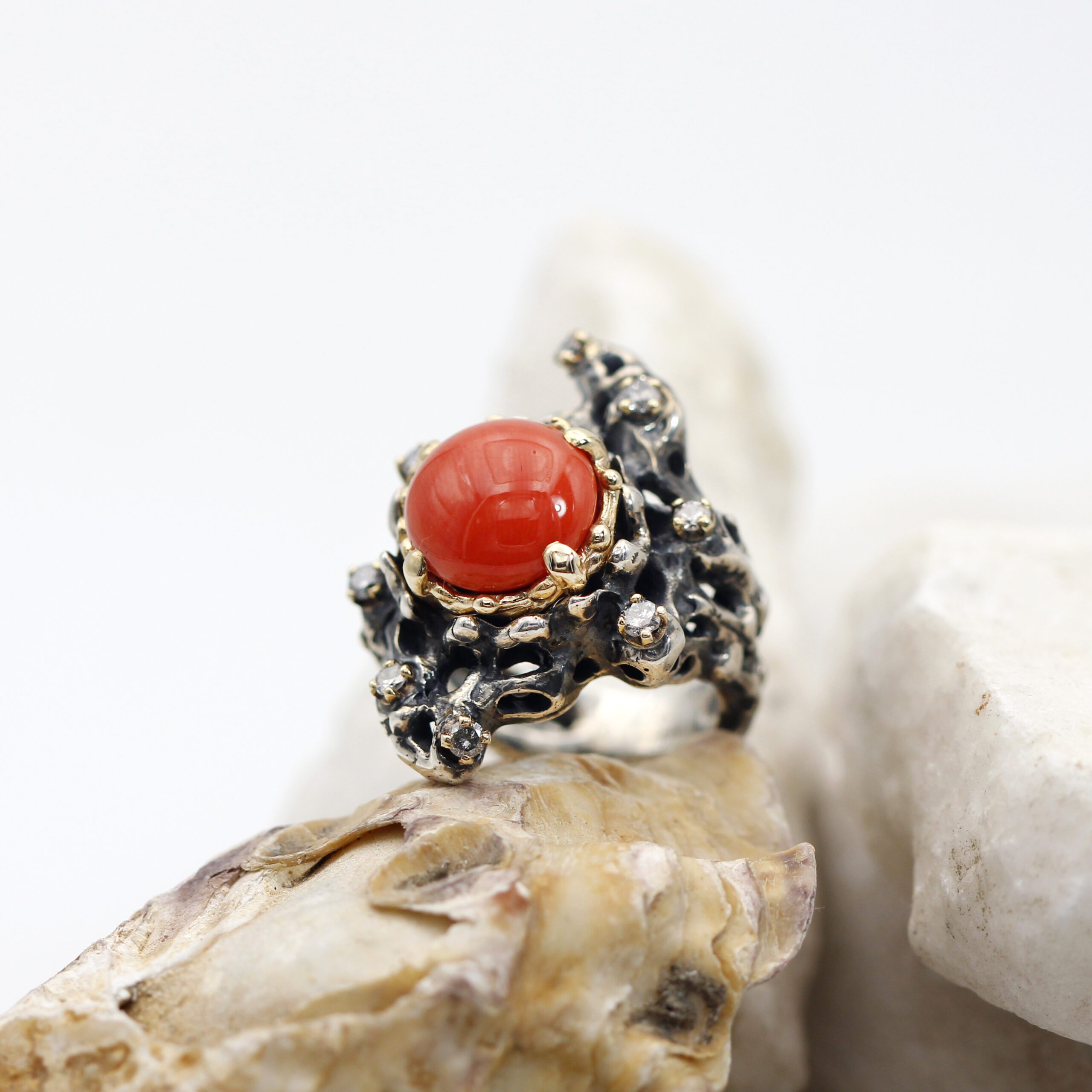 Silver Ring with Removable Gold Bezel, featuring Coral and 8 Grey Diamonds