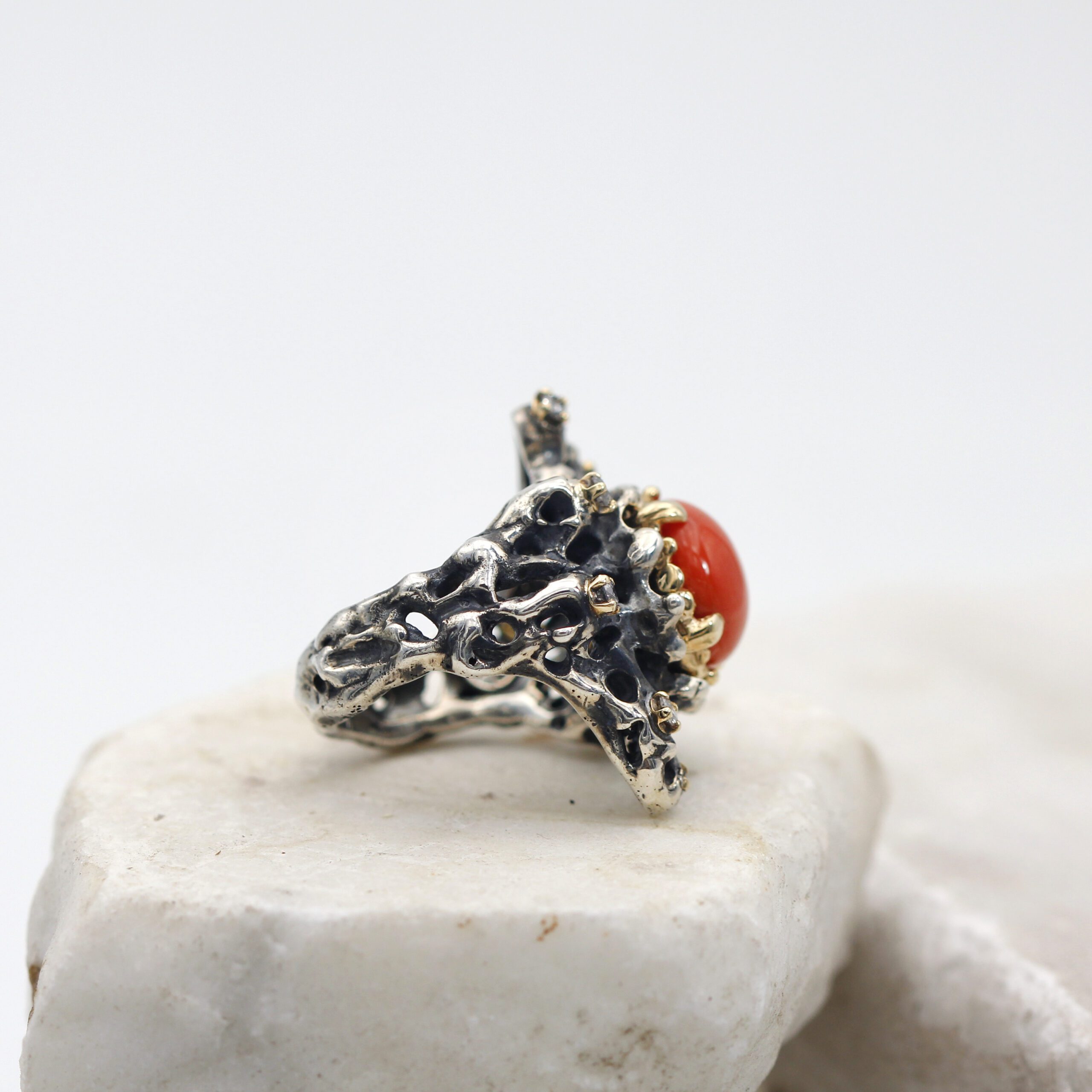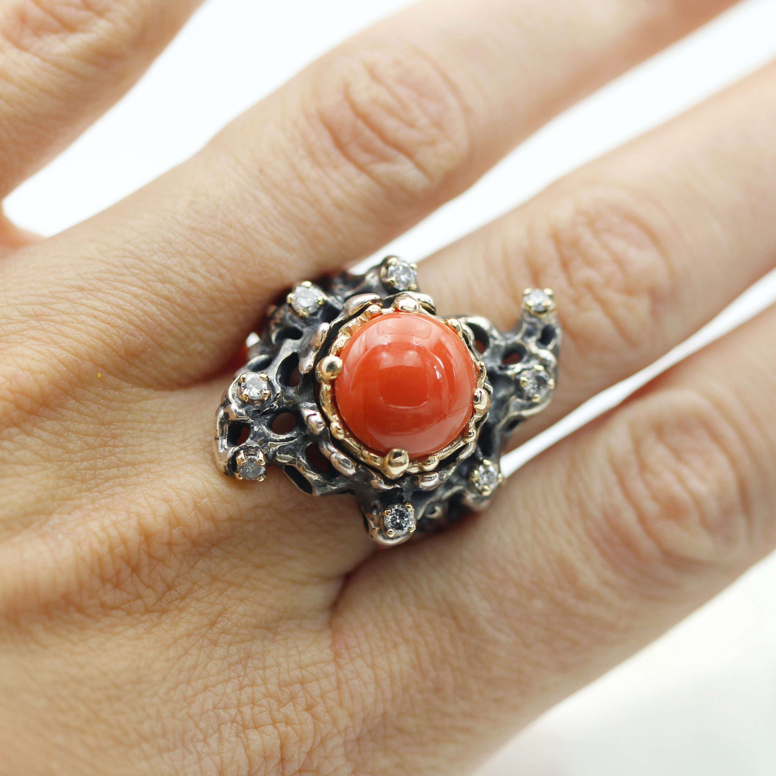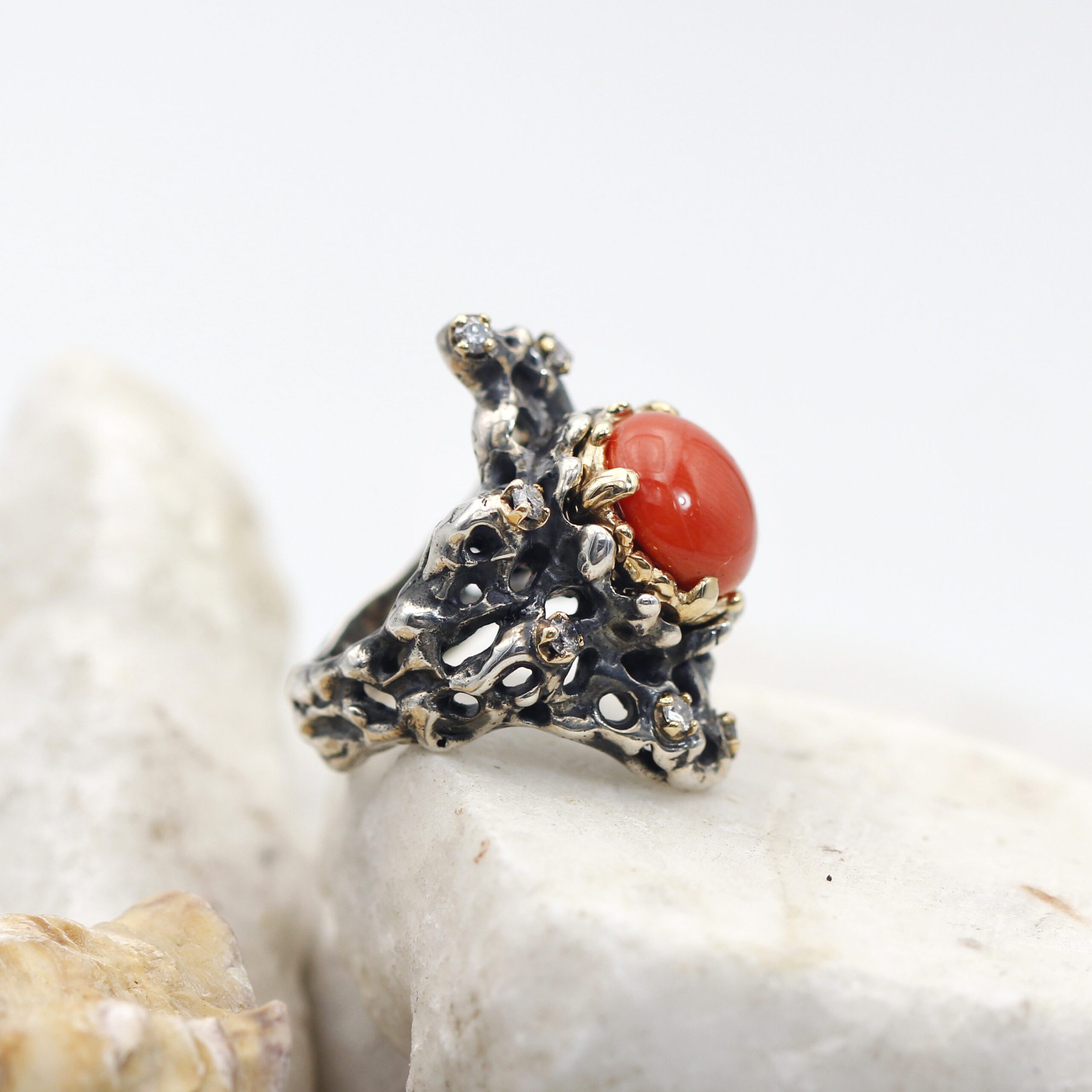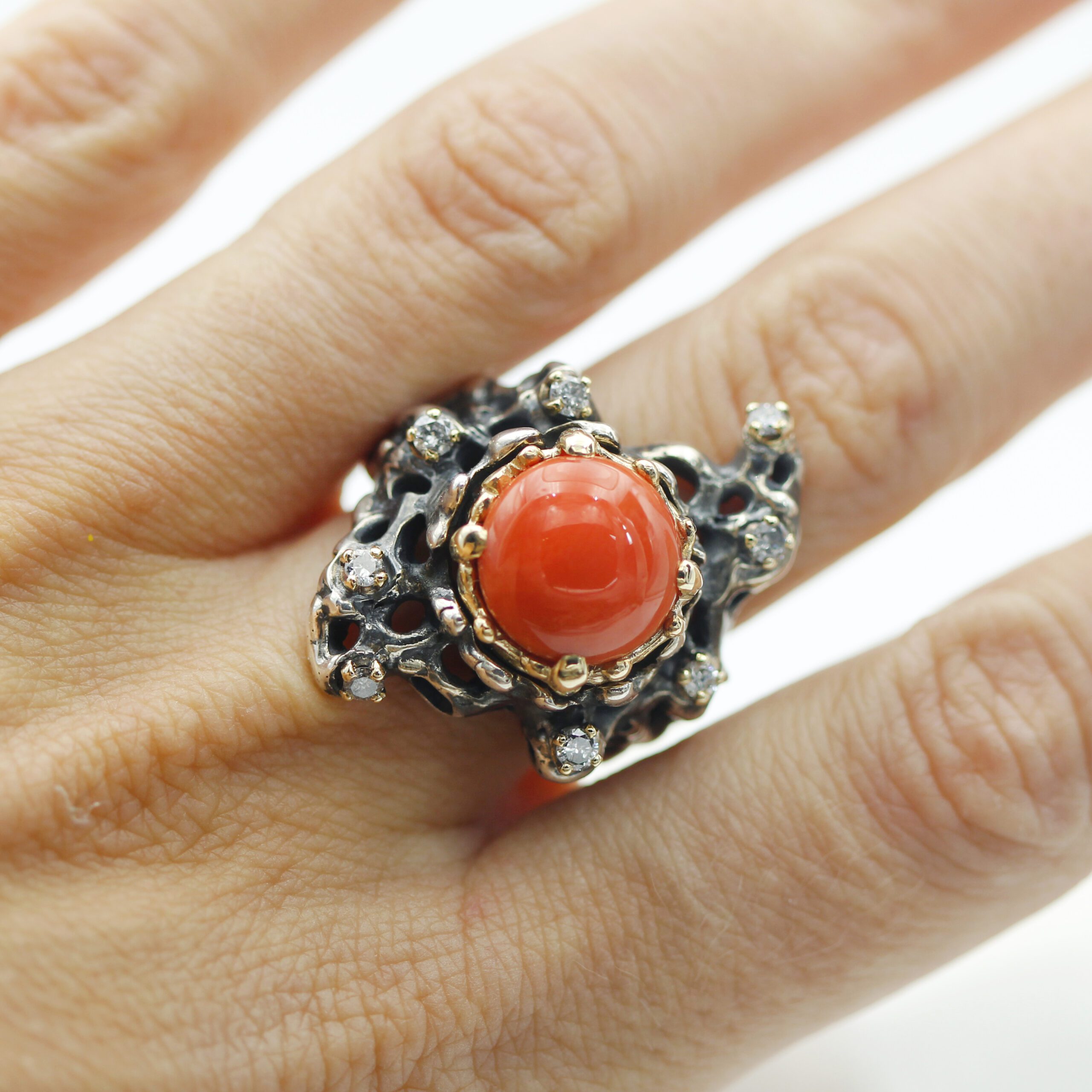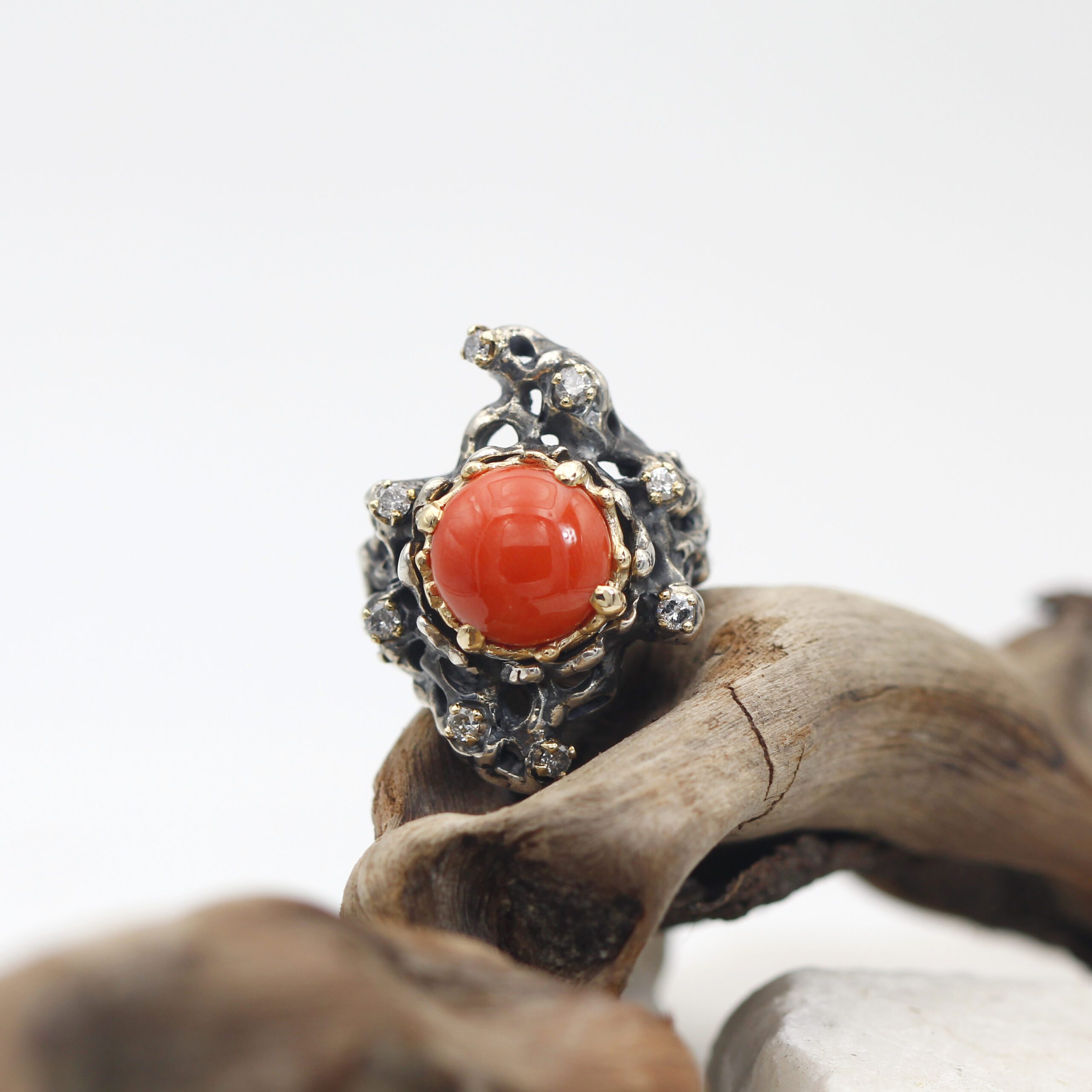 Silver Ring with Removable Gold Bezel, featuring Coral and 8 Grey Diamonds