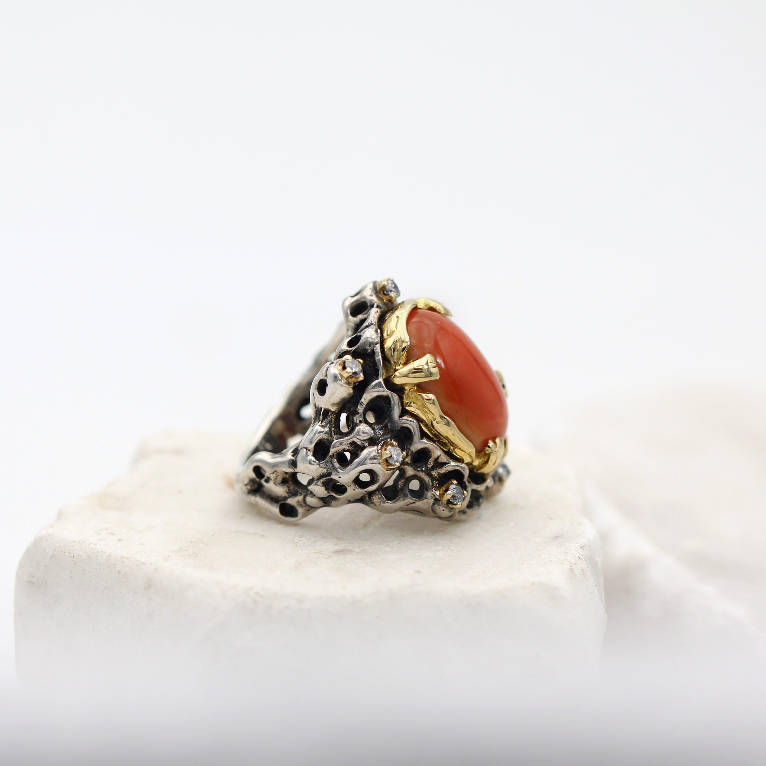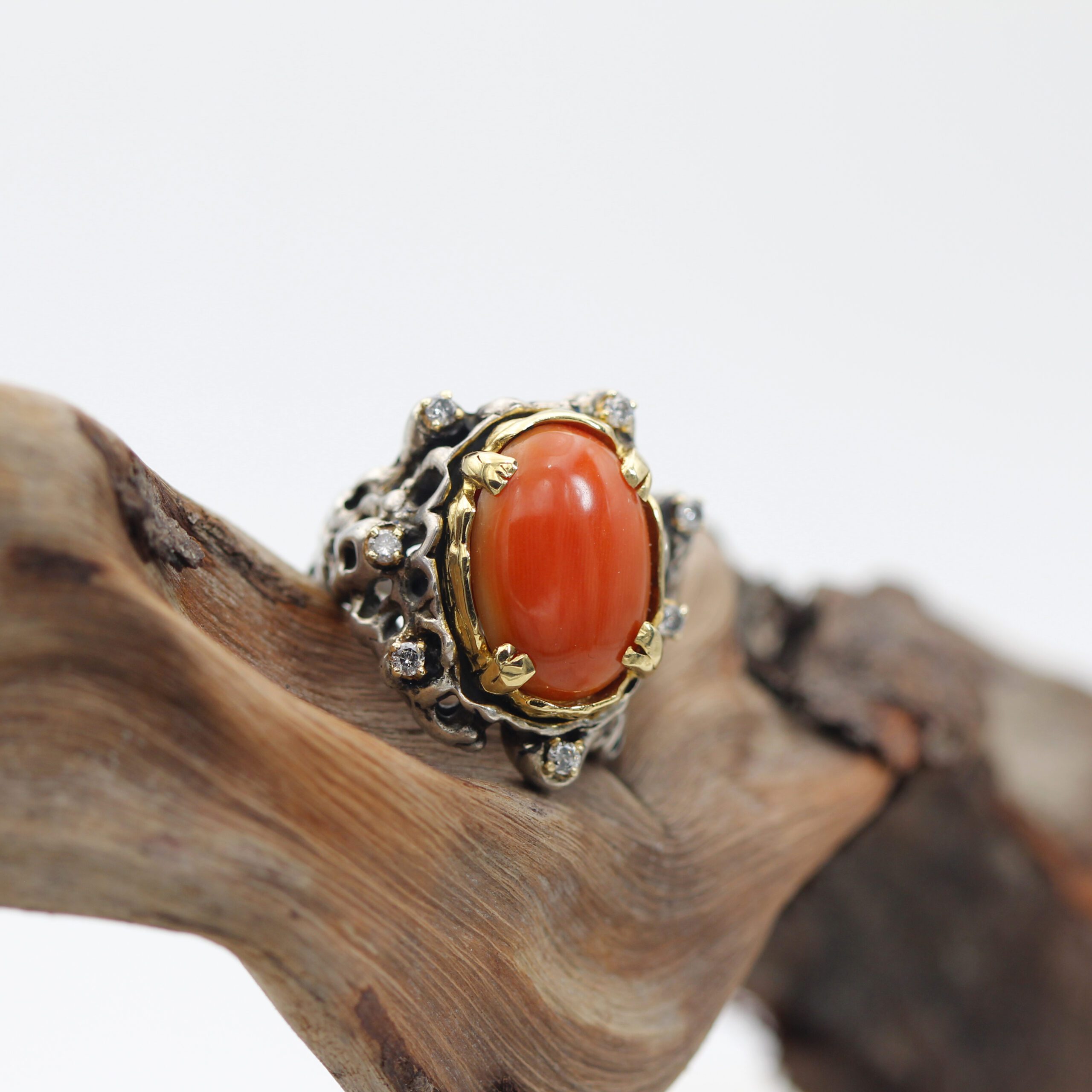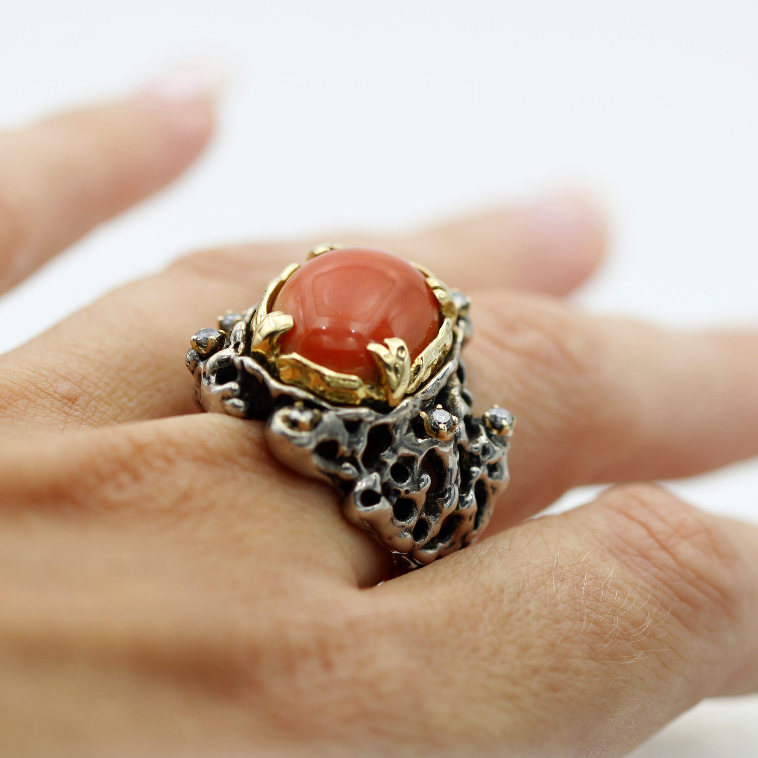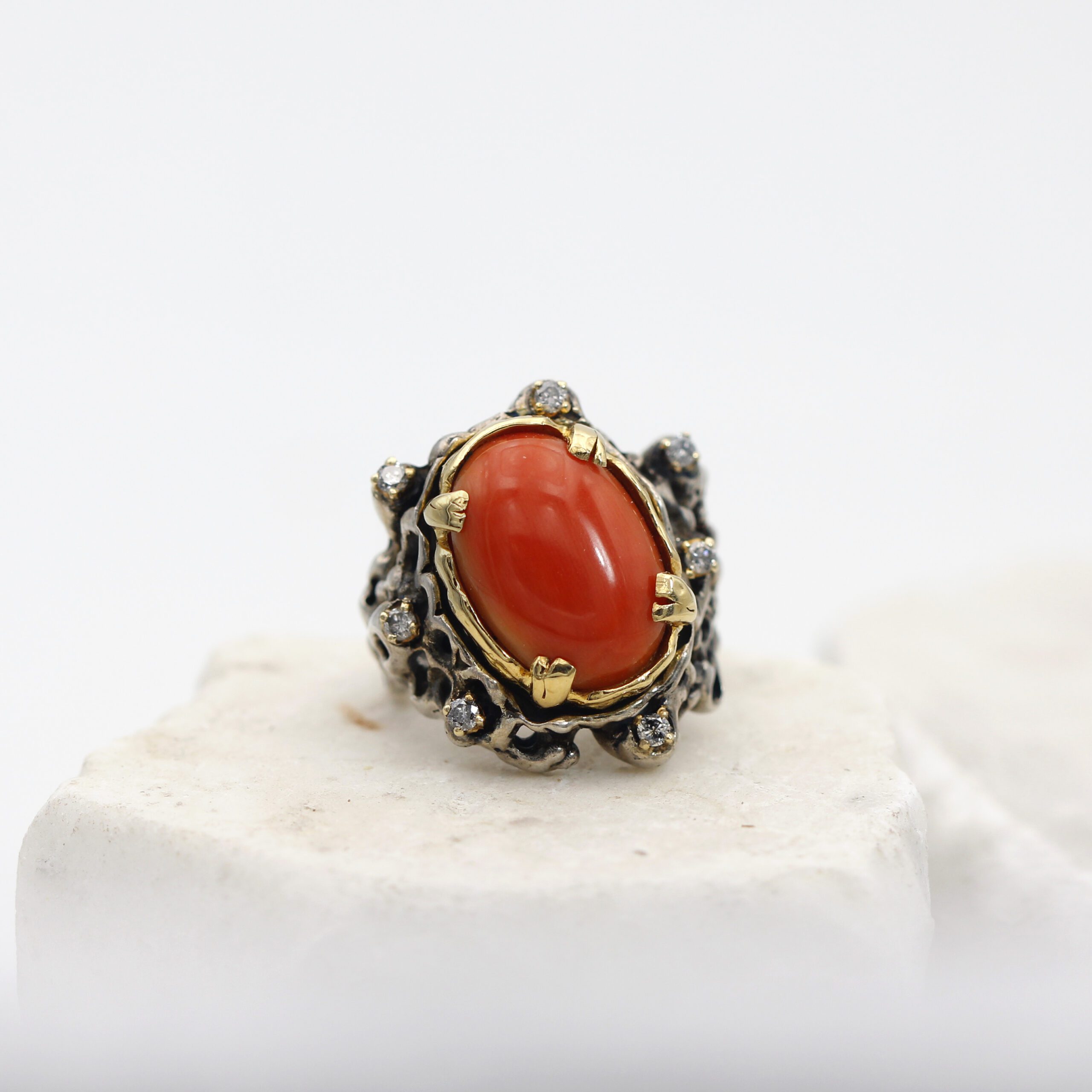 Silver Ring with Removable Gold Bezel, featuring Coral and 7 Grey Diamonds.
