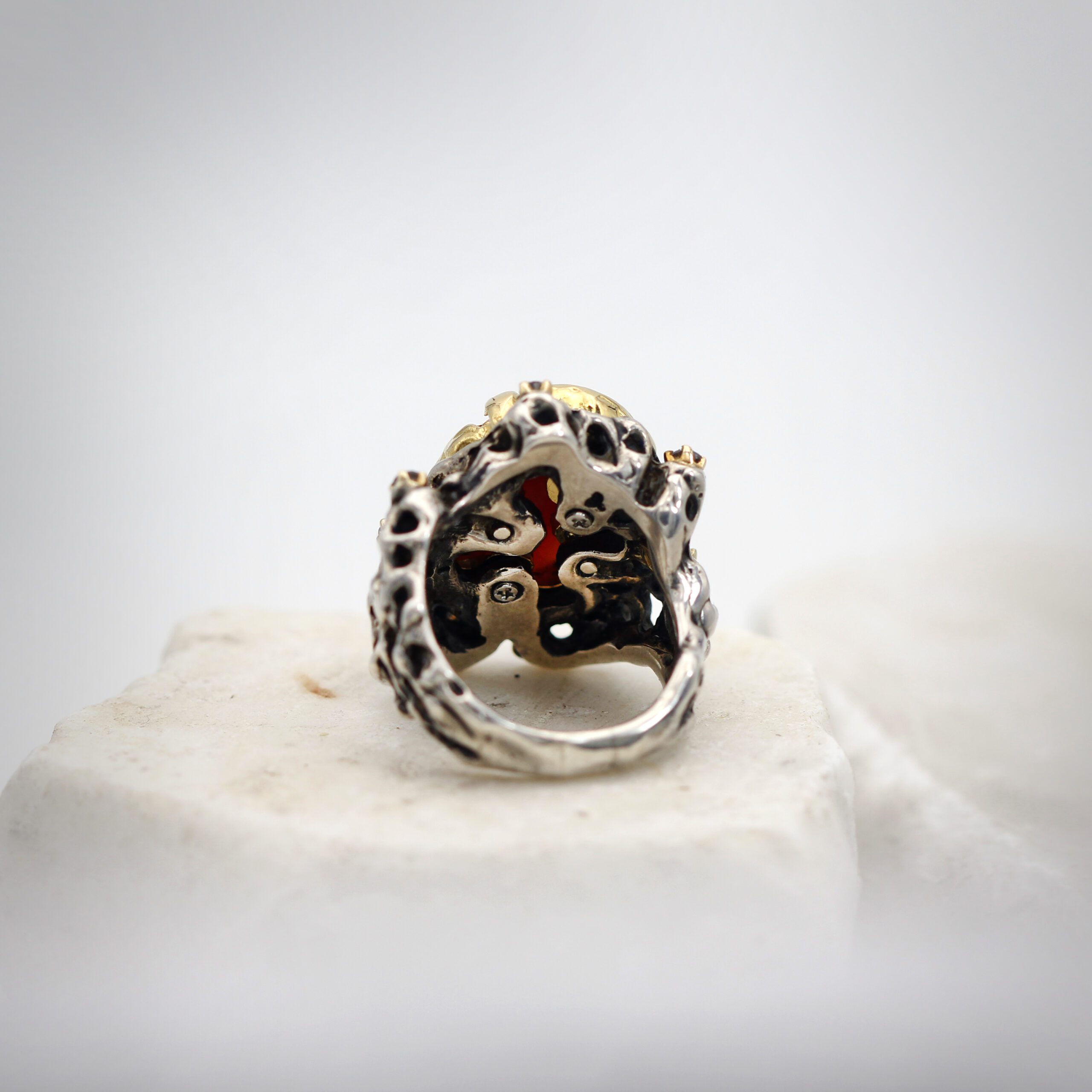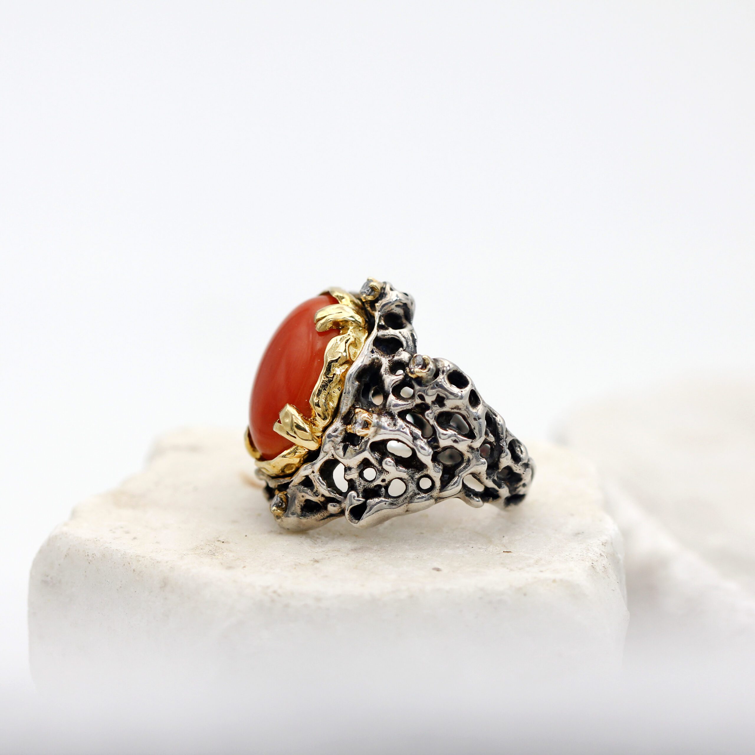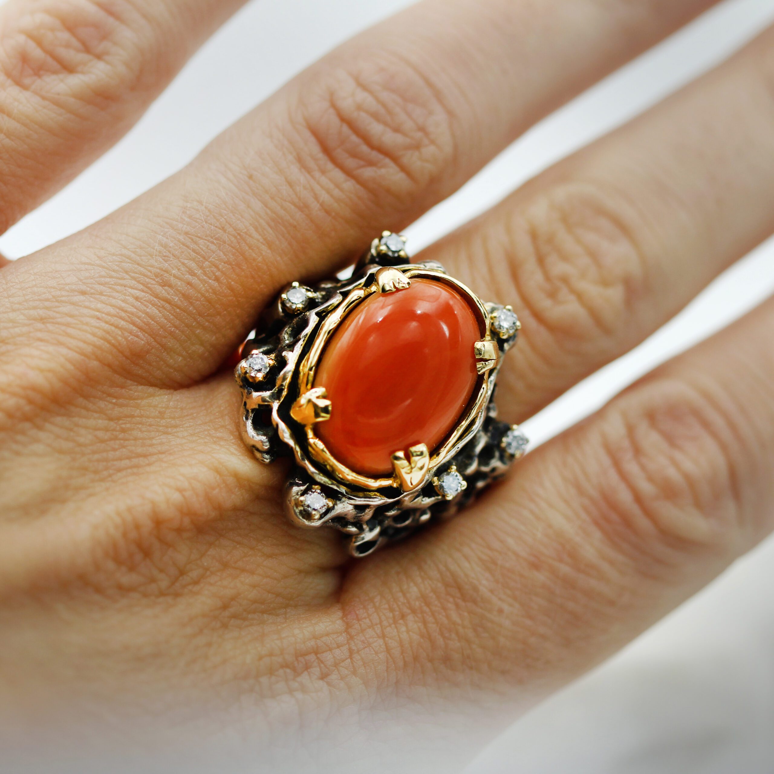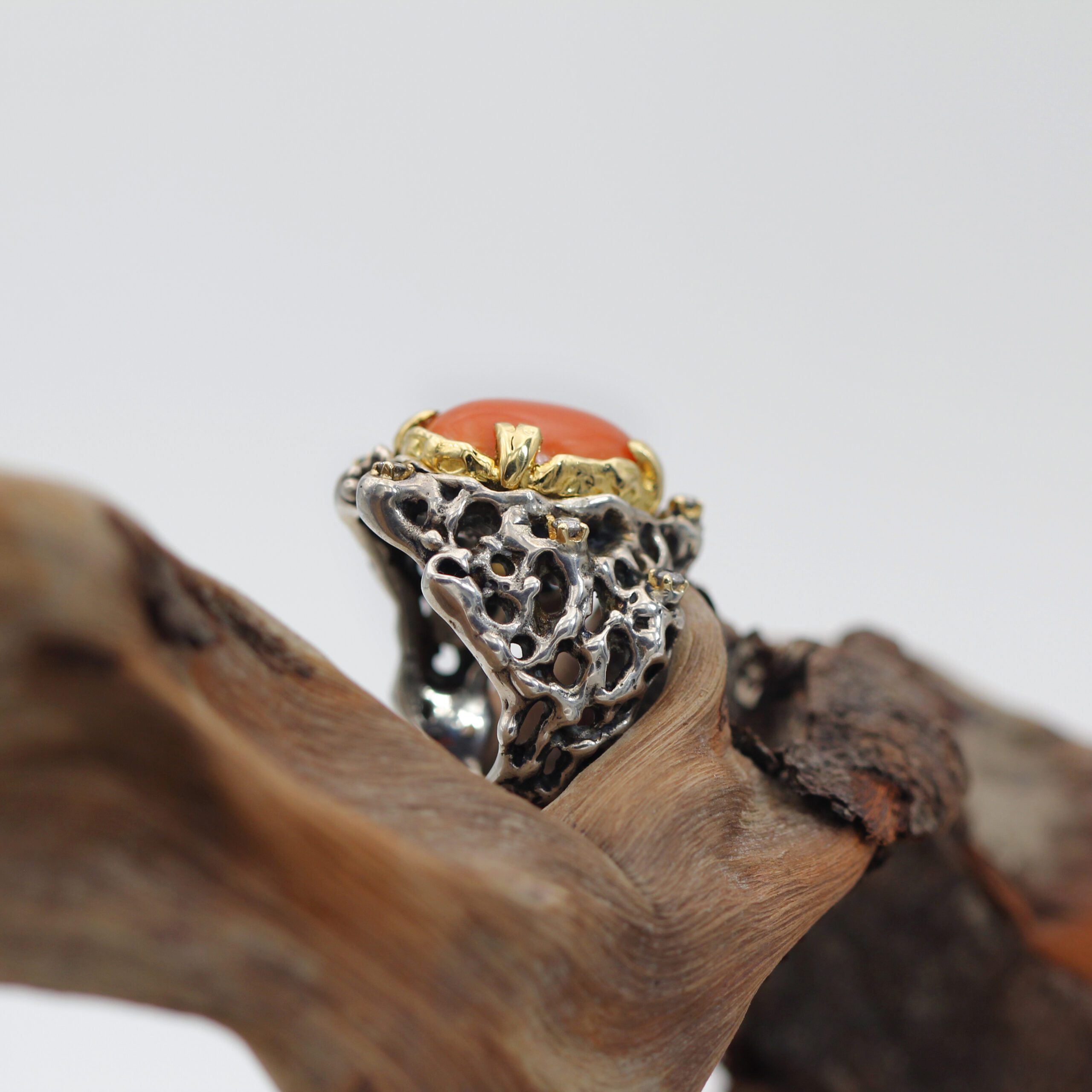 Silver Ring with Removable Gold Bezel, featuring Coral and 7 Grey Diamonds.