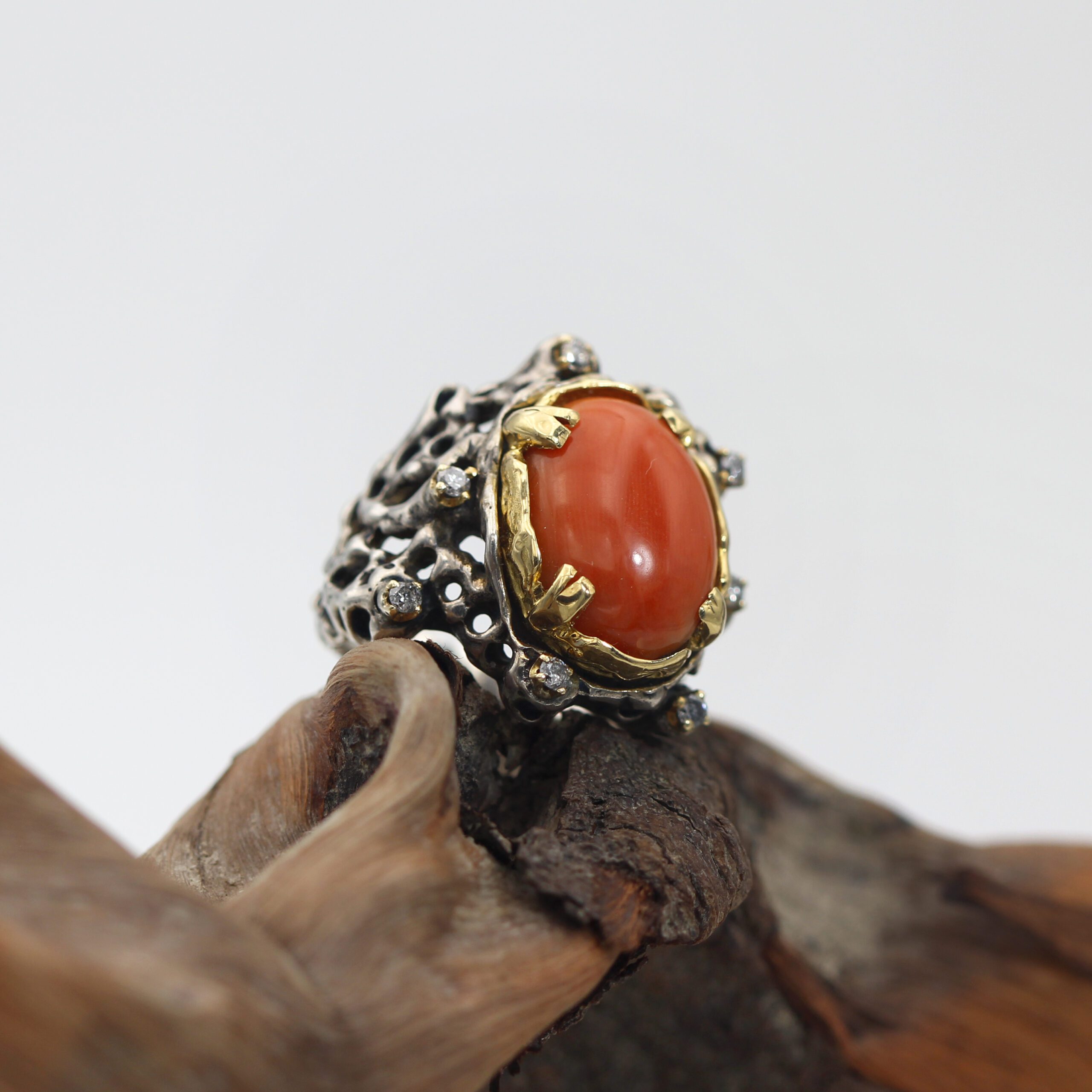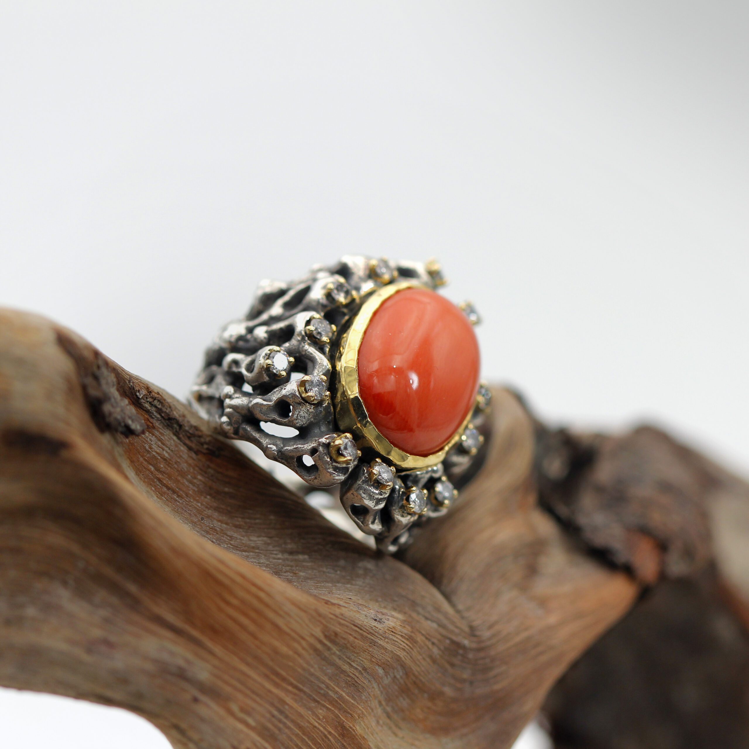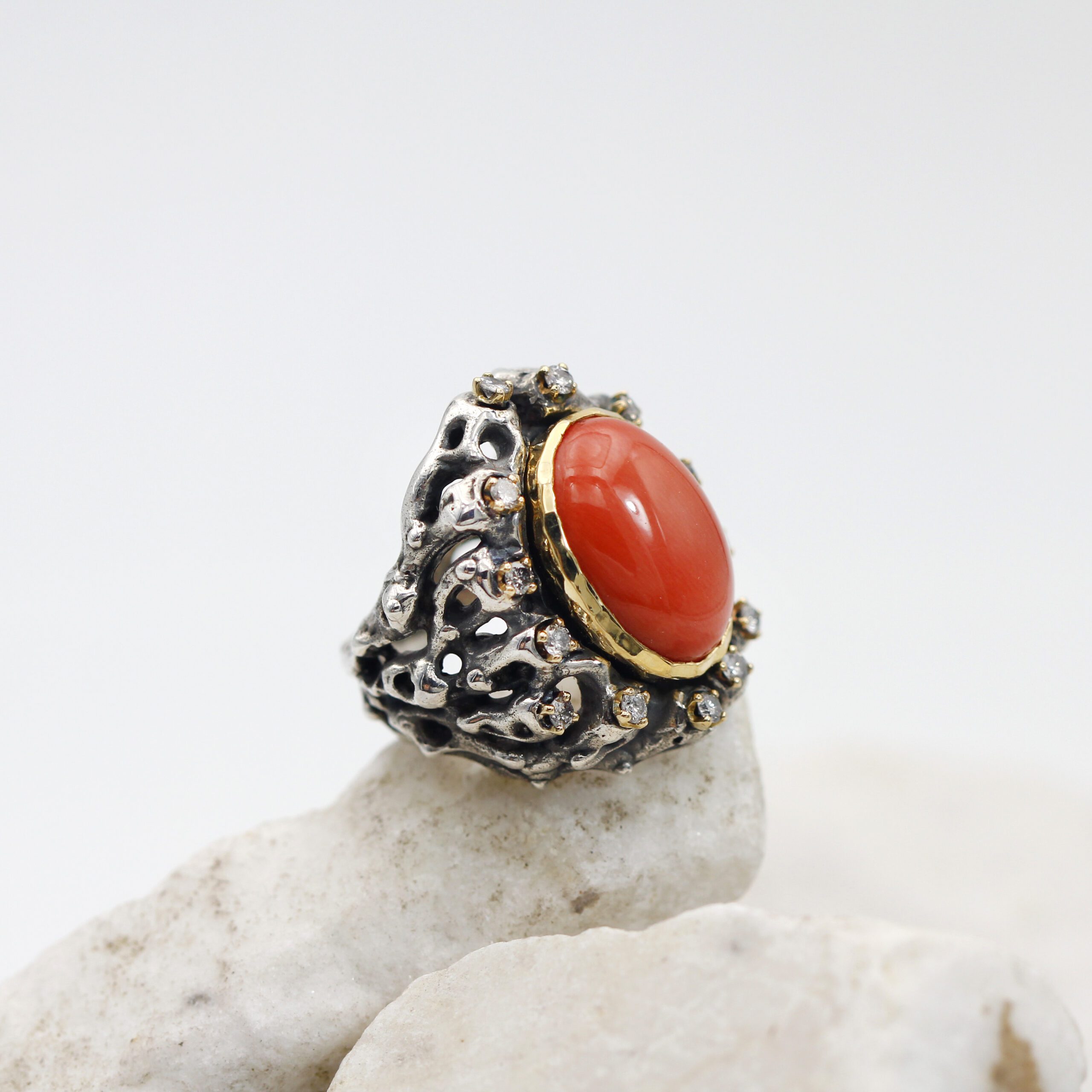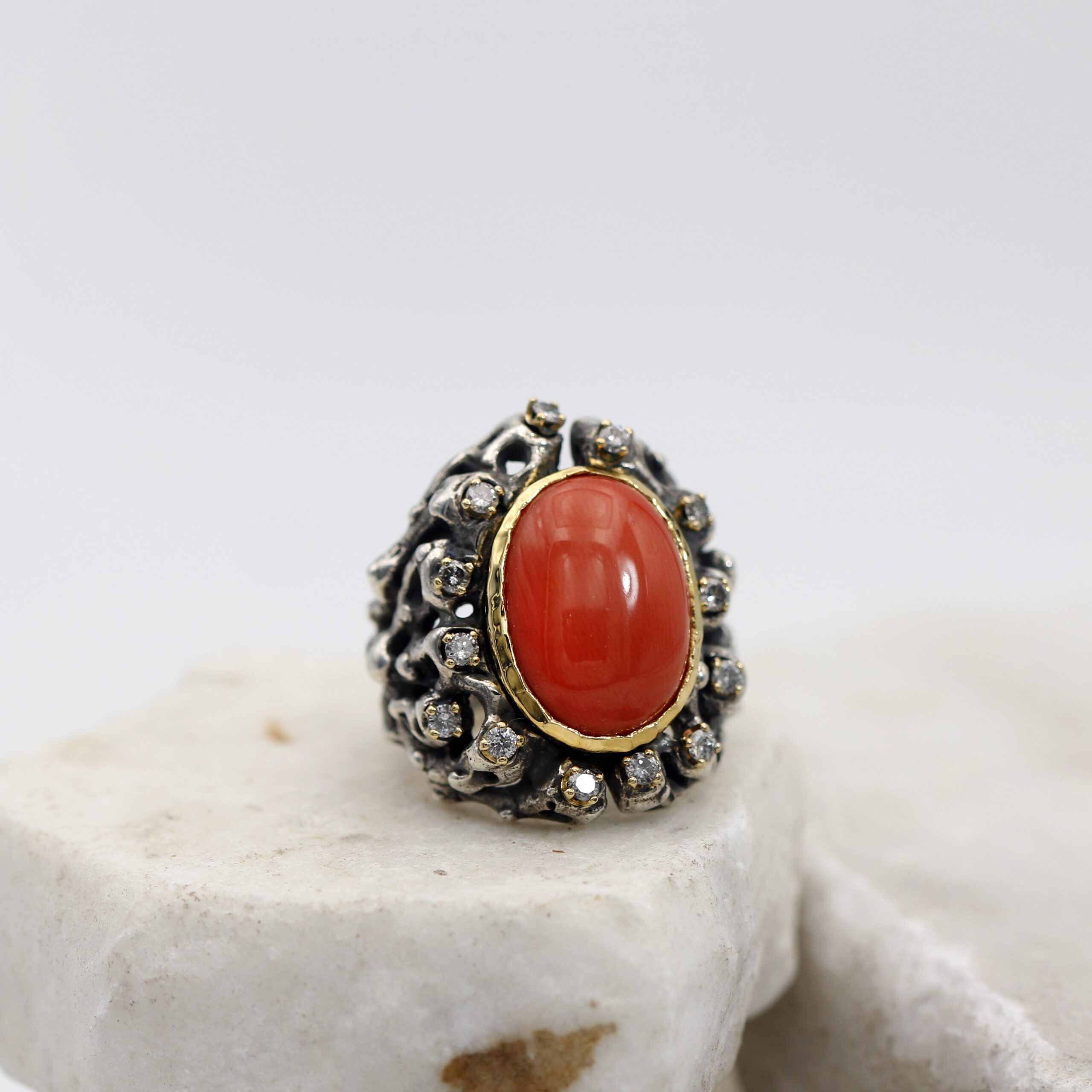 Silver Ring with Removable Gold Setting, Coral, and 13 Grey Diamonds