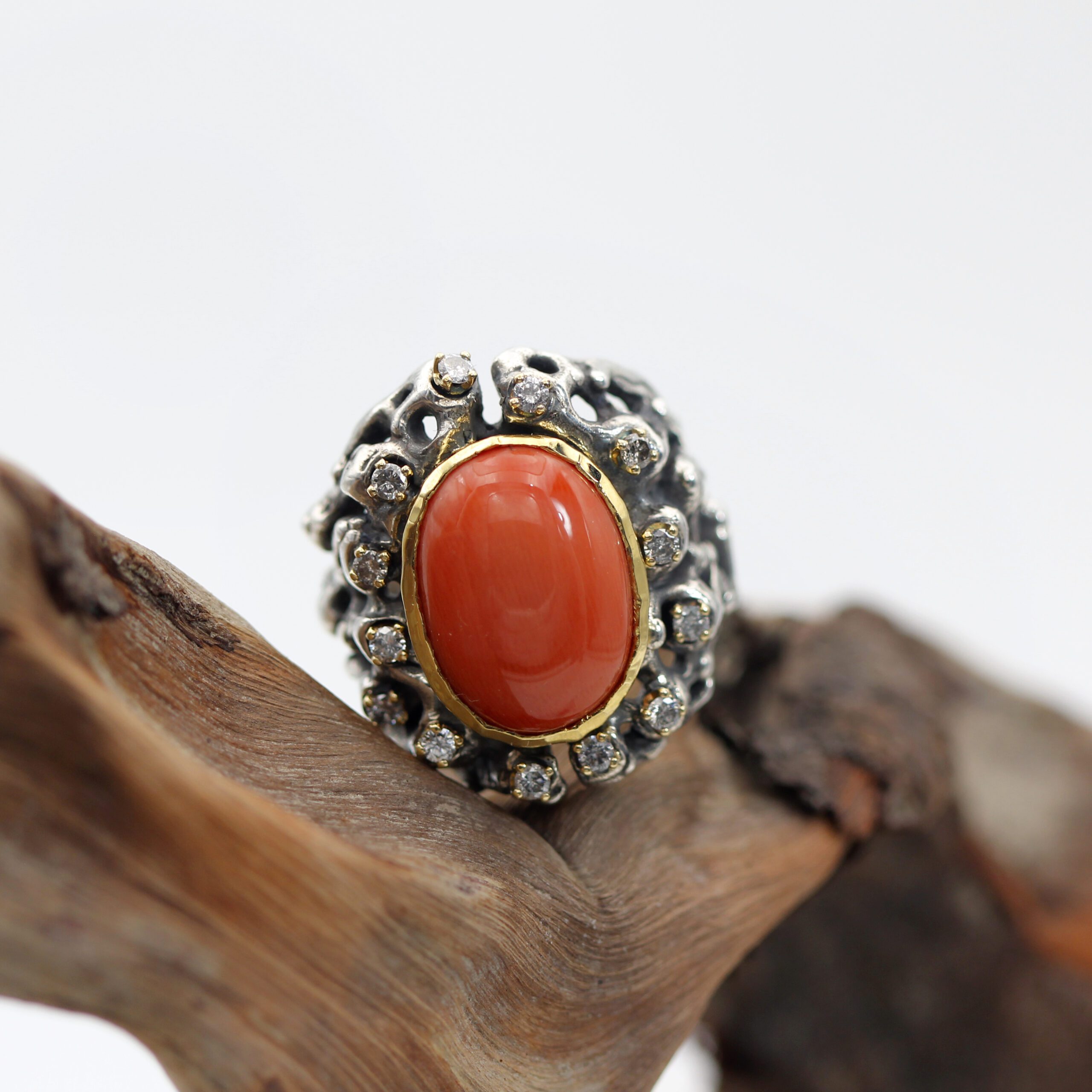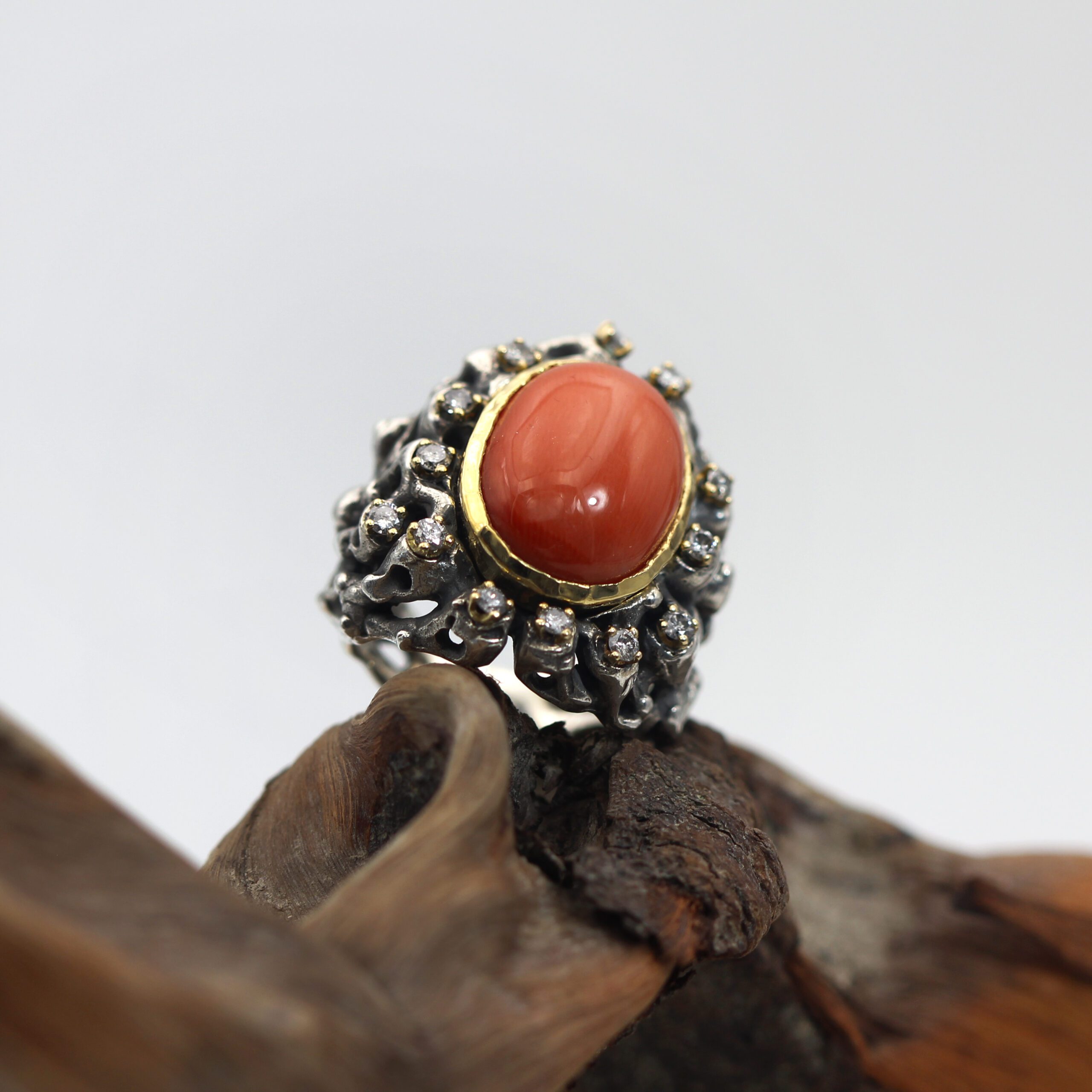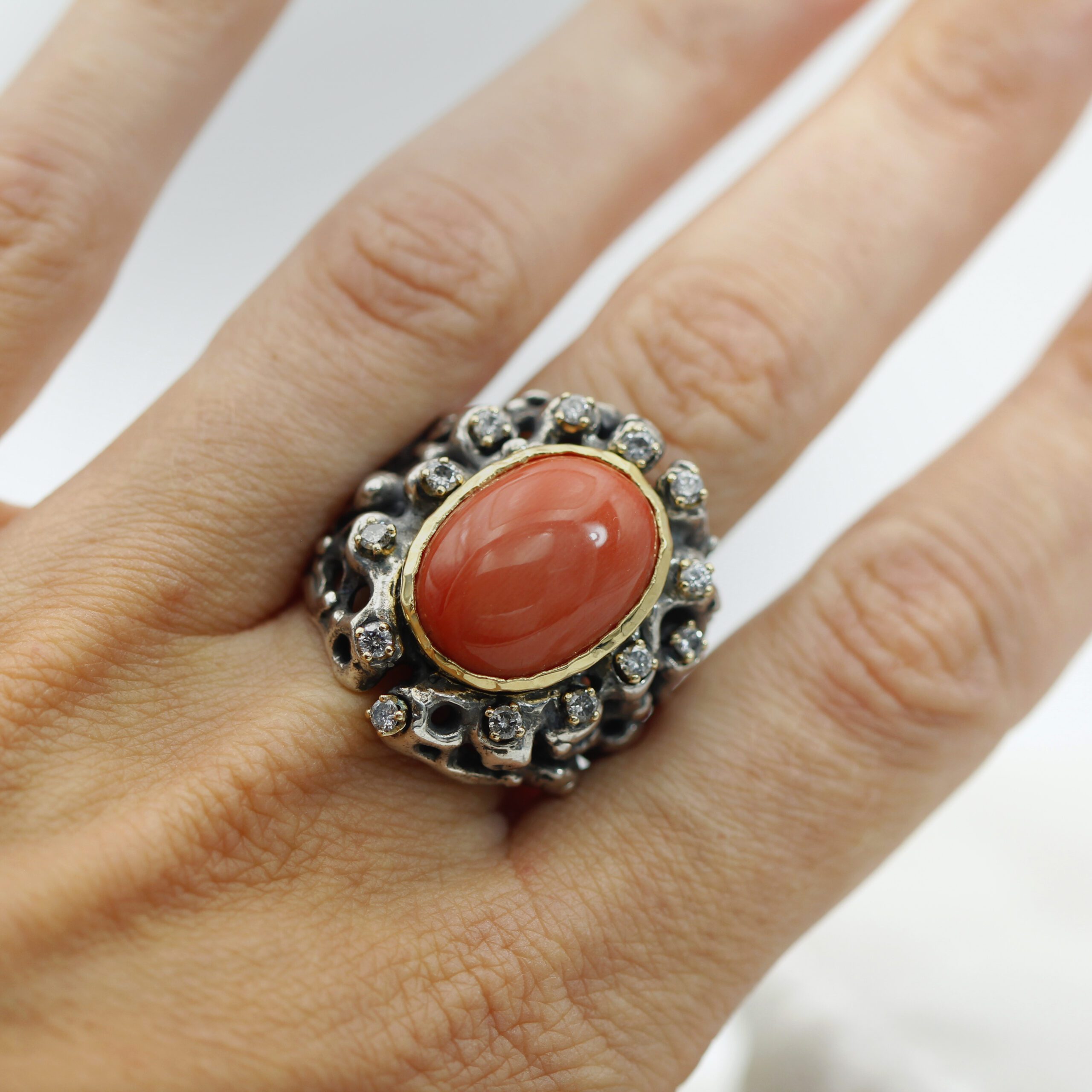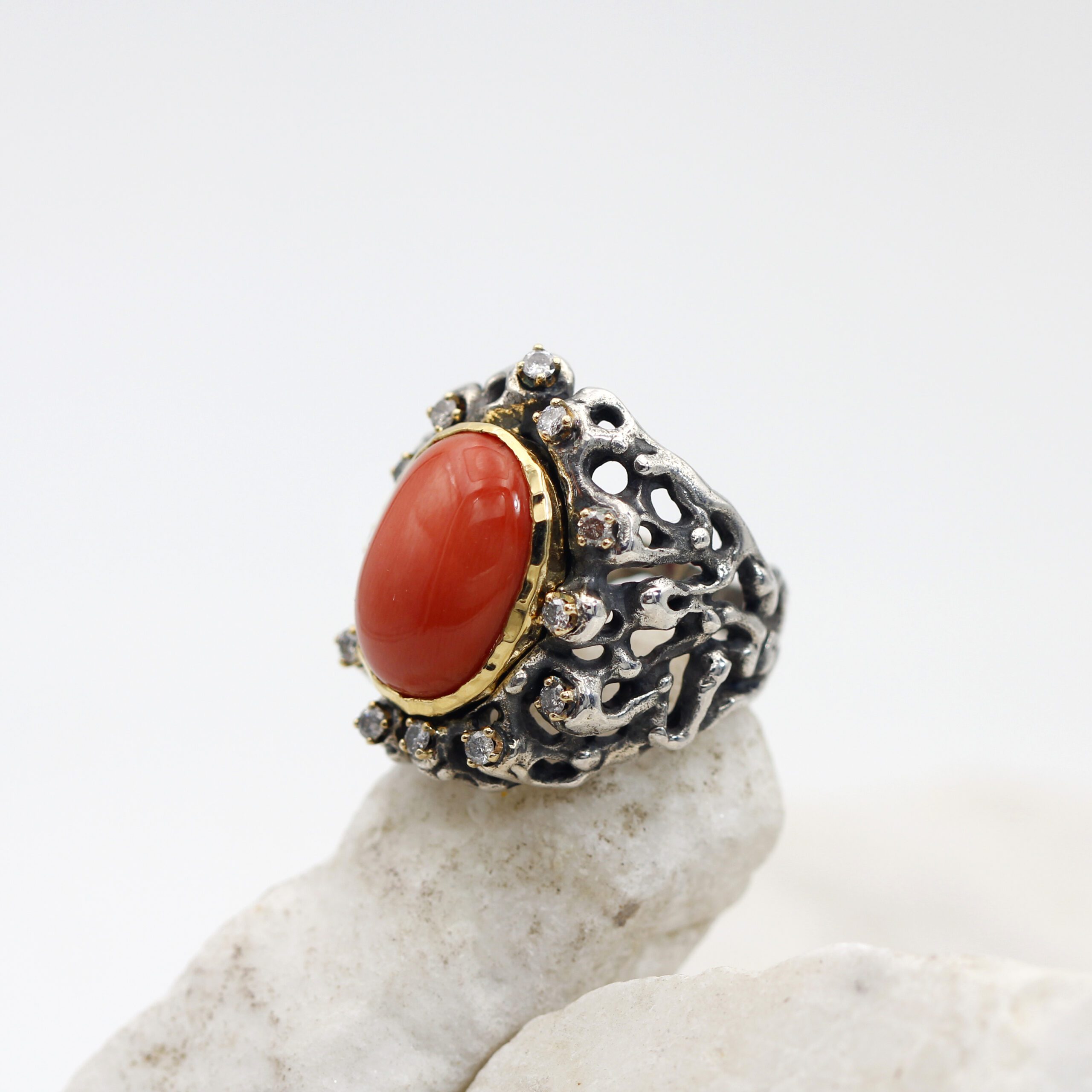 Silver Ring with Removable Gold Setting, Coral, and 13 Grey Diamonds