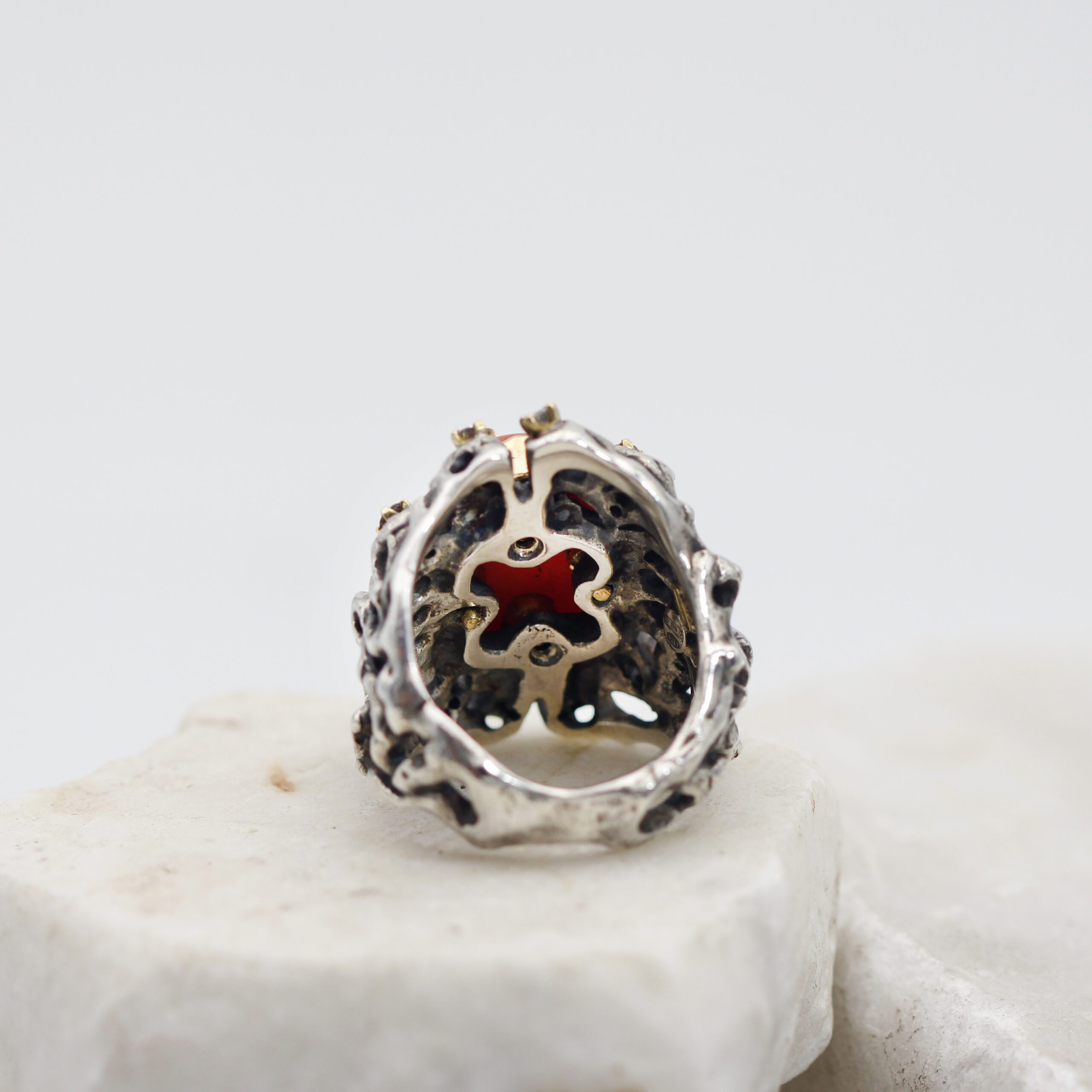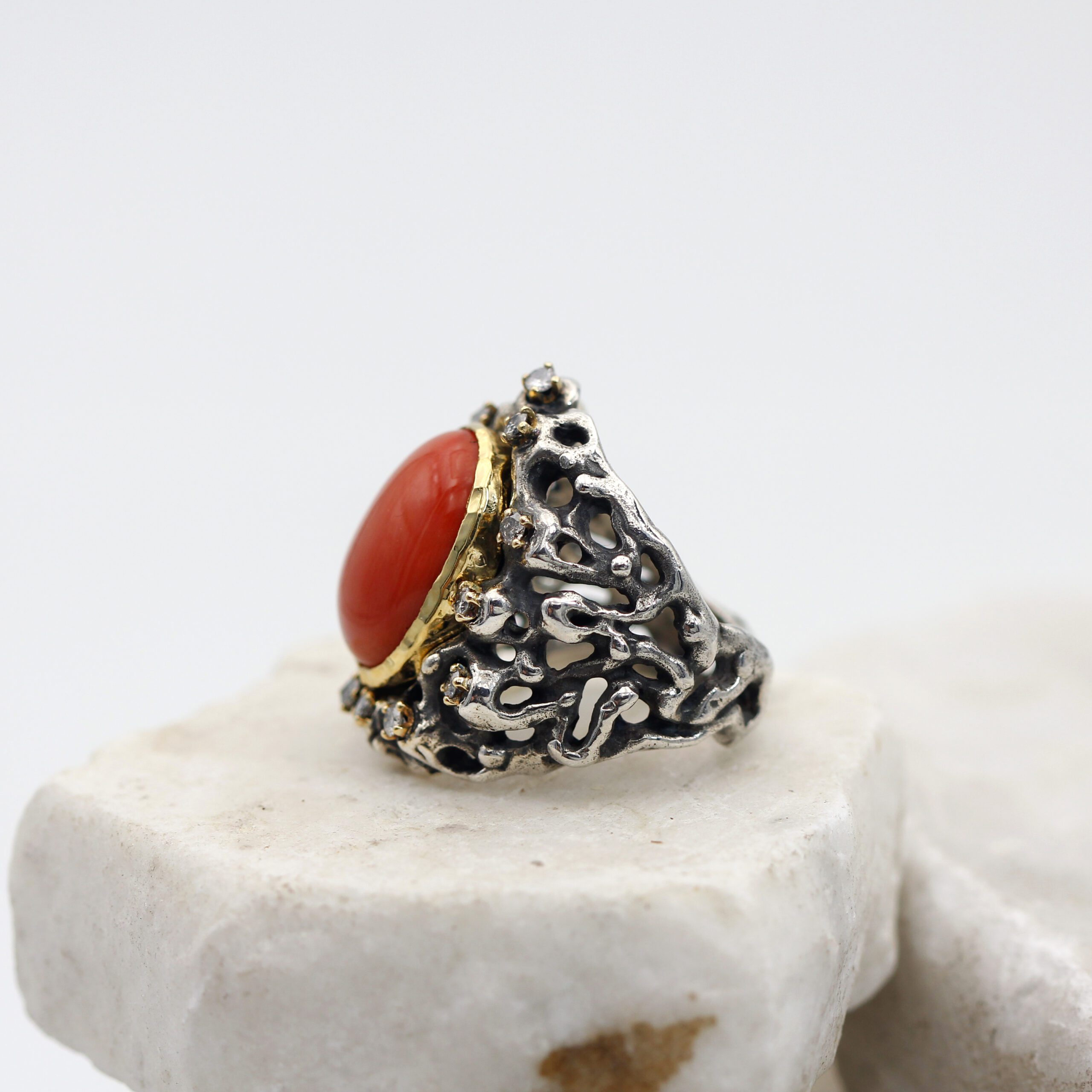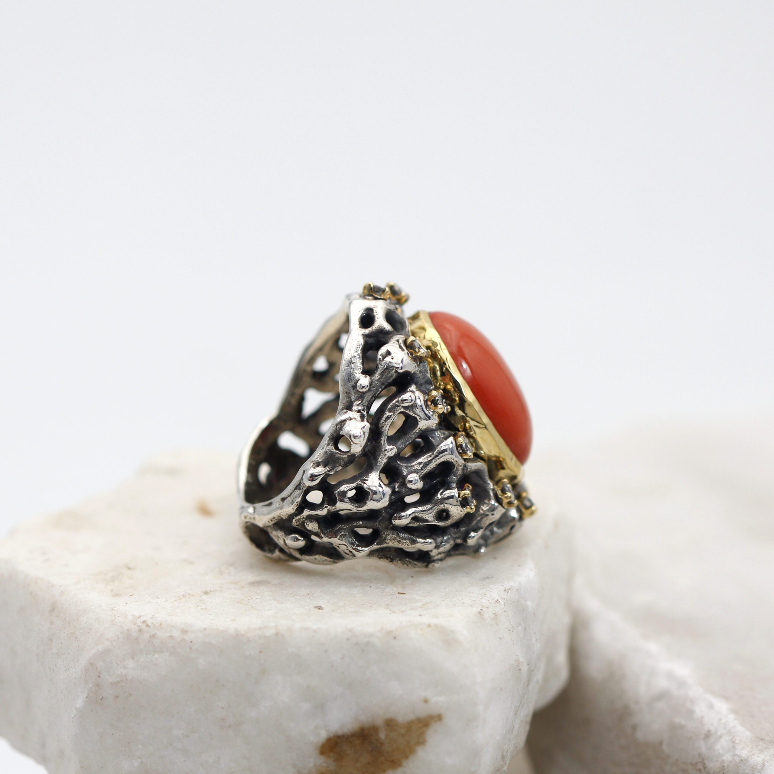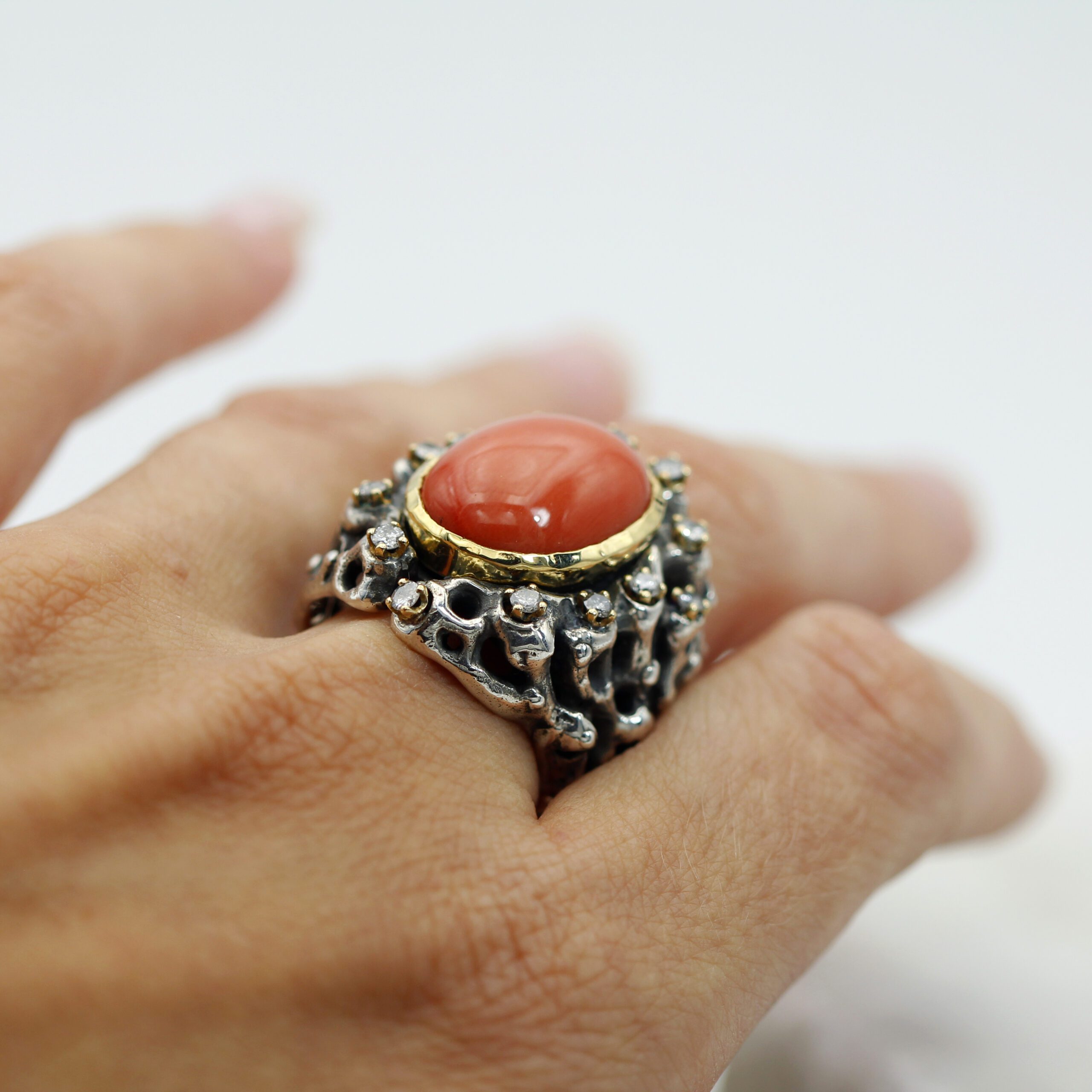 Silver Ring with Removable Gold Setting, Coral, and 13 Grey Diamonds