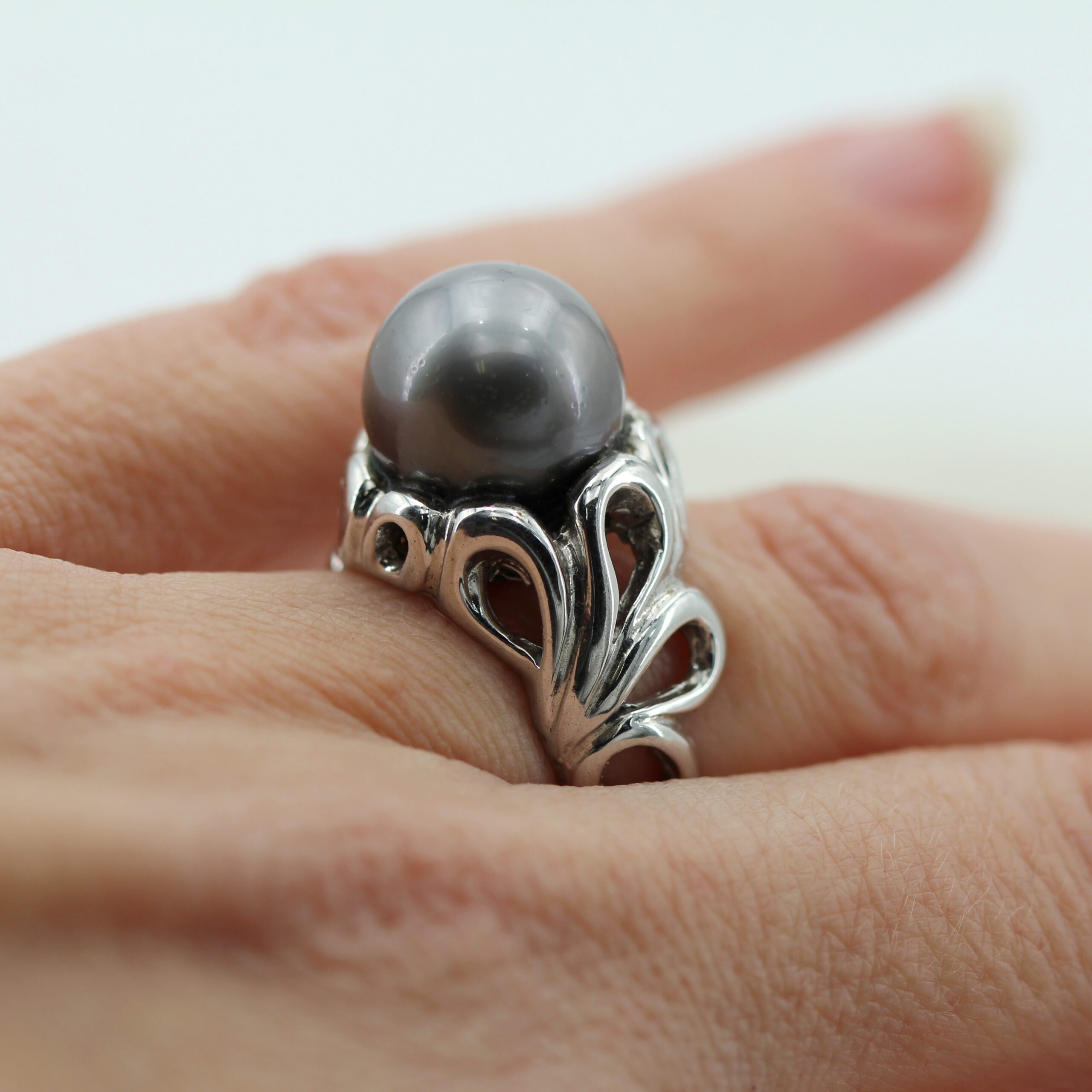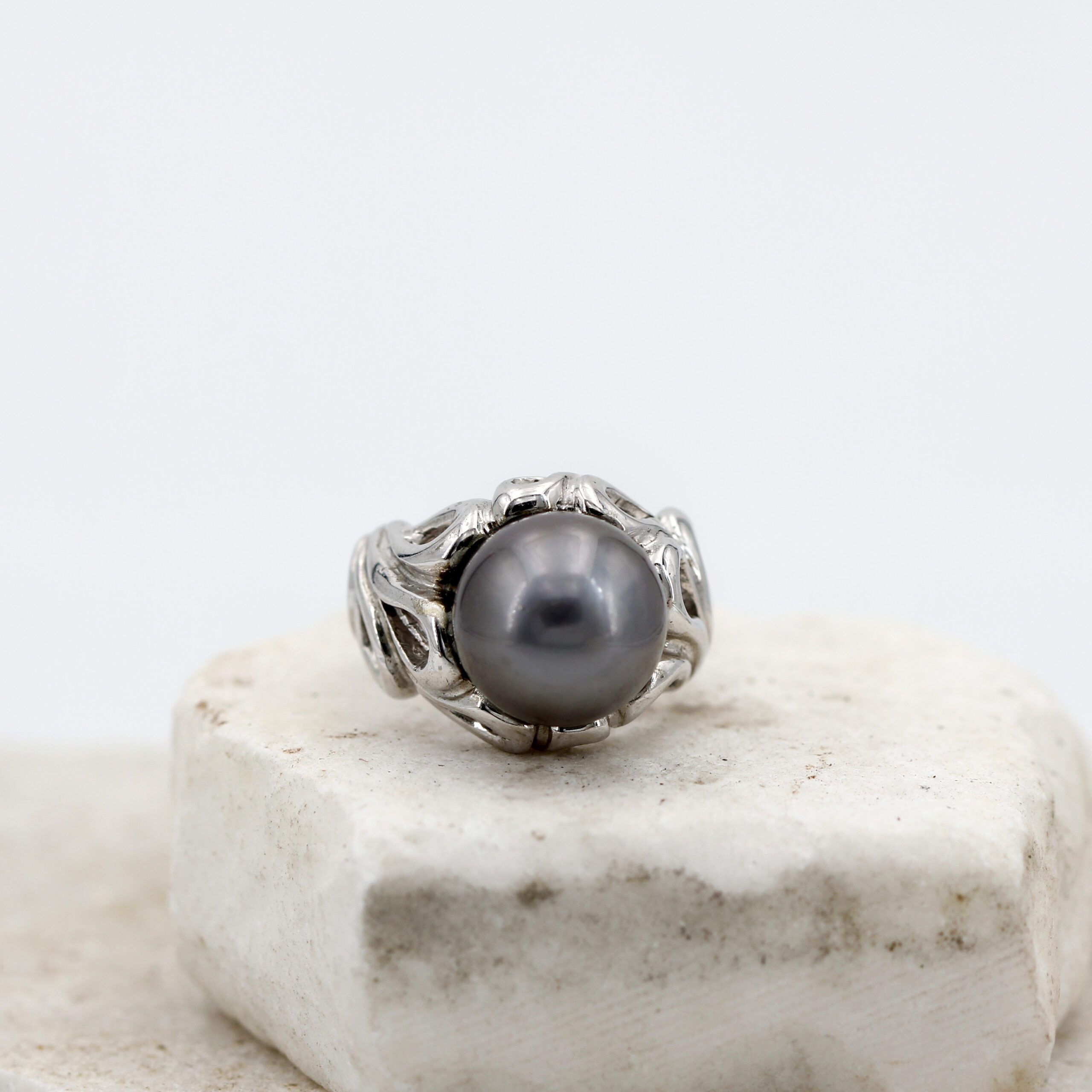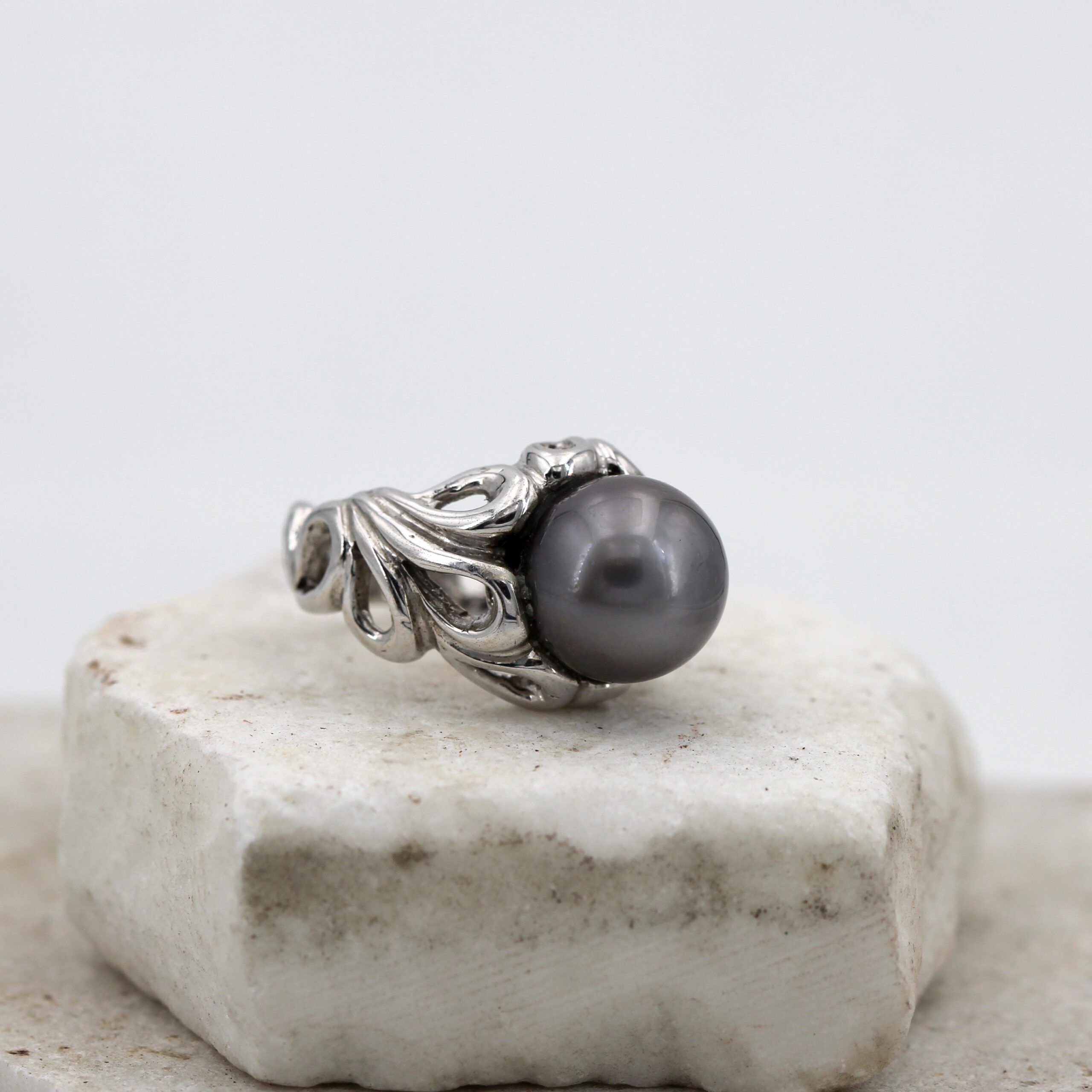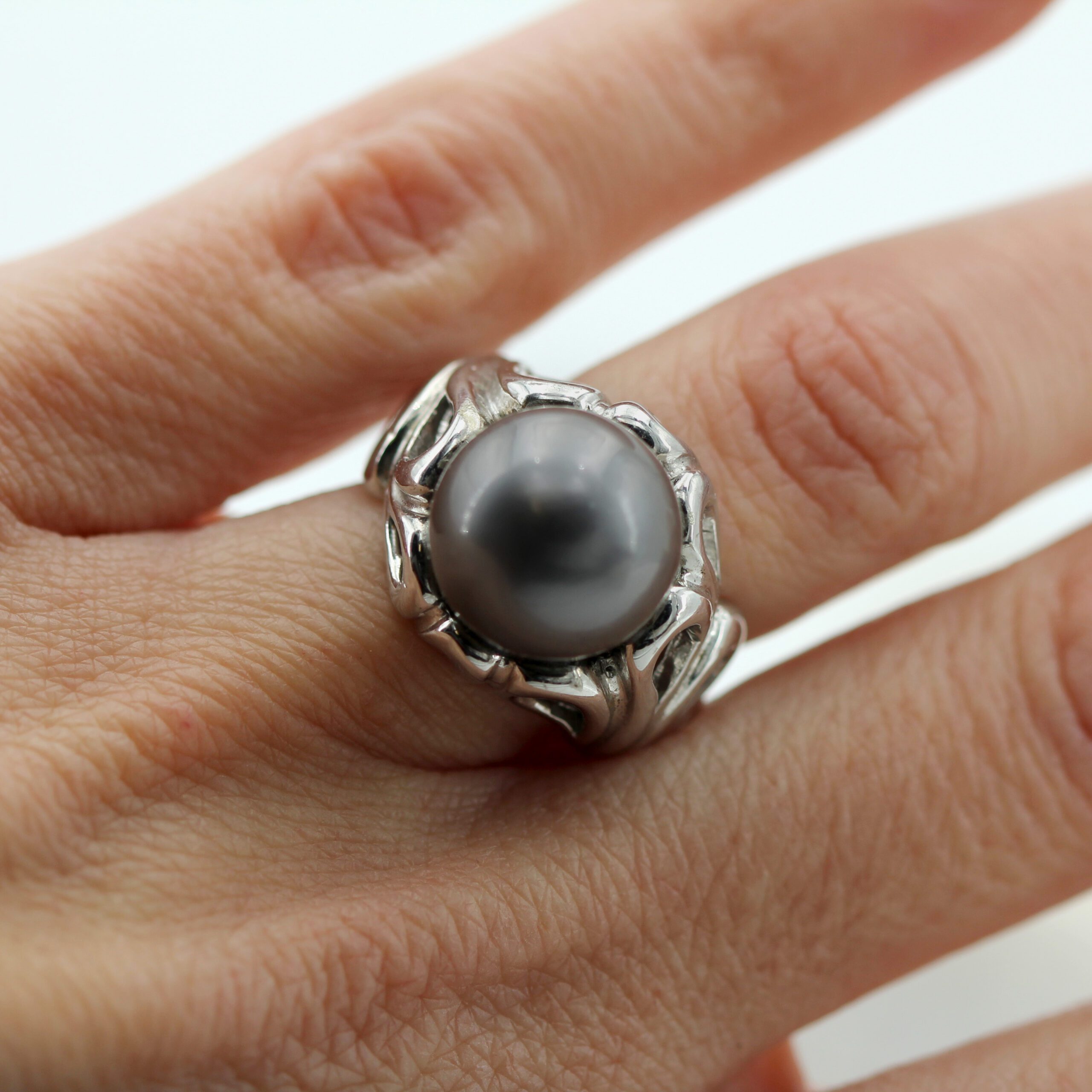 Silver Ring, 9.80 g, with Natural Grey Tahitian Pearl Center and Floral-Patterned Band.
