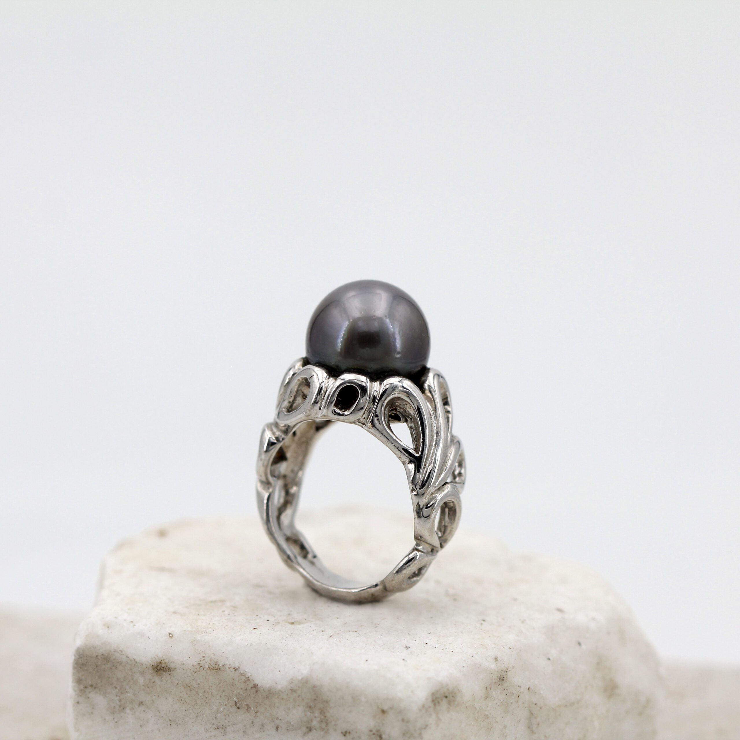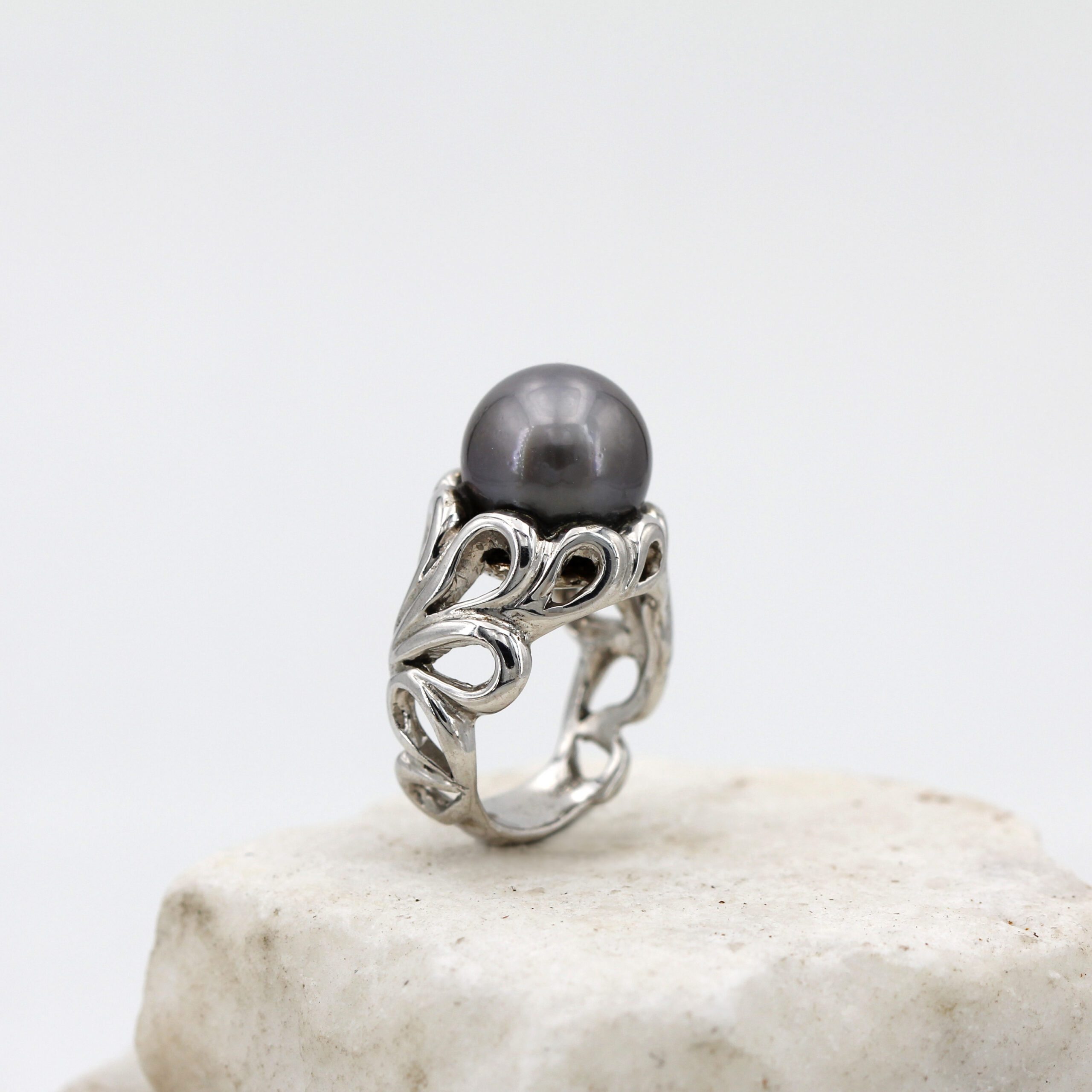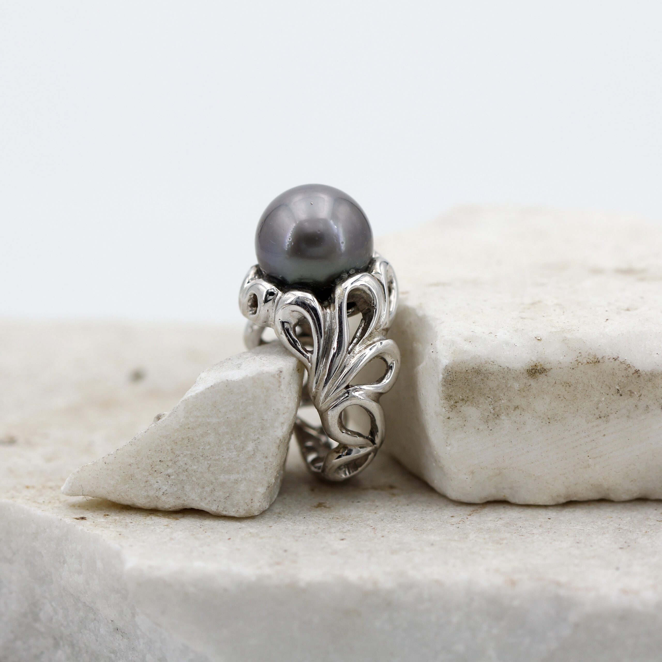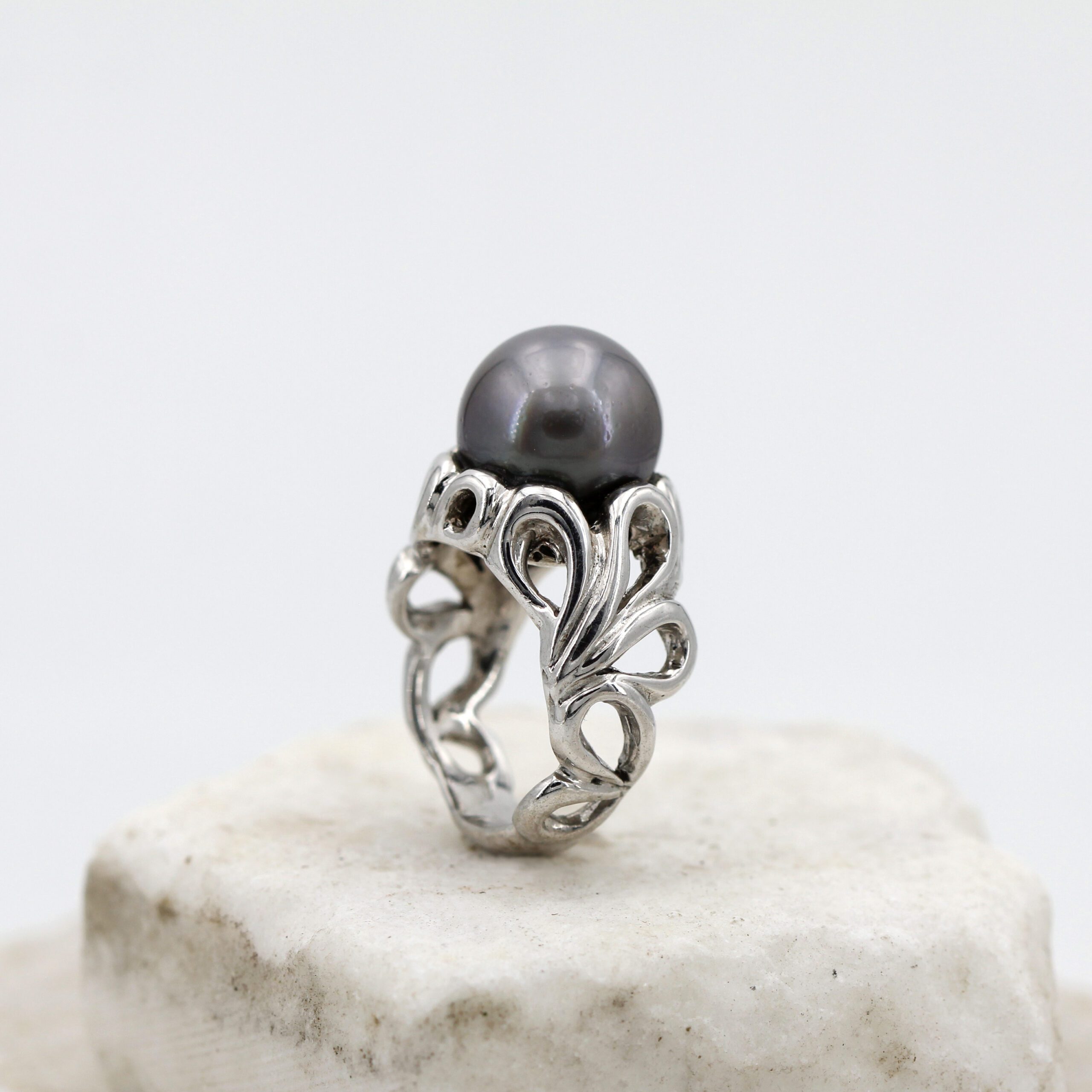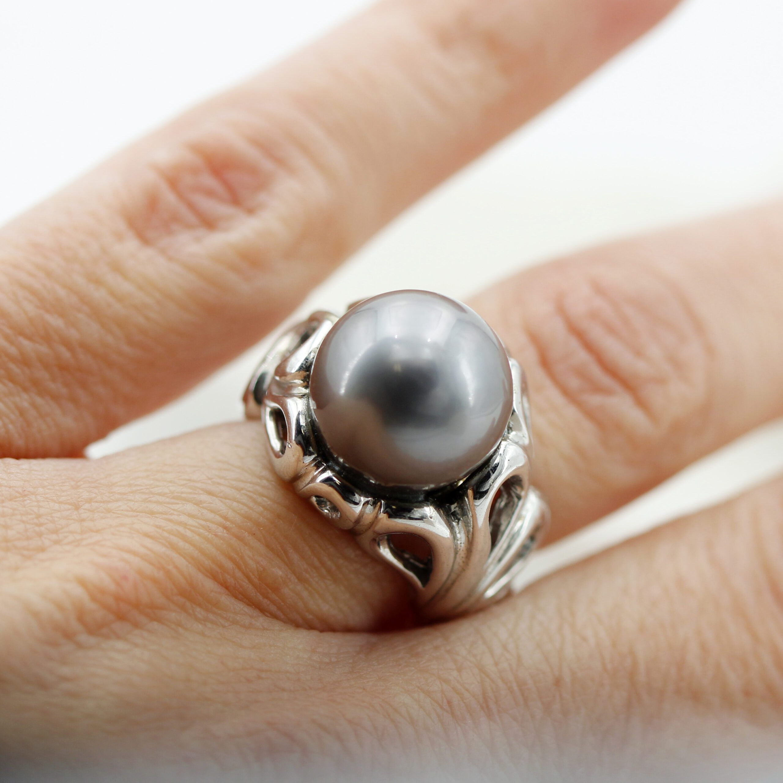 Silver Ring, 9.80 g, with Natural Grey Tahitian Pearl Center and Floral-Patterned Band.