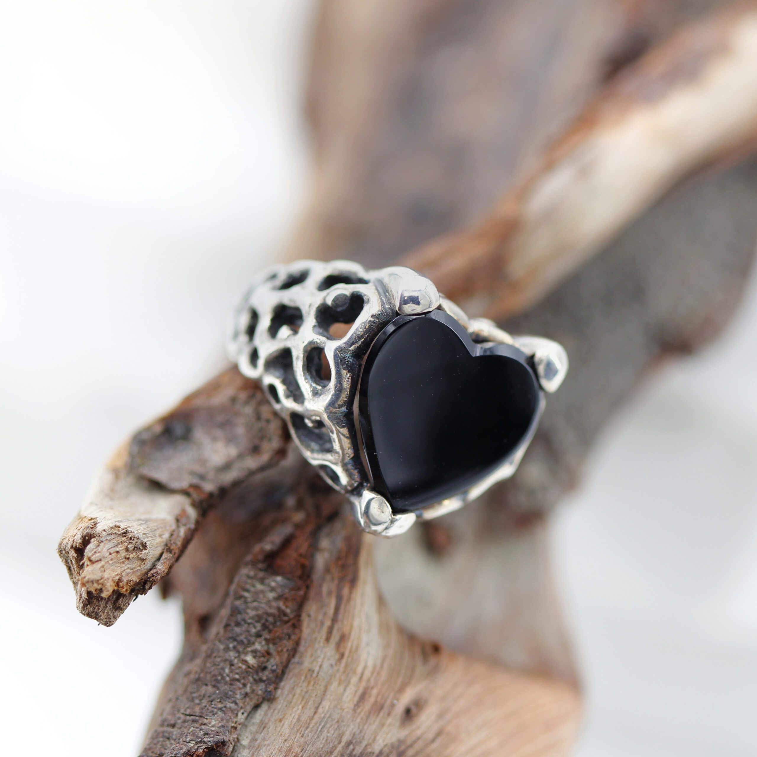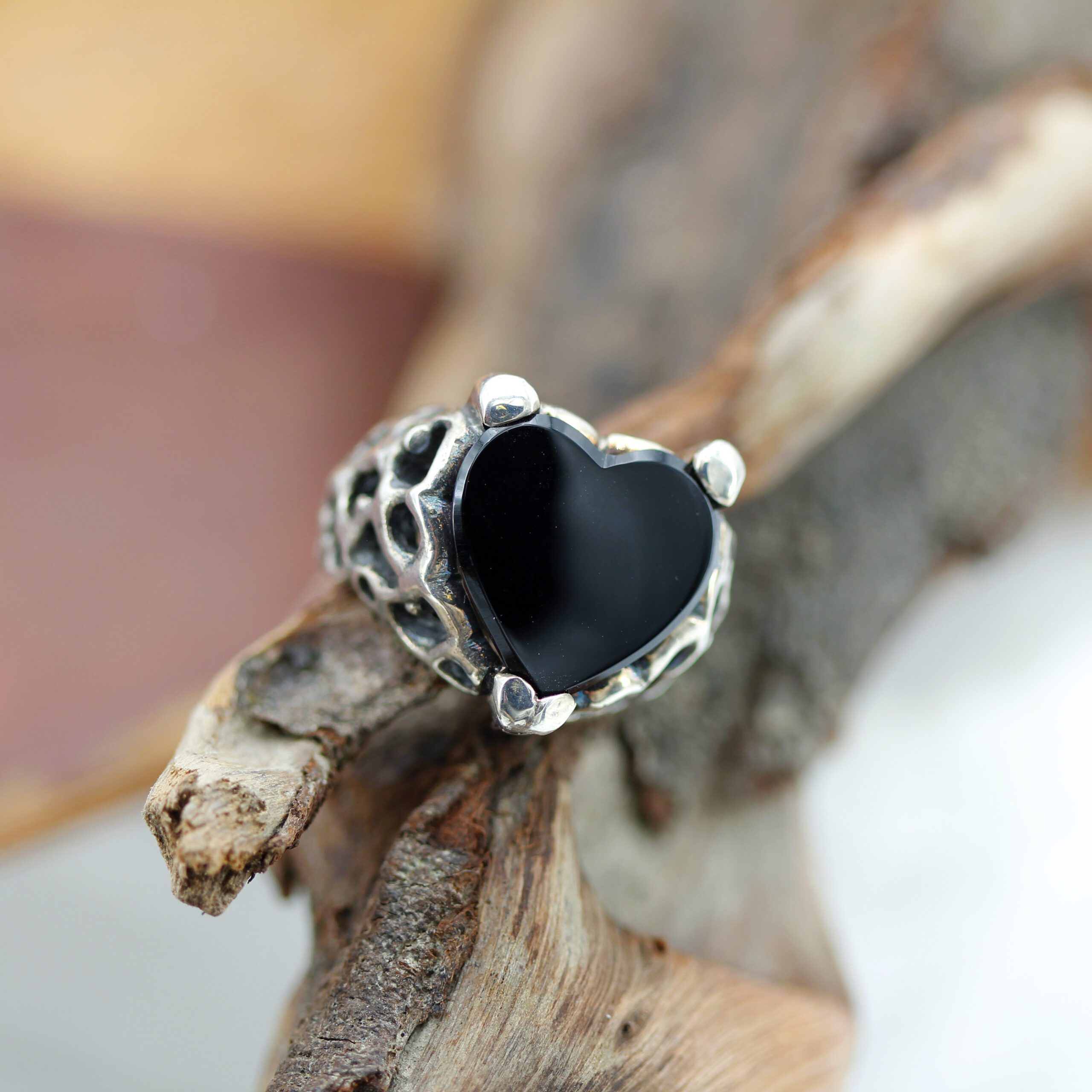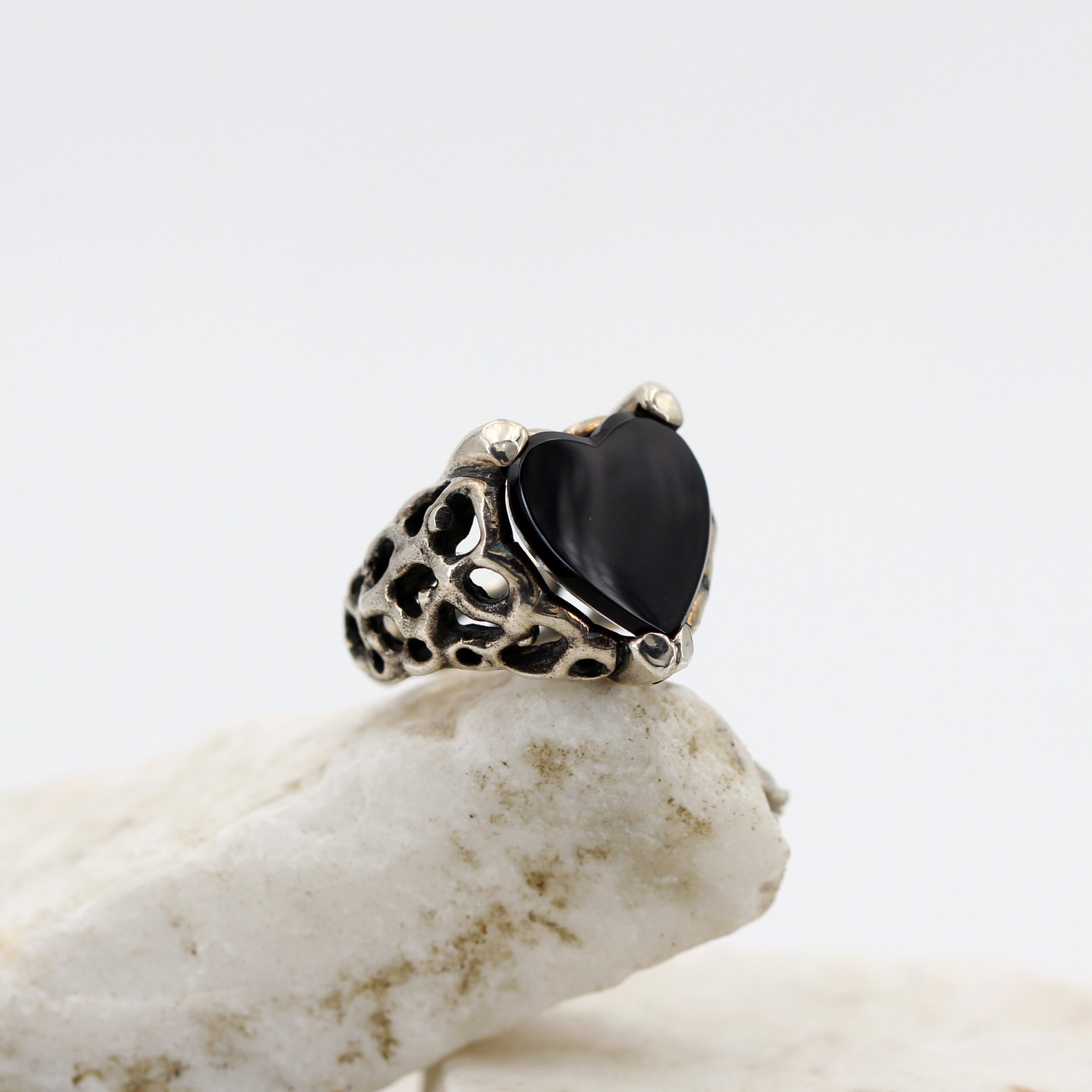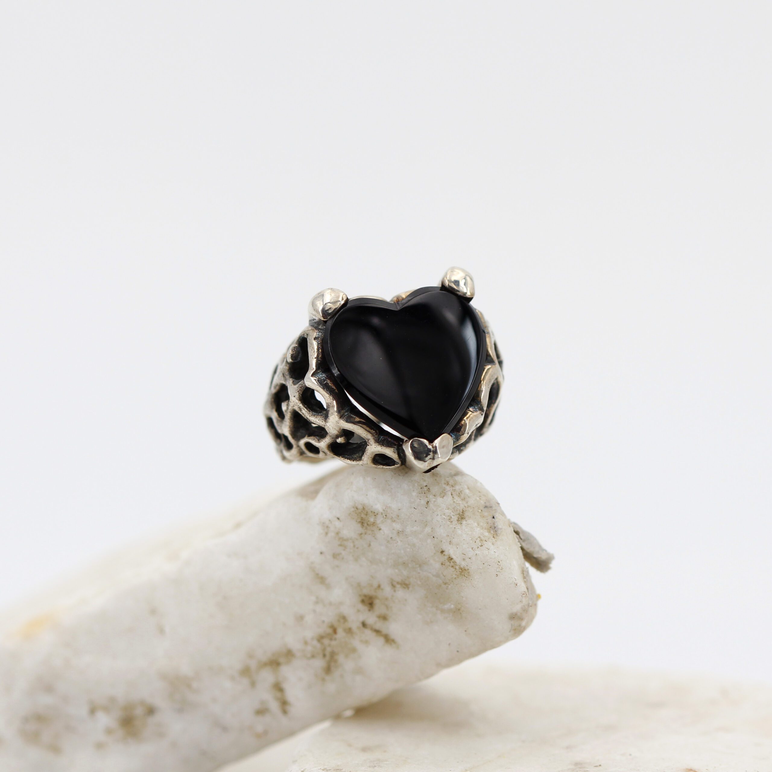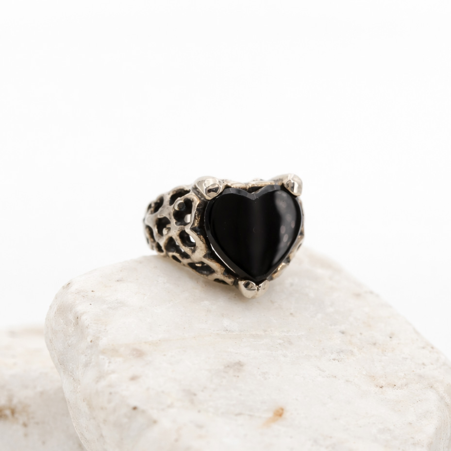 This ring design is inspired by the rugged and mysterious surface of Mars, recreating in fine detail the craters and depths of the Red Planet’s terrain. It is embellished with a natural heart-shaped black Onyx, symbol of strength and intensity.