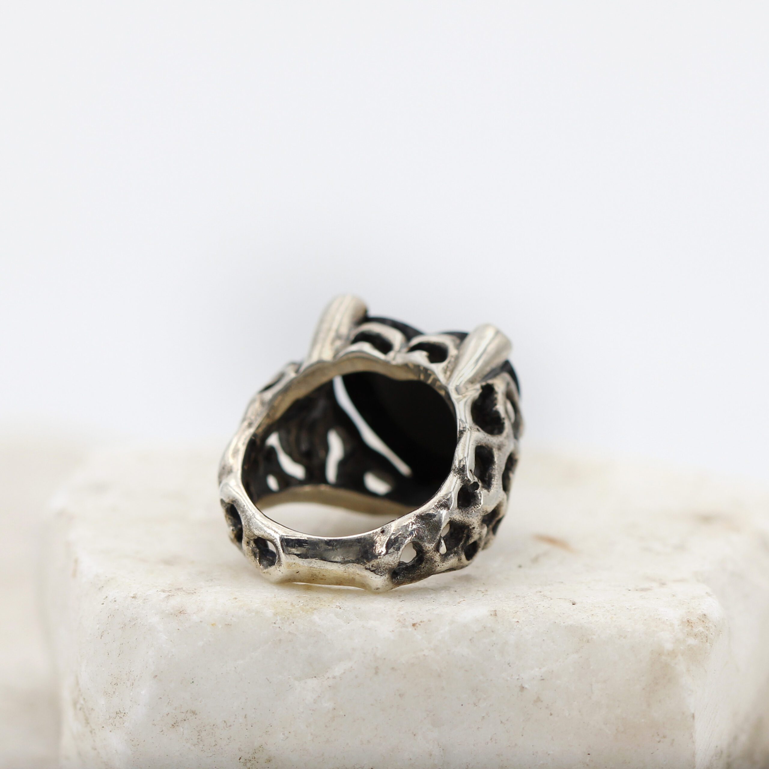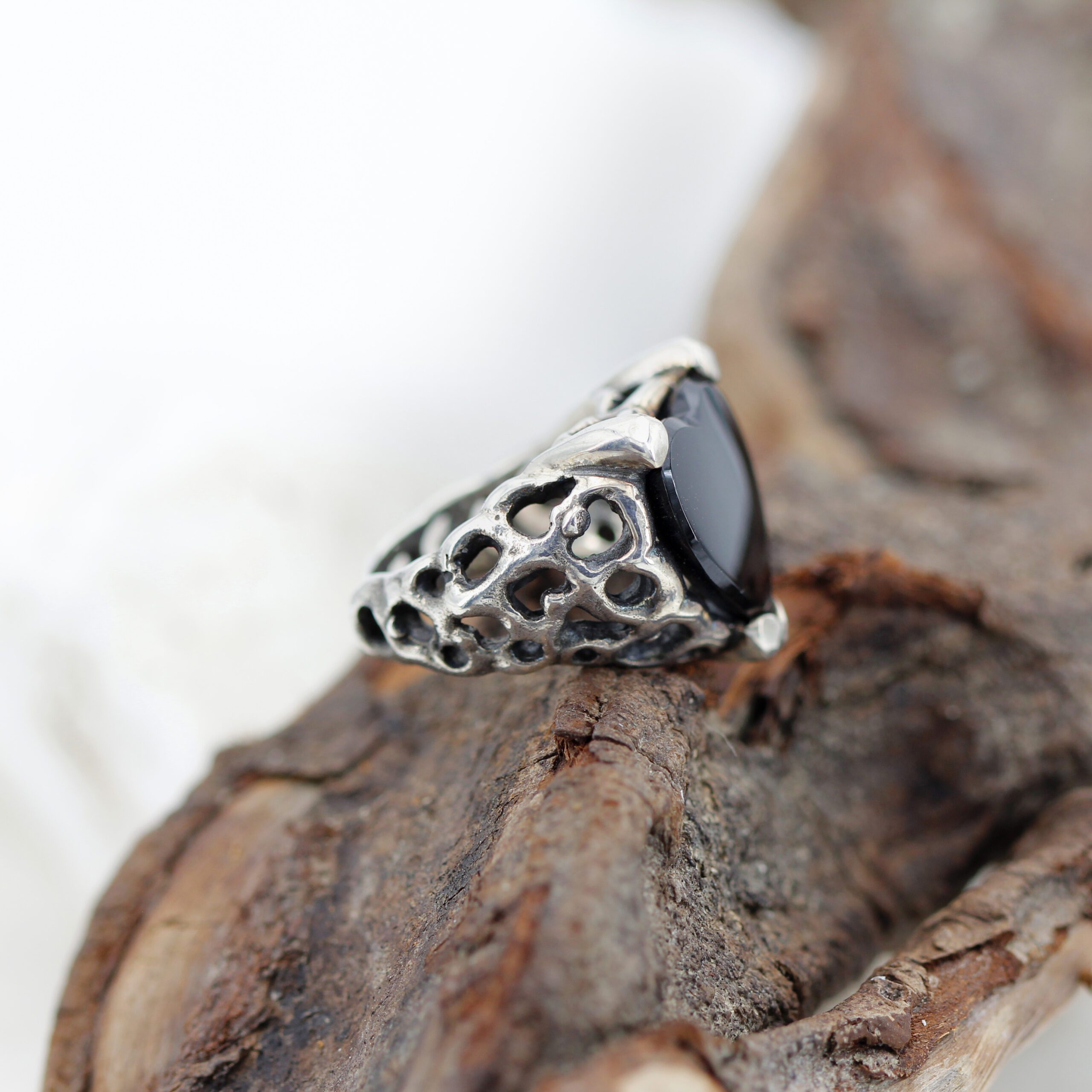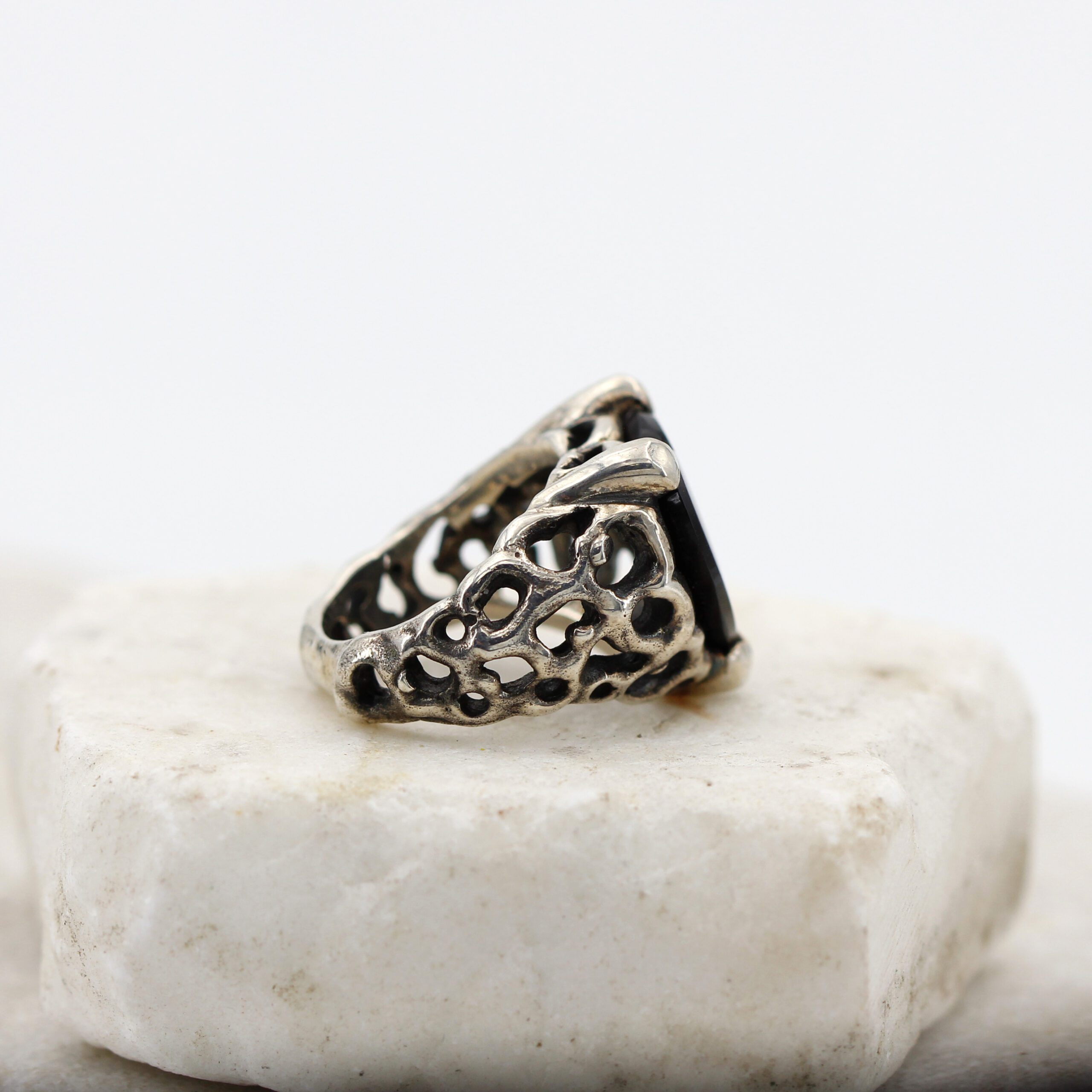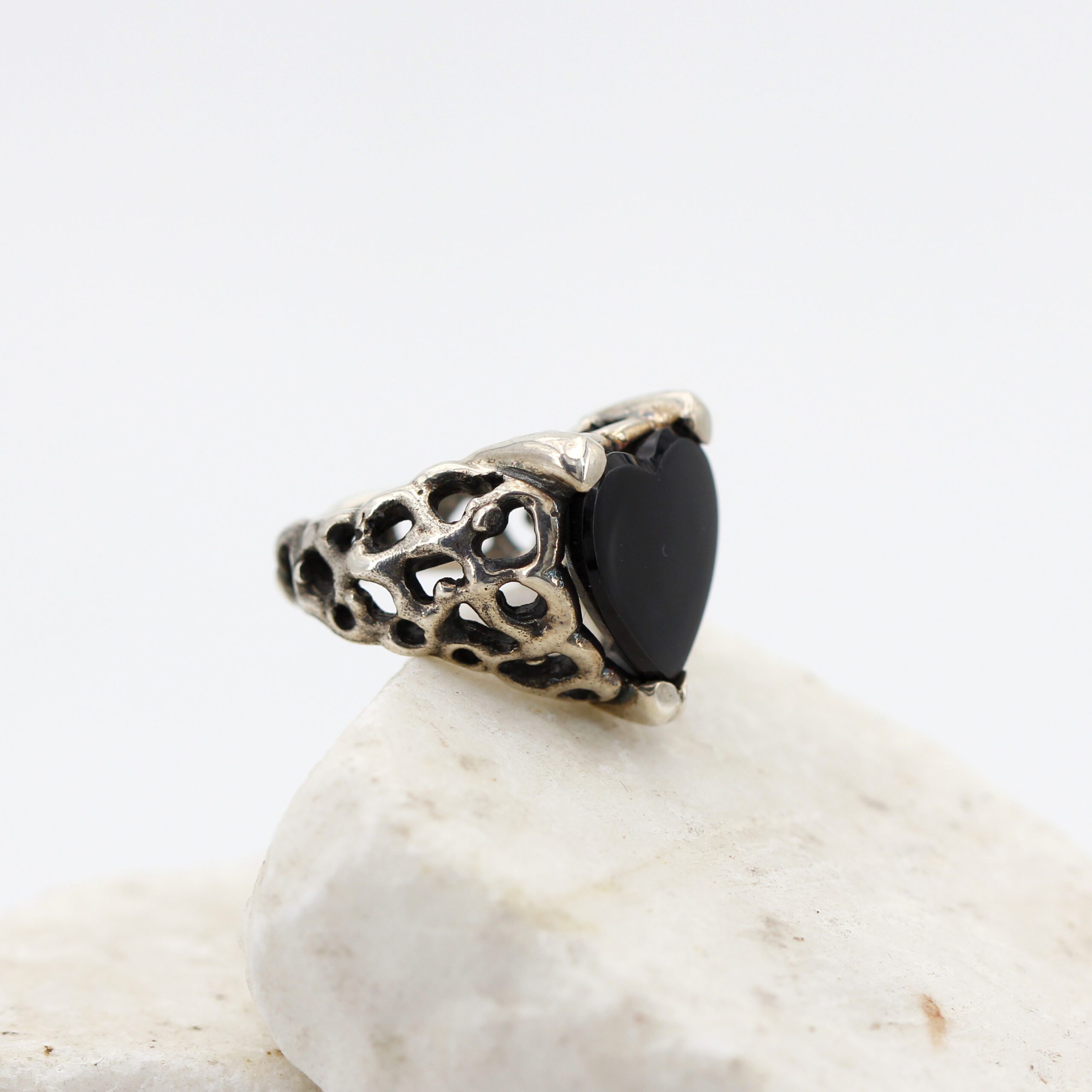This ring design is inspired by the rugged and mysterious surface of Mars, recreating in fine detail the craters and depths of the Red Planet’s terrain. It is embellished with a natural heart-shaped black Onyx, symbol of strength and intensity.