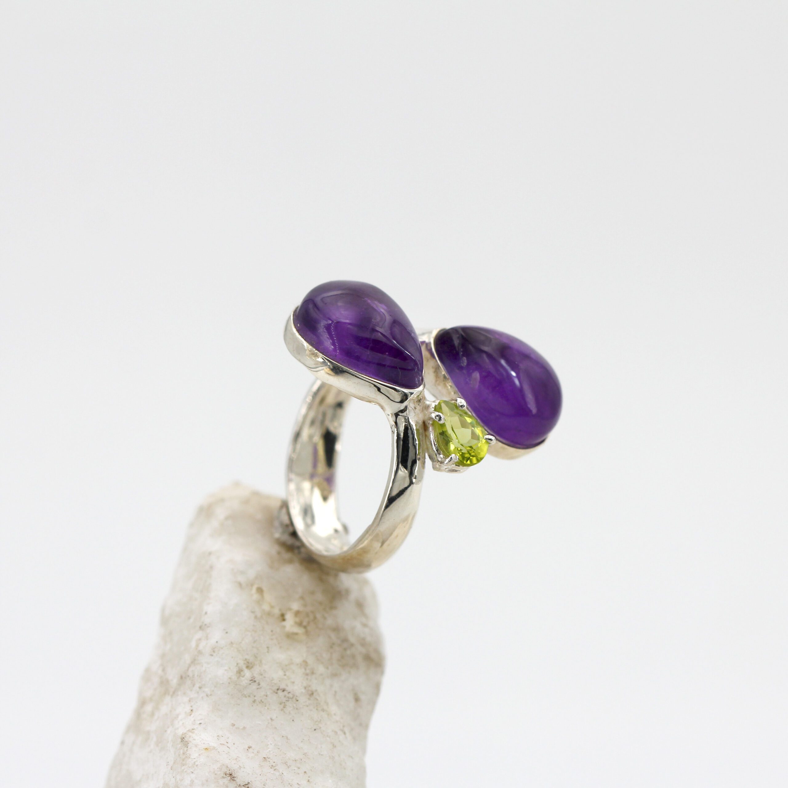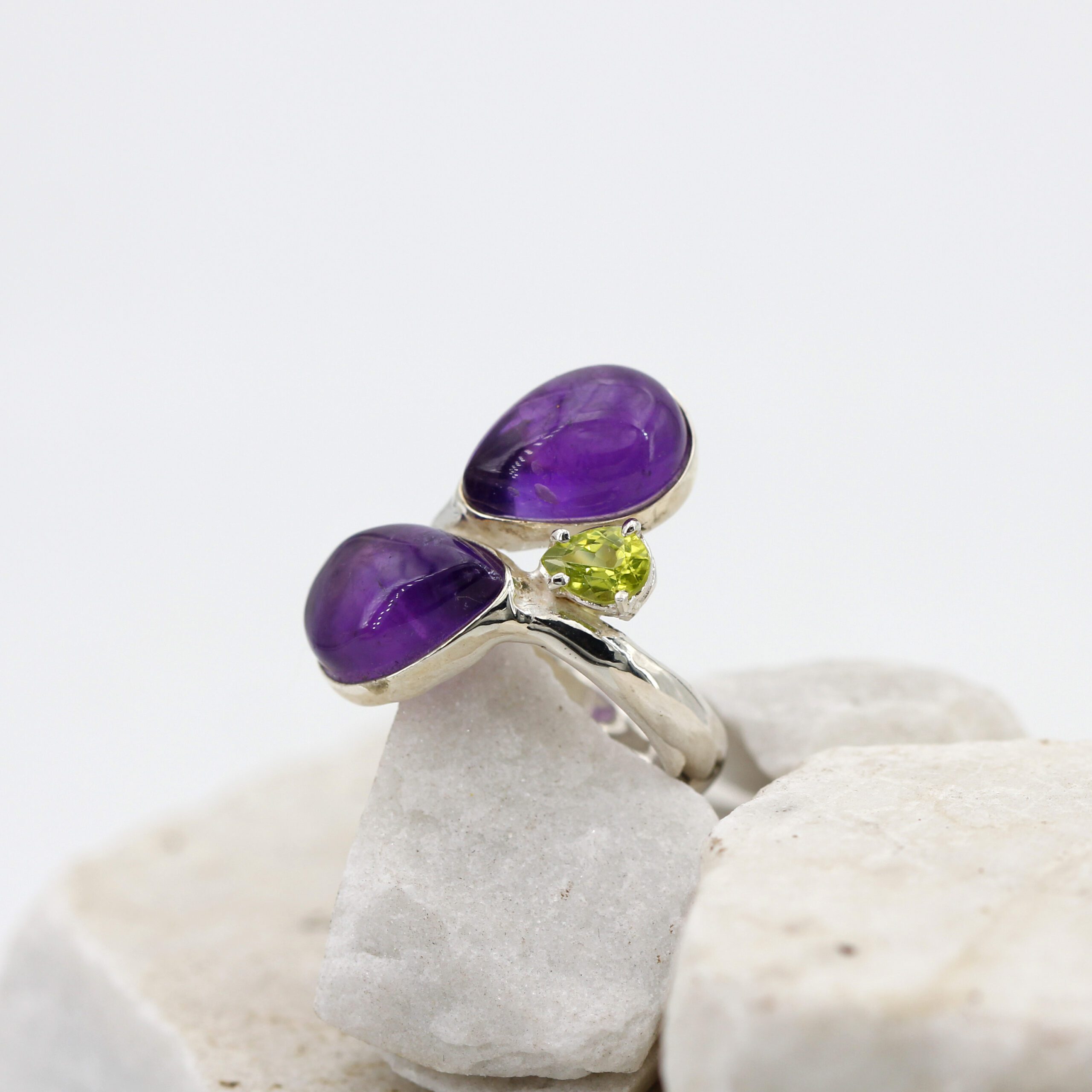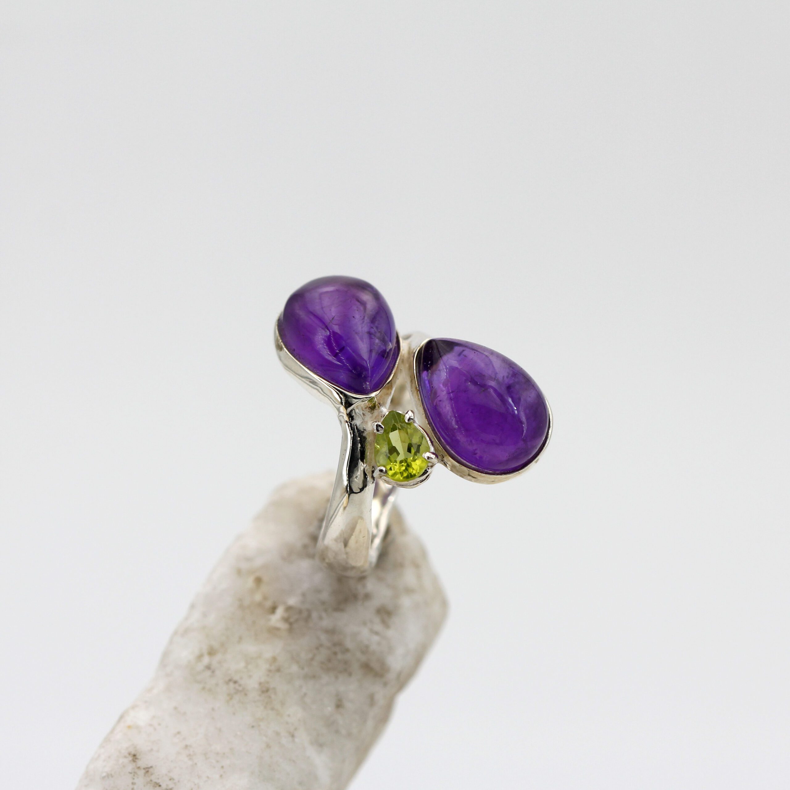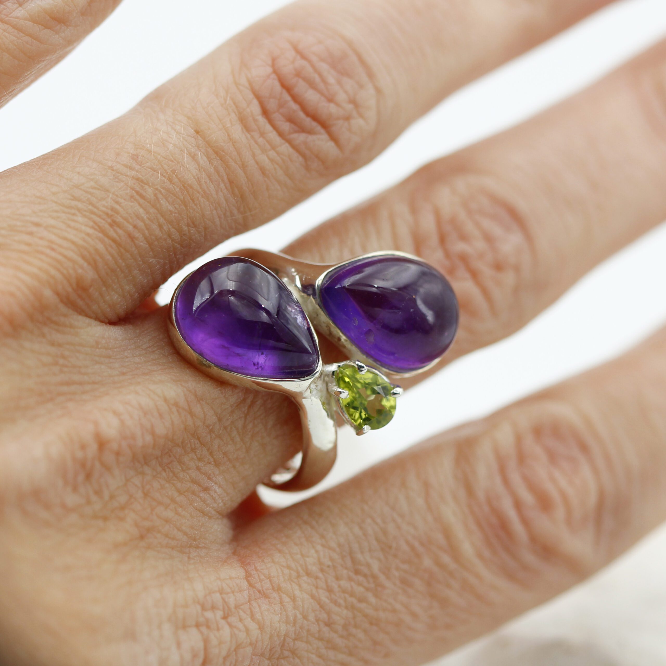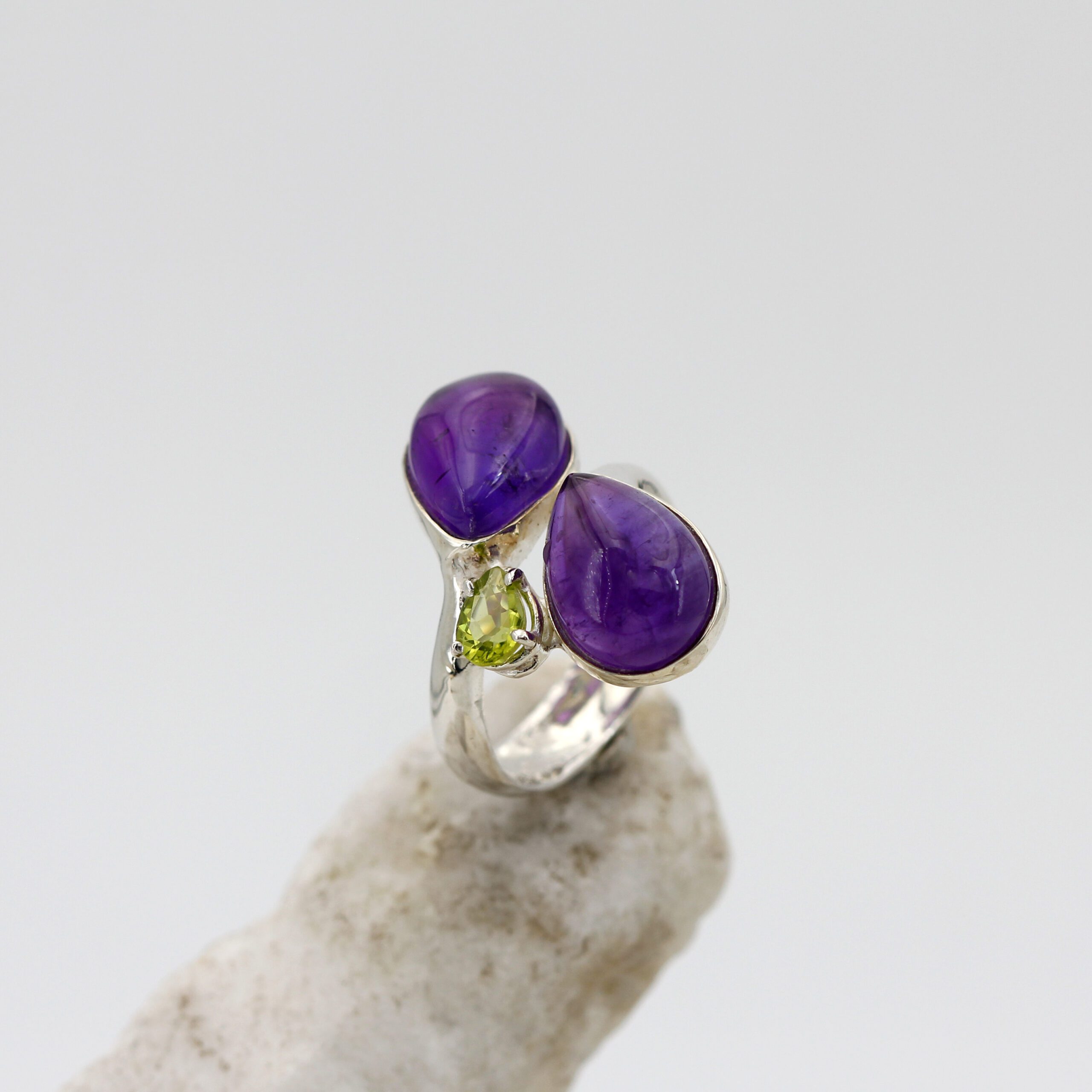 Silver ring adorned with two teardrop cabochon-cut amethysts and a teardrop peridot.